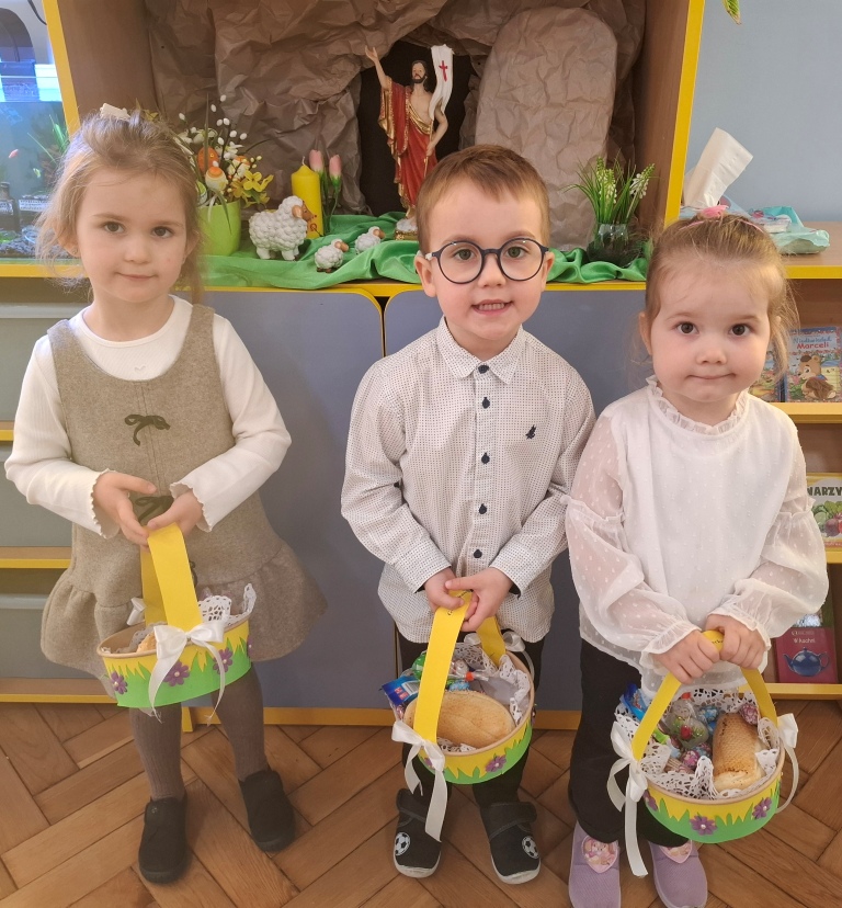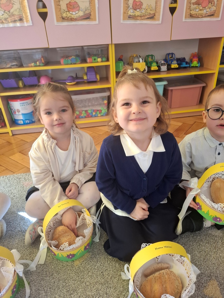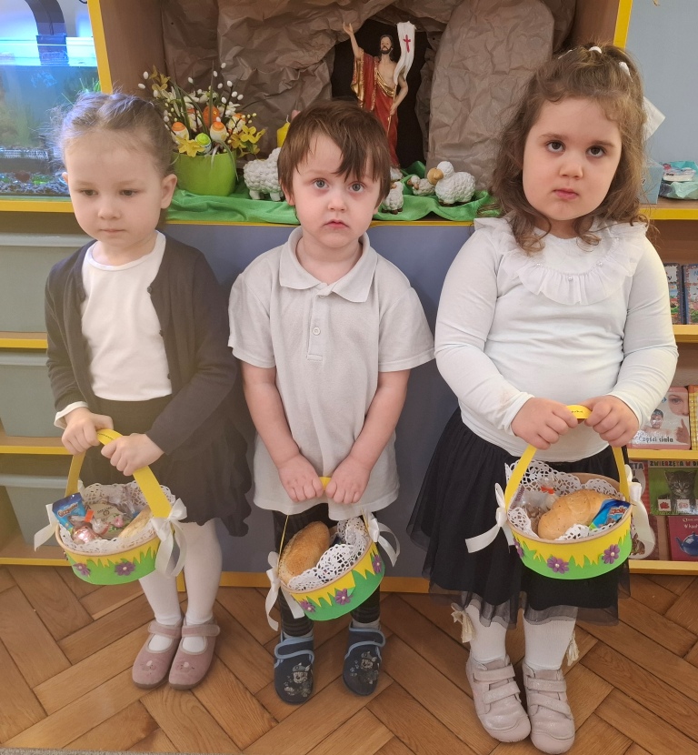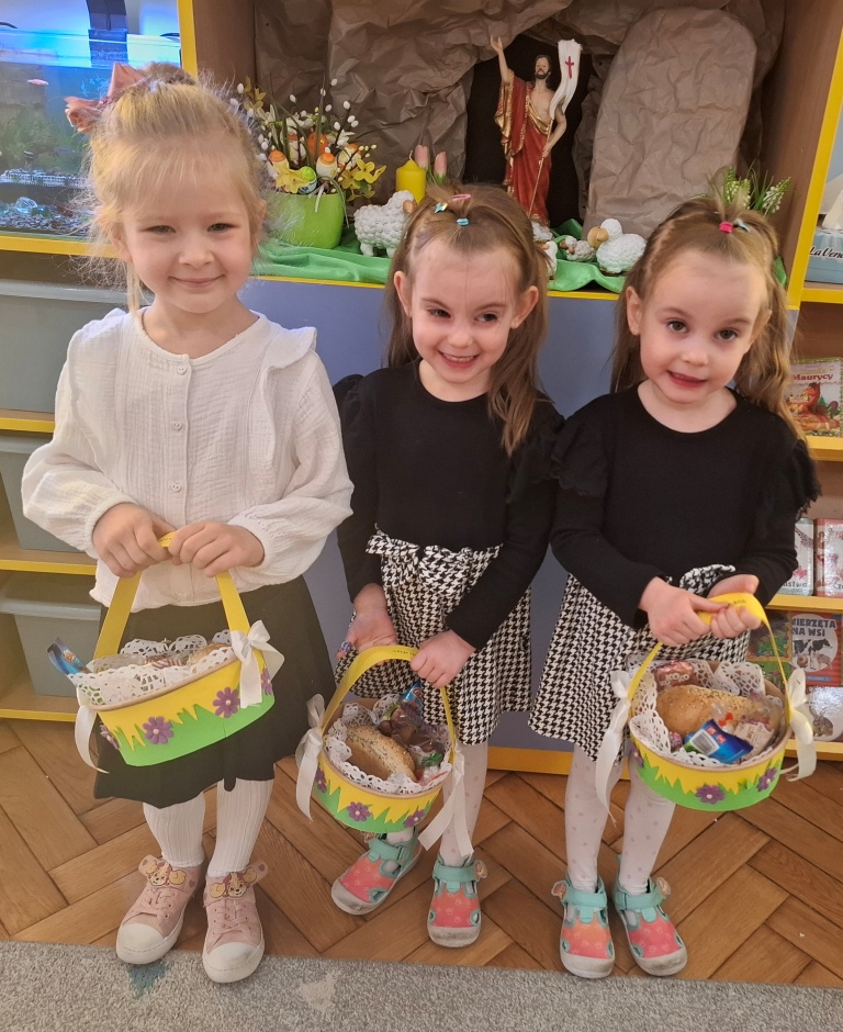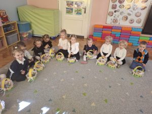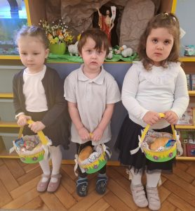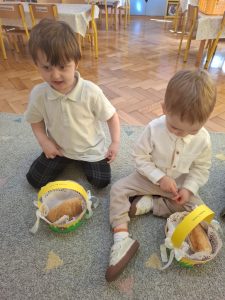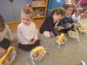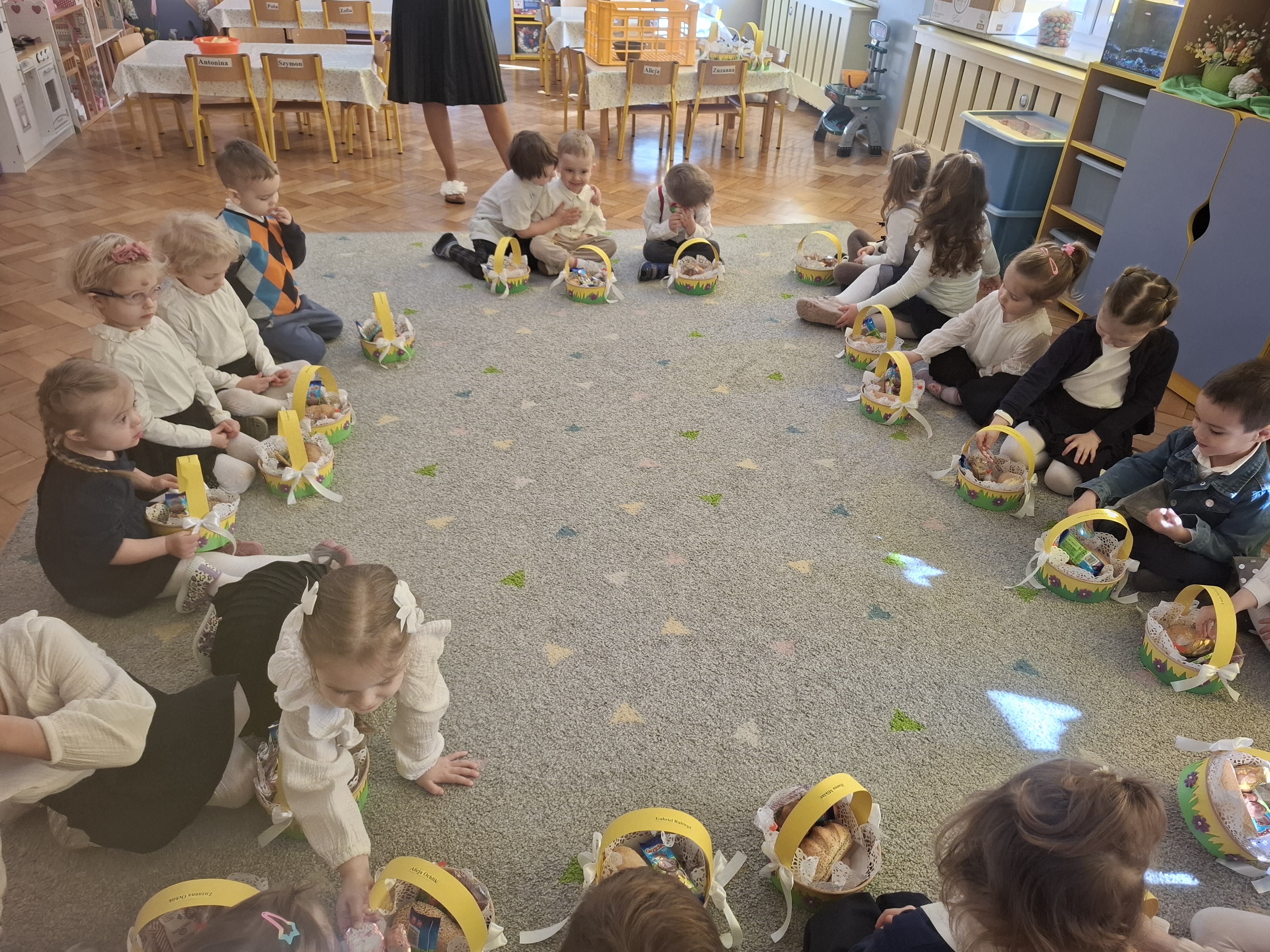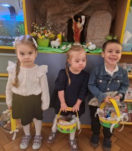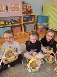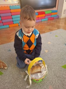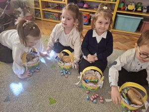 W ostatnich dniach w grupie Aniołków zagościła wiosna tworząc wielkanocną atmosferę. Dzieci z wielkim zaangażowaniem przygotowywały się do nadchodzących Świąt Wielkanocnych, poznając polskie tradycje i zwyczaje. Z niecierpliwością oczekiwały na Święconkę. Do własnoręcznie przygotowanych koszyczków dzieci włożyły: baranka – znak zwycięstwa życia nad śmiercią, chleb – symbol dostatku, babkę wielkanocną – oznakę radości, kiełbaskę – nawiązująca do zdrowia i siły, a także kolorowe jajeczka, które są symbolem nowego życia. Dzieci z ogromną starannością i dumą komponowały swoje koszyczki, poznając przy tym znaczenia poszczególnych elementów.