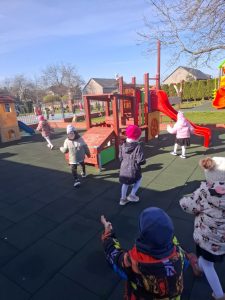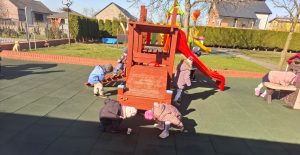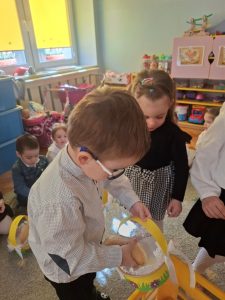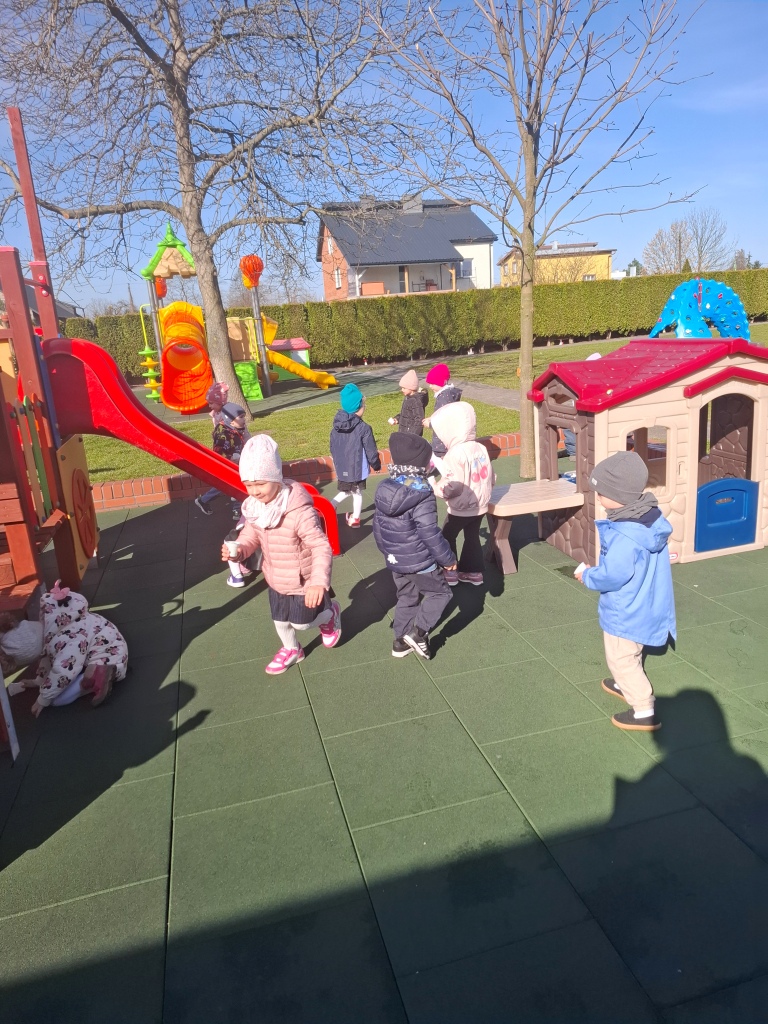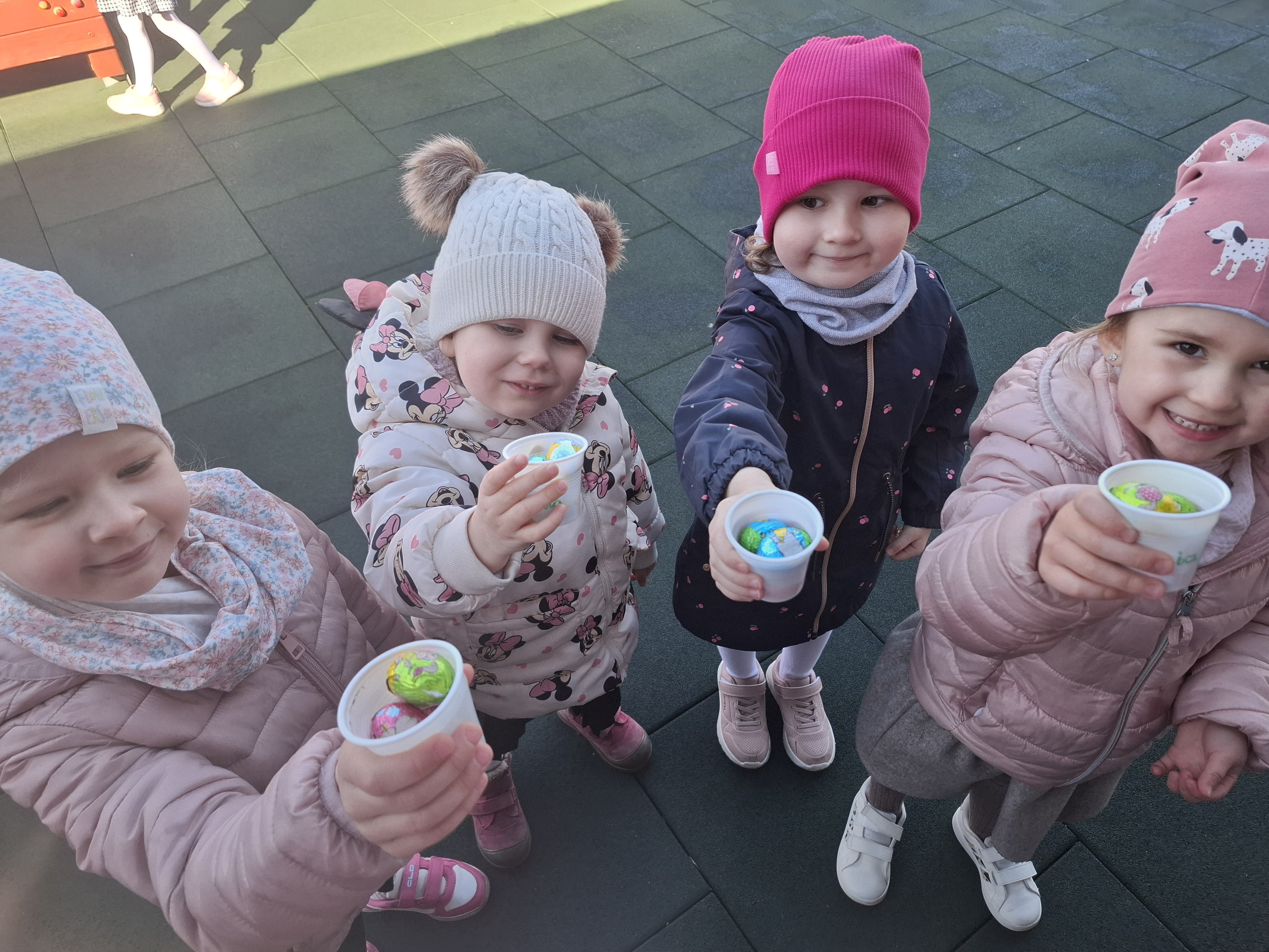 Na tym jednak nie koniec świątecznych atrakcji. Na przedszkolnym placu zabaw czekała na dzieci niespodzianka – radosna zabawa w poszukiwanie wielkanocnych jajeczek, czyli tzw. Easter Egg Hunt.