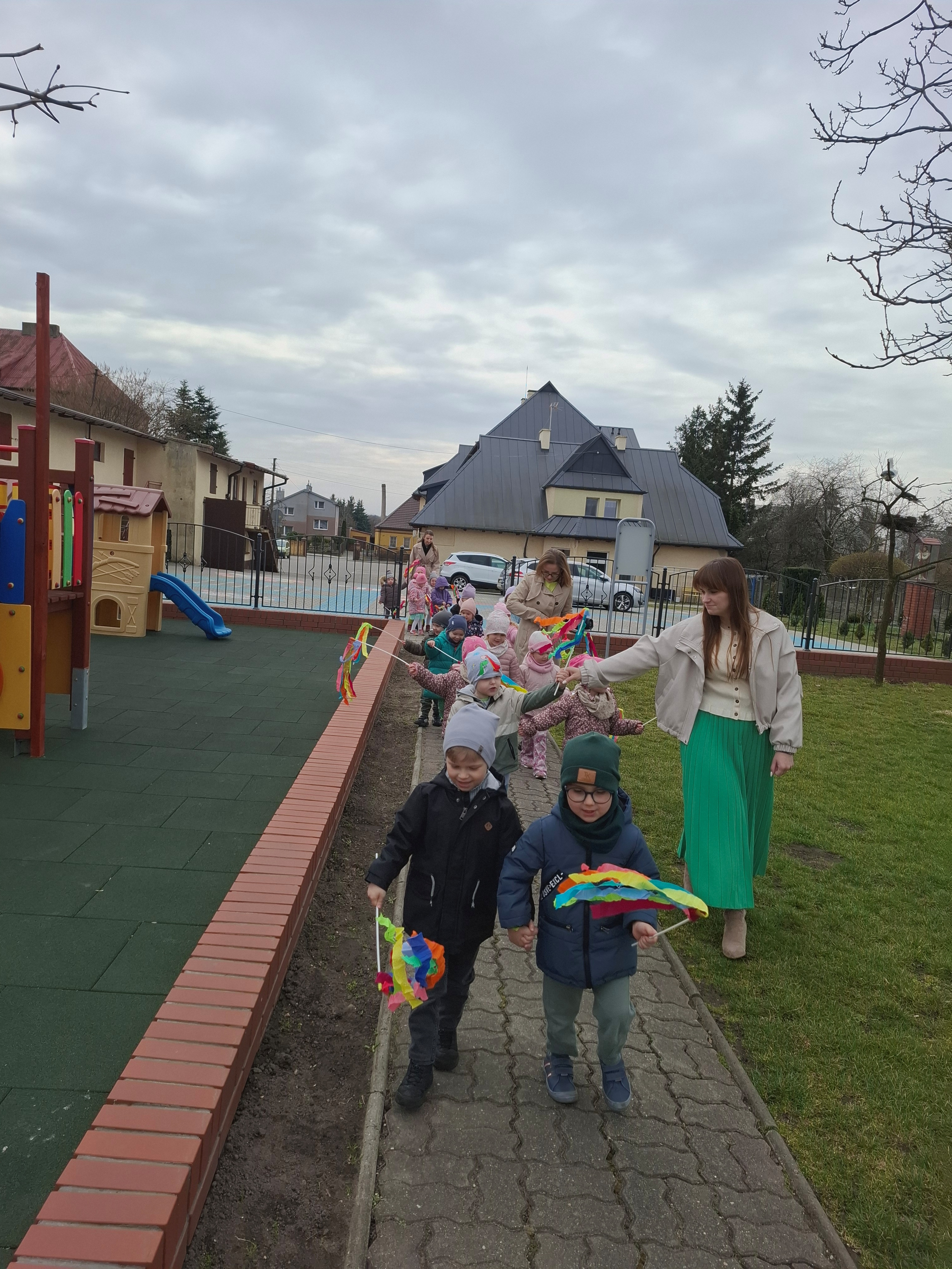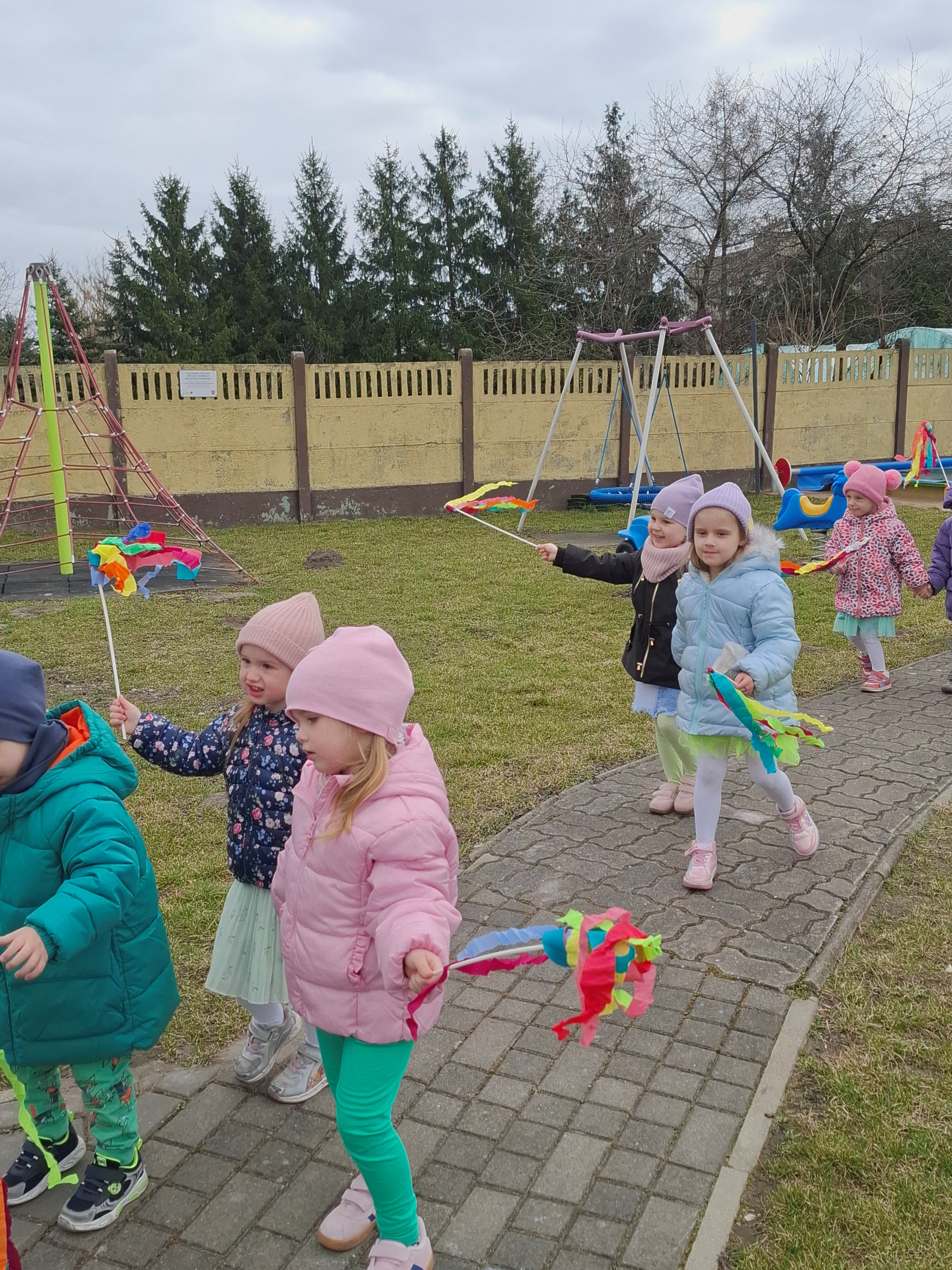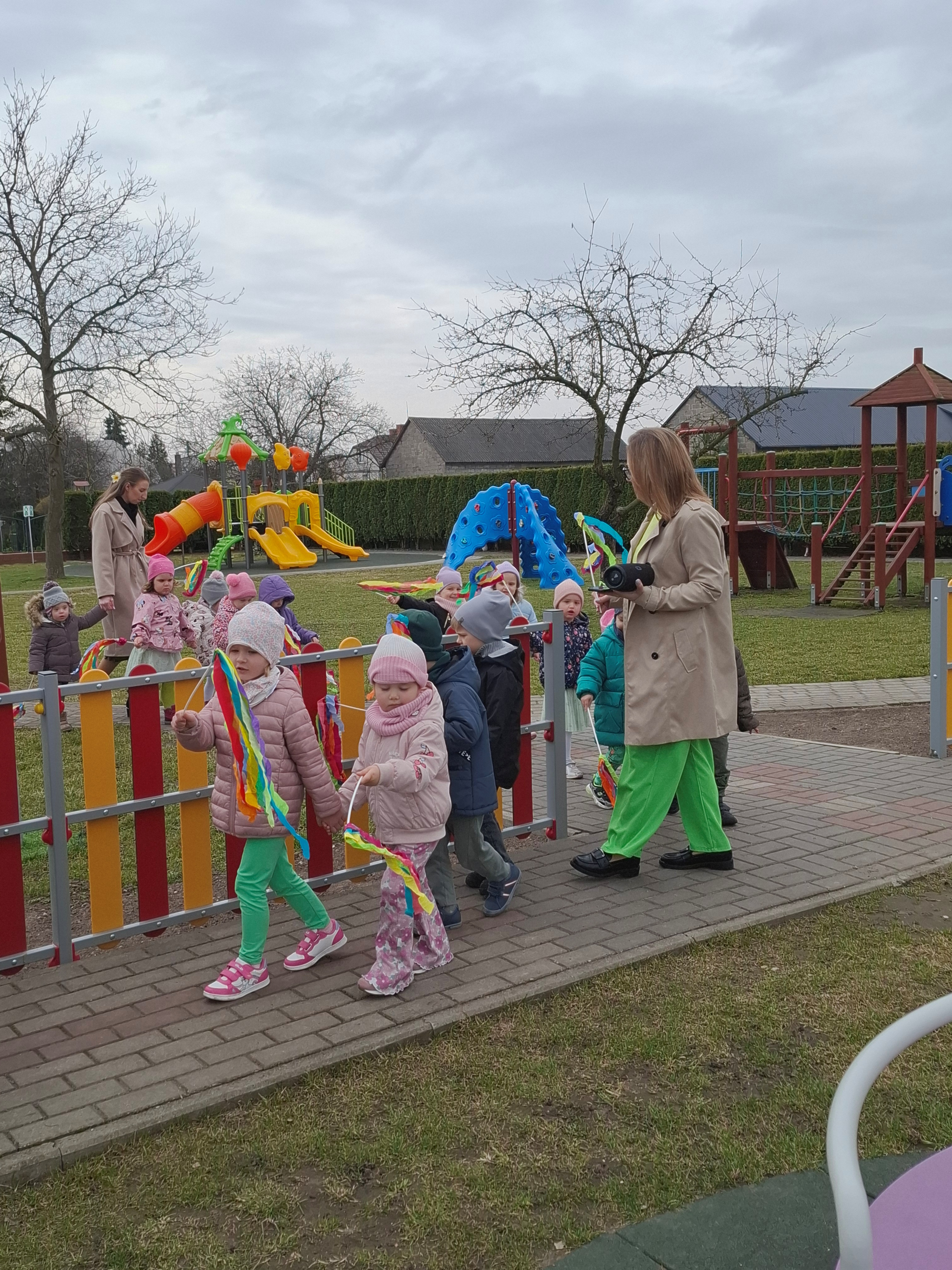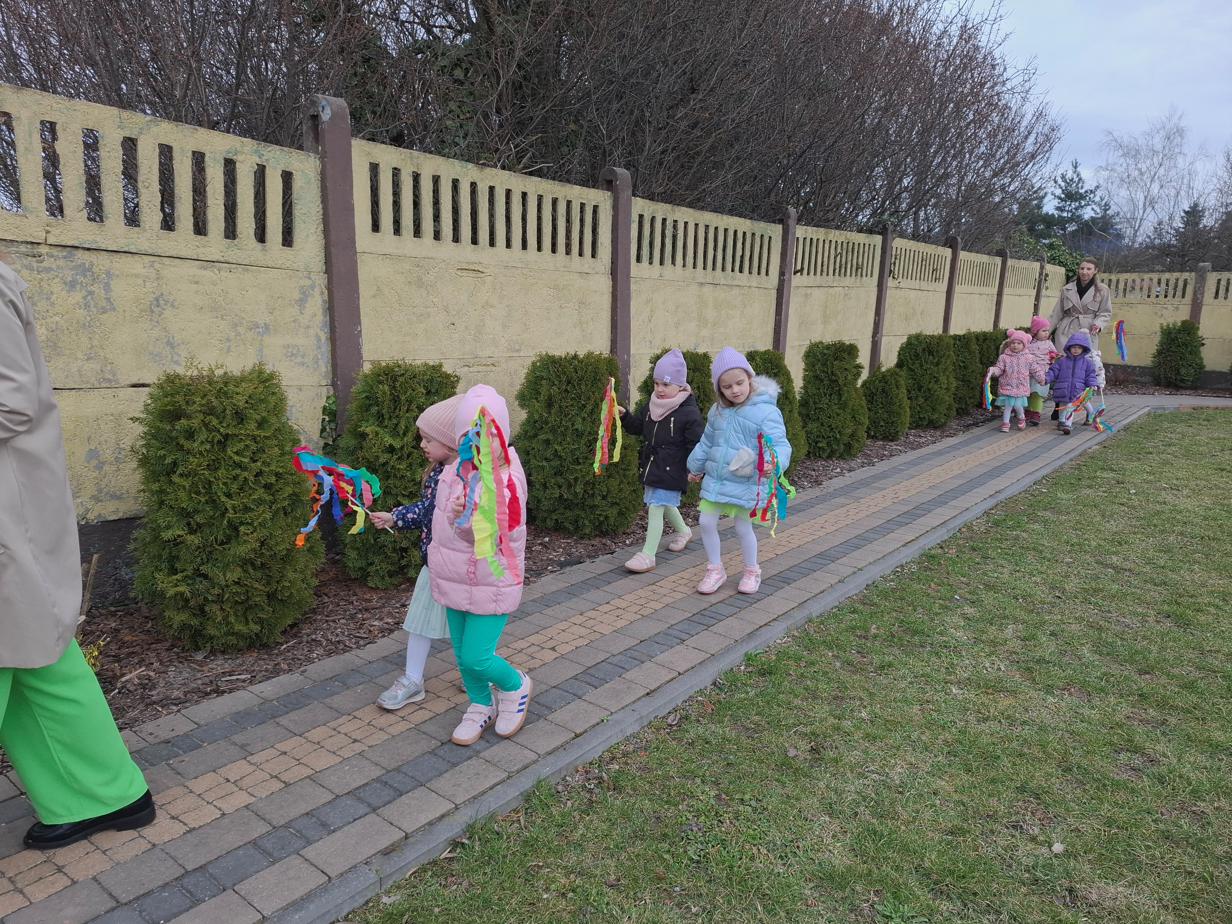 Piątek był dniem pełnym zieleni w najróżniejszych odcieniach. Tego wyjątkowego dnia wszystkie przedszkolaki wyruszły w teren na tradycyjny, coroczny pochód z okazji Pierwszgo Dnia Wiosny. Aniołki z uśmiechami na twarzach wybrały się na spacer po ogrodzie przedszkolnym. Podczas spaceru śpiewały wesołe piosenki o wiośnie i machały kolorowymi chorągiewkami, wprowadzając prawdziwie wiosenną atmosferę. Zapraszamy do obejrzenia załączonego filmiku.