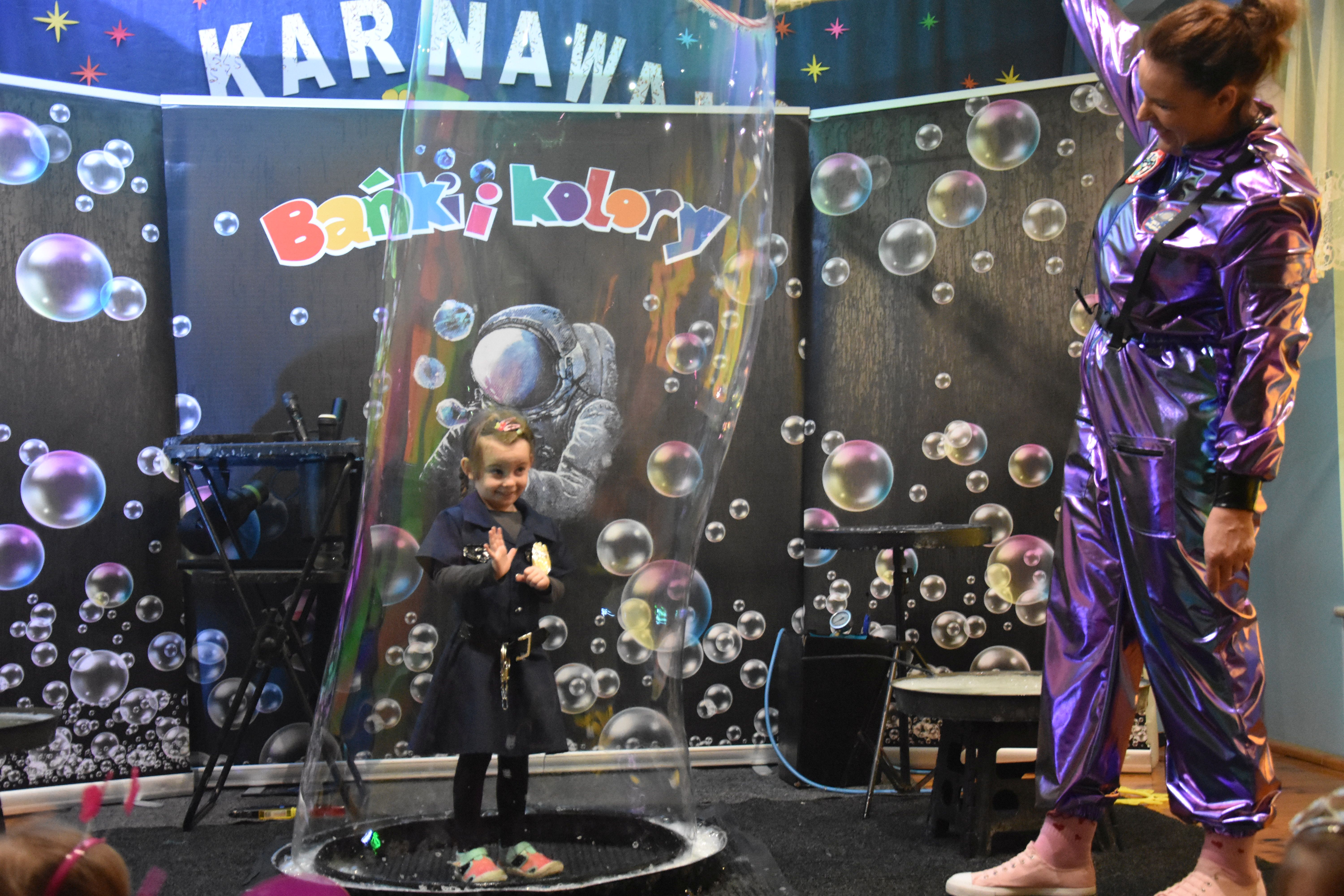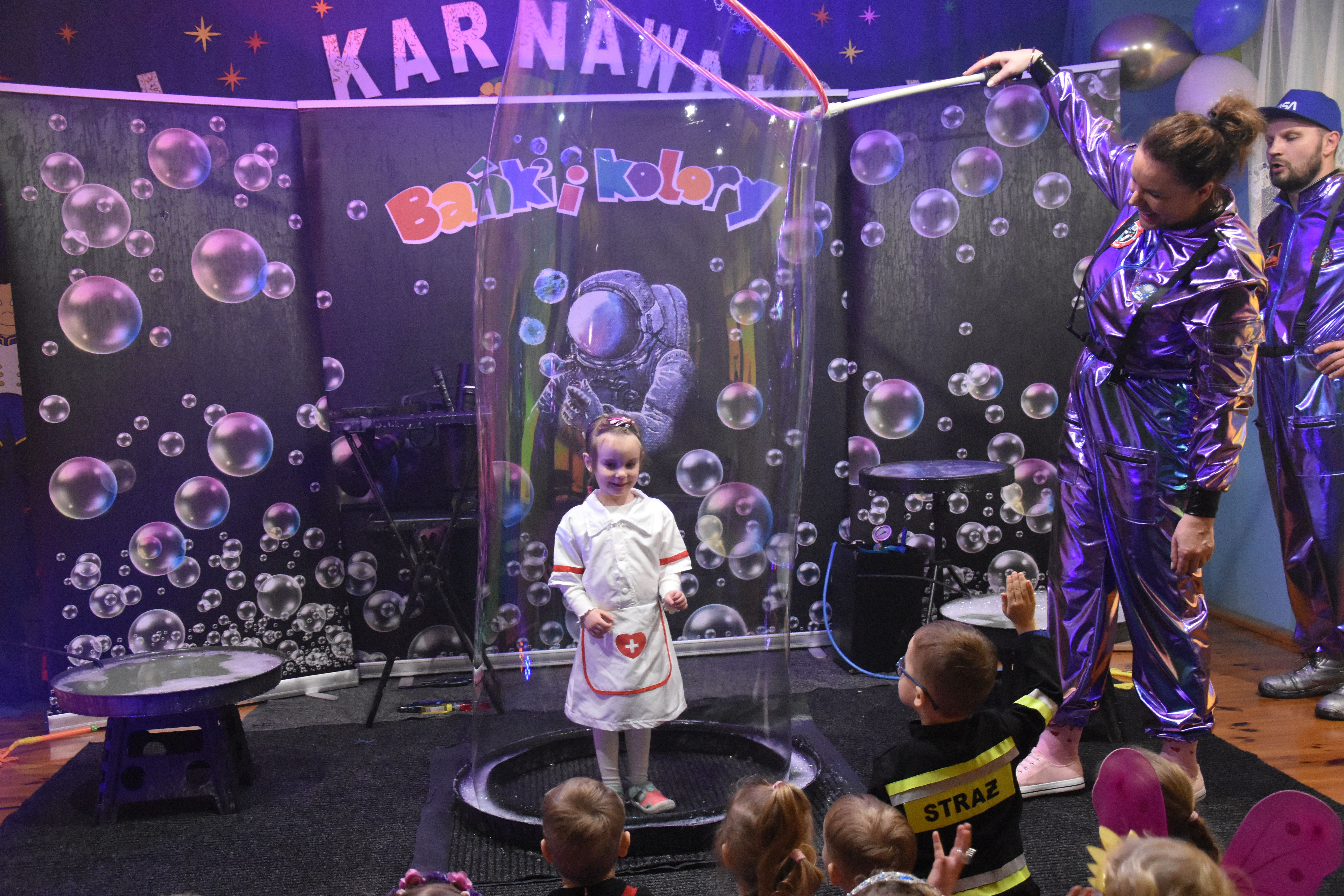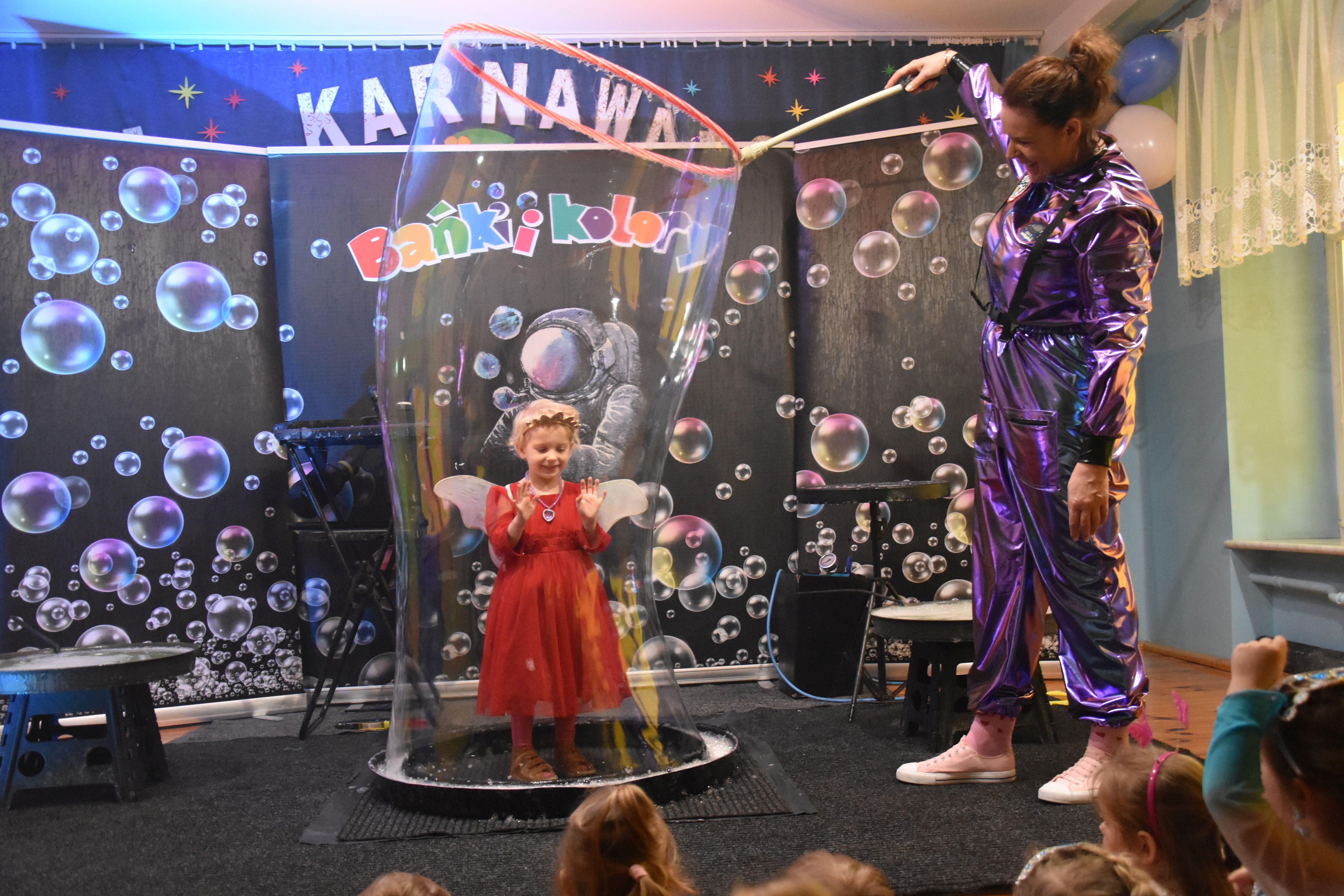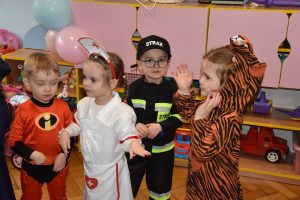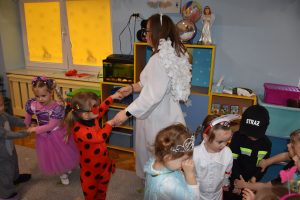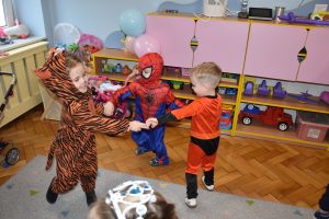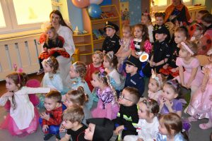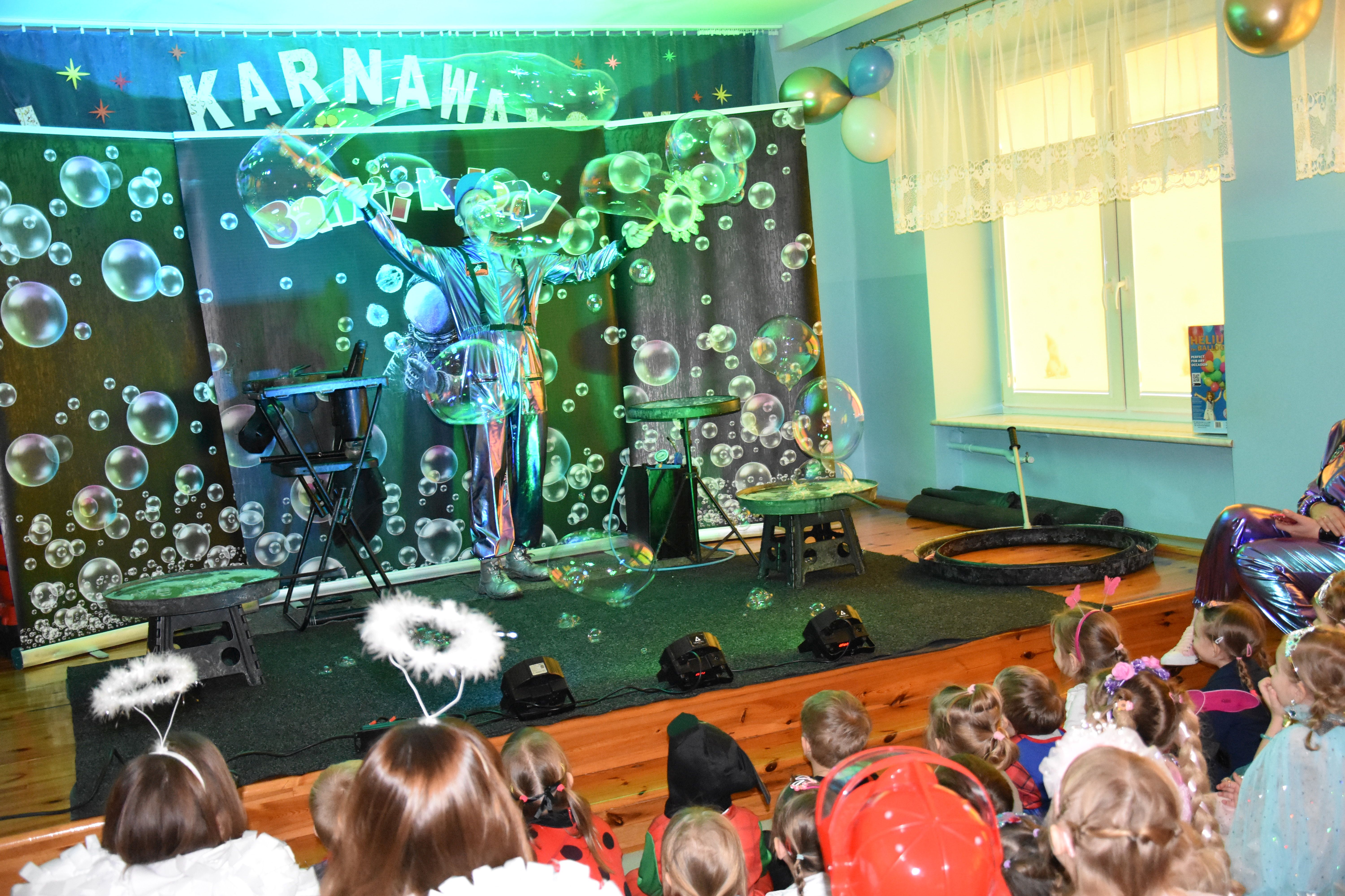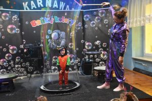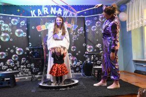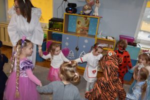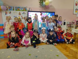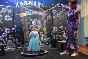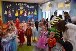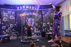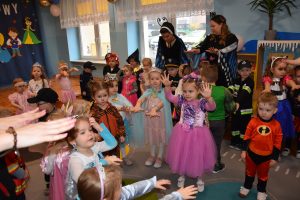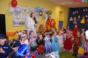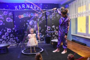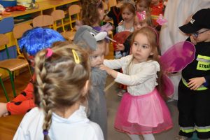 W miniony czwartek w naszym przedszkolu odbył się bal karnawałowy. Już od samego rana do przedszkola przychodziły uśmiechnięte dzieci ubrane w przepiękne, karnawałowe stroje. Wśród nich można było spotkać odważnych superbohaterów, bajkowe księżniczki, urocze syrenki, dzielnych policjantów oraz strażaków gotowych do akcji. W sali rozbrzmiewała muzyka, a dzieci z wielkim entuzjazmem tańczyły do wesołych melodii. Nie zabrakło także licznych konkursów i zabaw ruchowych, które dostarczyły wszystkim mnóstwo śmiechu i pozytywnej energii. Kulminacyjnym punktem dnia był wyjątkowy pokaz baniek mydlanych, który zachwycił każdego małego widza. Dzieci z zapartym tchem obserwowały unoszące się w powietrzu bańki o przeróżnych kształtach i kolorach. Po niezwykłym pokazie na dzieci czekała miła niespodzianka – pyszne przekąski oraz napoje, które pozwoliły nabrać sił po intensywnej zabawie. To był dzień pełen wspólnej zabawy i niezapomnianych przeżyć.