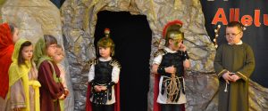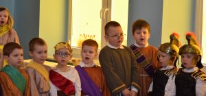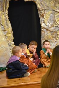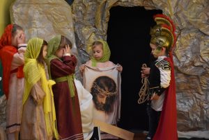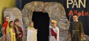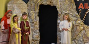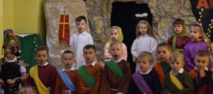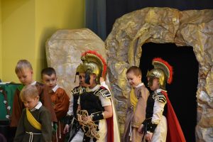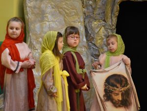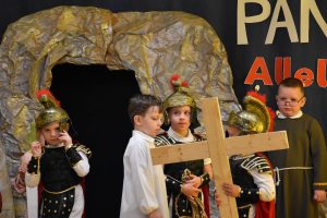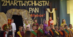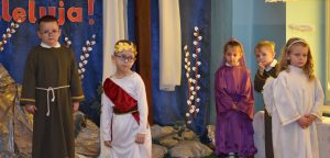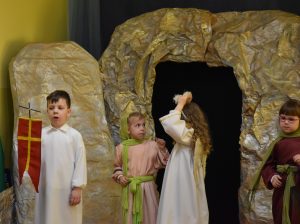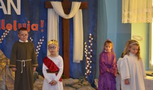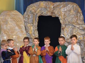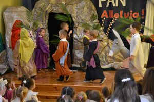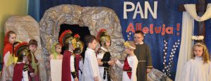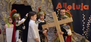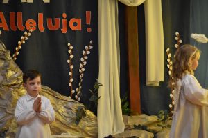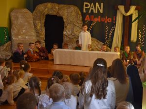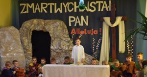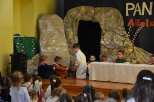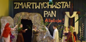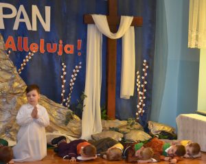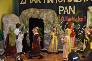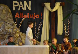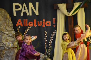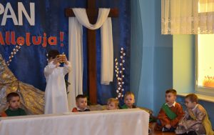 W naszym przedszkolu tradycyjnie w Wielką Środę celebrujemy już obchody świąt wielkanocnych. Z tej okazji dzieci z grupy Pszczółki przygotowały piękne Misterium Wielkanocne nawiązujące do całego Wielkiego Tygodnia począwszy od Niedzieli Palmowej, poprzez Triduum Paschalne, a skończywszy na Zmartwychwstaniu Pana Jezusa. Społeczność przedszkolna zaprosiła na tą uroczystosć ks. Proboszcza, s.Przełożoną wraz z siostrami emerytkami i całą wspólnotę zakonną. Po inscenizacji ks. Proboszcz przeszedł po salach poświęcić przygotowane przez dzieci koszyczki.