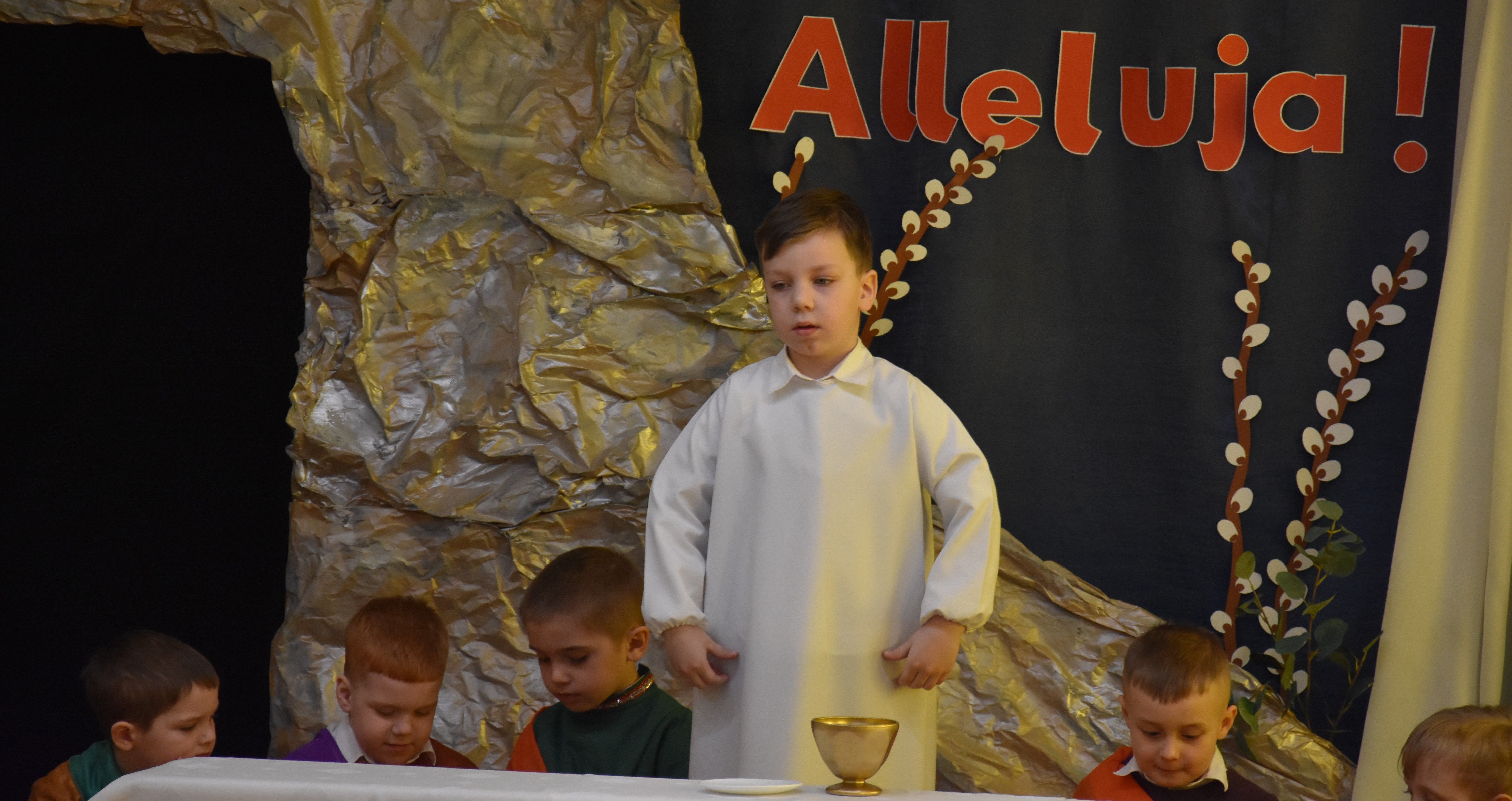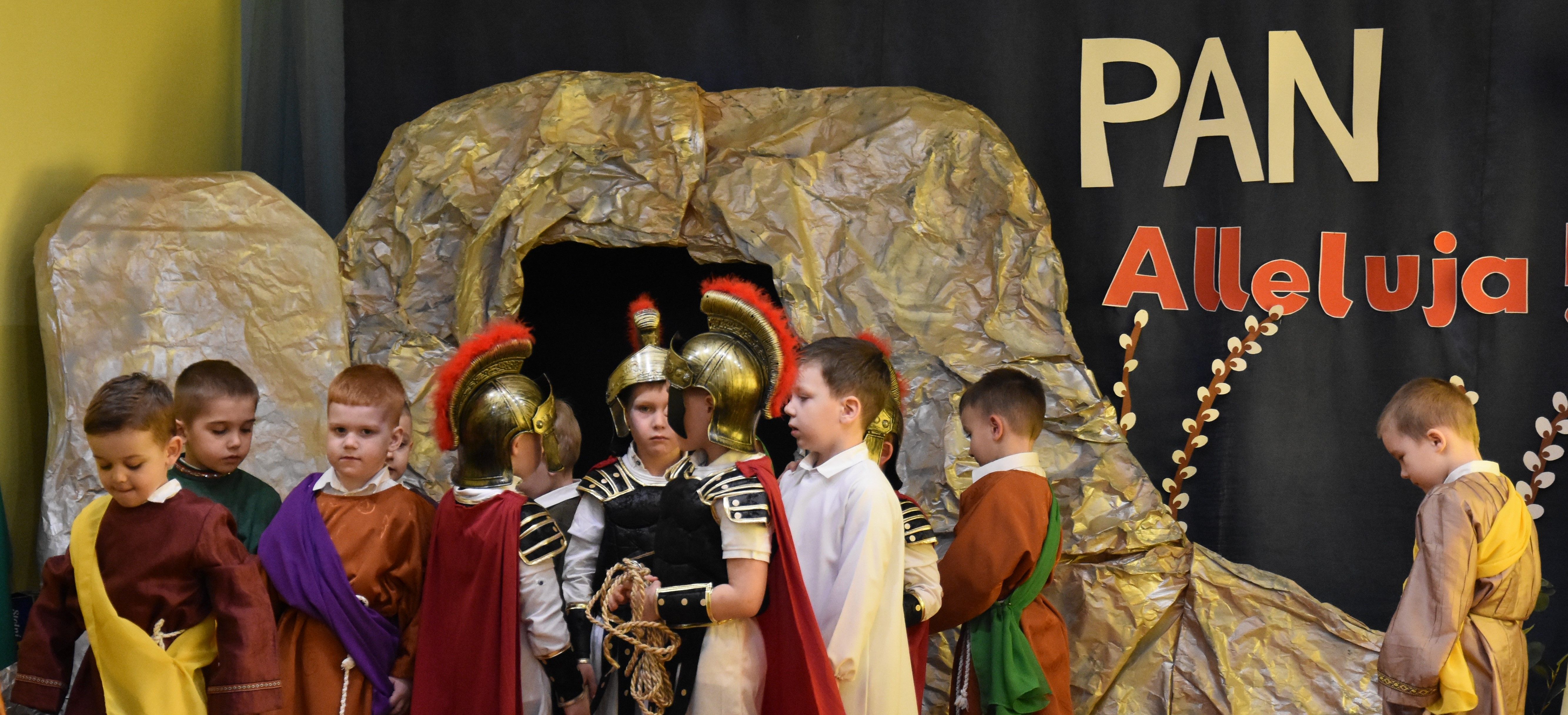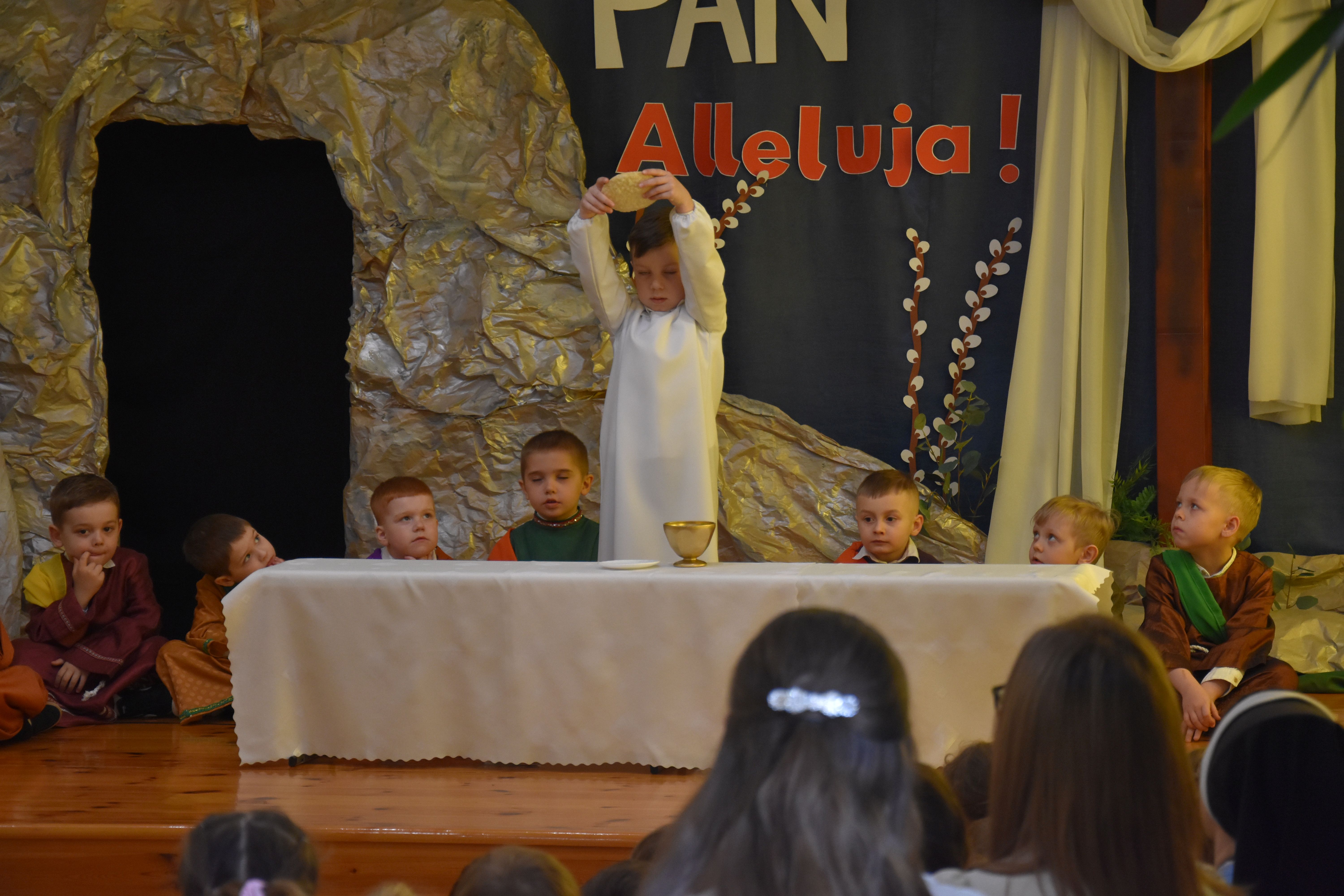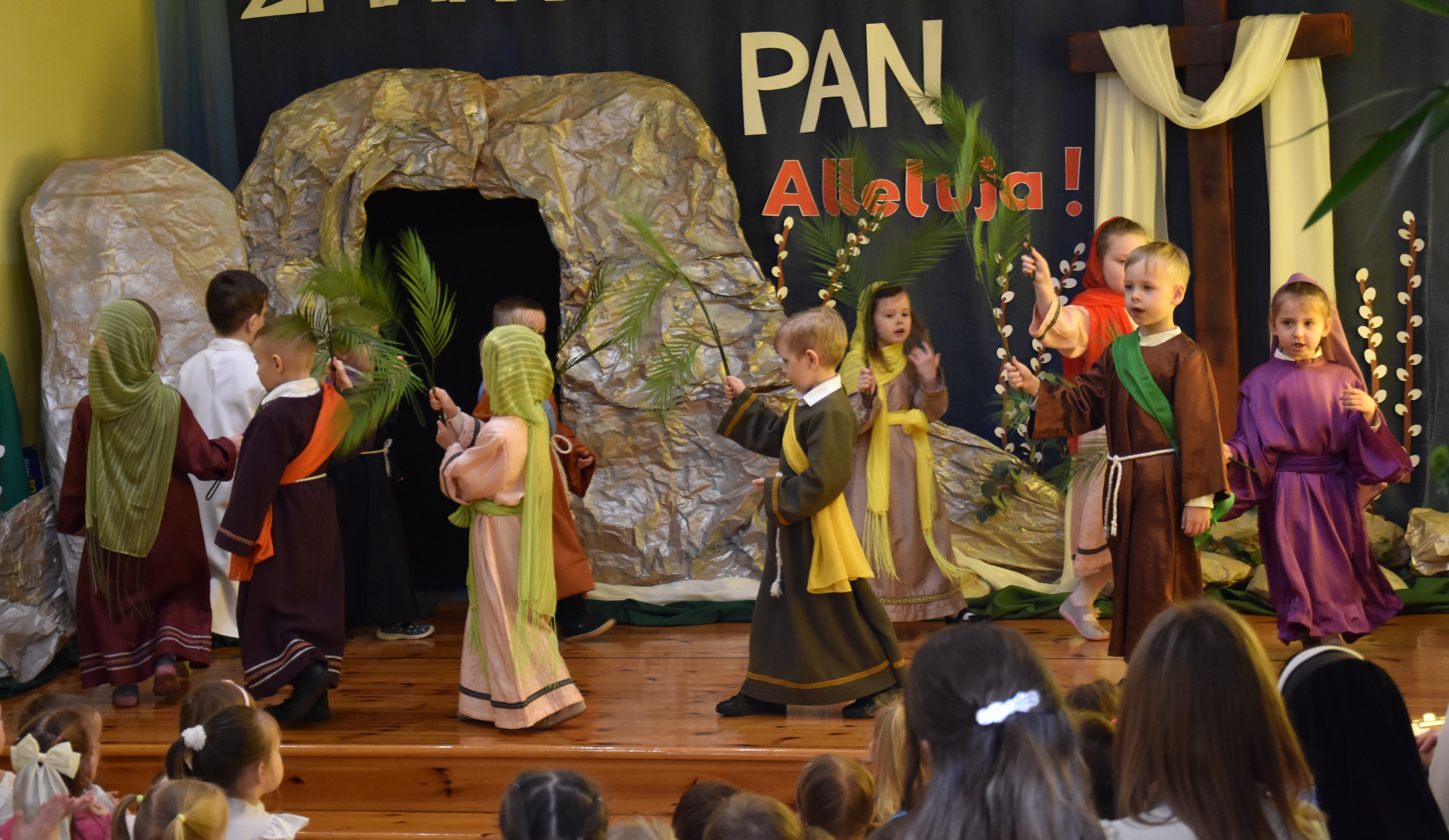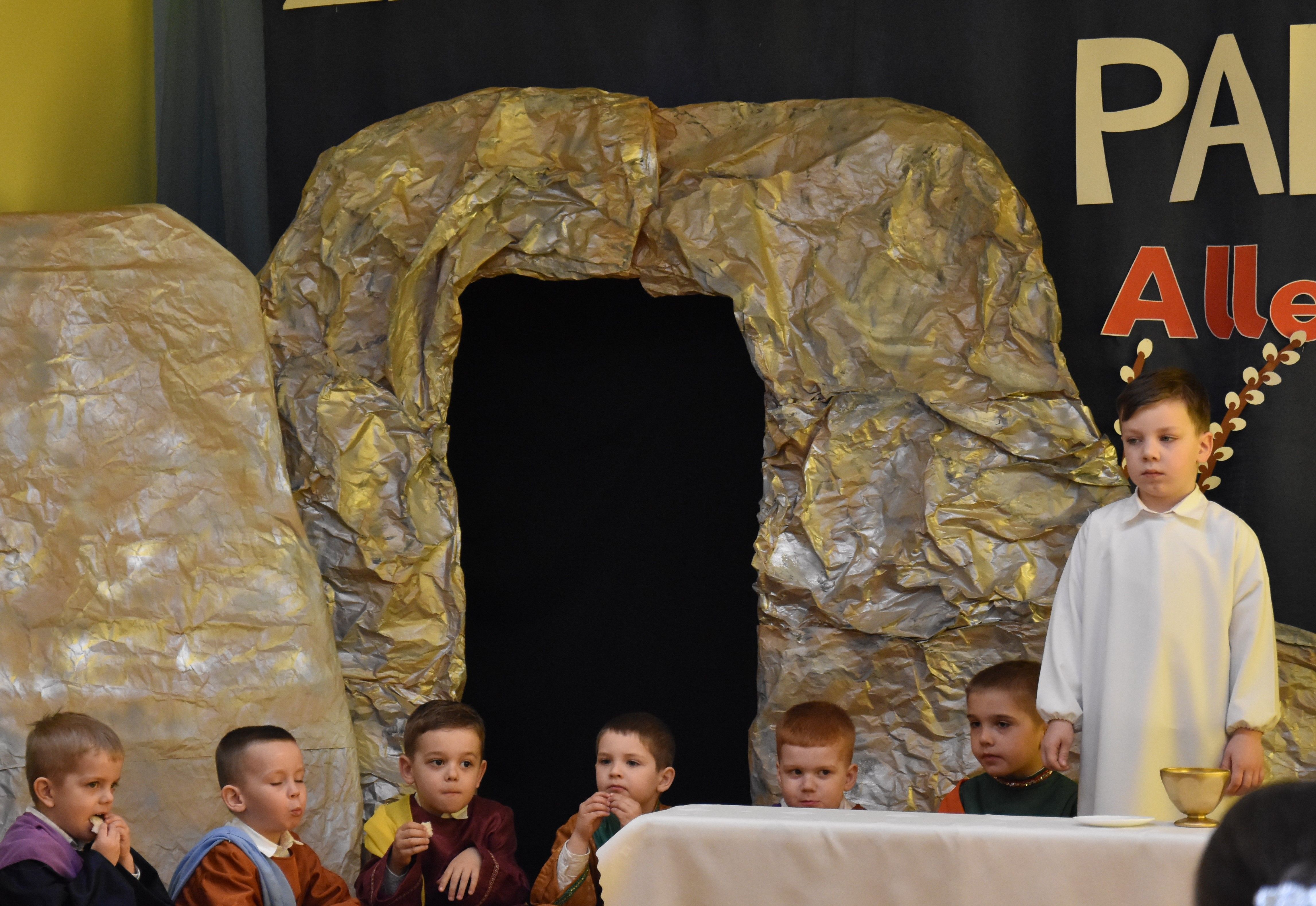 W naszym przedszkolu tradycyjnie w Wielką Środę celebrujemy już obchody świąt wielkanocnych. Z tej okazji dzieci z grupy Pszczółki przygotowały piękne Misterium Wielkanocne nawiązujące do całego Wielkiego Tygodnia począwszy od Niedzieli Palmowej, poprzez Triduum Paschalne, a skończywszy na Zmartwychwstaniu Pana Jezusa. Społeczność przedszkolna zaprosiła na tą uroczystosć ks. Proboszcza, s.Przełożoną wraz z siostrami emerytkami i całą wspólnotę zakonną. Po inscenizacji ks. Proboszcz przeszedł po salach poświęcić przygotowane przez dzieci koszyczki.