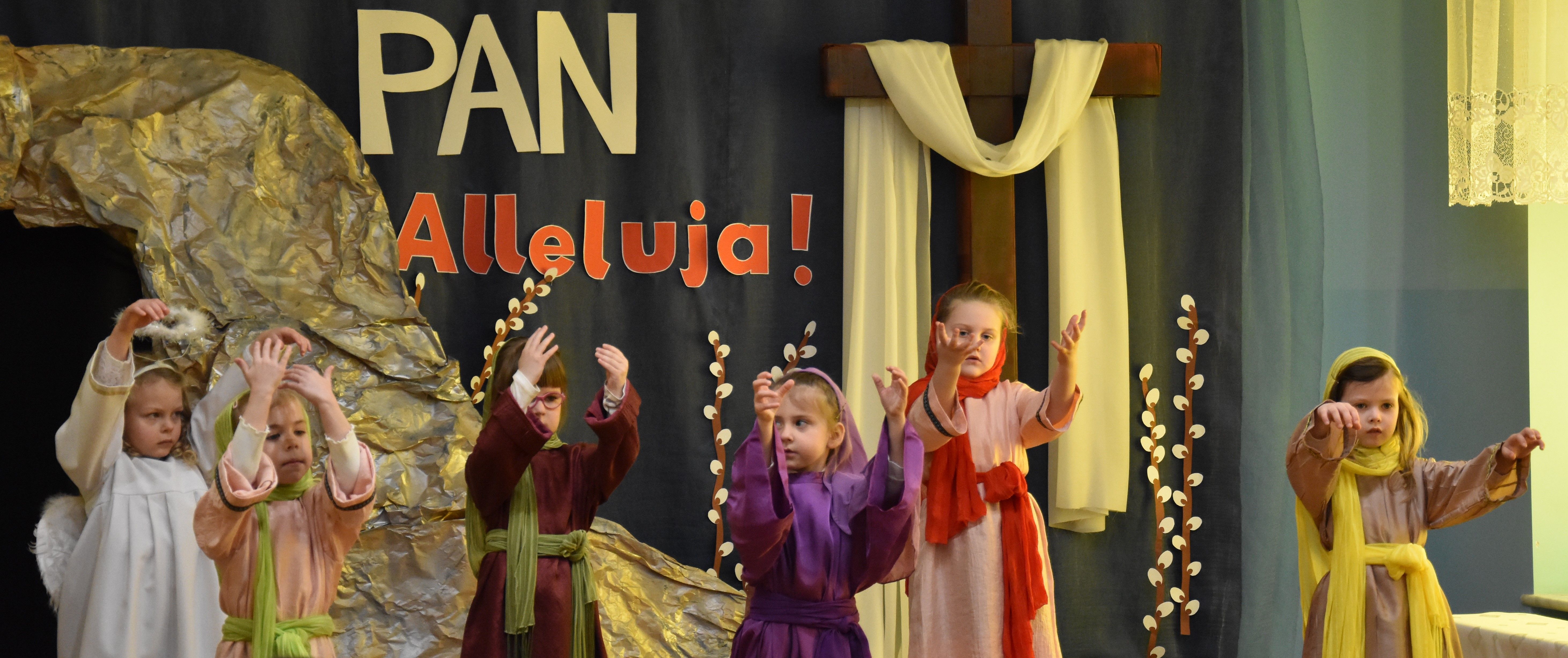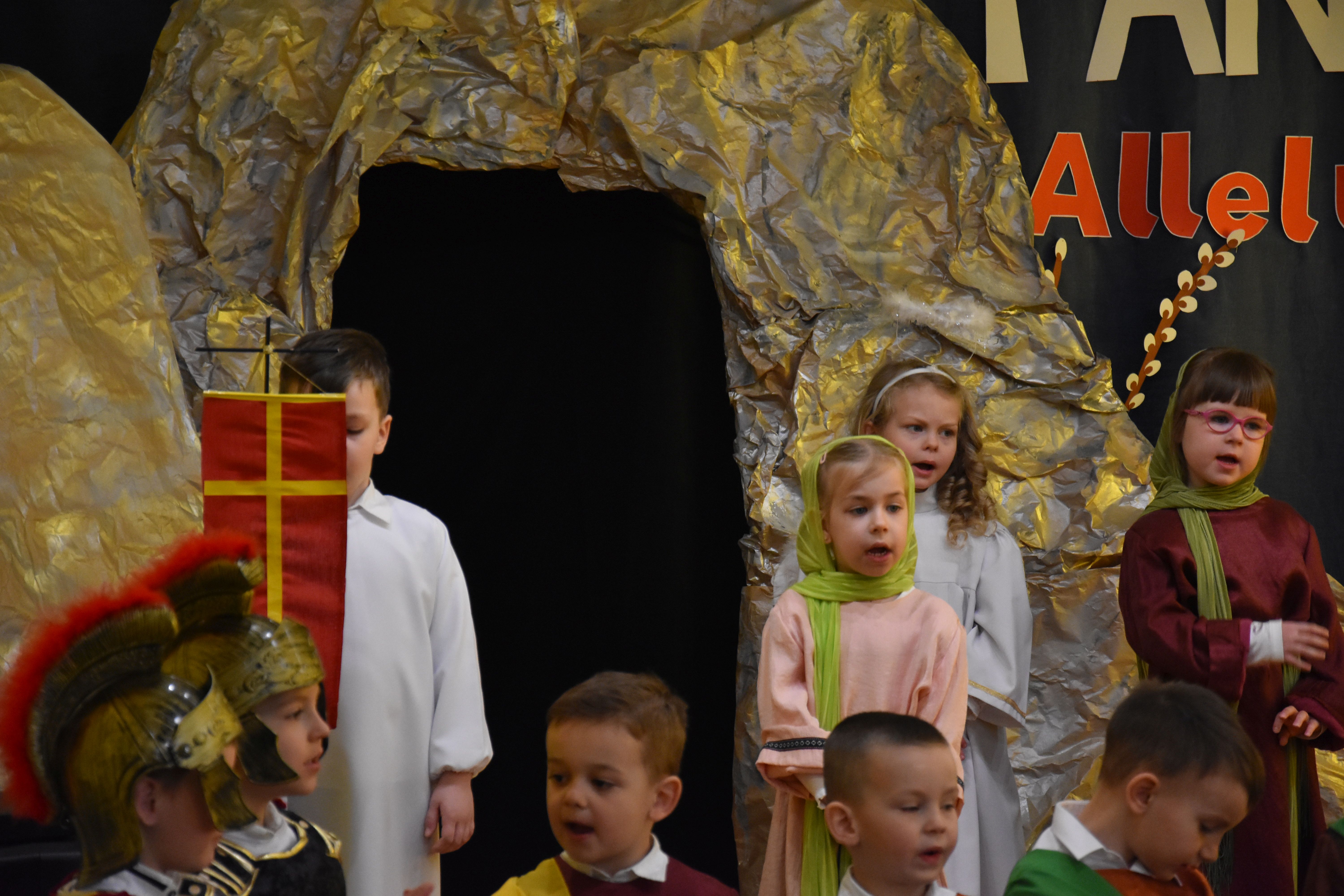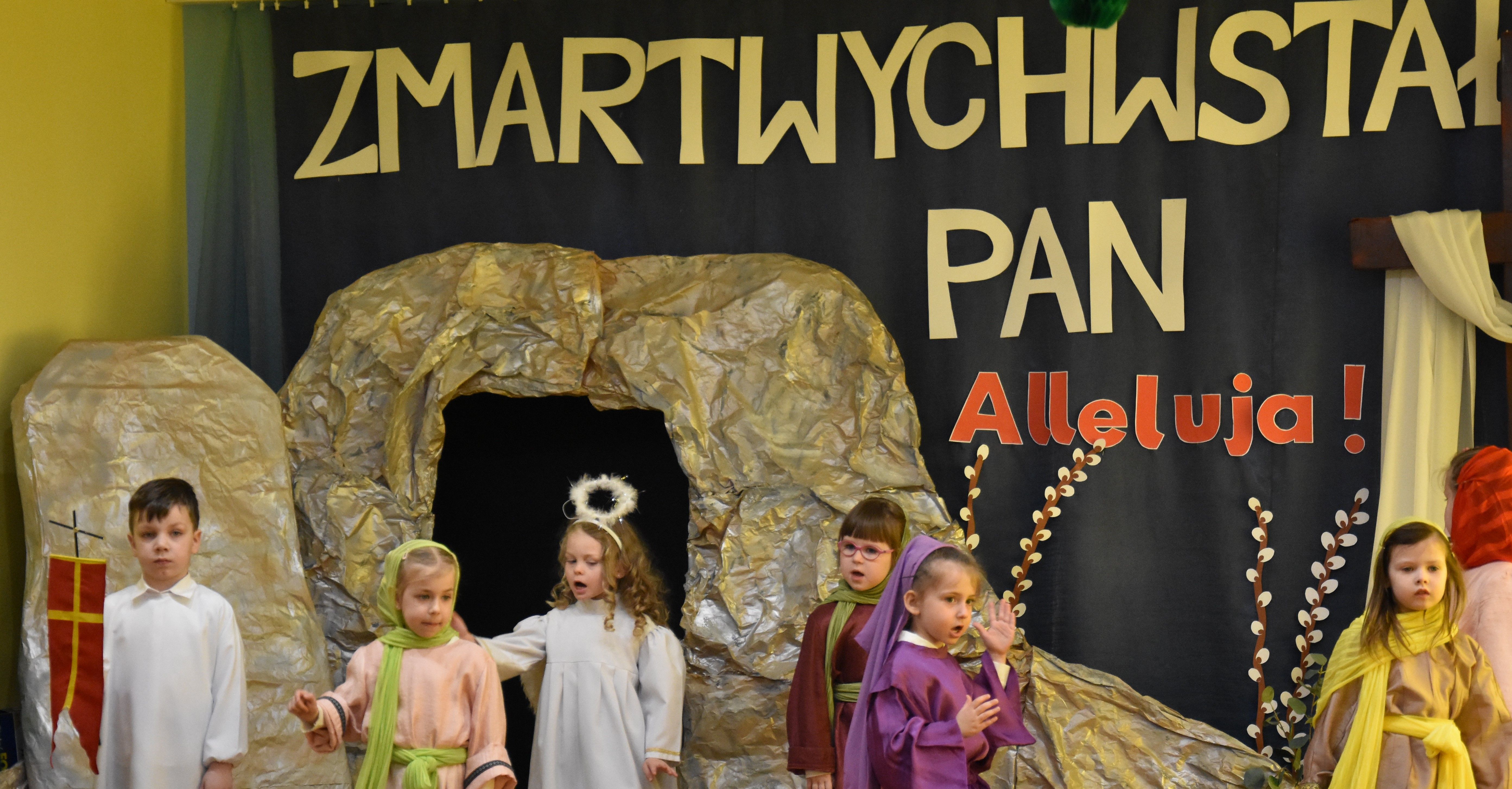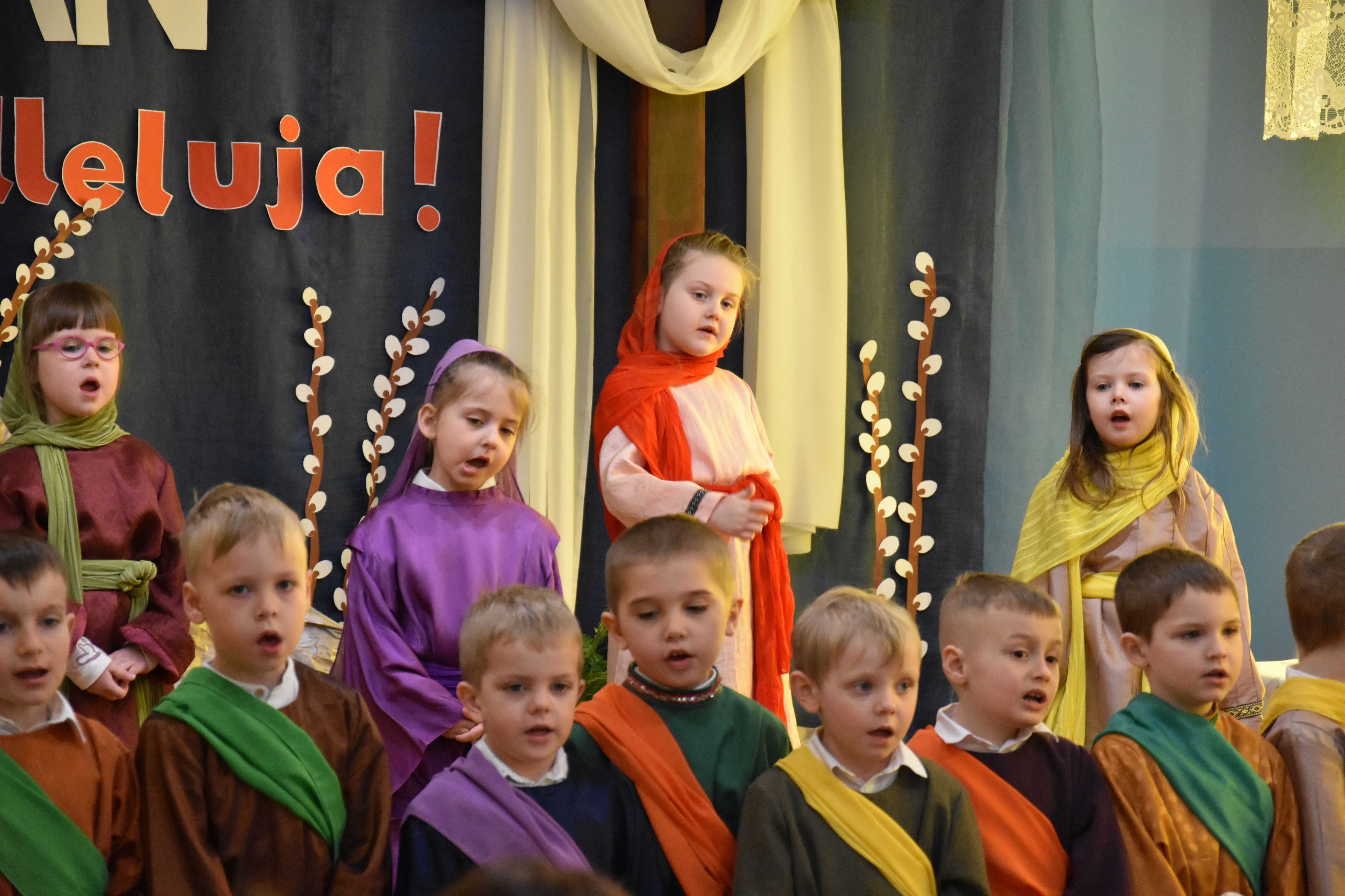 W naszym przedszkolu tradycyjnie w Wielką Środę celebrujemy już obchody świąt wielkanocnych. Z tej okazji dzieci z grupy Pszczółki przygotowały piękne Misterium Wielkanocne nawiązujące do całego Wielkiego Tygodnia począwszy od Niedzieli Palmowej, poprzez Triduum Paschalne, a skończywszy na Zmartwychwstaniu Pana Jezusa. Społeczność przedszkolna zaprosiła na tą uroczystosć ks. Proboszcza, s.Przełożoną wraz z siostrami emerytkami i całą wspólnotę zakonną. Po inscenizacji ks. Proboszcz przeszedł po salach poświęcić przygotowane przez dzieci koszyczki.