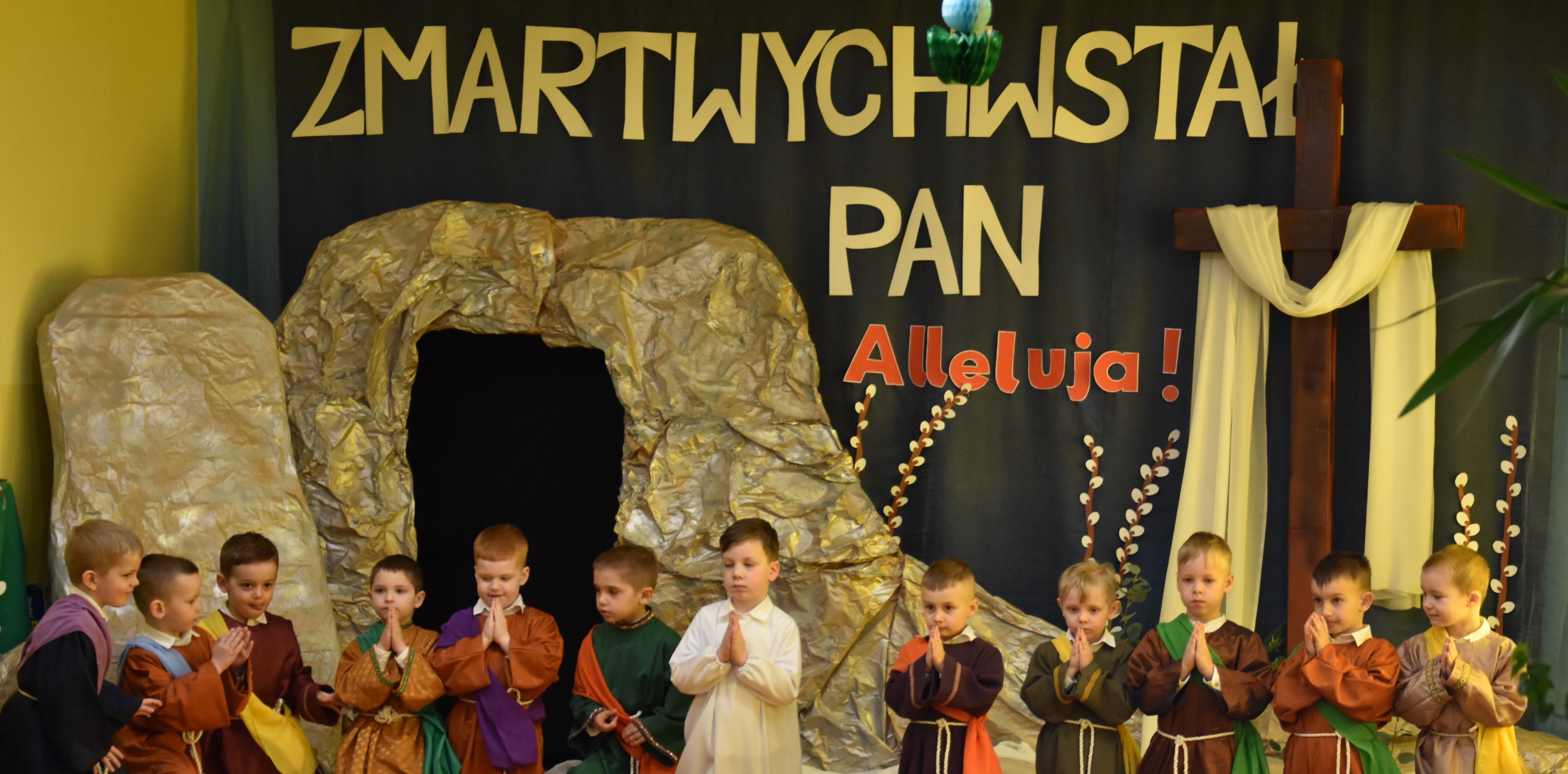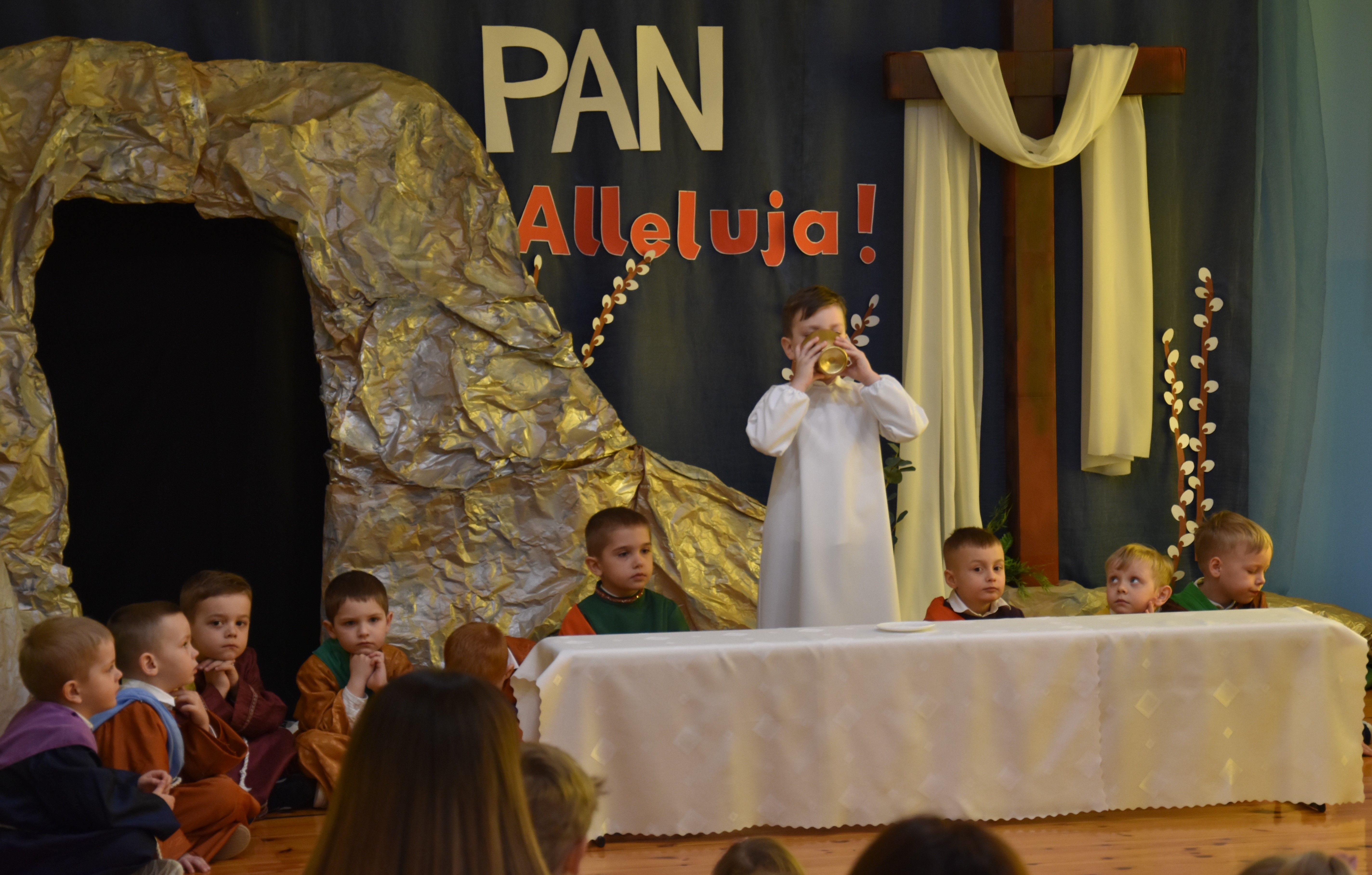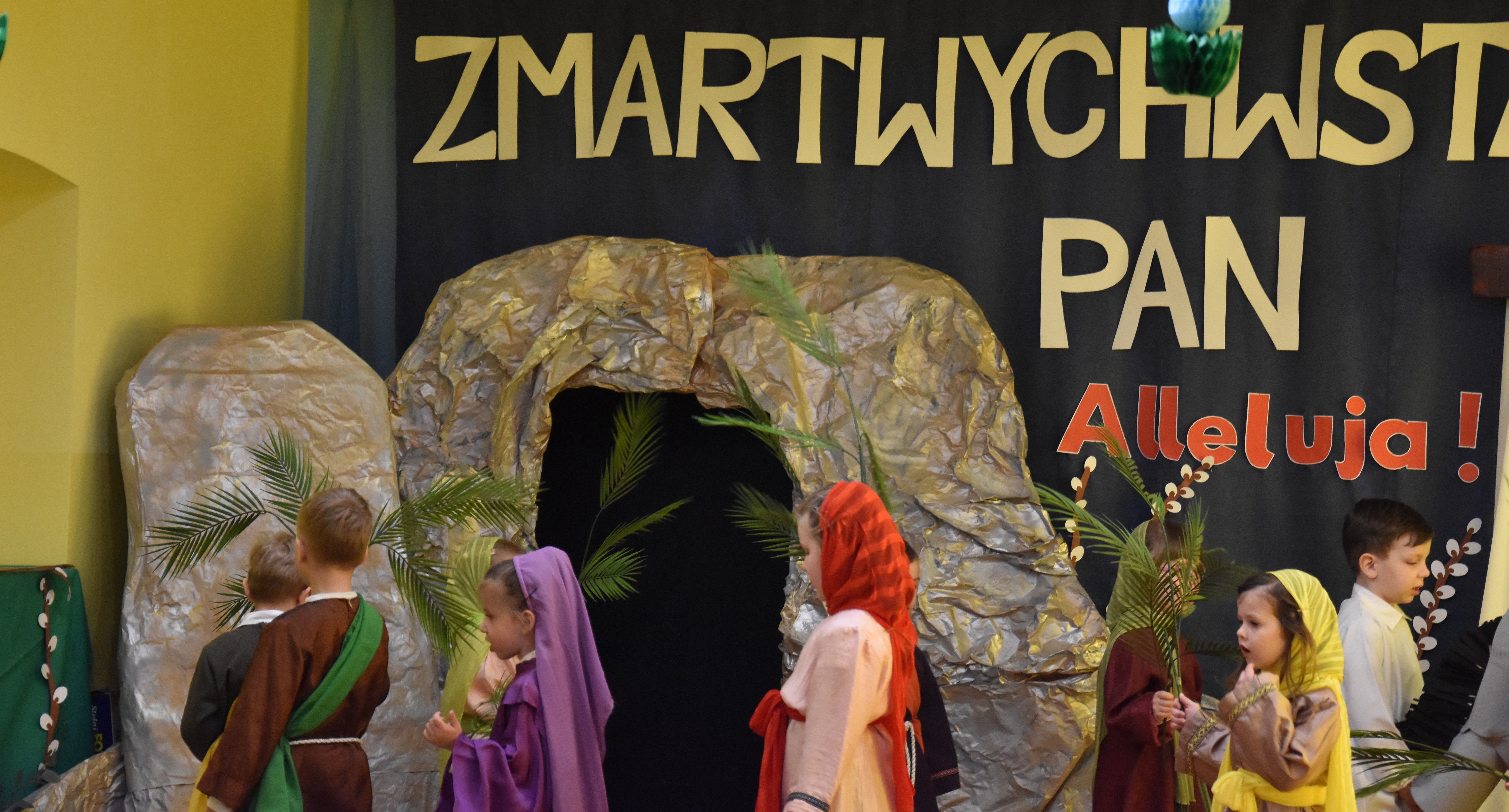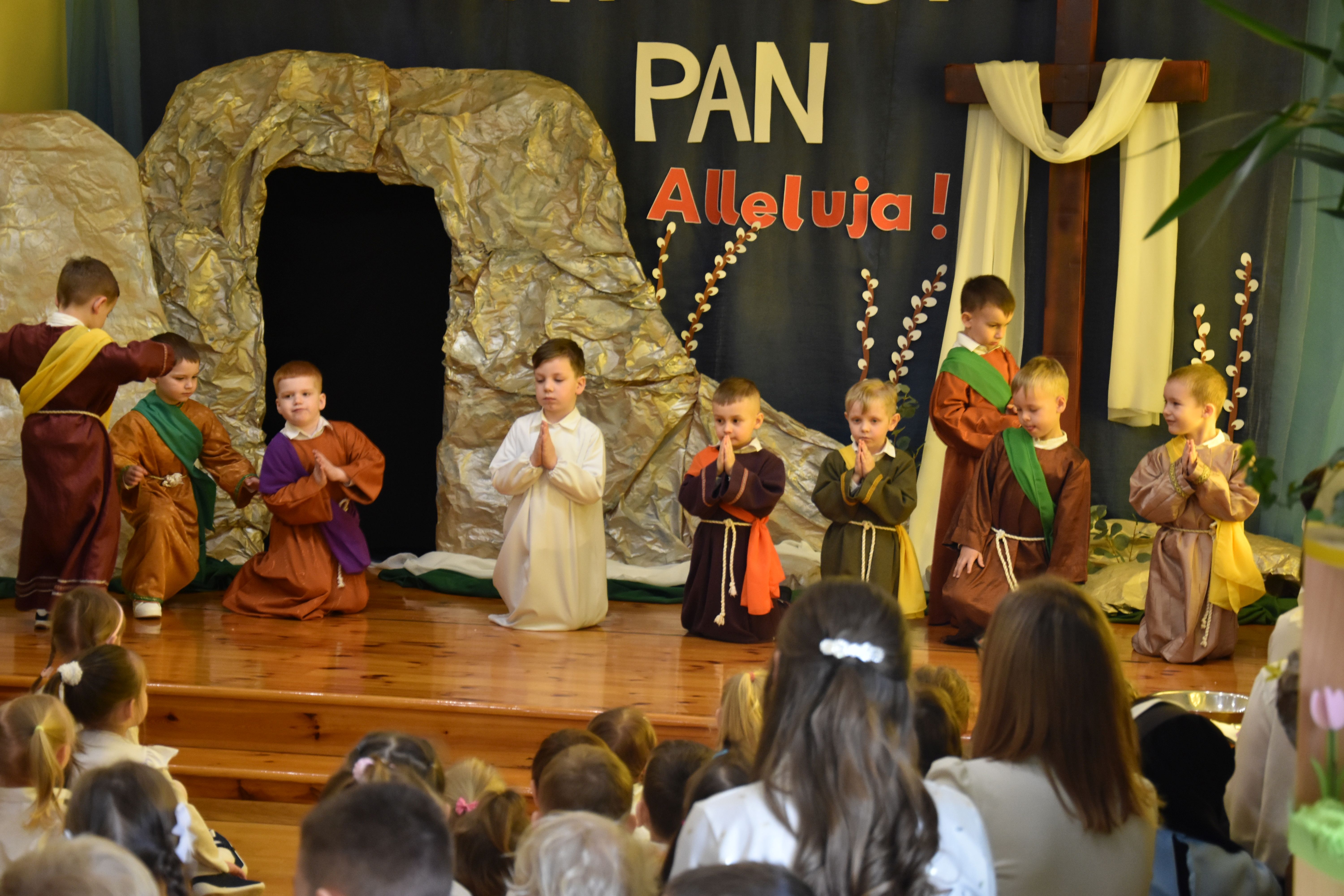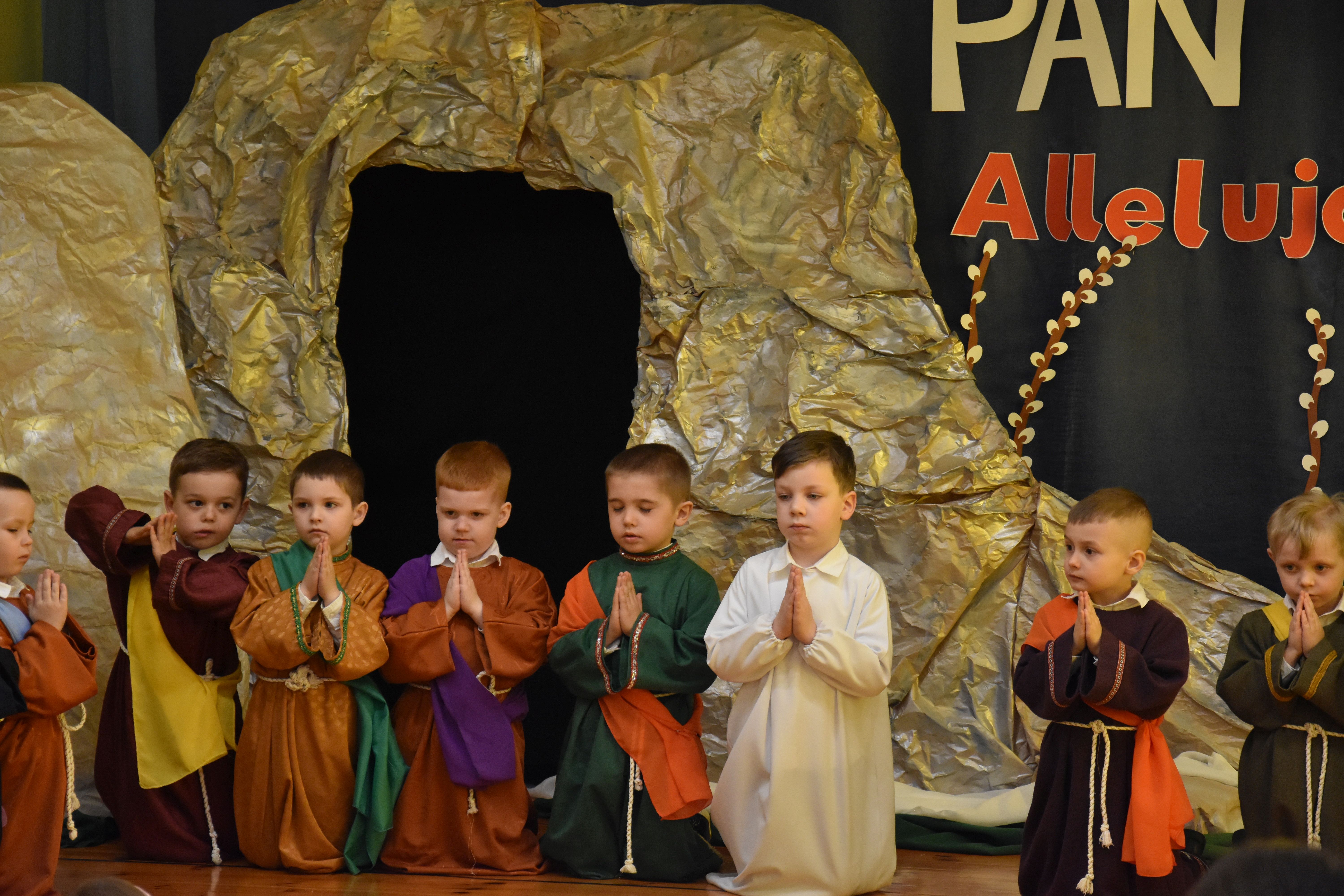 W naszym przedszkolu tradycyjnie w Wielką Środę celebrujemy już obchody świąt wielkanocnych. Z tej okazji dzieci z grupy Pszczółki przygotowały piękne Misterium Wielkanocne nawiązujące do całego Wielkiego Tygodnia począwszy od Niedzieli Palmowej, poprzez Triduum Paschalne, a skończywszy na Zmartwychwstaniu Pana Jezusa. Społeczność przedszkolna zaprosiła na tą uroczystosć ks. Proboszcza, s.Przełożoną wraz z siostrami emerytkami i całą wspólnotę zakonną. Po inscenizacji ks. Proboszcz przeszedł po salach poświęcić przygotowane przez dzieci koszyczki.