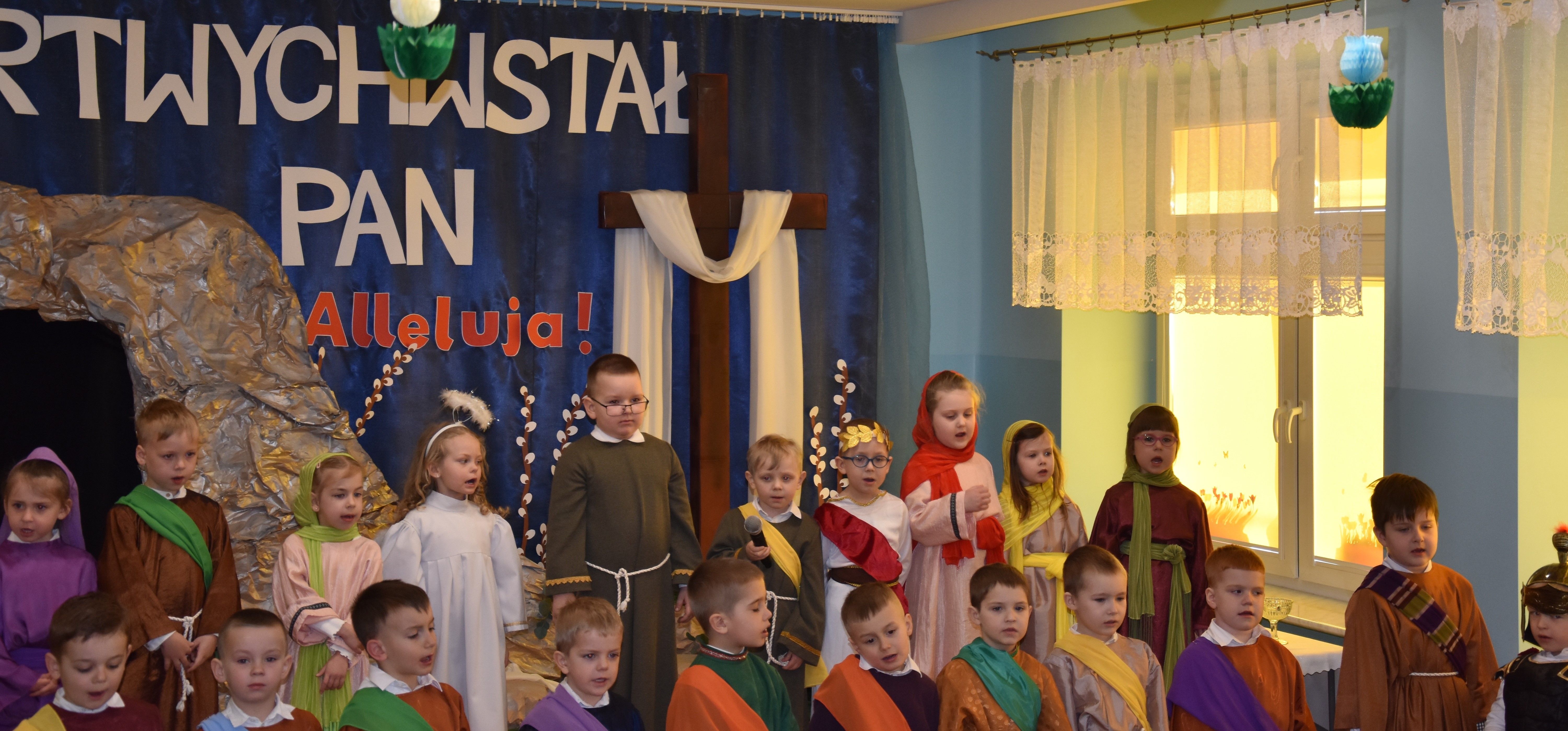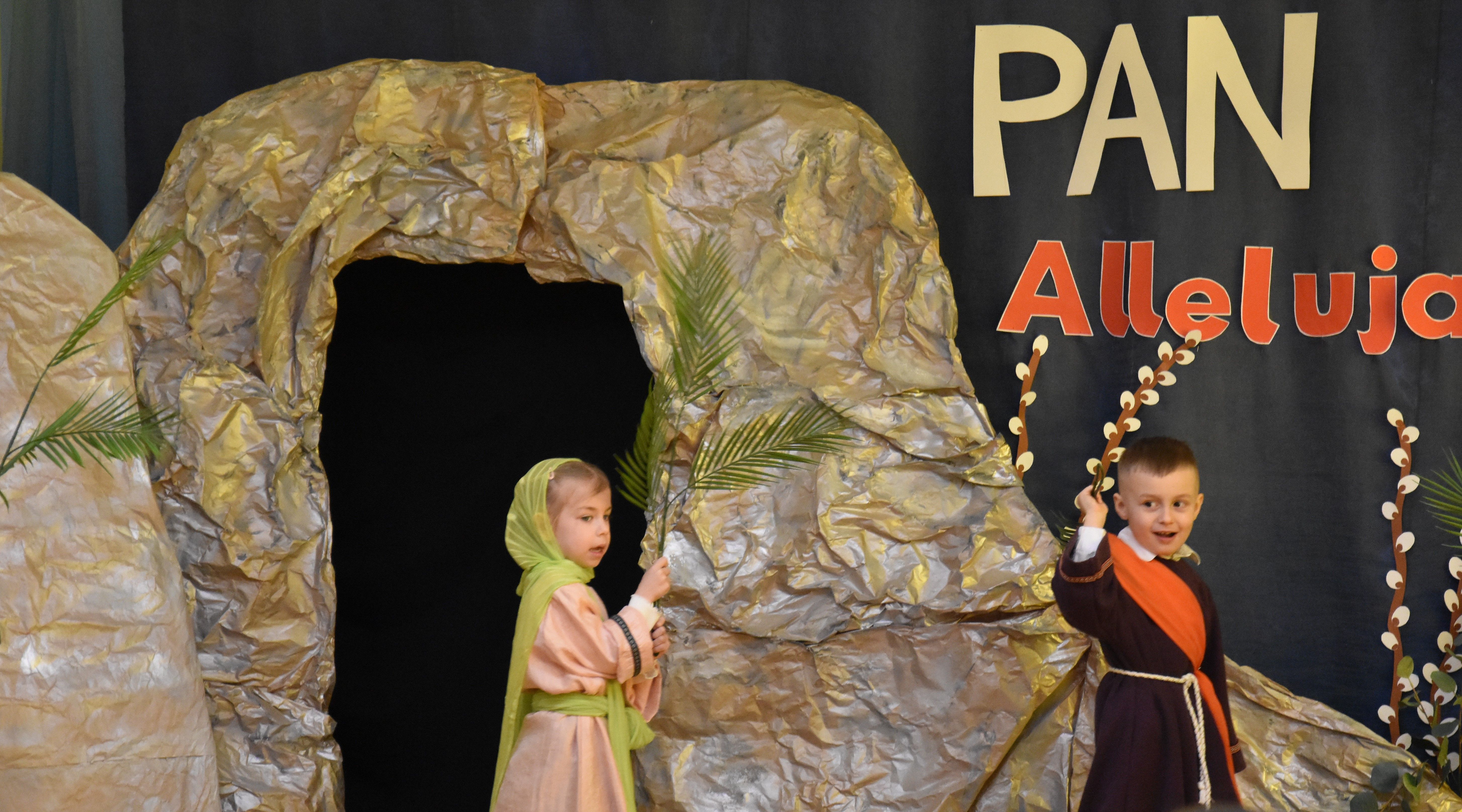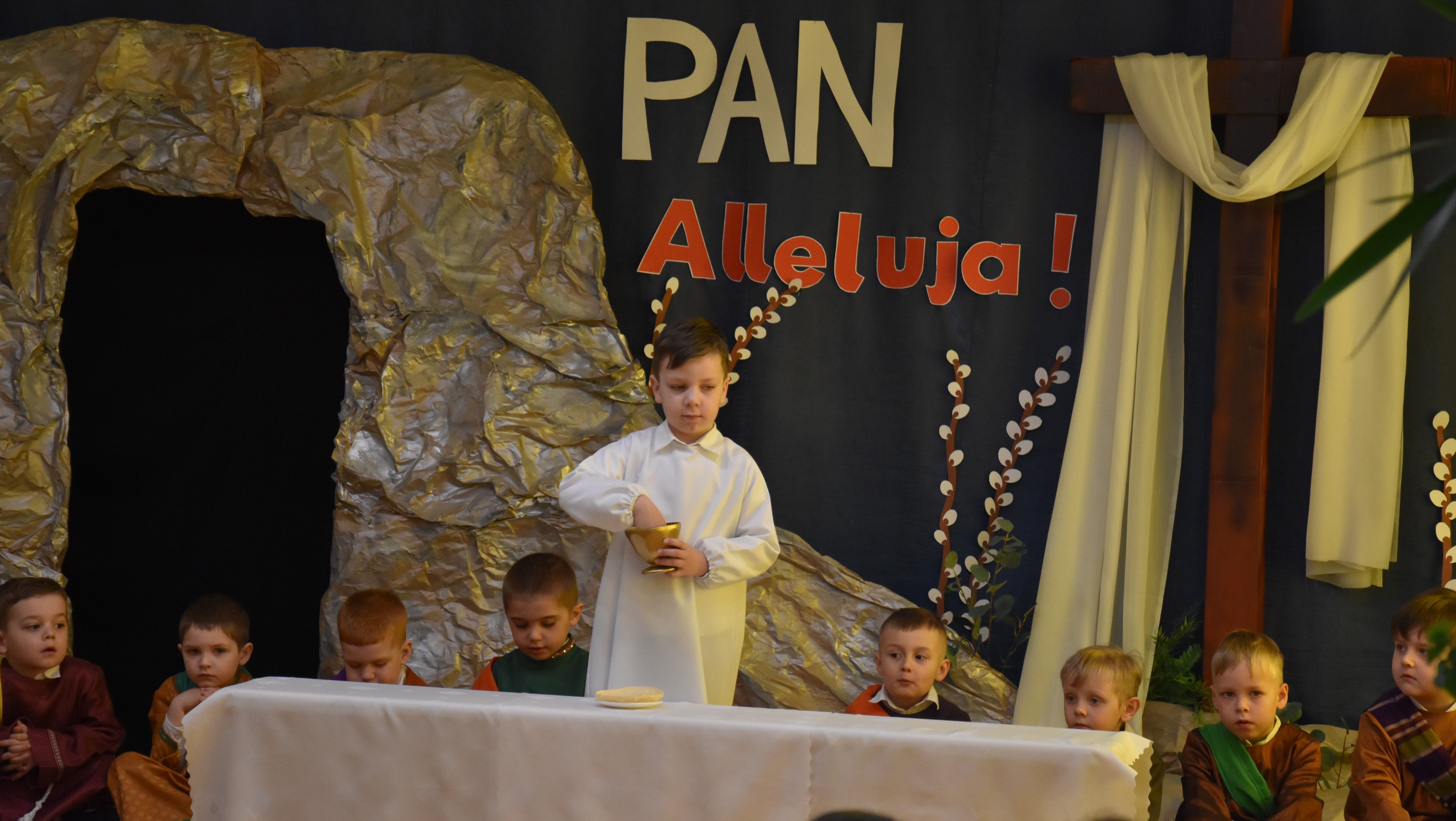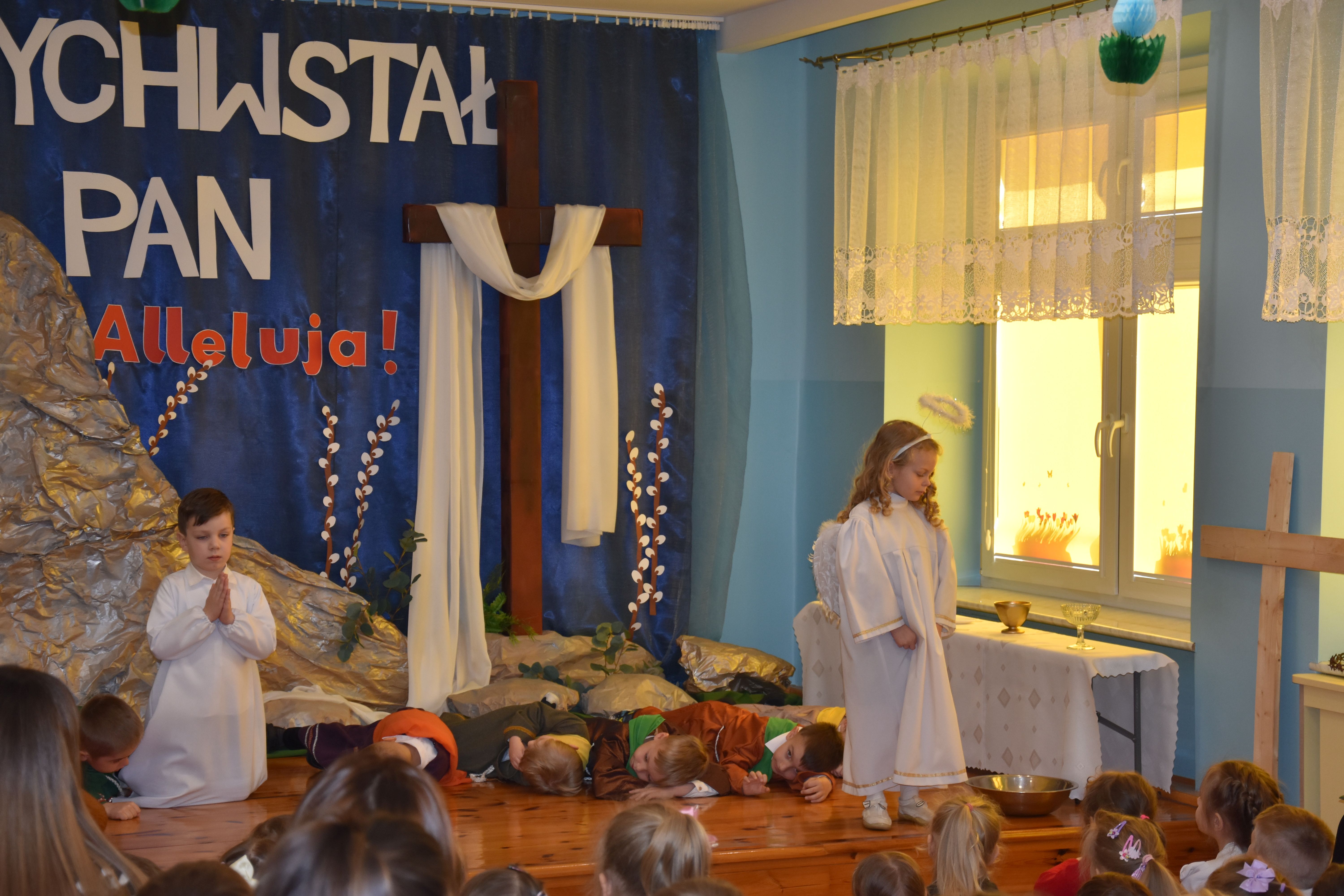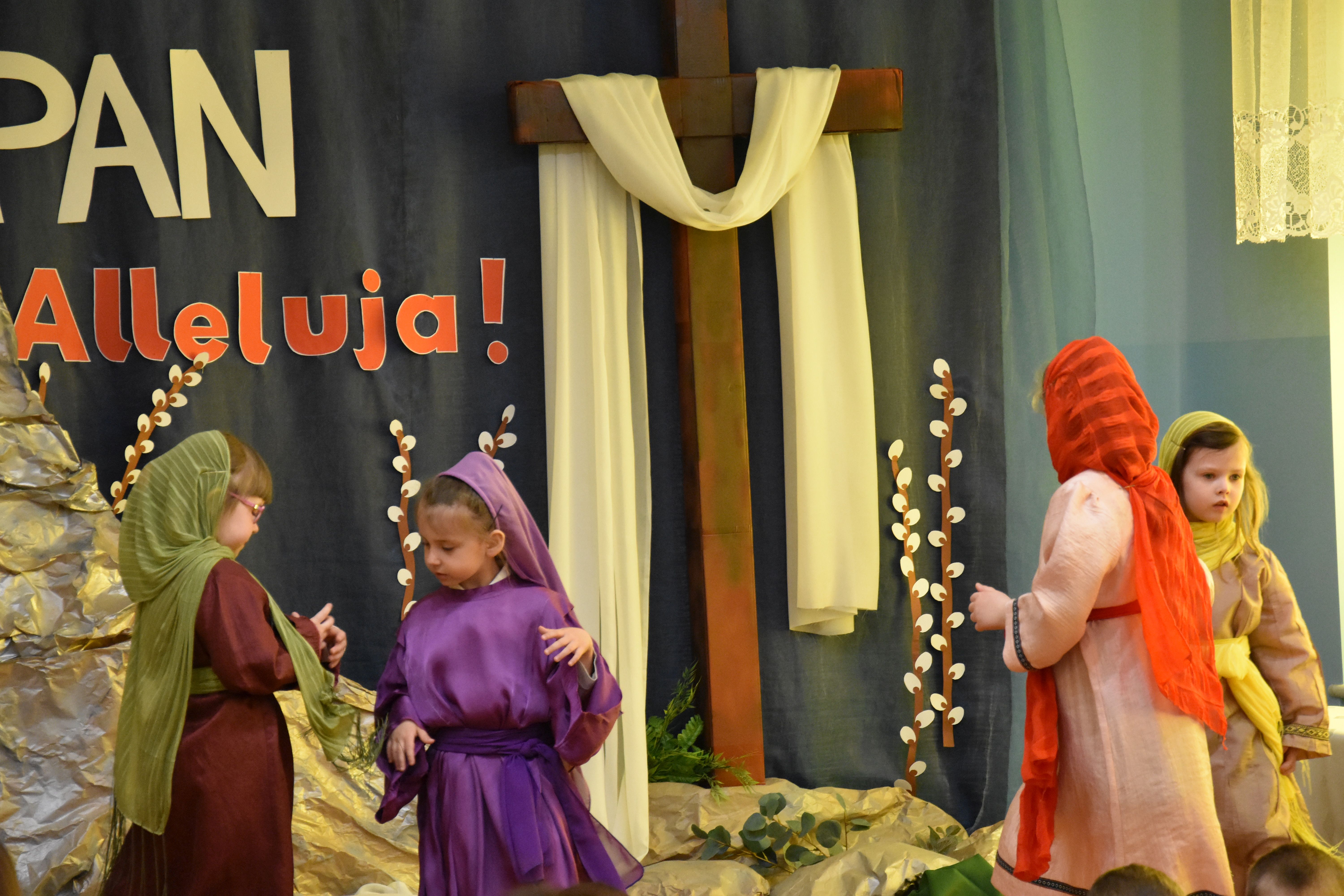 W naszym przedszkolu tradycyjnie w Wielką Środę celebrujemy już obchody świąt wielkanocnych. Z tej okazji dzieci z grupy Pszczółki przygotowały piękne Misterium Wielkanocne nawiązujące do całego Wielkiego Tygodnia począwszy od Niedzieli Palmowej, poprzez Triduum Paschalne, a skończywszy na Zmartwychwstaniu Pana Jezusa. Społeczność przedszkolna zaprosiła na tą uroczystosć ks. Proboszcza, s.Przełożoną wraz z siostrami emerytkami i całą wspólnotę zakonną. Po inscenizacji ks. Proboszcz przeszedł po salach poświęcić przygotowane przez dzieci koszyczki.
