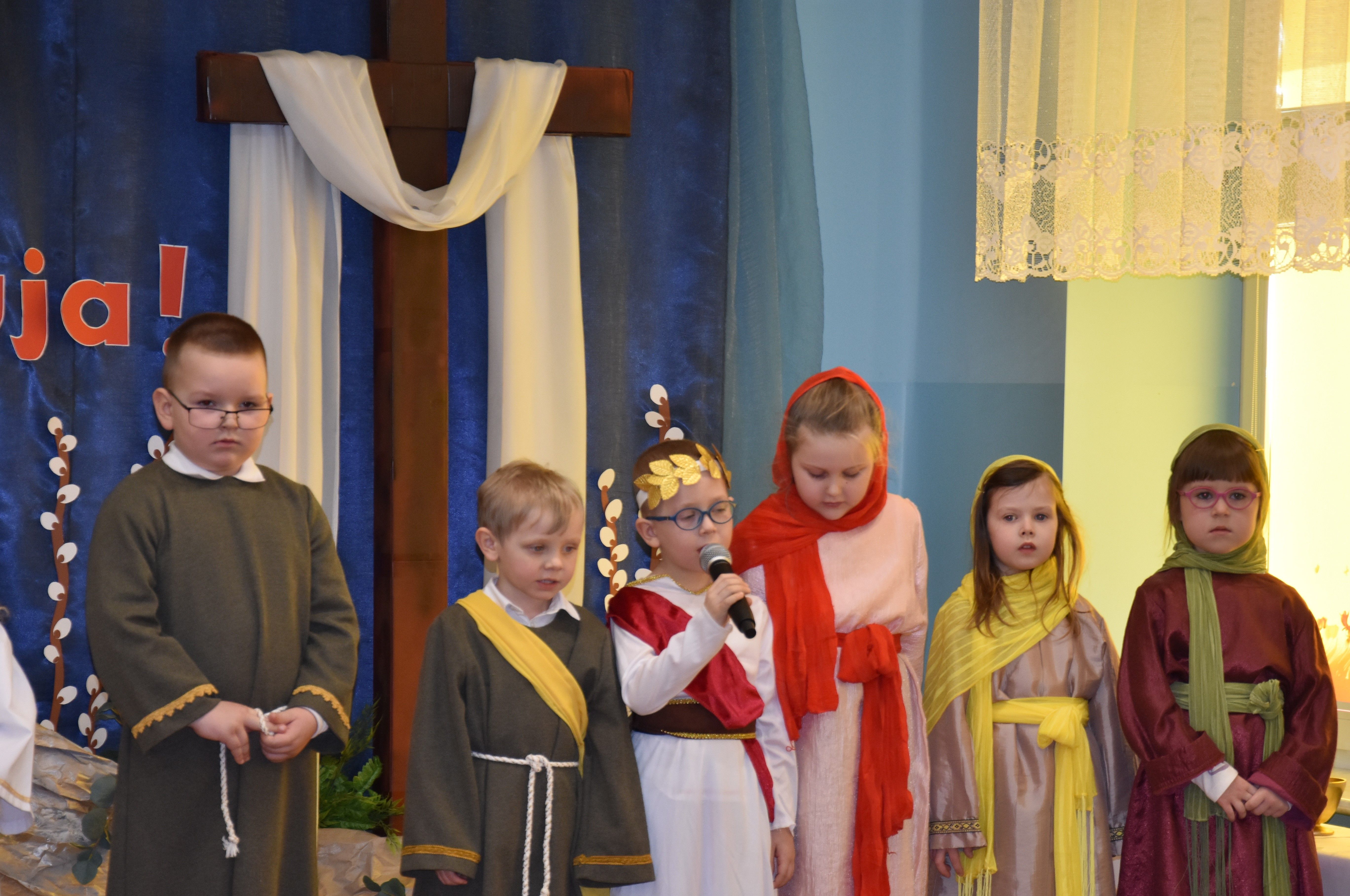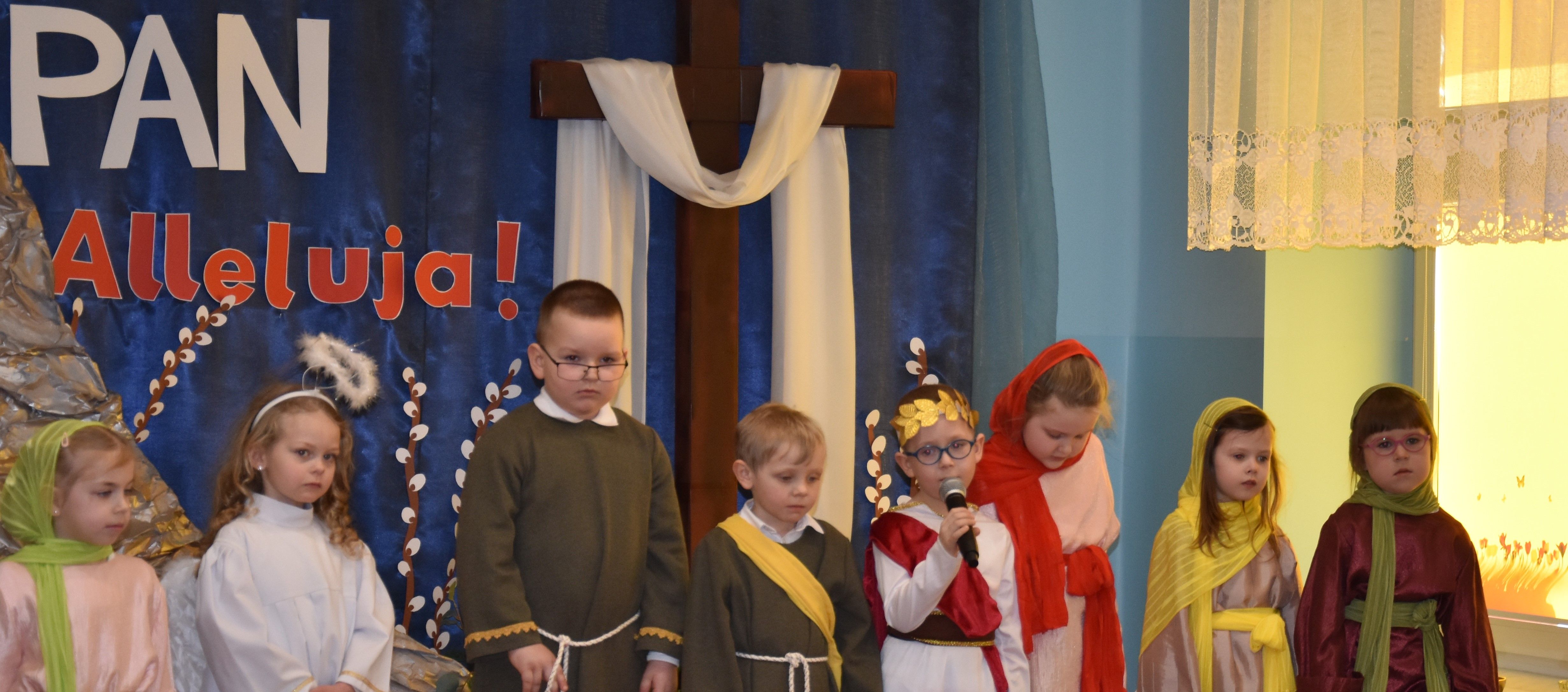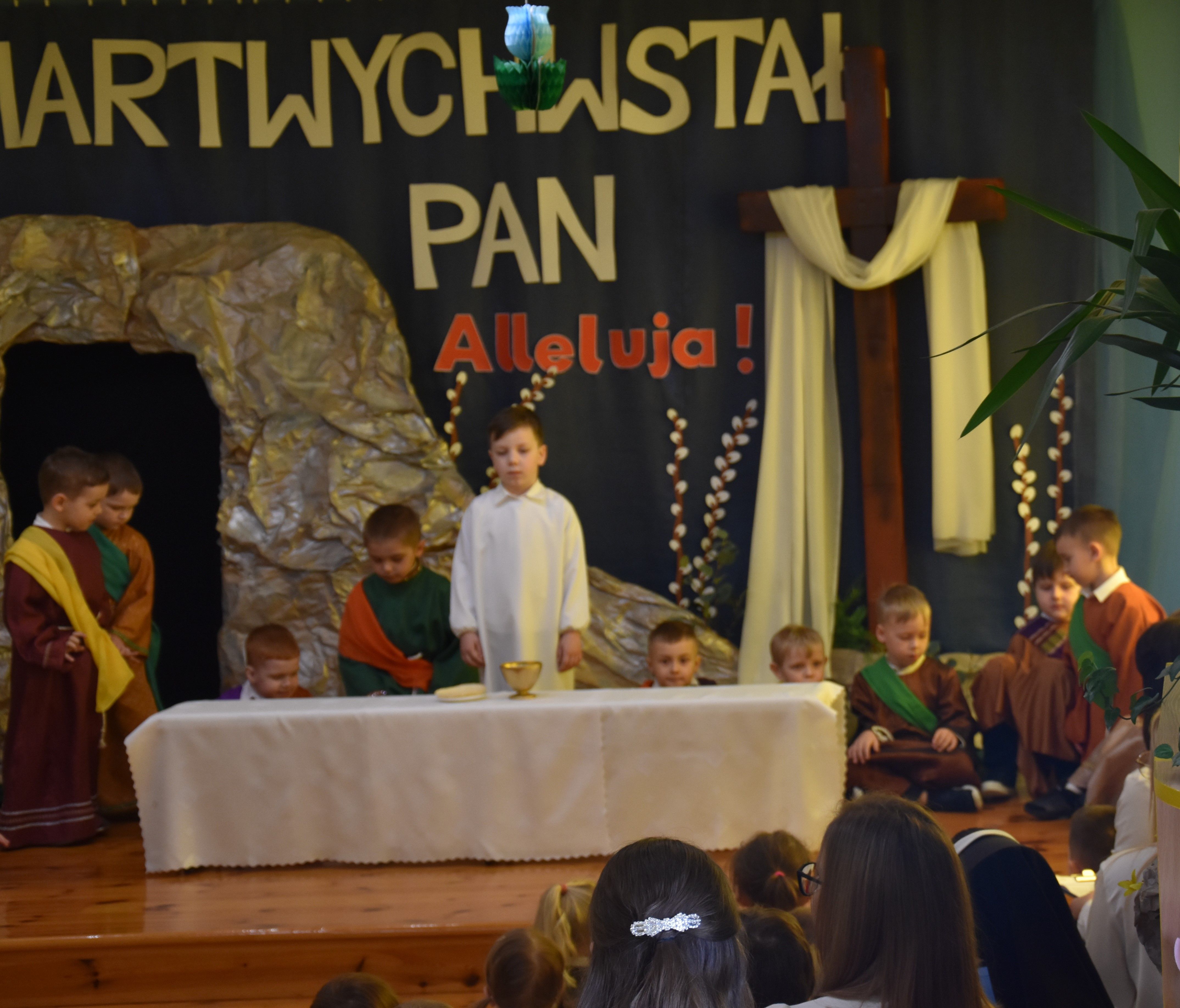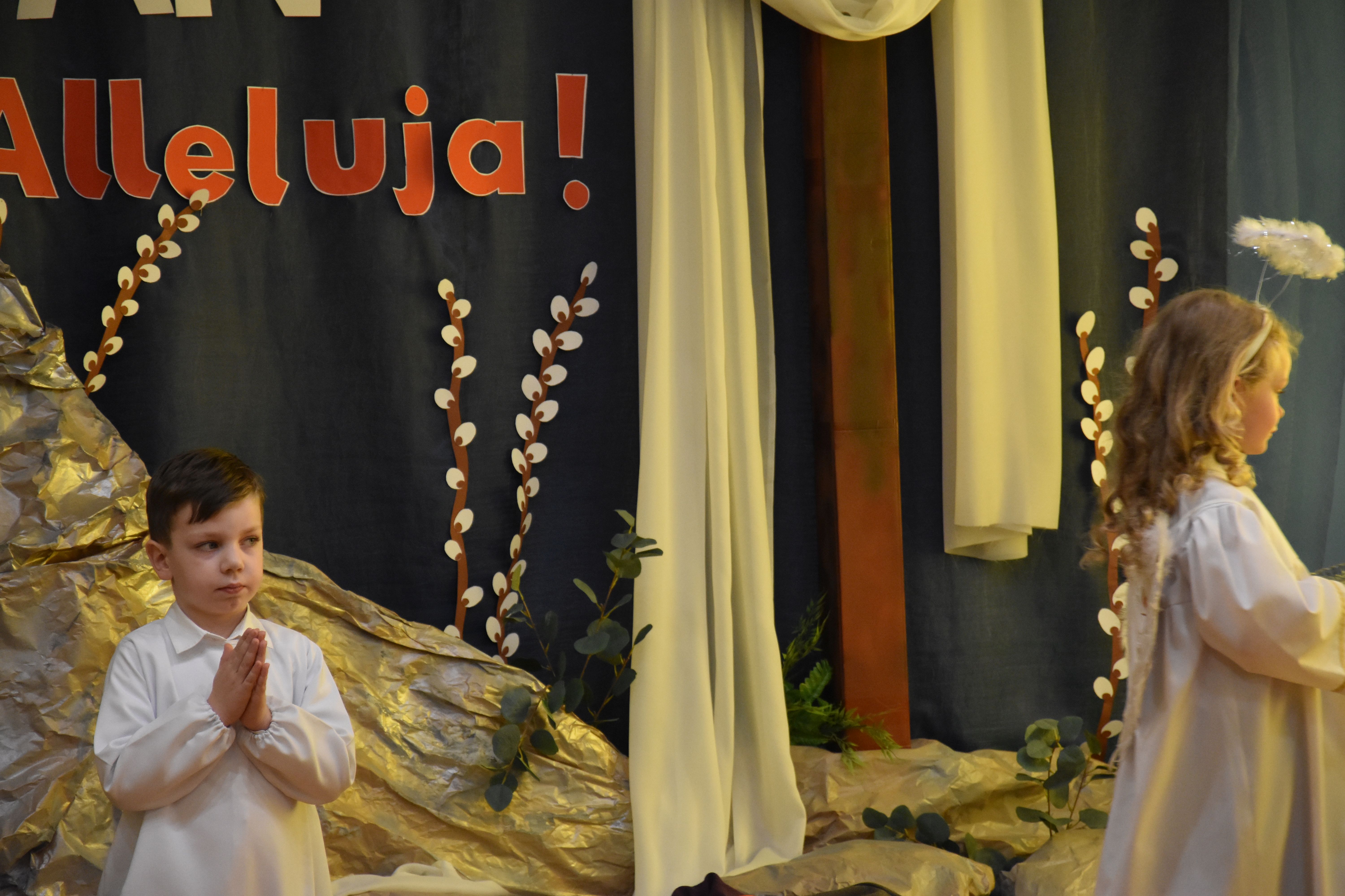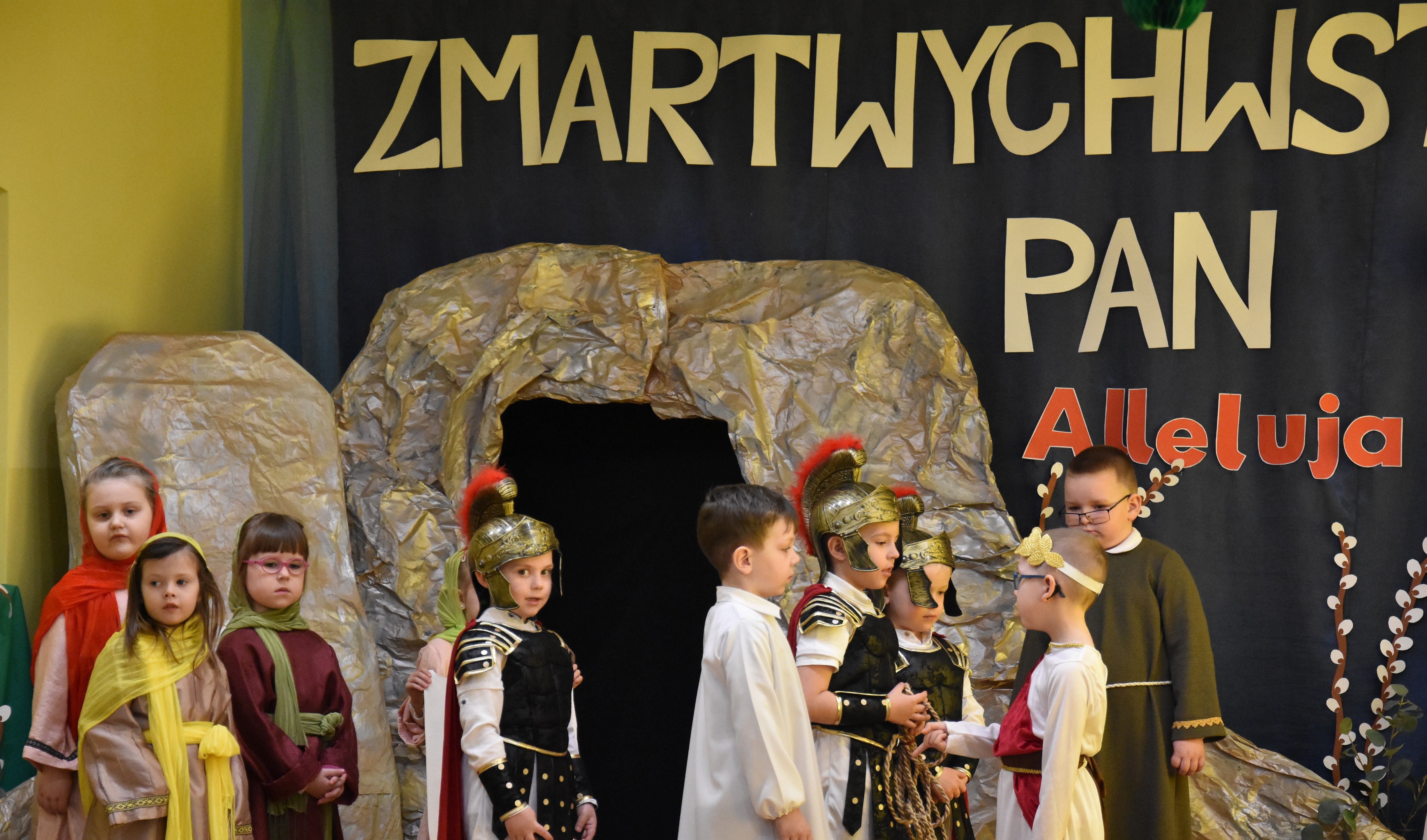 W naszym przedszkolu tradycyjnie w Wielką Środę celebrujemy już obchody świąt wielkanocnych. Z tej okazji dzieci z grupy Pszczółki przygotowały piękne Misterium Wielkanocne nawiązujące do całego Wielkiego Tygodnia począwszy od Niedzieli Palmowej, poprzez Triduum Paschalne, a skończywszy na Zmartwychwstaniu Pana Jezusa. Społeczność przedszkolna zaprosiła na tą uroczystosć ks. Proboszcza, s.Przełożoną wraz z siostrami emerytkami i całą wspólnotę zakonną. Po inscenizacji ks. Proboszcz przeszedł po salach poświęcić przygotowane przez dzieci koszyczki.