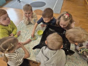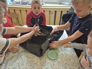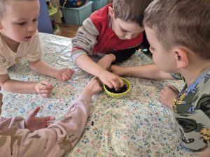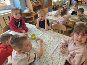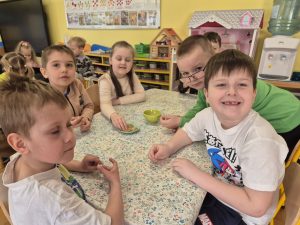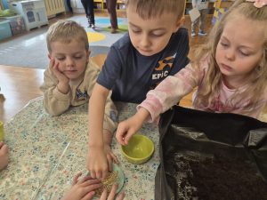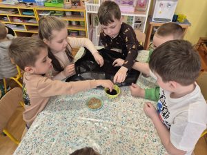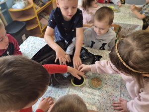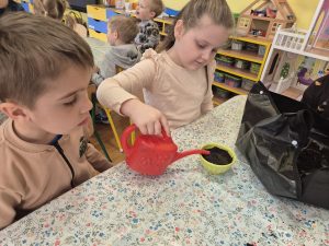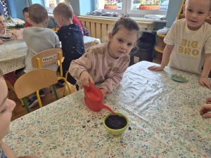 Dzieci z grupy „Pszczółki” z radością zaczęły przygotowania  do Świąt Wielkanocnych, biorąc udział w zajęciach związanych z sianiem owsa. Pracując w małych grupach, wspólnie wysiewały nasiona do przygotowanych doniczek. Była to nie tylko świetna zabawa, ale także cenna lekcja współpracy i odpowiedzialności. Zielony owies stanie się piękną ozdobą wielkanocną.
