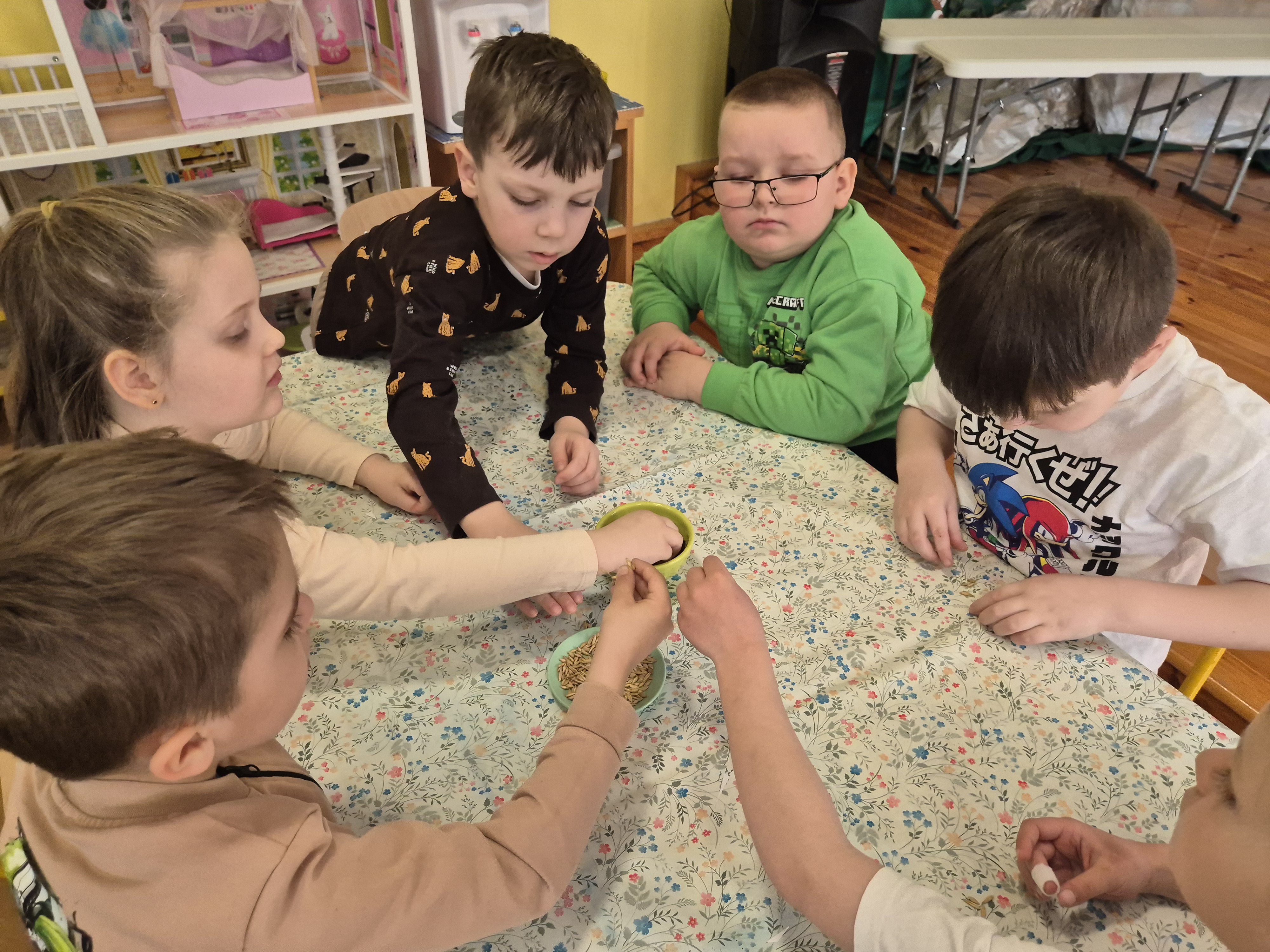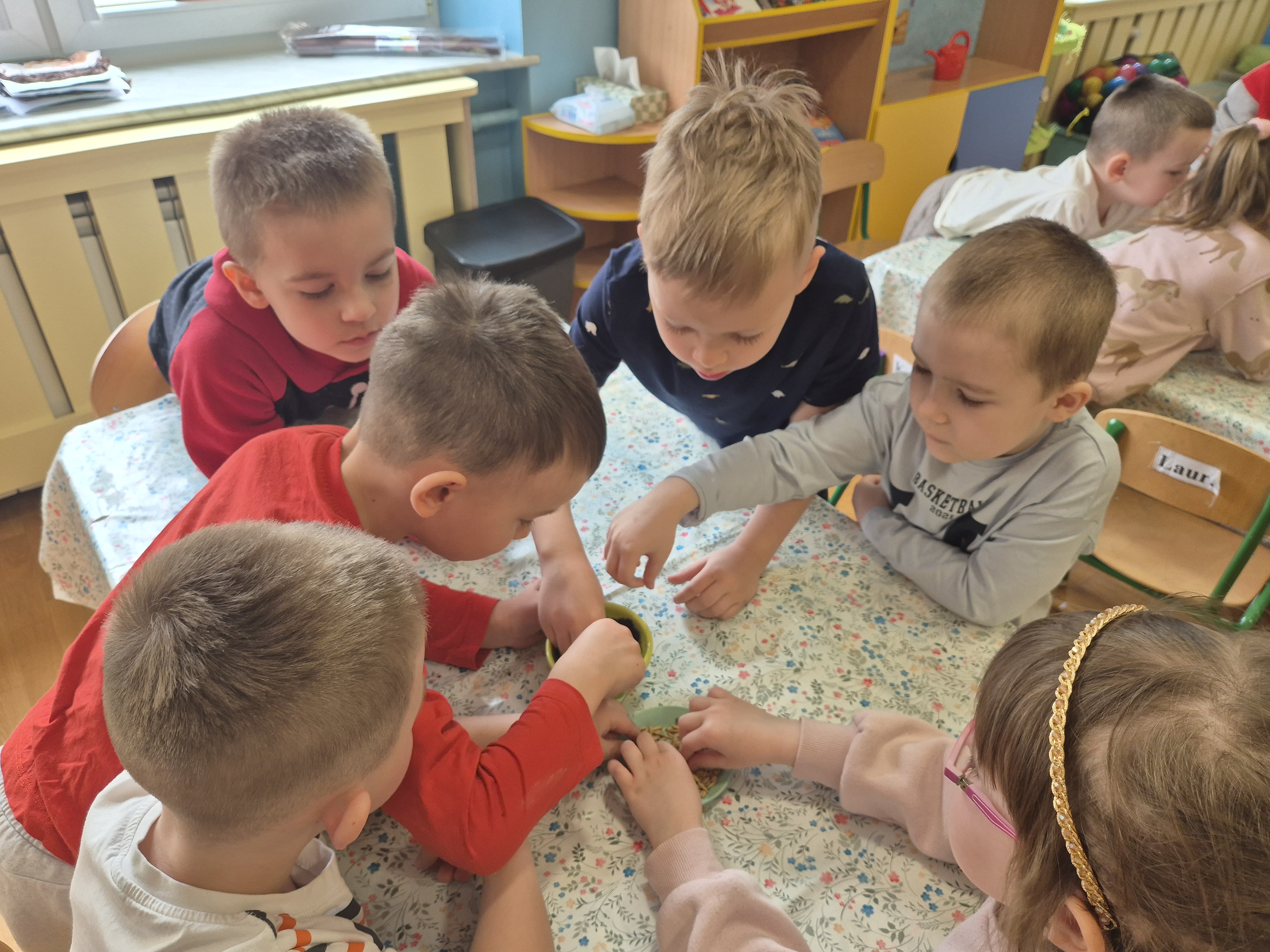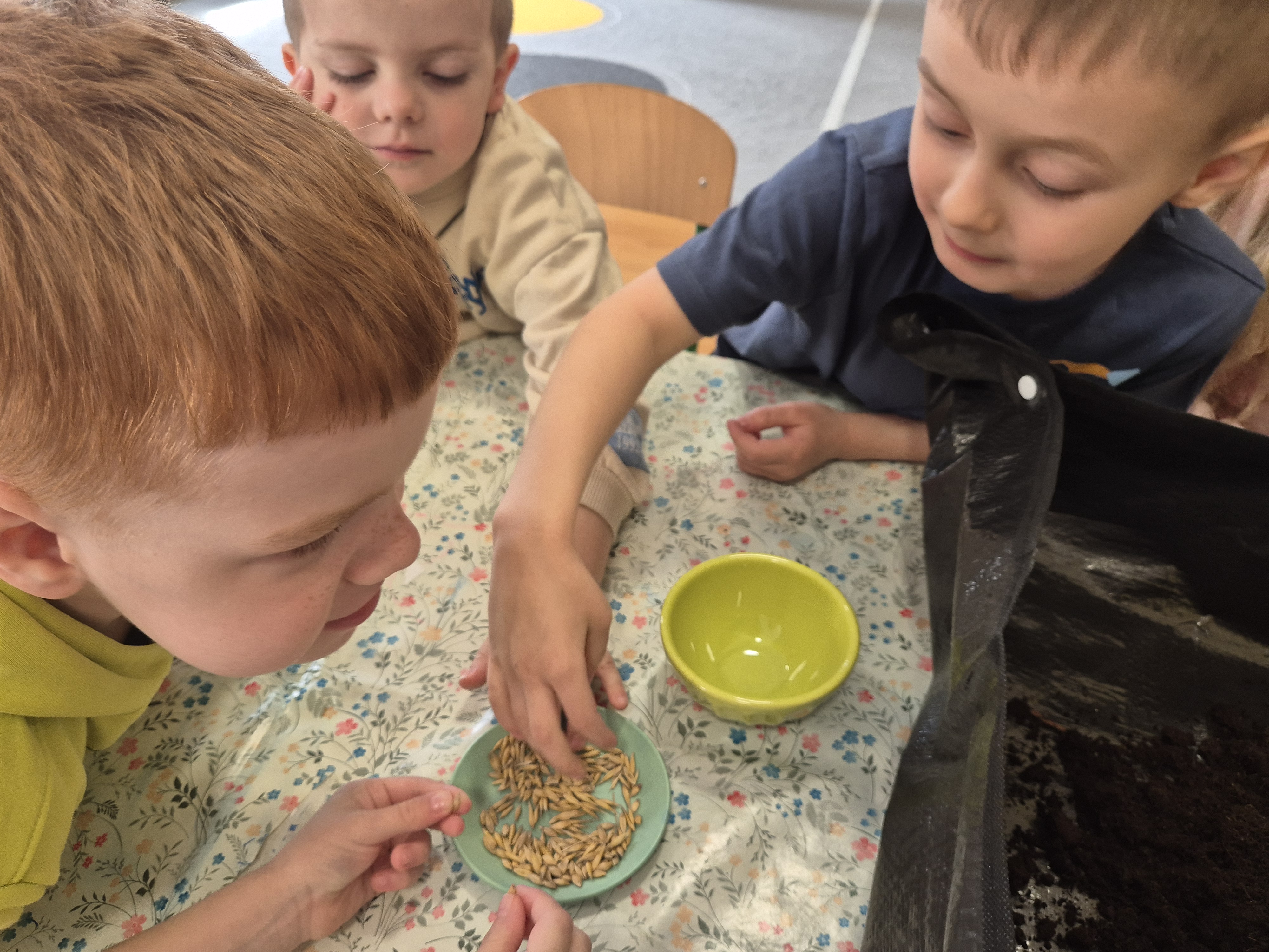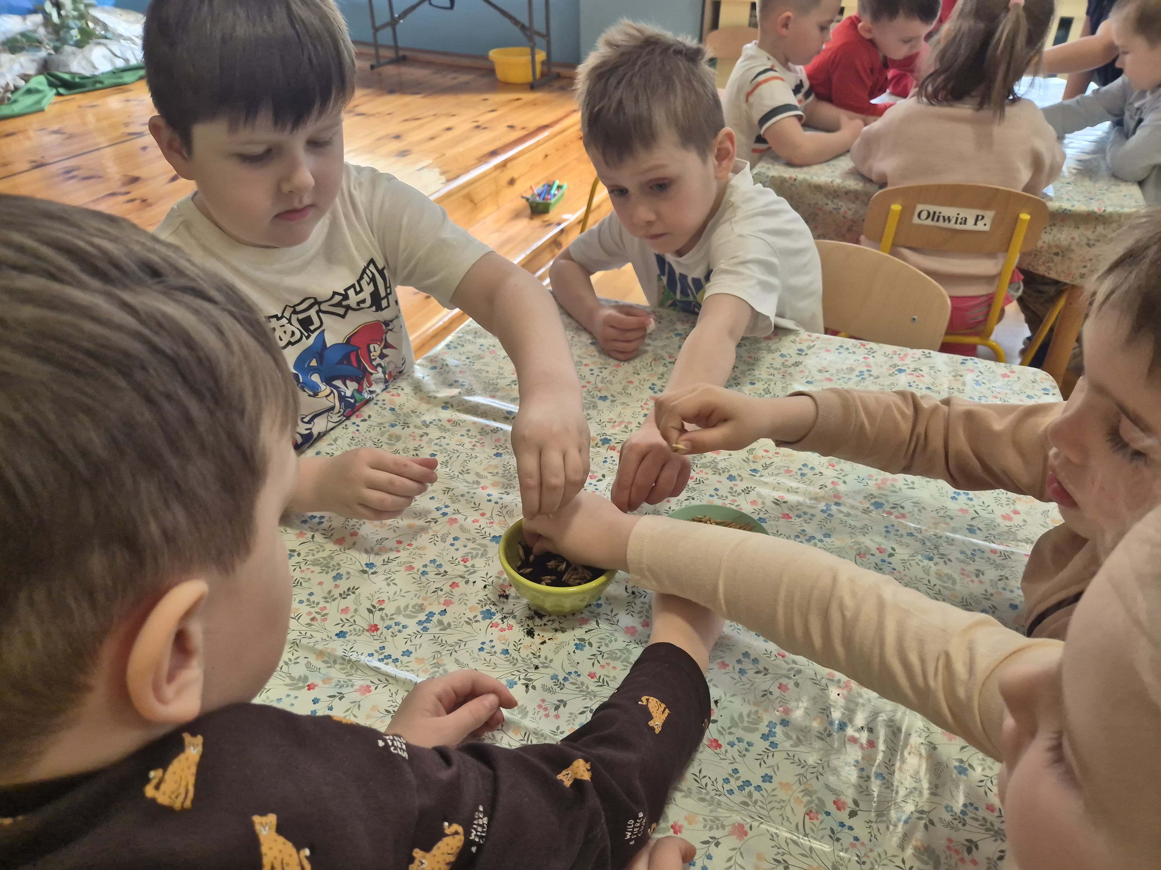 Dzieci z grupy „Pszczółki” z radością zaczęły przygotowania  do Świąt Wielkanocnych, biorąc udział w zajęciach związanych z sianiem owsa. Pracując w małych grupach, wspólnie wysiewały nasiona do przygotowanych doniczek. Była to nie tylko świetna zabawa, ale także cenna lekcja współpracy i odpowiedzialności. Zielony owies stanie się piękną ozdobą wielkanocną.