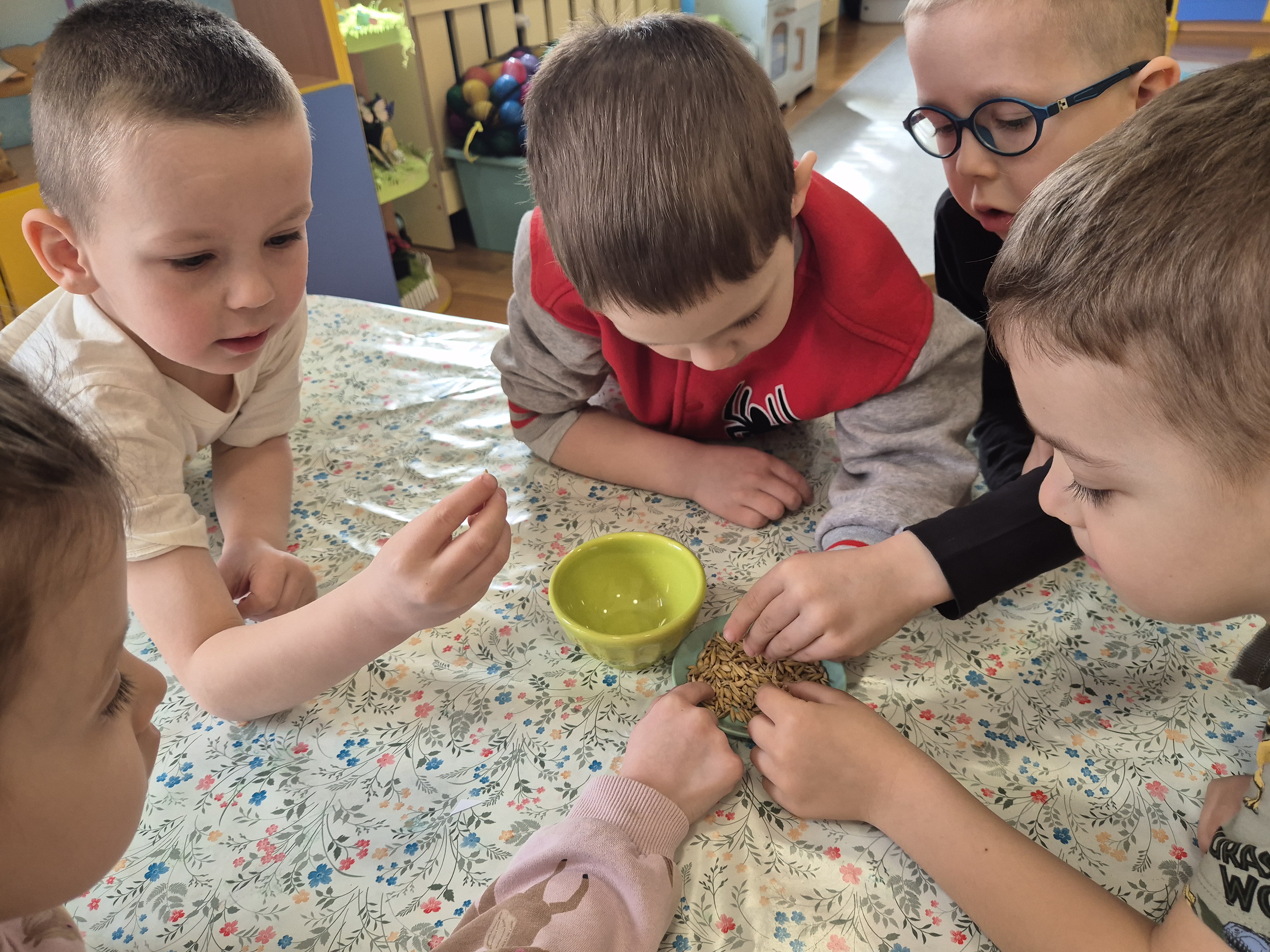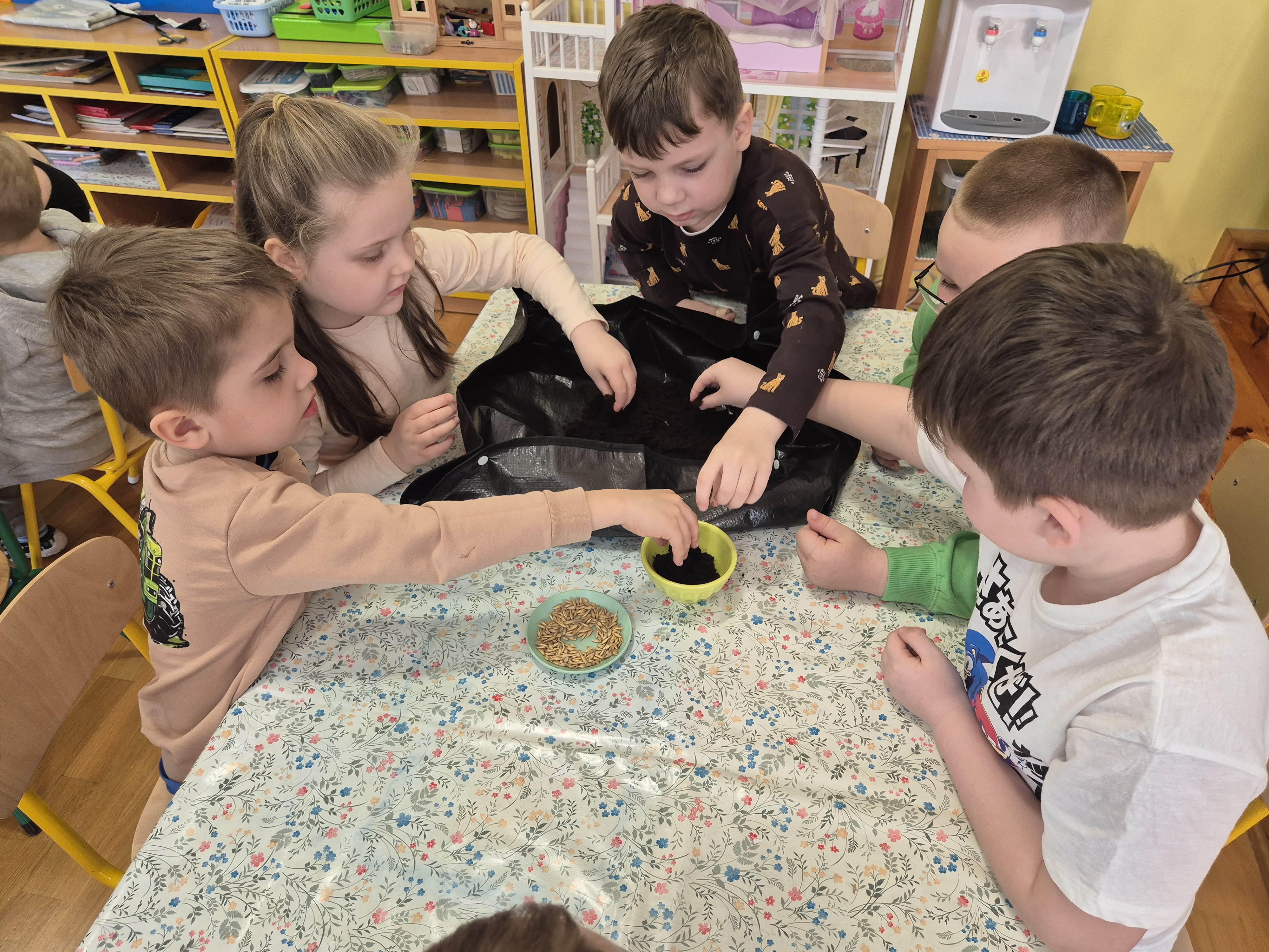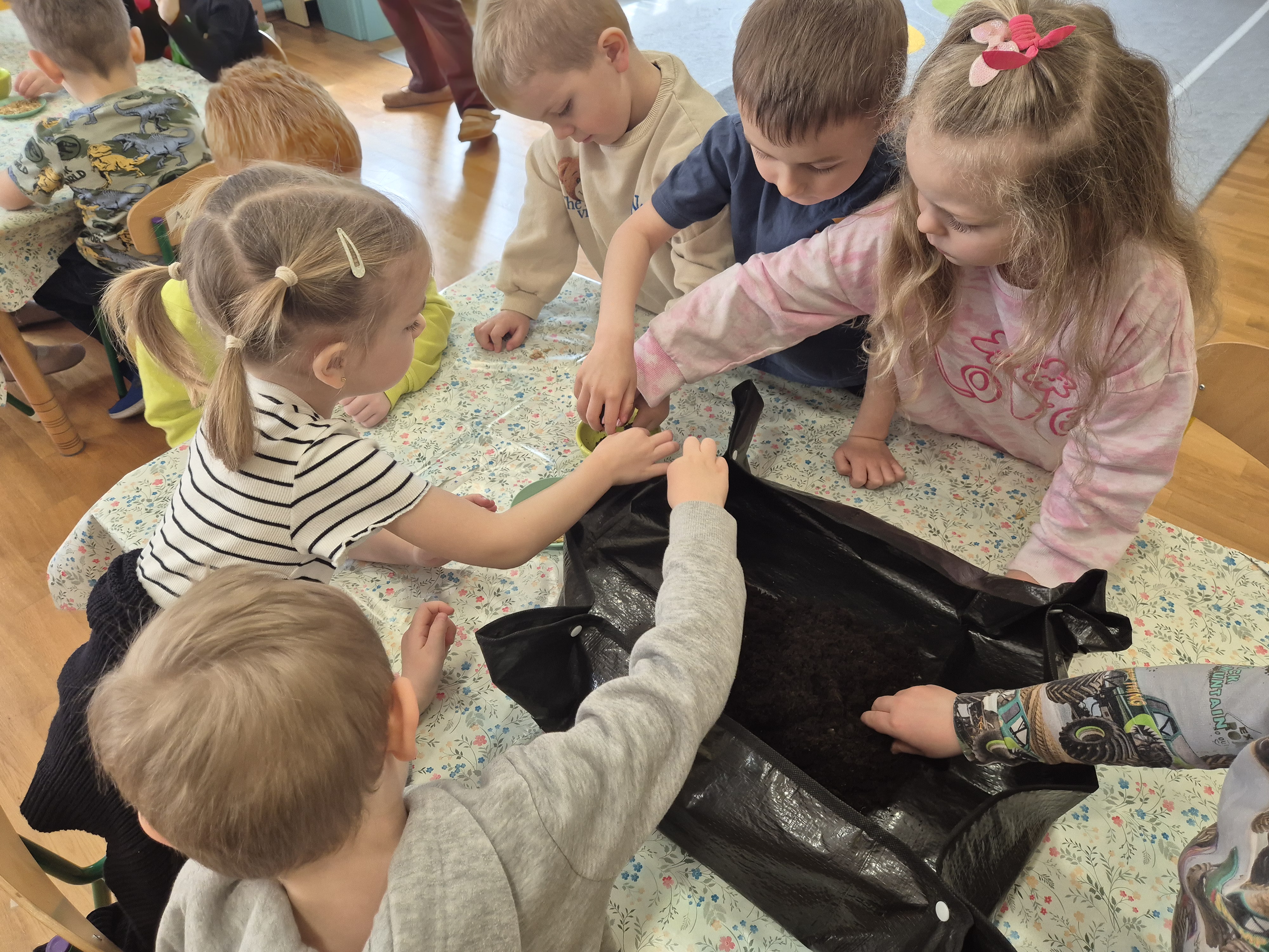 Dzieci z grupy „Pszczółki” z radością zaczęły przygotowania  do Świąt Wielkanocnych, biorąc udział w zajęciach związanych z sianiem owsa. Pracując w małych grupach, wspólnie wysiewały nasiona do przygotowanych doniczek. Była to nie tylko świetna zabawa, ale także cenna lekcja współpracy i odpowiedzialności. Zielony owies stanie się piękną ozdobą wielkanocną.
