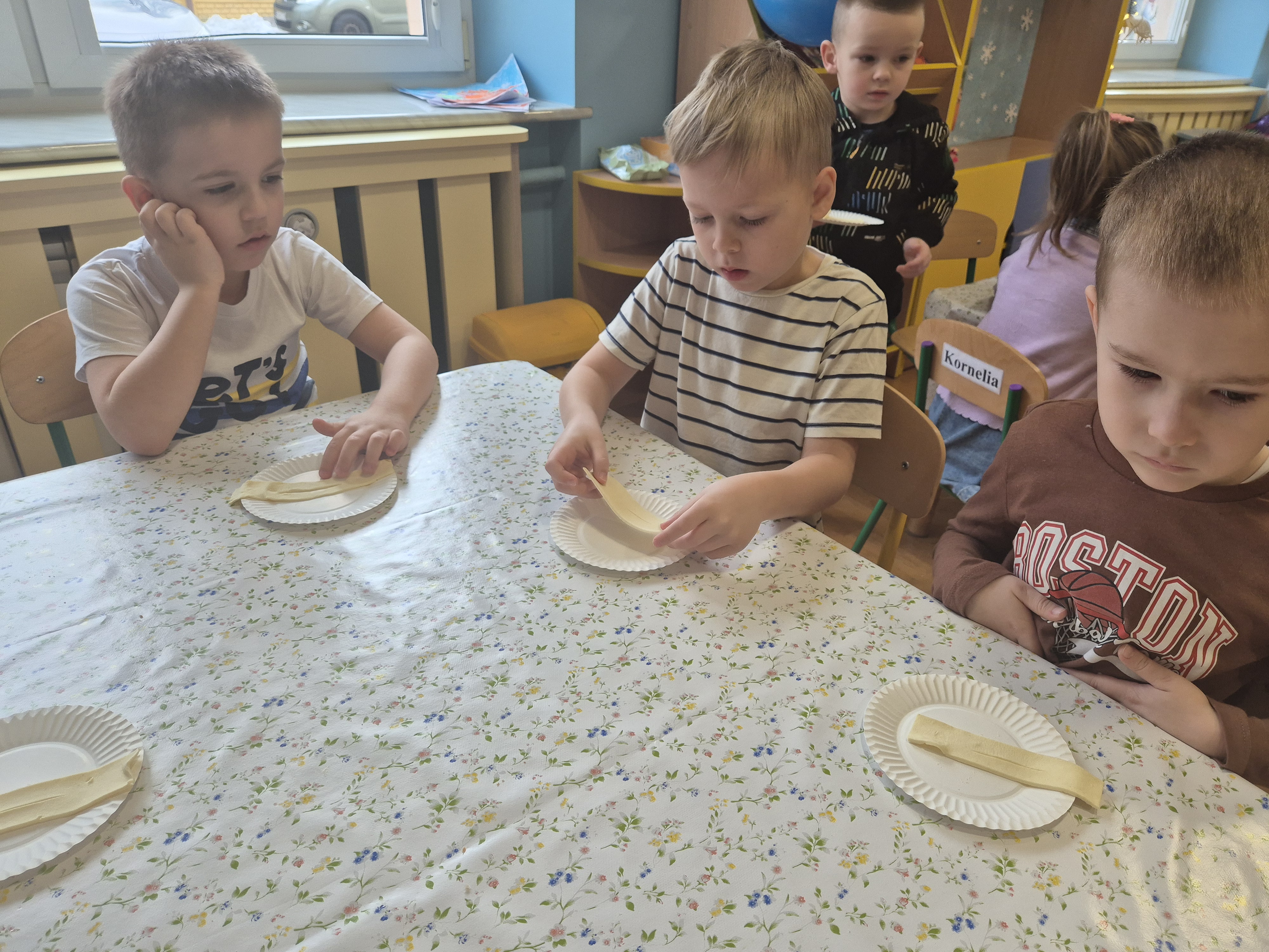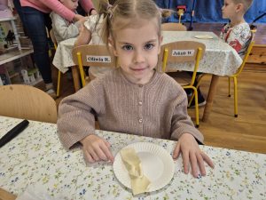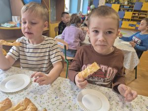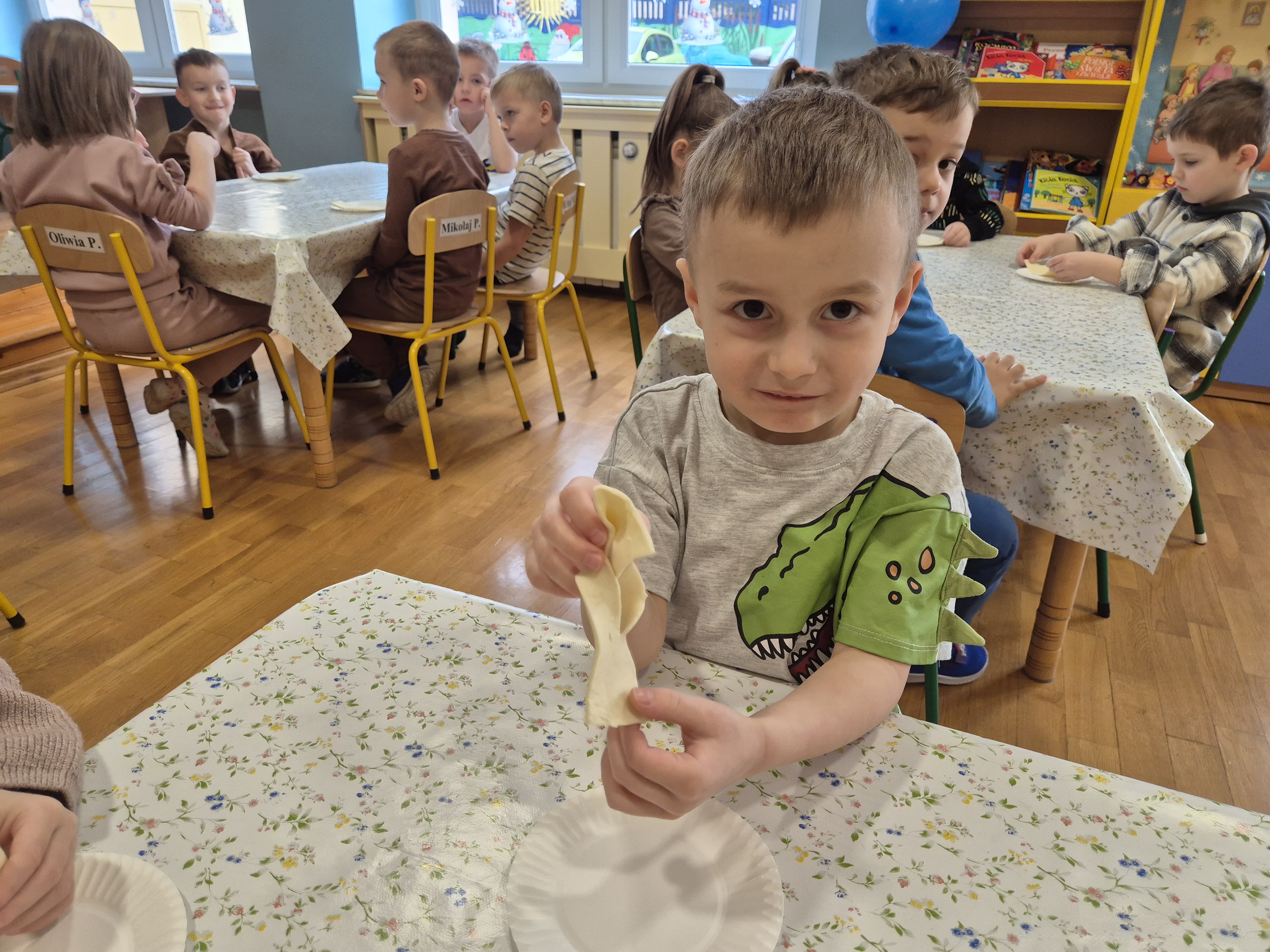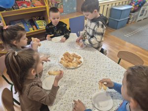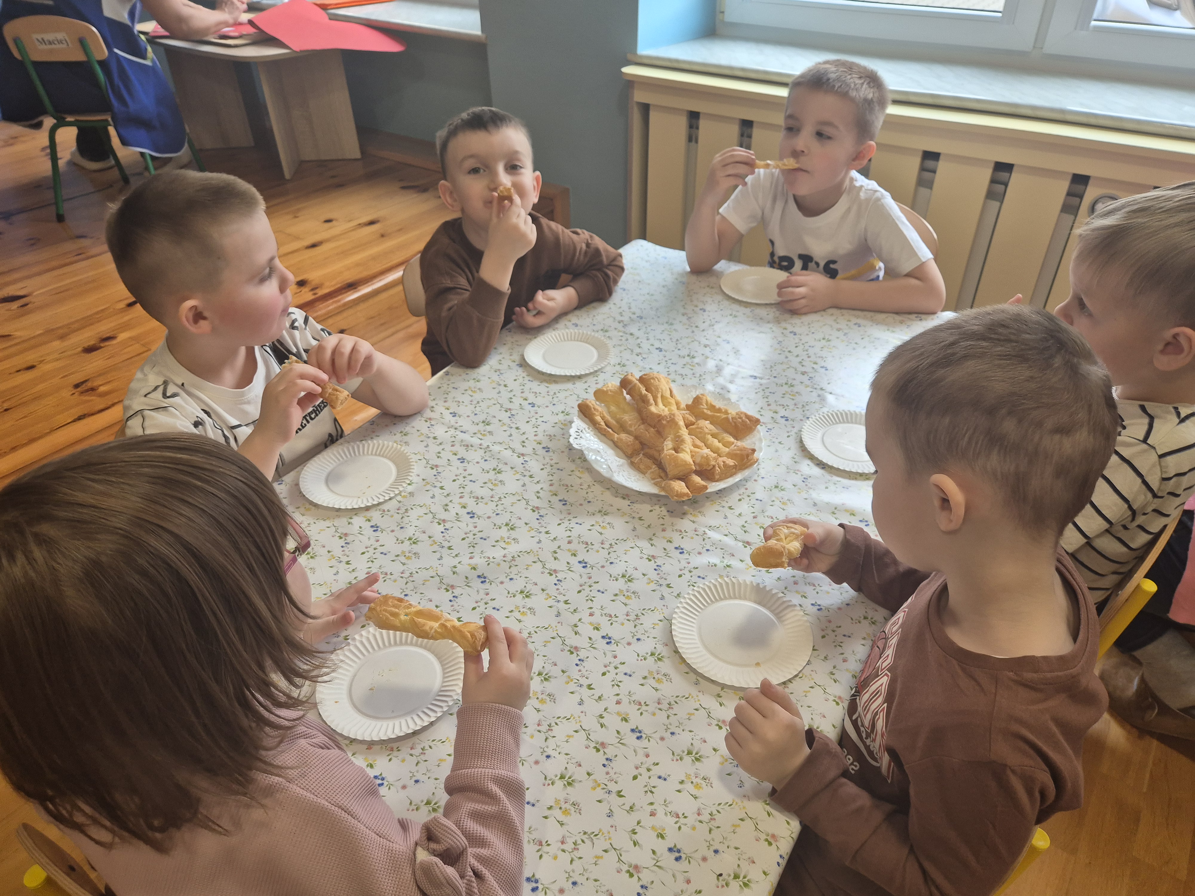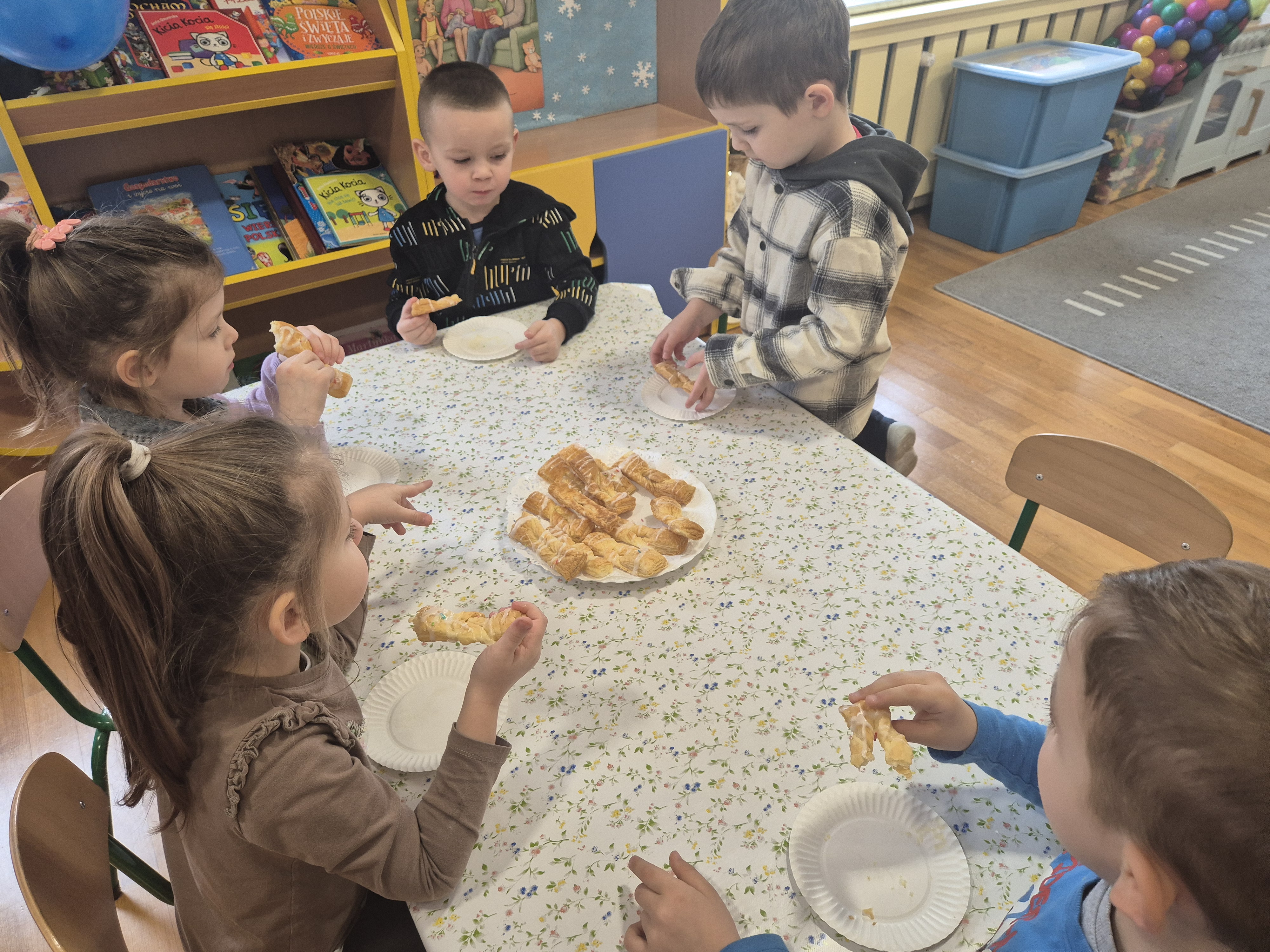 Dzień przed Tłustym Czwartkiem dzieci z grupy Pszczółek wzięły udział w słodkich zajęciach kulinarnych. Gotowe ciasto czekało już na małych cukierników, a ich zadaniem było nauczyć się, jak prawidłowo przewijać faworki. Dzieci z dużym zaangażowaniem i ciekawością próbowały swoich sił, tworząc charakterystyczne kształty. Po wspólnej pracy przyszedł czas na degustację. Pszczółki z radością zajadały chrupiące faworki i z uśmiechami na twarzach cieszyły się z własnoręcznie przygotowanych słodkości. To był dzień pełen radości i pysznej zabawy.