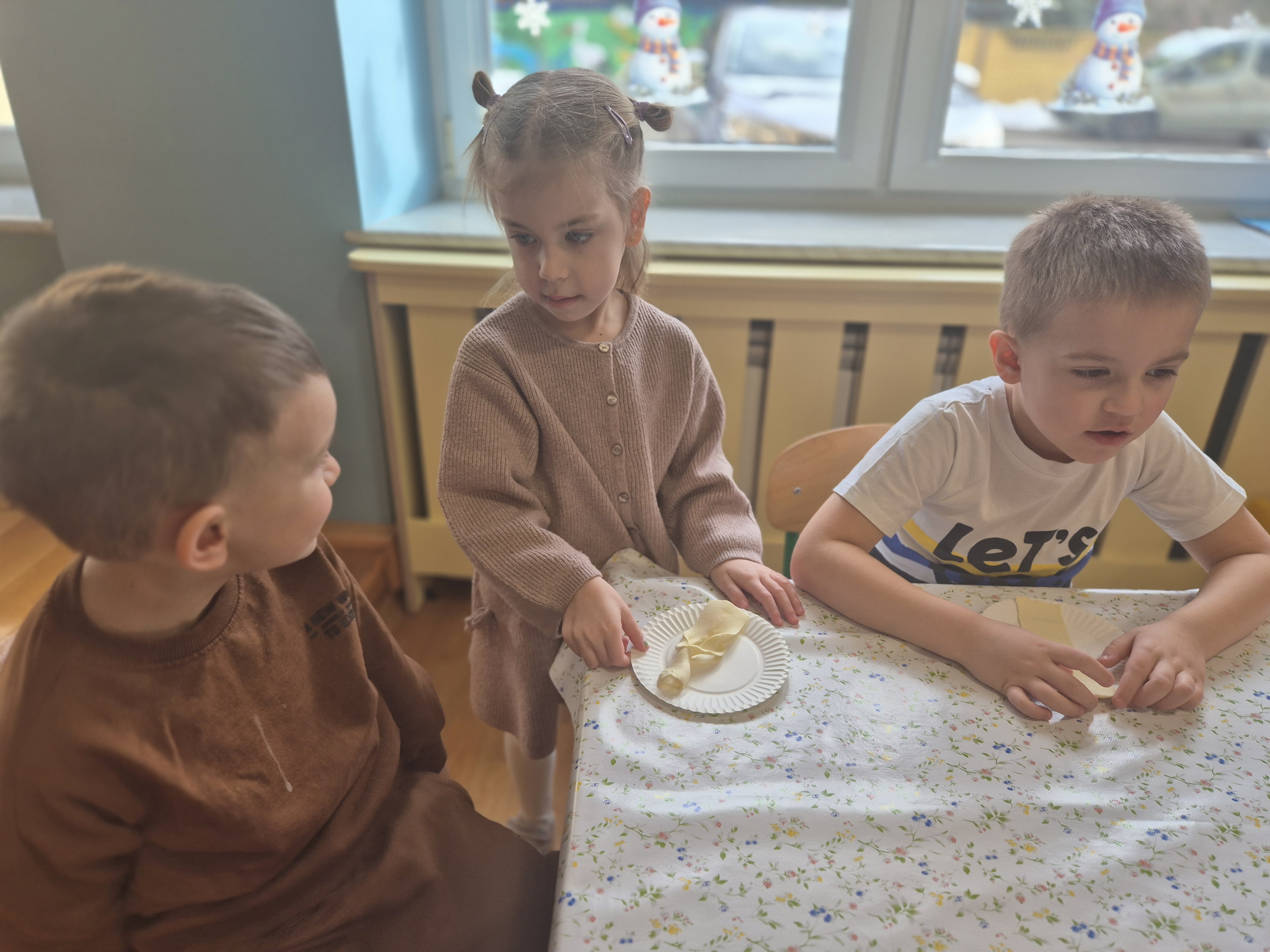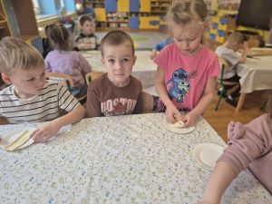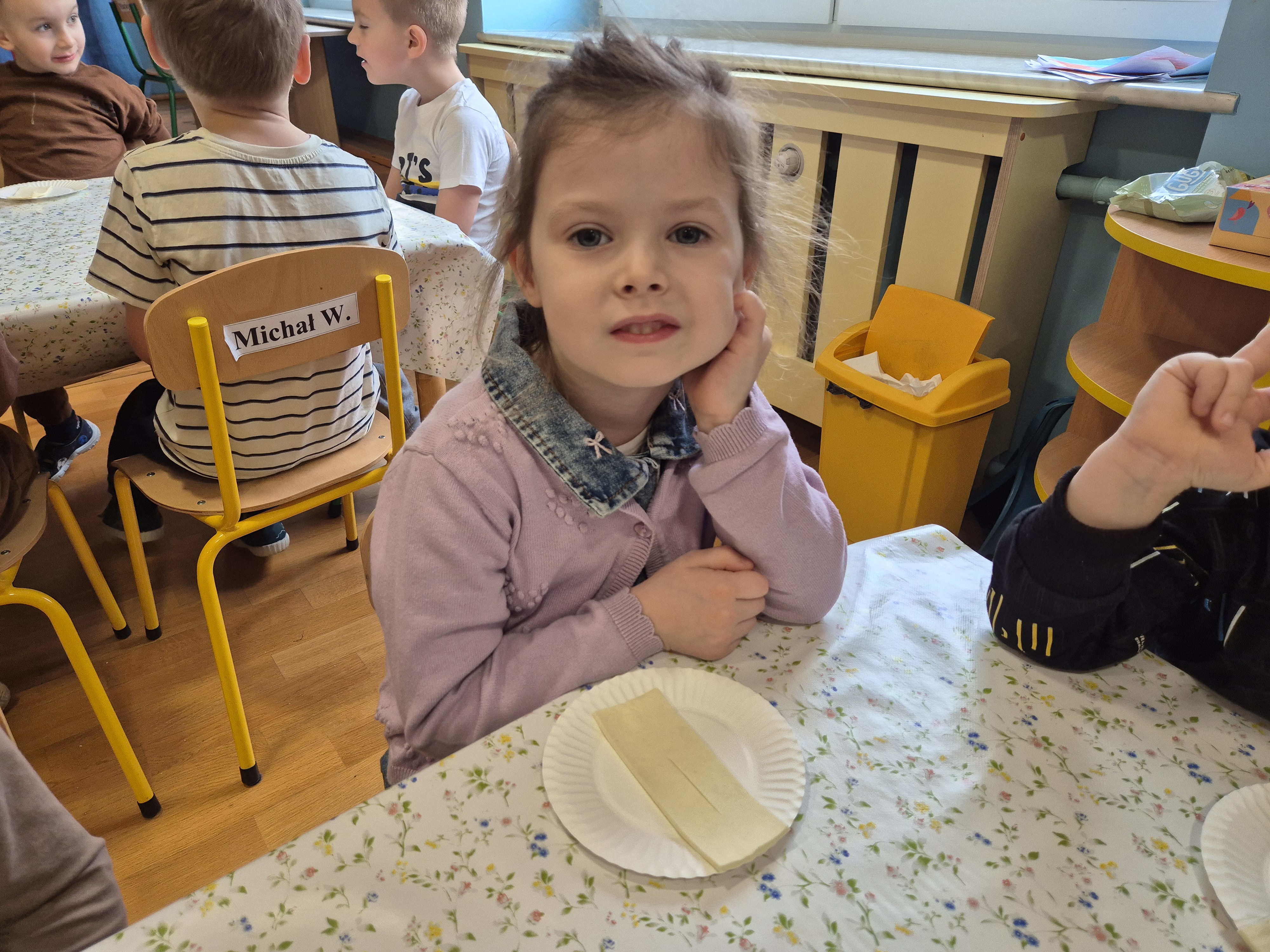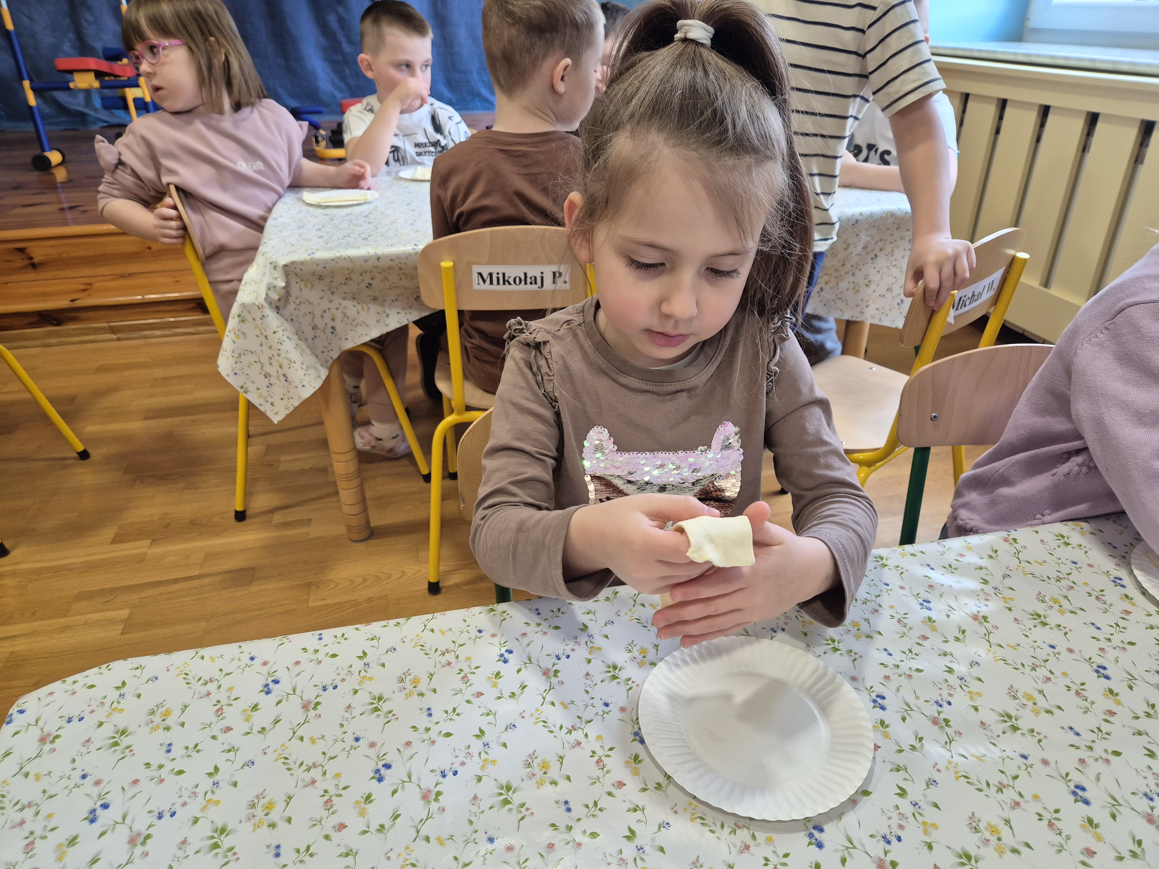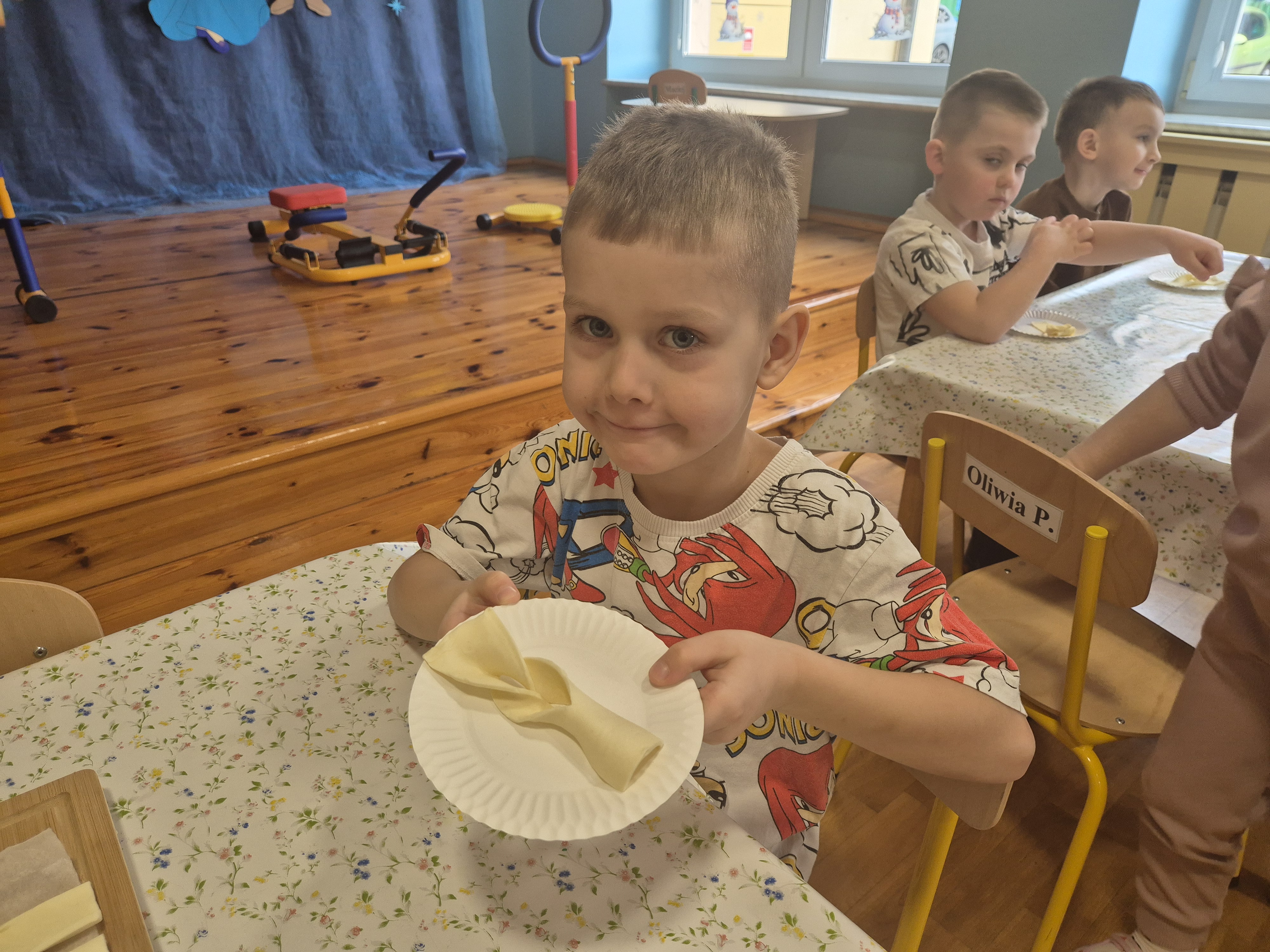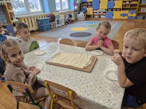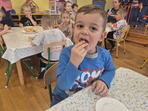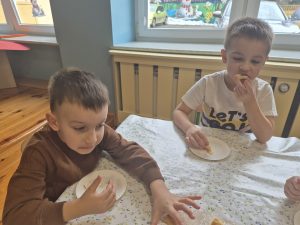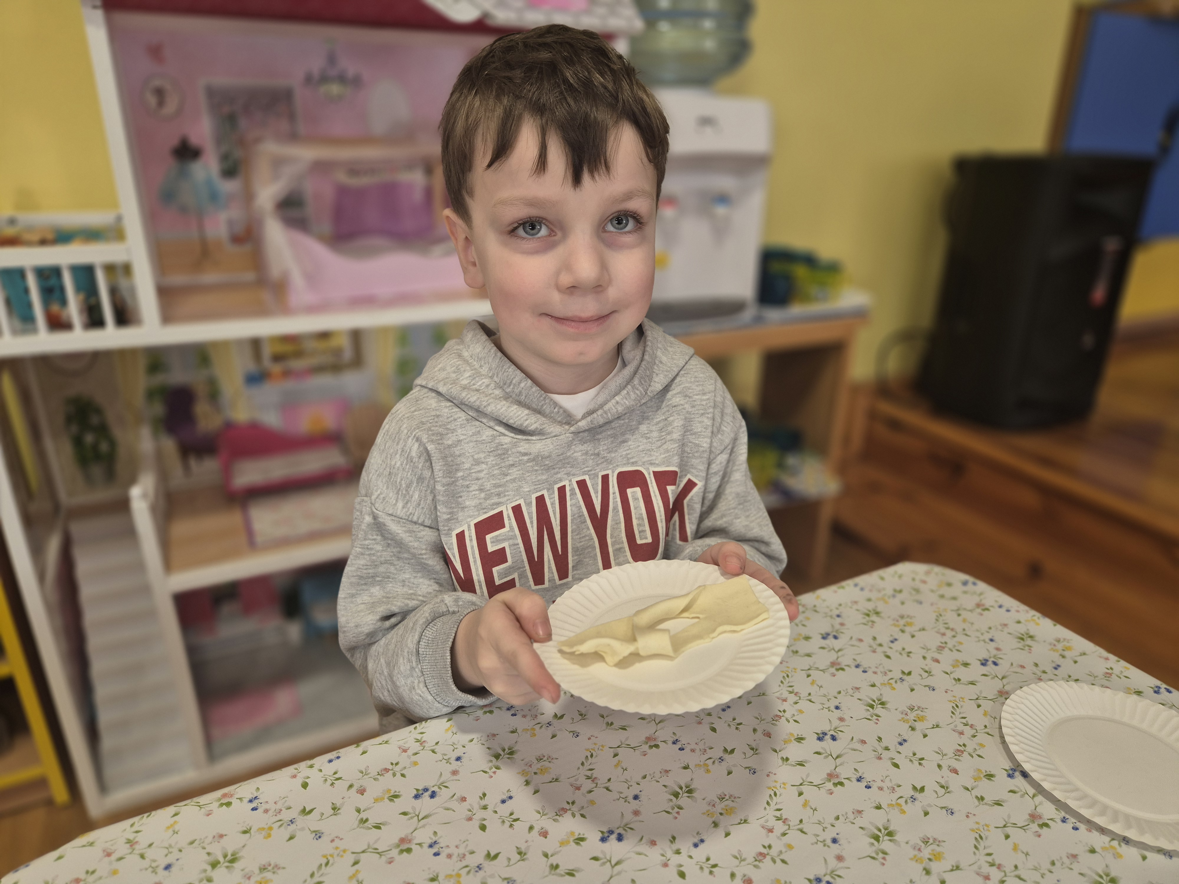 Dzień przed Tłustym Czwartkiem dzieci z grupy Pszczółek wzięły udział w słodkich zajęciach kulinarnych. Gotowe ciasto czekało już na małych cukierników, a ich zadaniem było nauczyć się, jak prawidłowo przewijać faworki. Dzieci z dużym zaangażowaniem i ciekawością próbowały swoich sił, tworząc charakterystyczne kształty. Po wspólnej pracy przyszedł czas na degustację. Pszczółki z radością zajadały chrupiące faworki i z uśmiechami na twarzach cieszyły się z własnoręcznie przygotowanych słodkości. To był dzień pełen radości i pysznej zabawy.
