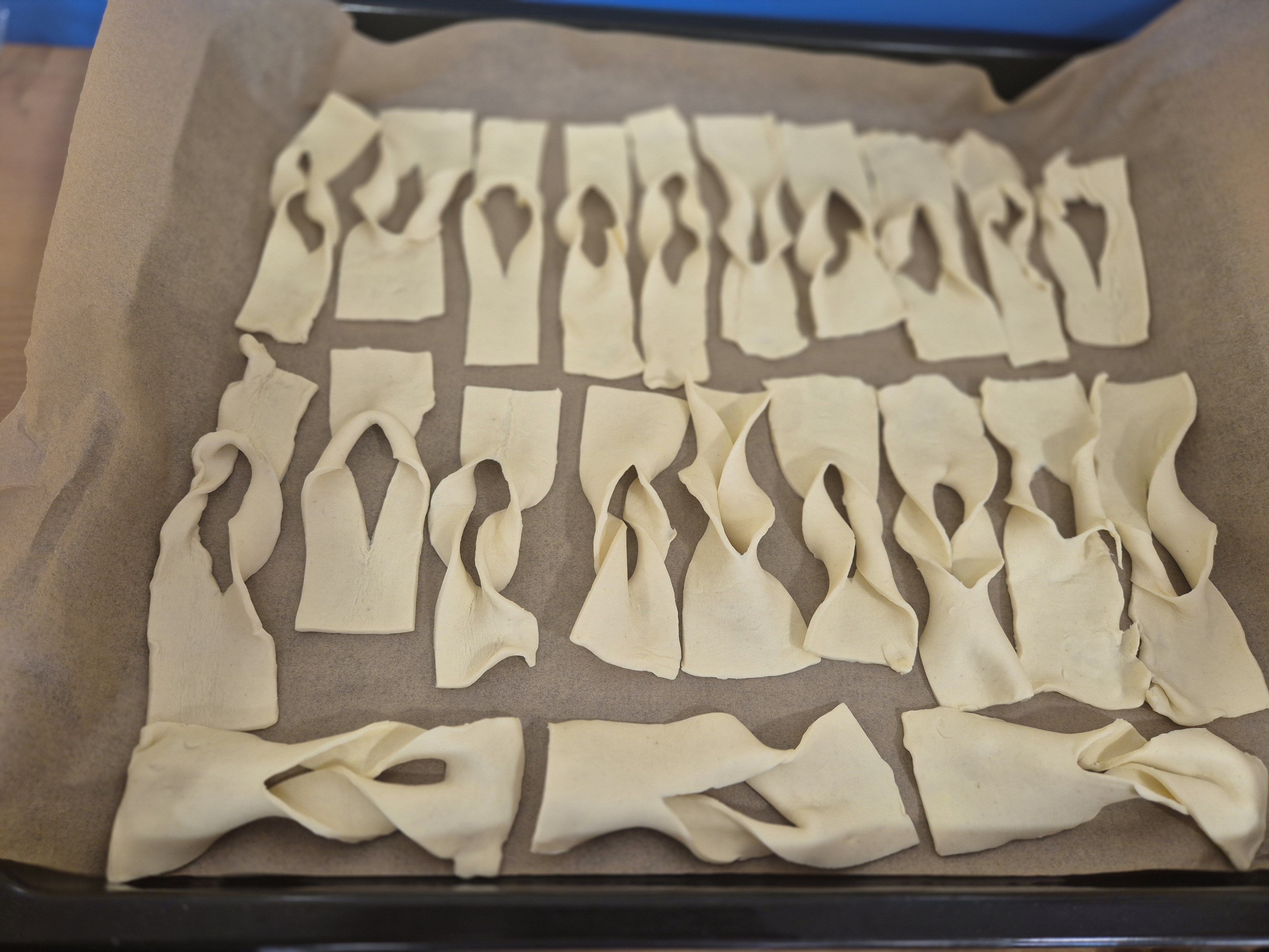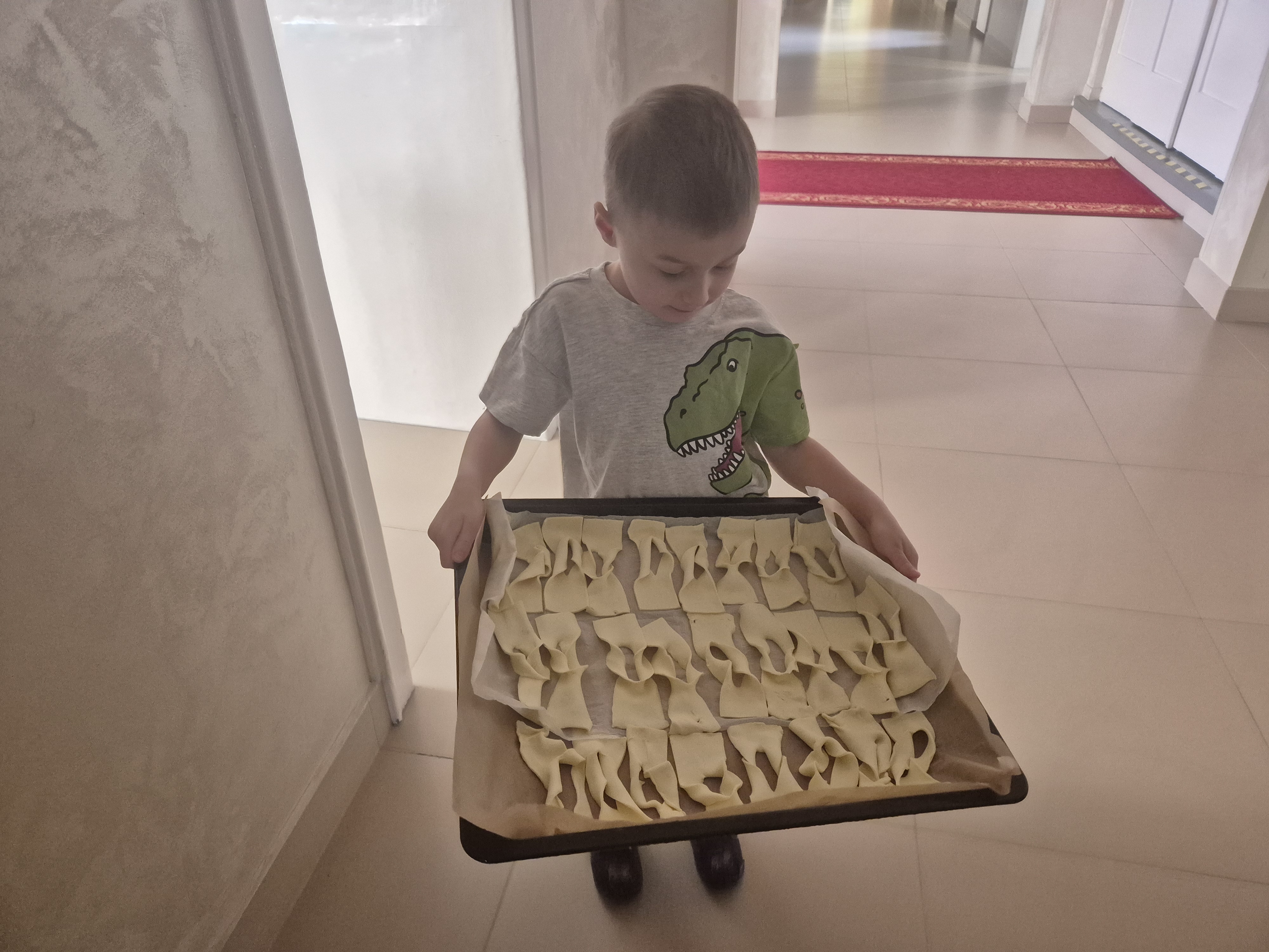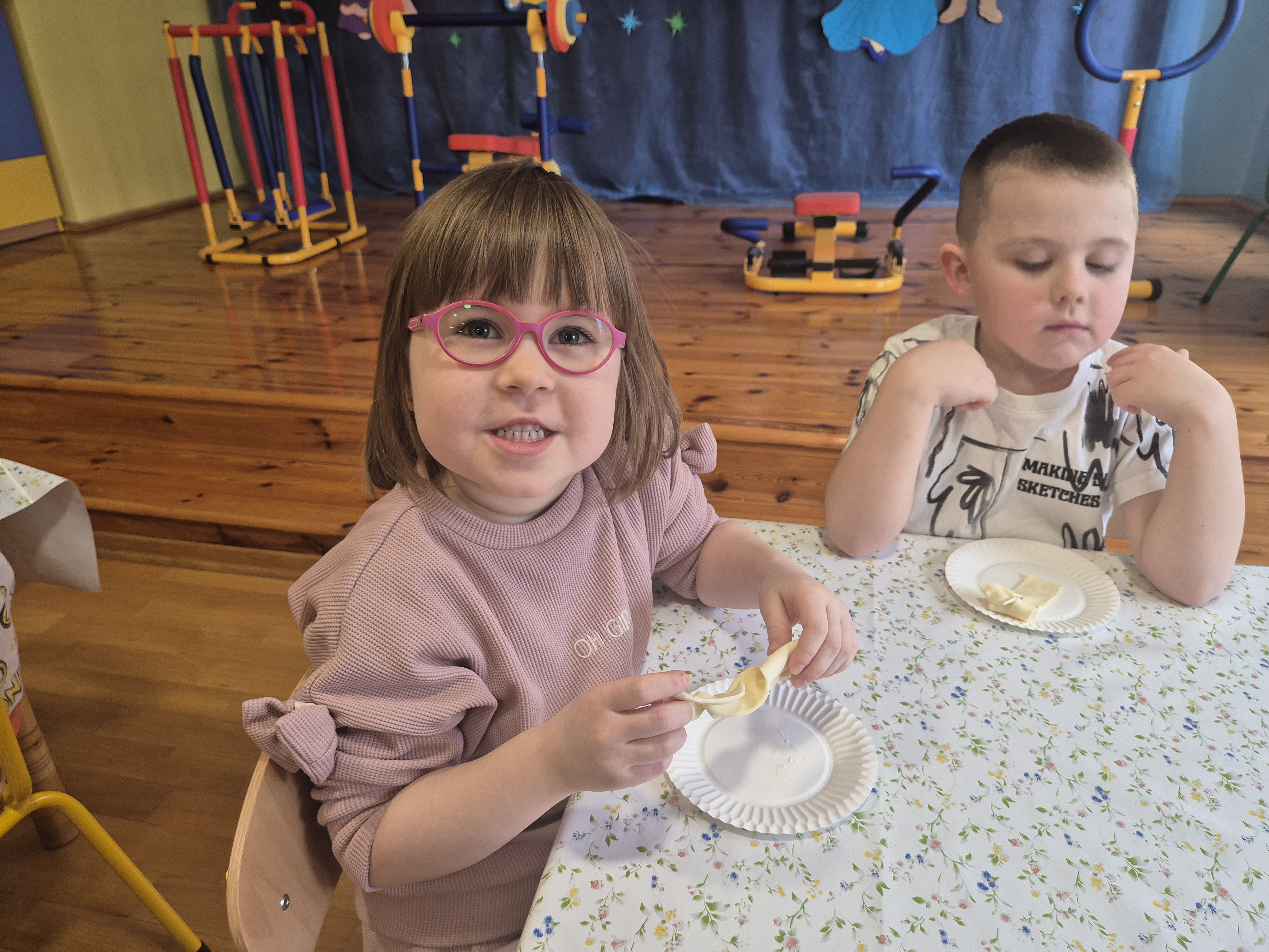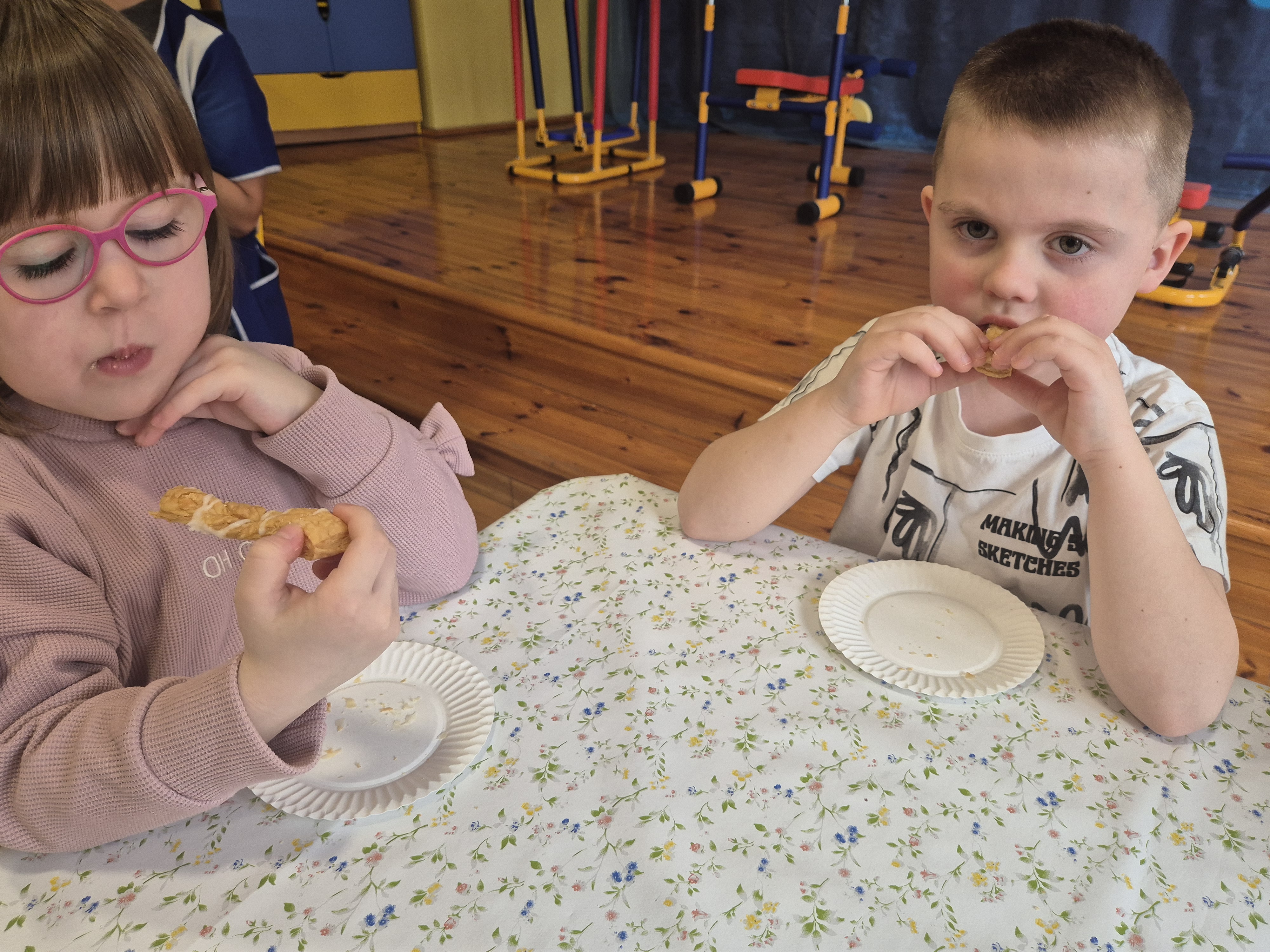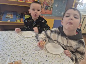 Dzień przed Tłustym Czwartkiem dzieci z grupy Pszczółek wzięły udział w słodkich zajęciach kulinarnych. Gotowe ciasto czekało już na małych cukierników, a ich zadaniem było nauczyć się, jak prawidłowo przewijać faworki. Dzieci z dużym zaangażowaniem i ciekawością próbowały swoich sił, tworząc charakterystyczne kształty. Po wspólnej pracy przyszedł czas na degustację. Pszczółki z radością zajadały chrupiące faworki i z uśmiechami na twarzach cieszyły się z własnoręcznie przygotowanych słodkości. To był dzień pełen radości i pysznej zabawy.