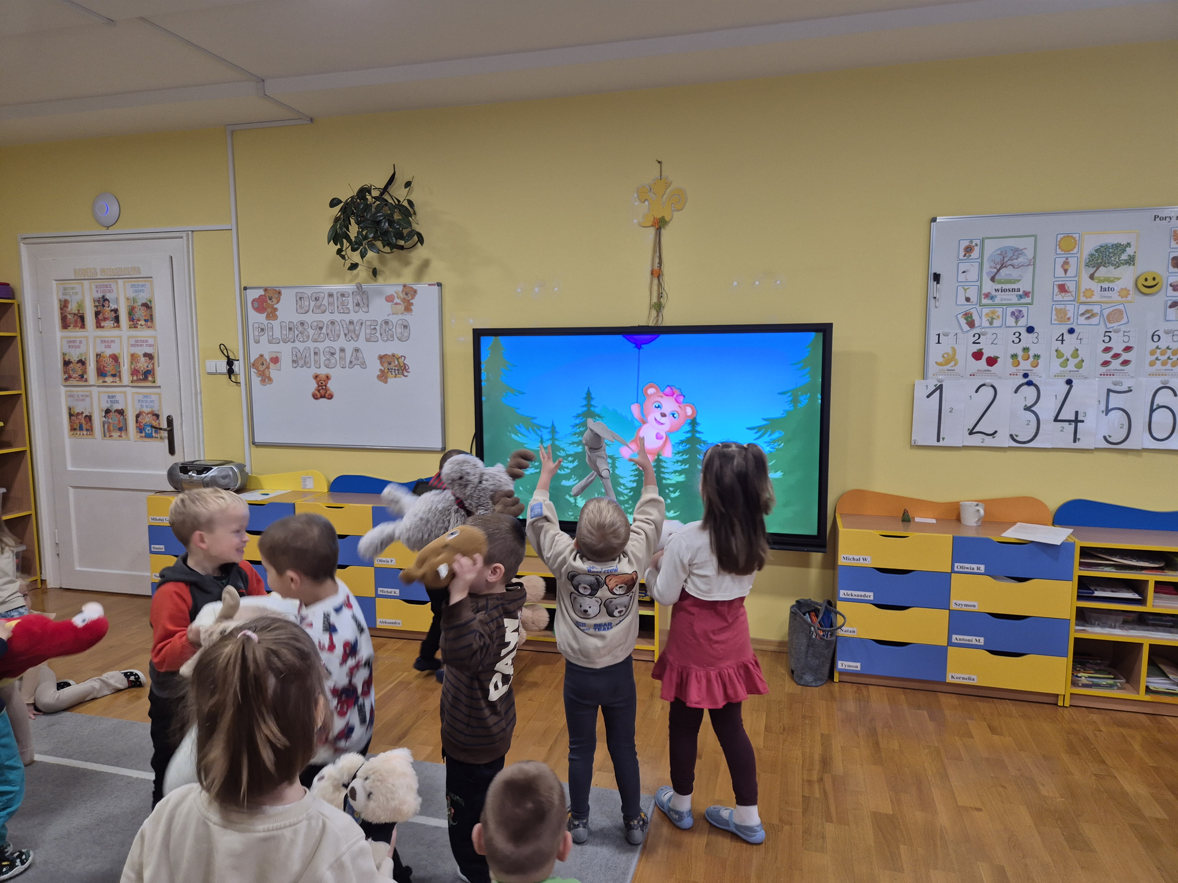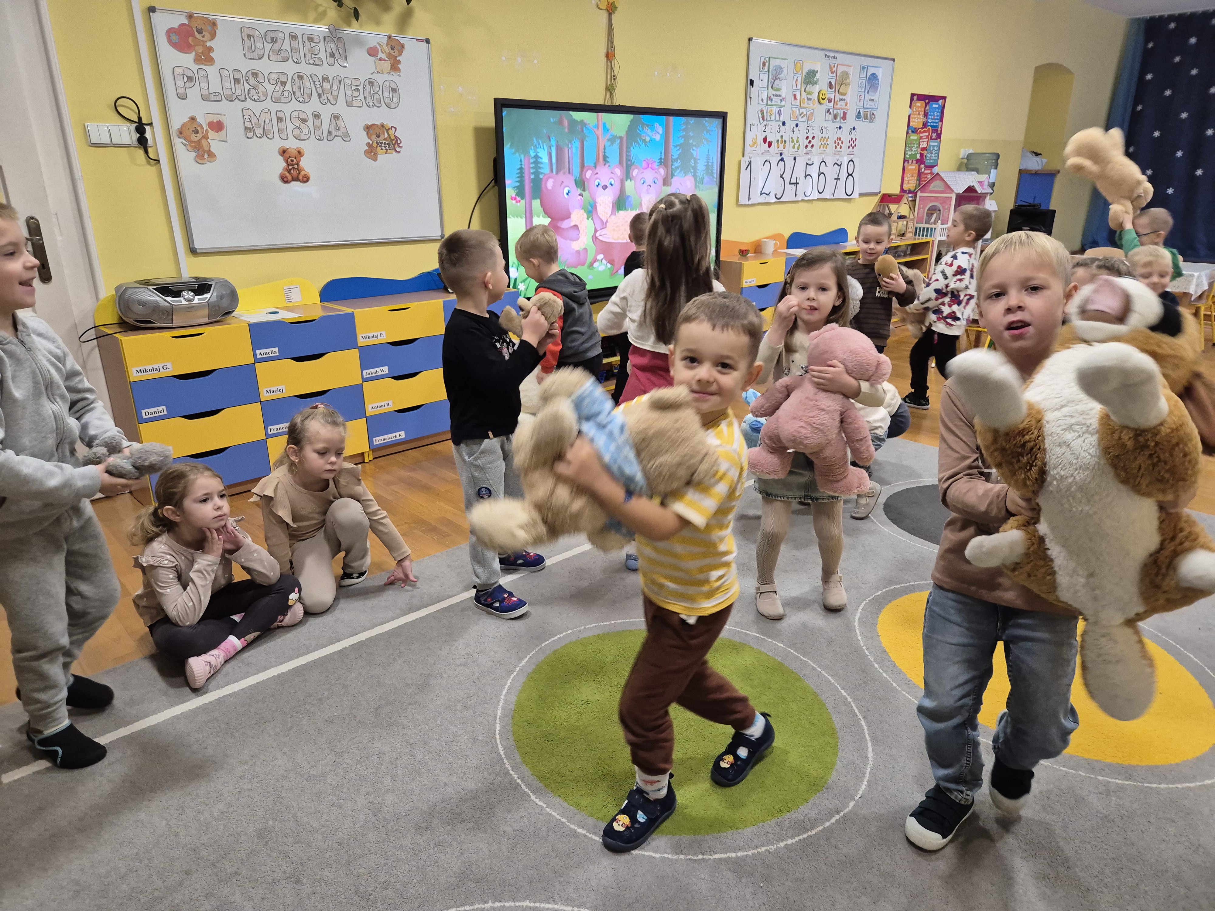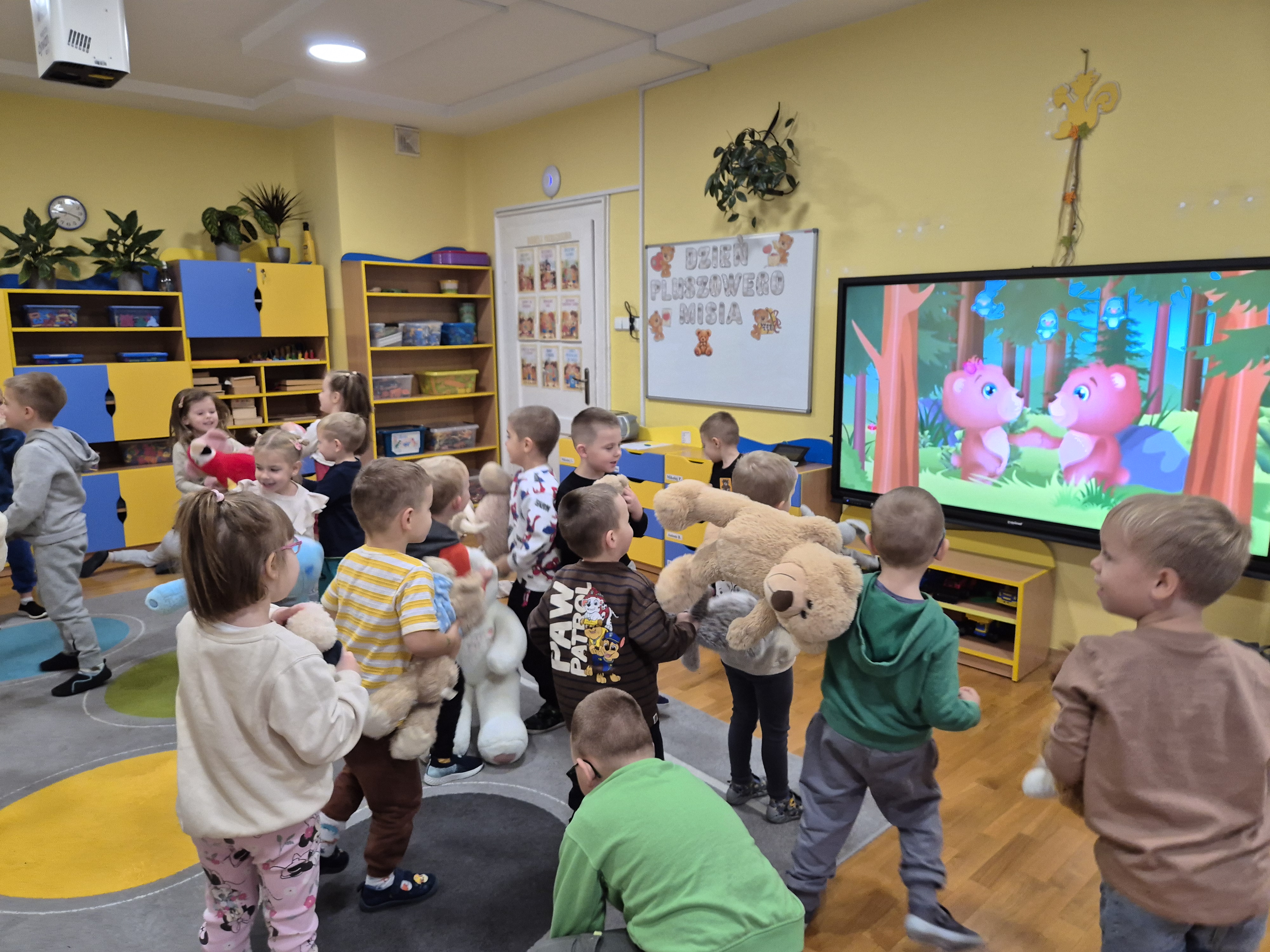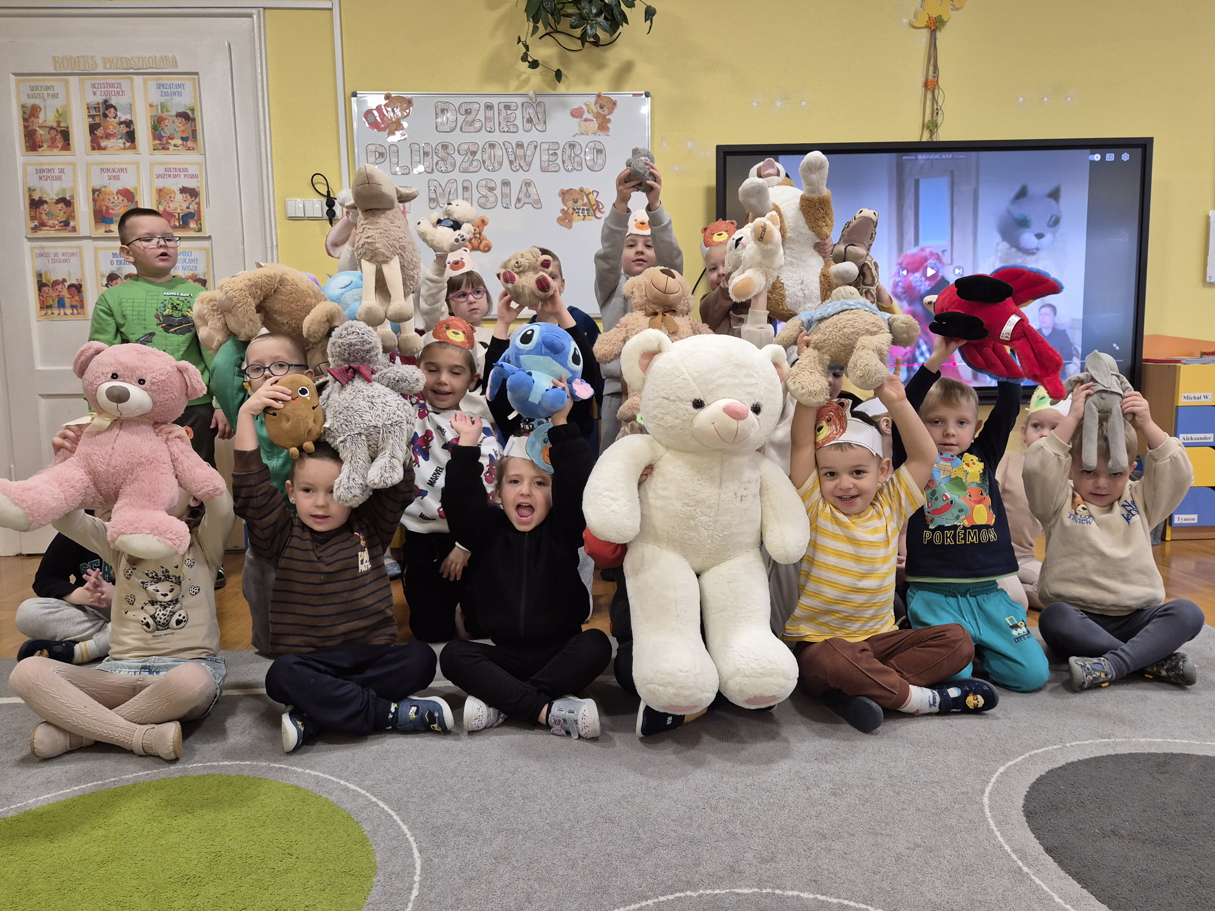 We wtorek całe przedszkole obchodziło Święto Pluszowego Misia. Pszczółki tańczyły przy wesołych piosenkach o misiach i brały udział w różnorodnych zabawach ruchowych. Wspólnie wykonały także kolorowe opaski z motywem misia, a na koniec pozowały do pamiątkowych zdjęć w naszej misiowej fotobudce. To był pełen radości i uśmiechu dzień!