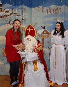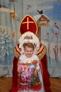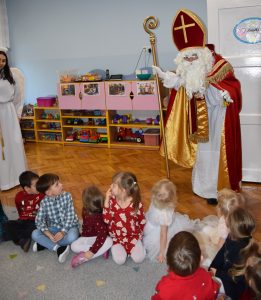 We wtorek do Aniołków przybył długo wyczekiwany gość – Święty Mikołaj. Już od rana w sali panowała niezwykła atmosfera. Odświętnie ubrane dzieci z ekscytacją spoglądały raz po raz w stronę okien i drzwi. Każdy szept i krok na korytarzu wywoływał falę radości: „To on! Idzie Mikołaj!”. Odwiedziny Świętego Mikołaja poprzedzał teatrzyk pt. ,,Legenda o Świętym Mikołaju” w wykonaniu aktorów z Teatru Eden . Wzruszające przedstawienie wprowadziło nas w świat wartości takich jak: dobro i miłość.