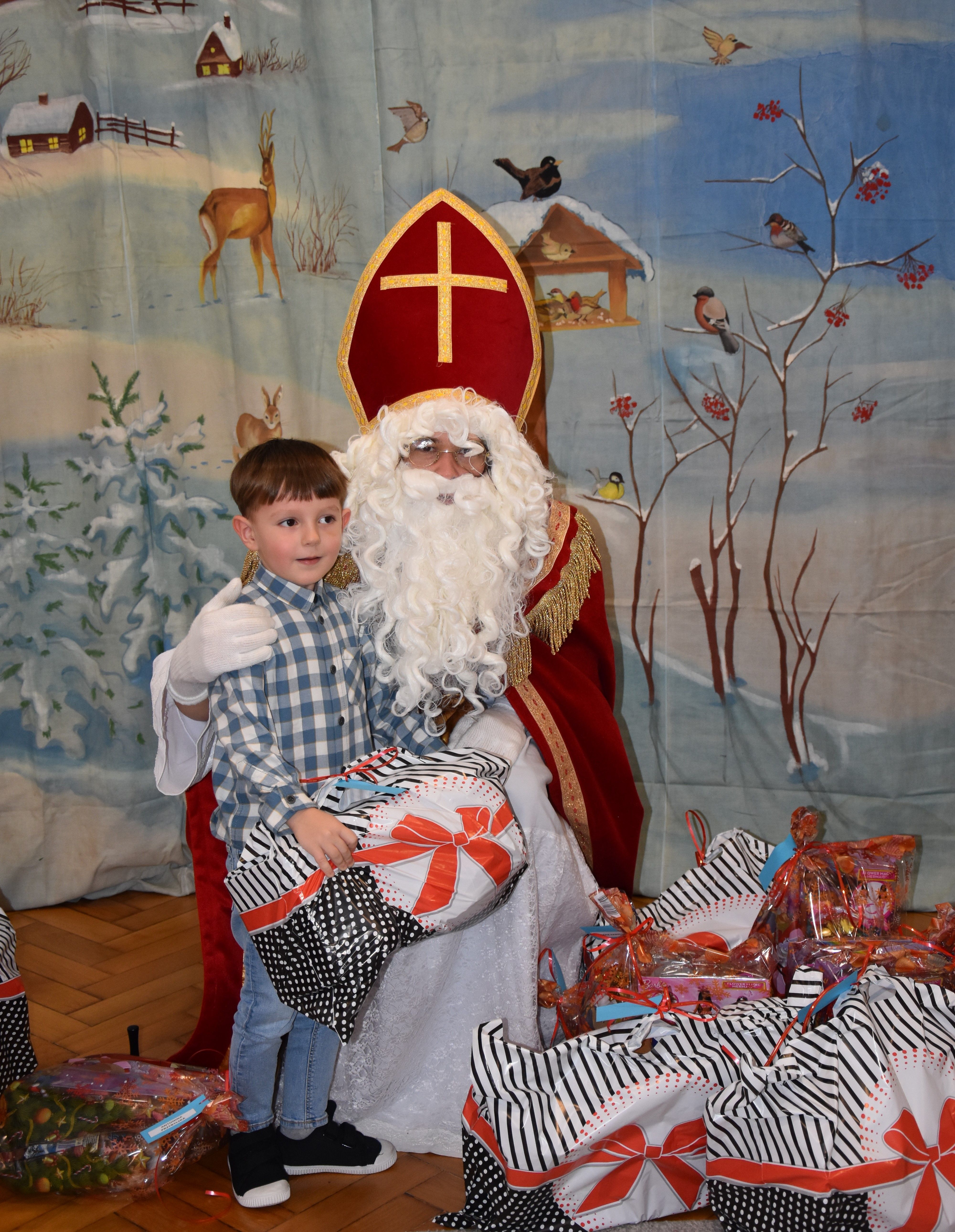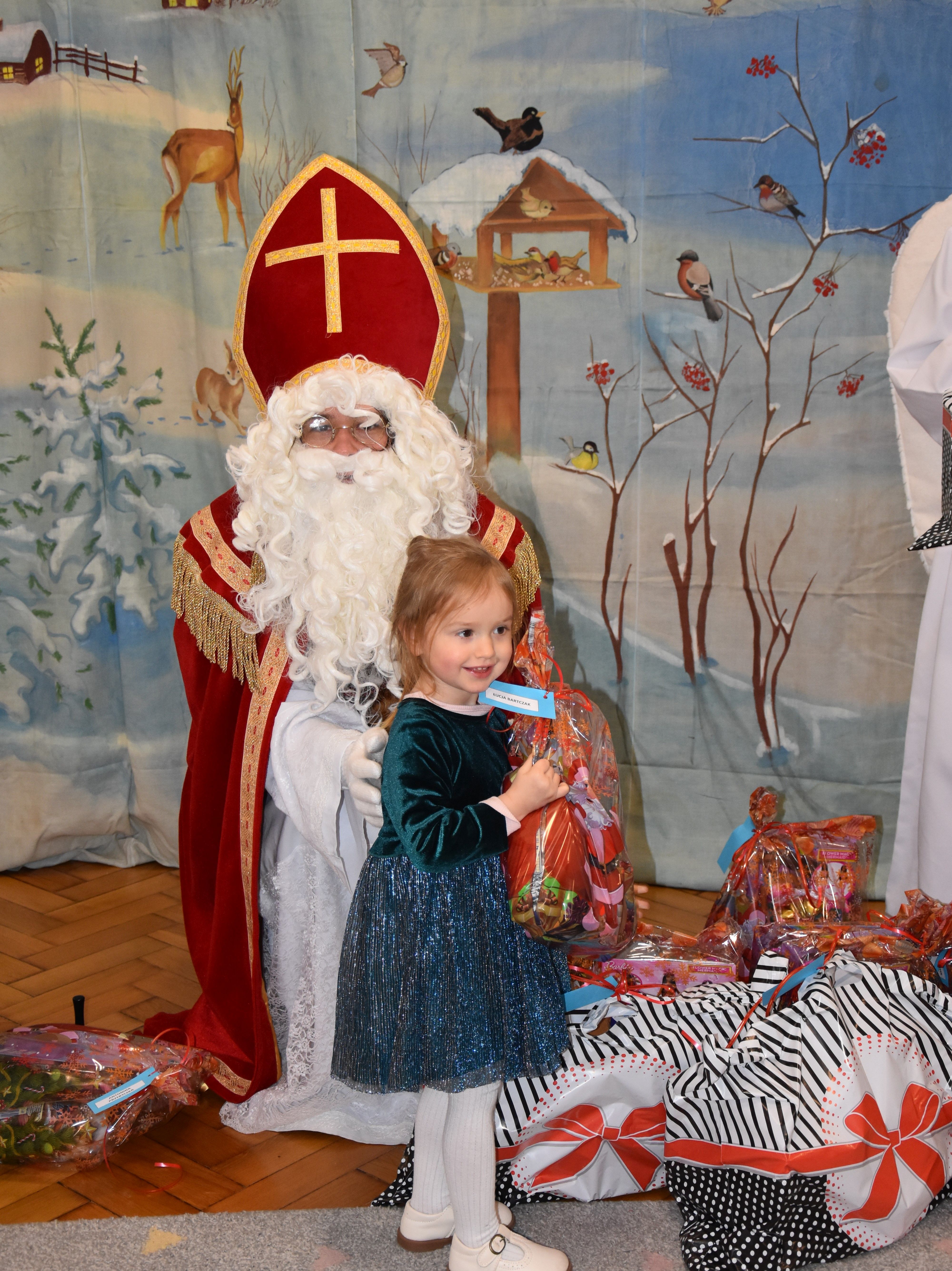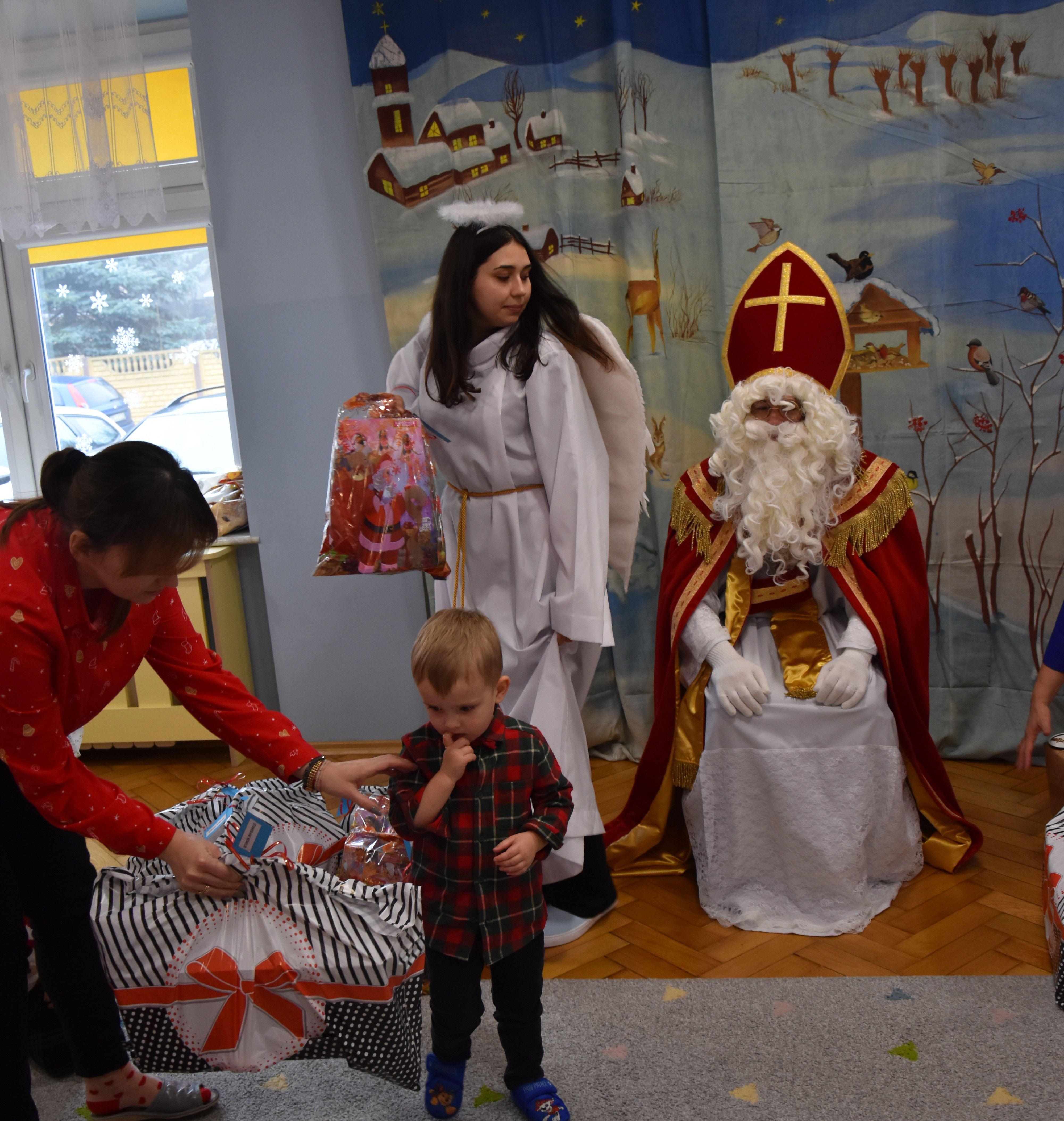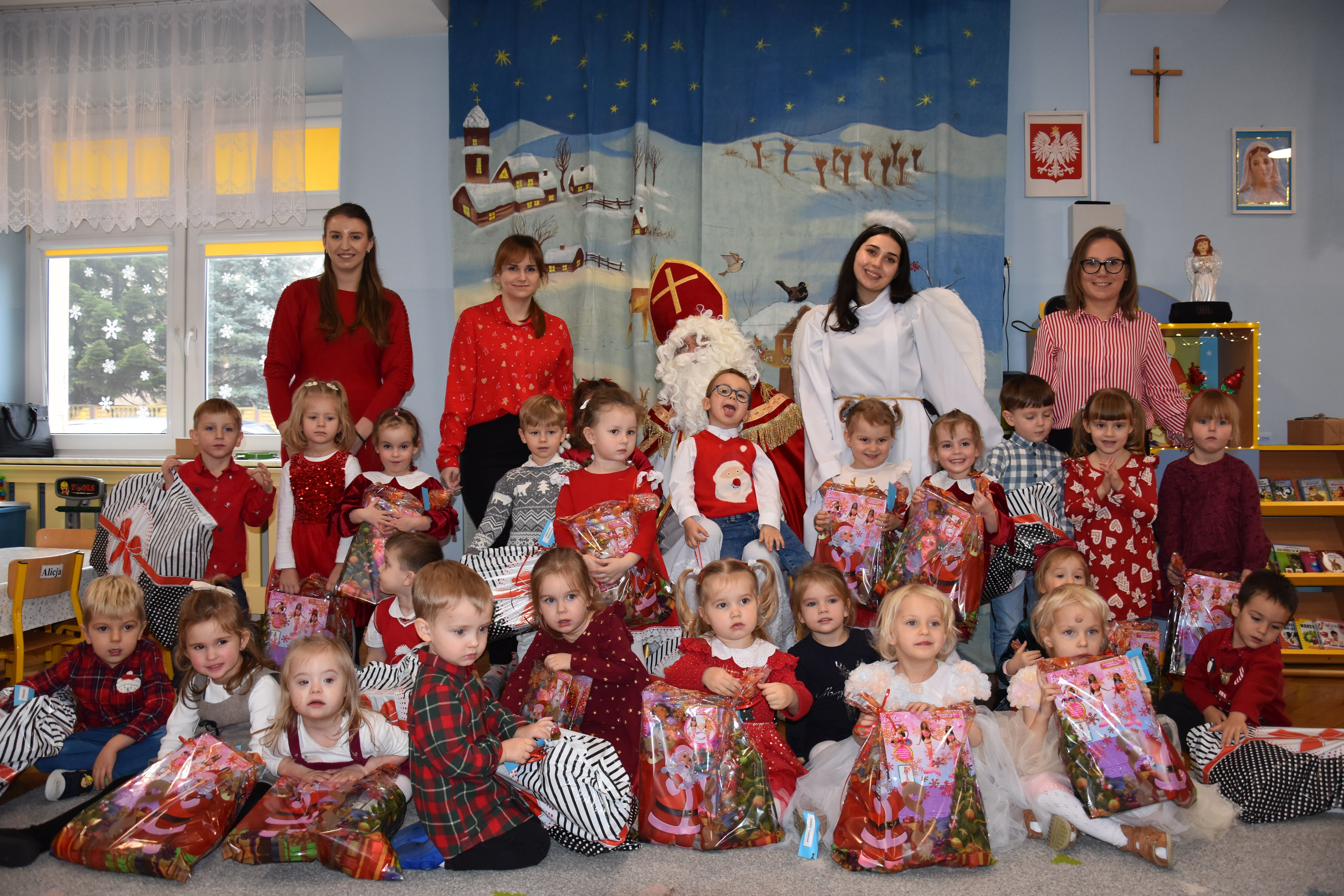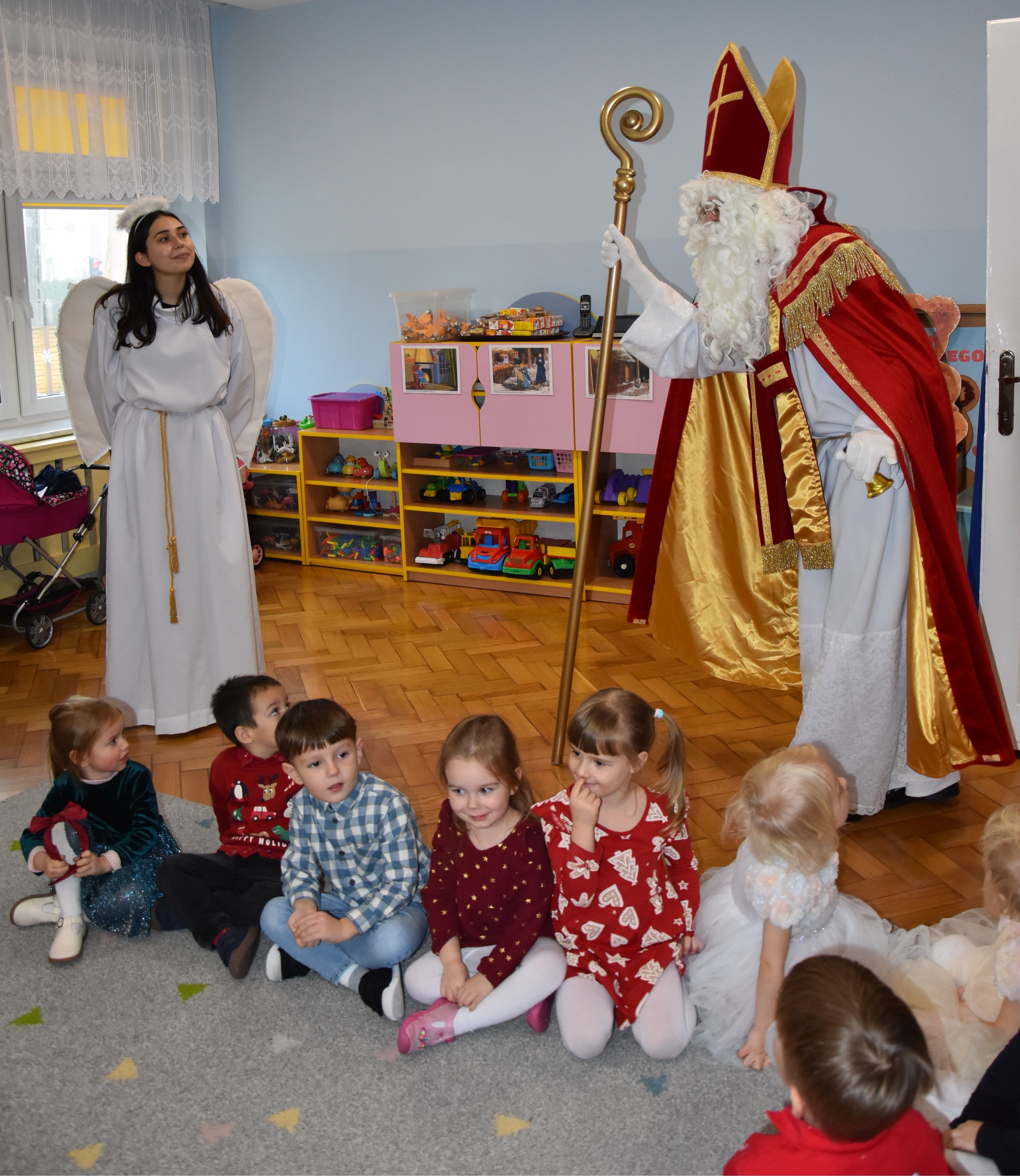 We wtorek do Aniołków przybył długo wyczekiwany gość – Święty Mikołaj. Już od rana w sali panowała niezwykła atmosfera. Odświętnie ubrane dzieci z ekscytacją spoglądały raz po raz w stronę okien i drzwi. Każdy szept i krok na korytarzu wywoływał falę radości: „To on! Idzie Mikołaj!”. Odwiedziny Świętego Mikołaja poprzedzał teatrzyk pt. ,,Legenda o Świętym Mikołaju” w wykonaniu aktorów z Teatru Eden . Wzruszające przedstawienie wprowadziło nas w świat wartości takich jak: dobro i miłość.