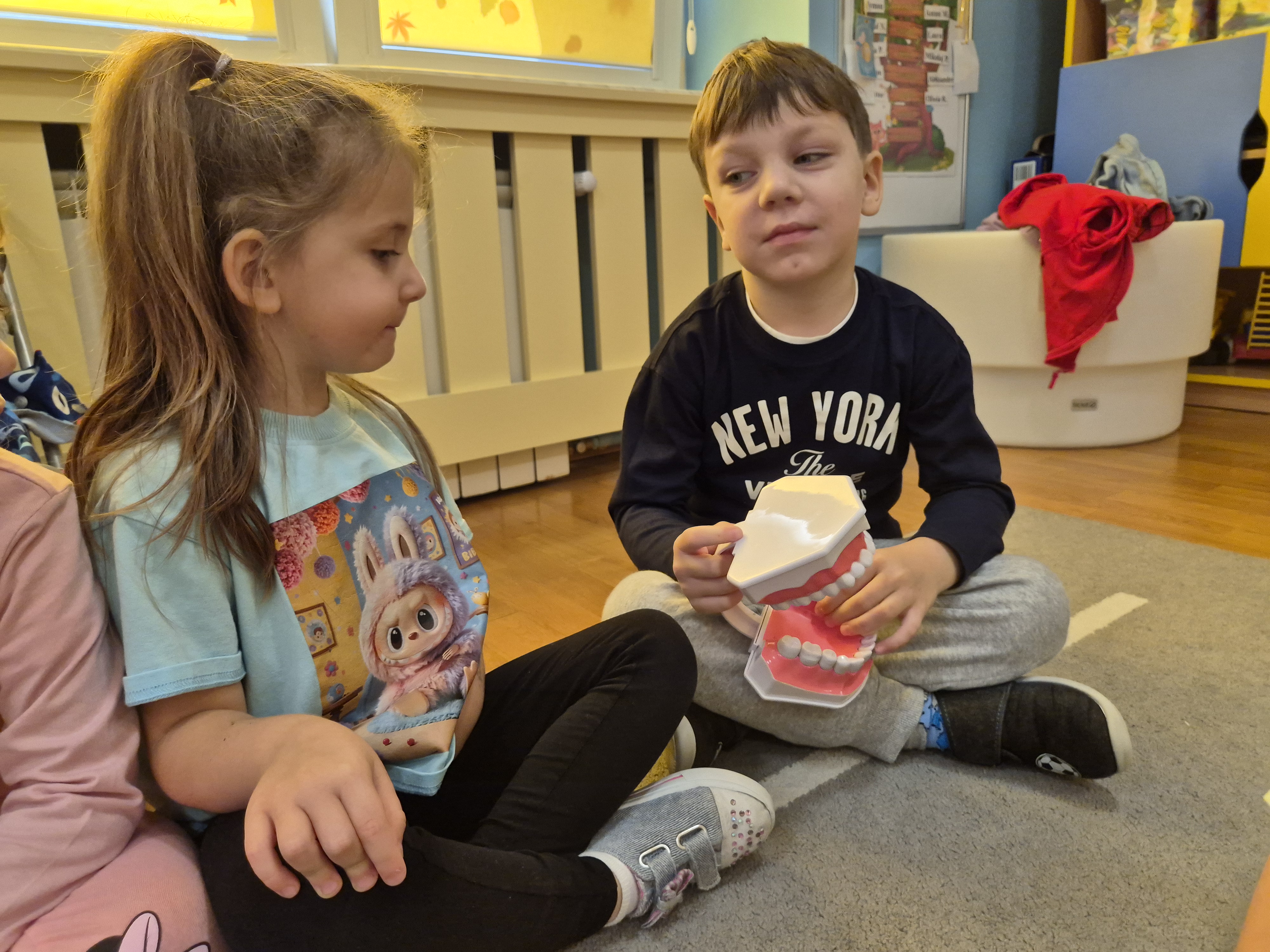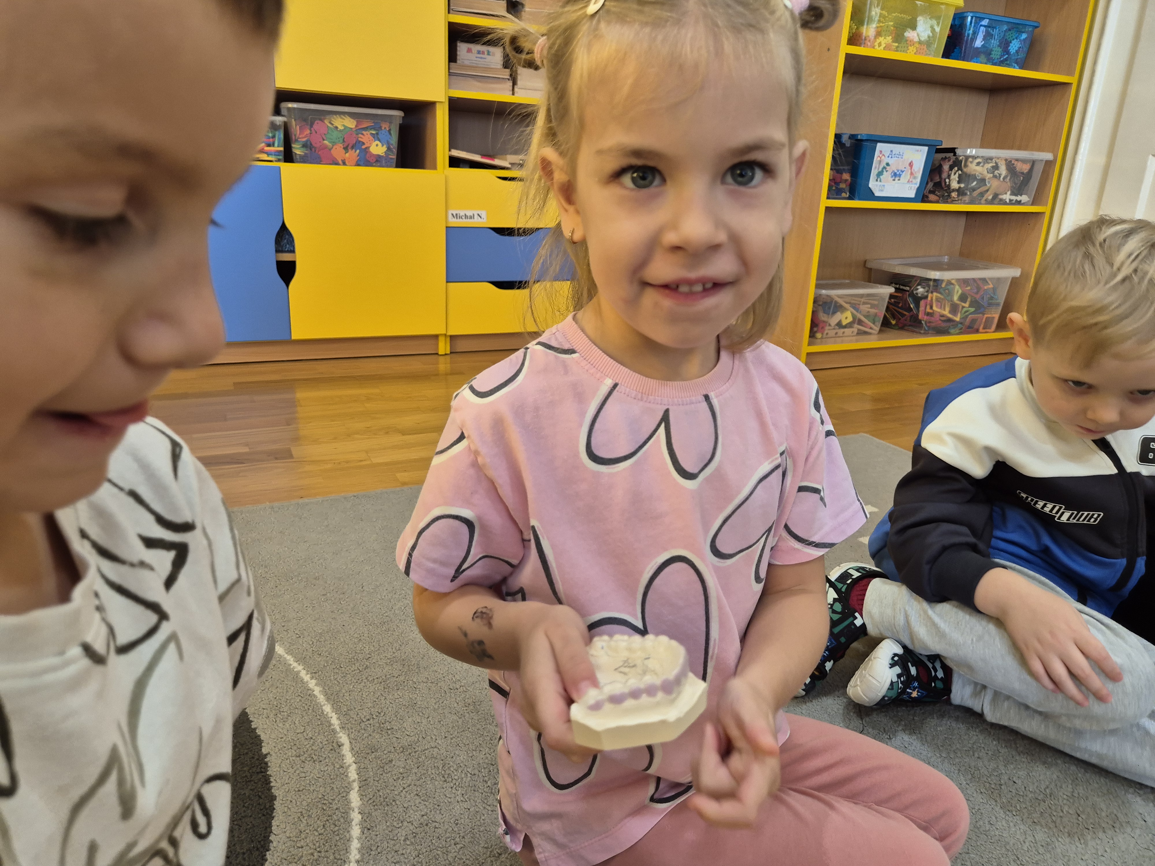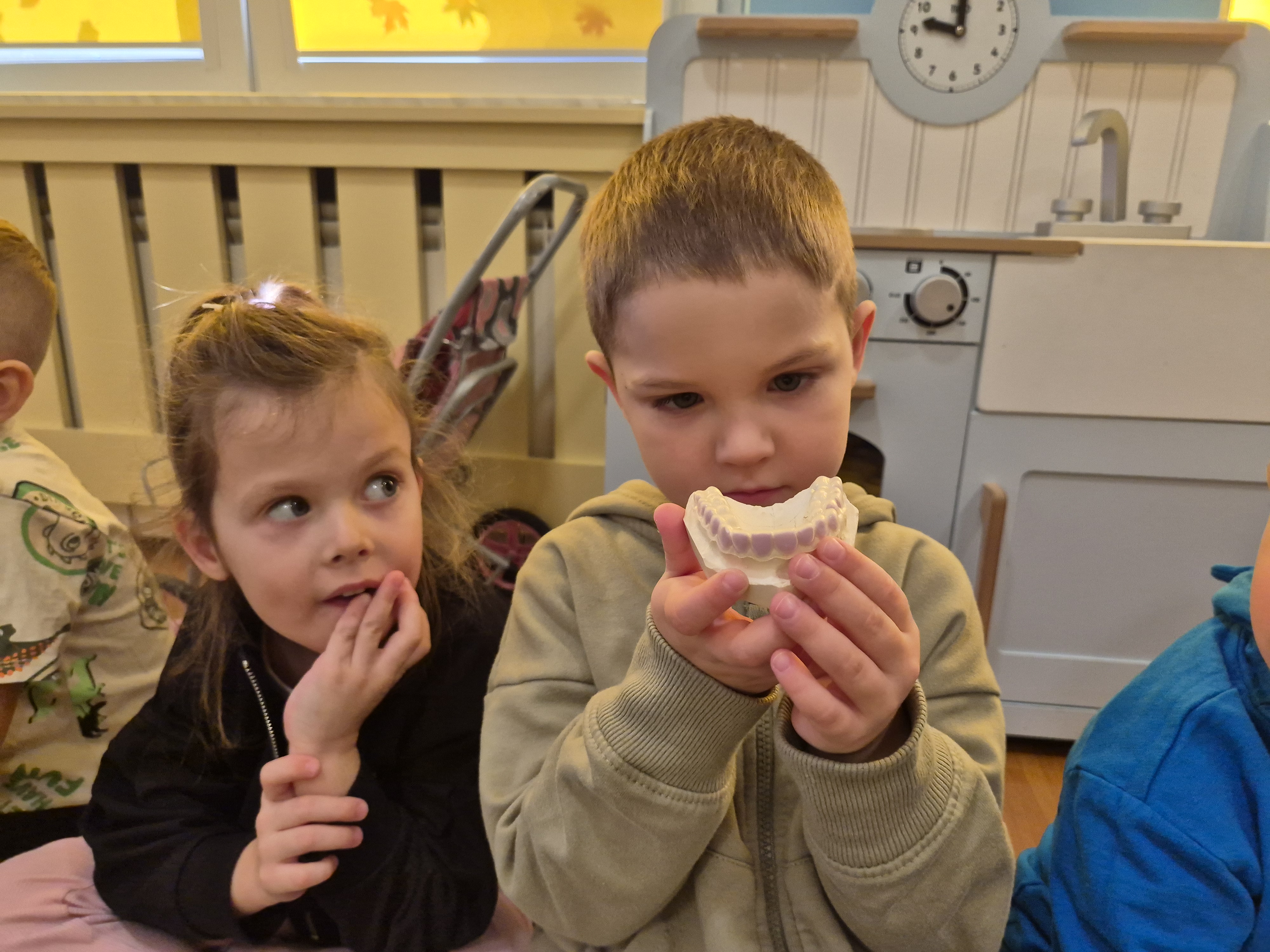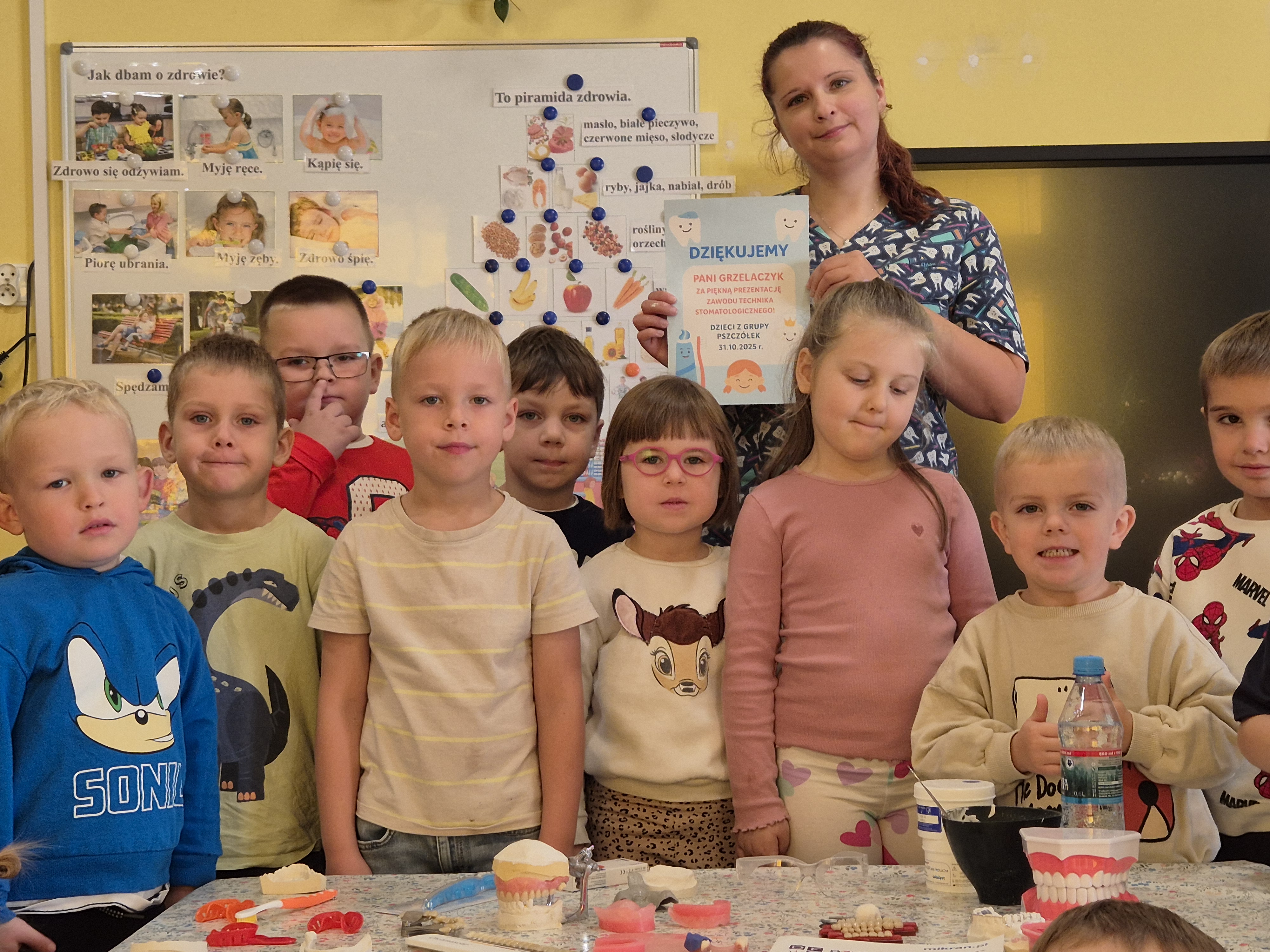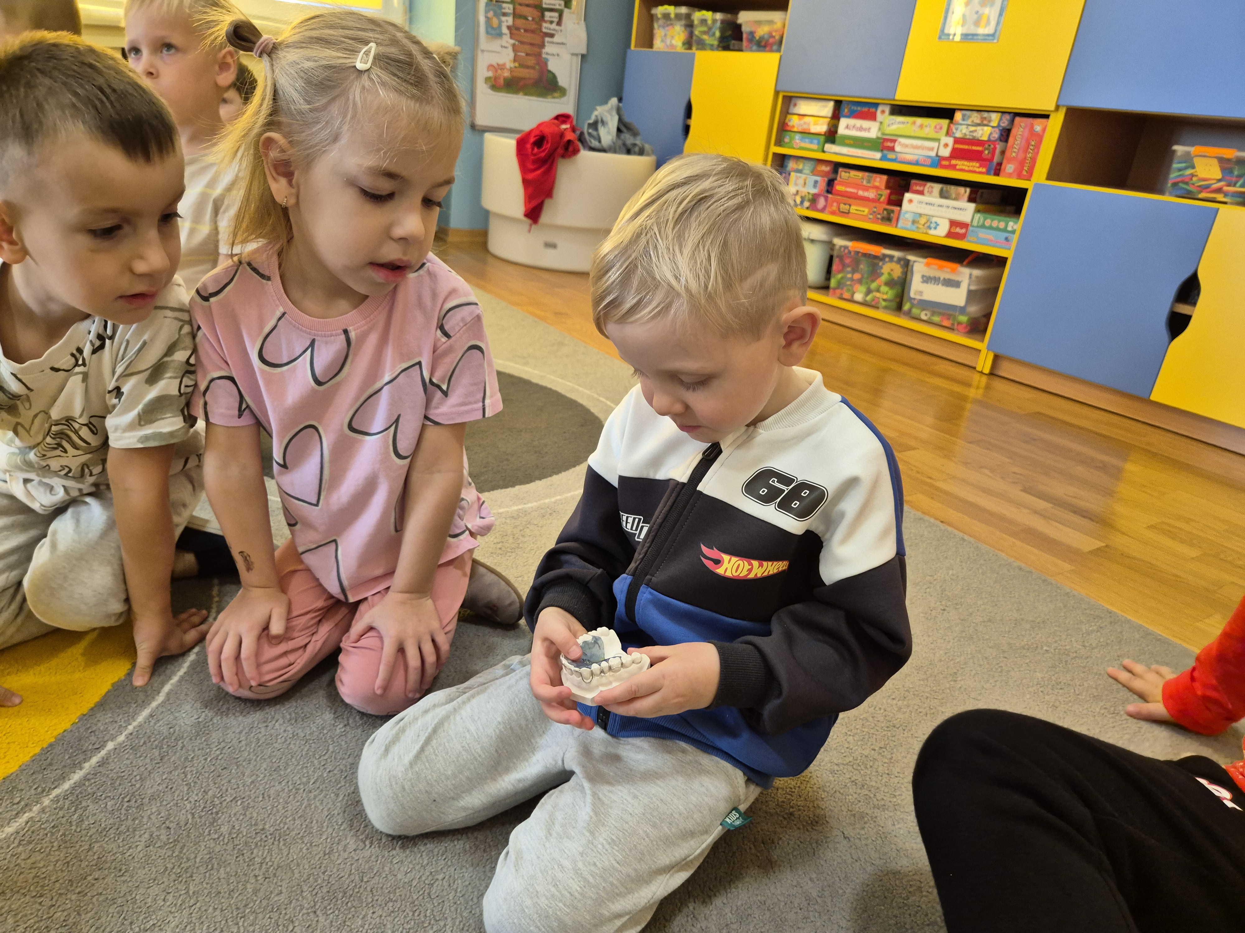 Grupę Pszczółek odwiedziła mama Mikołaja, która opowiedziała dzieciom o swojej pracy jako technik dentystyczny. Pani Kamila, wyjaśniła, na czym polega wykonywanie protez i aparatów ortodontycznych oraz jak ważna jest dbałość o zdrowe zęby. Dzieci mogły z bliska zobaczyć różne narzędzia i modele zębów. To była bardzo ciekawa i pouczająca wizyta, za którą jeszcze raz serdecznie dziękujemy.