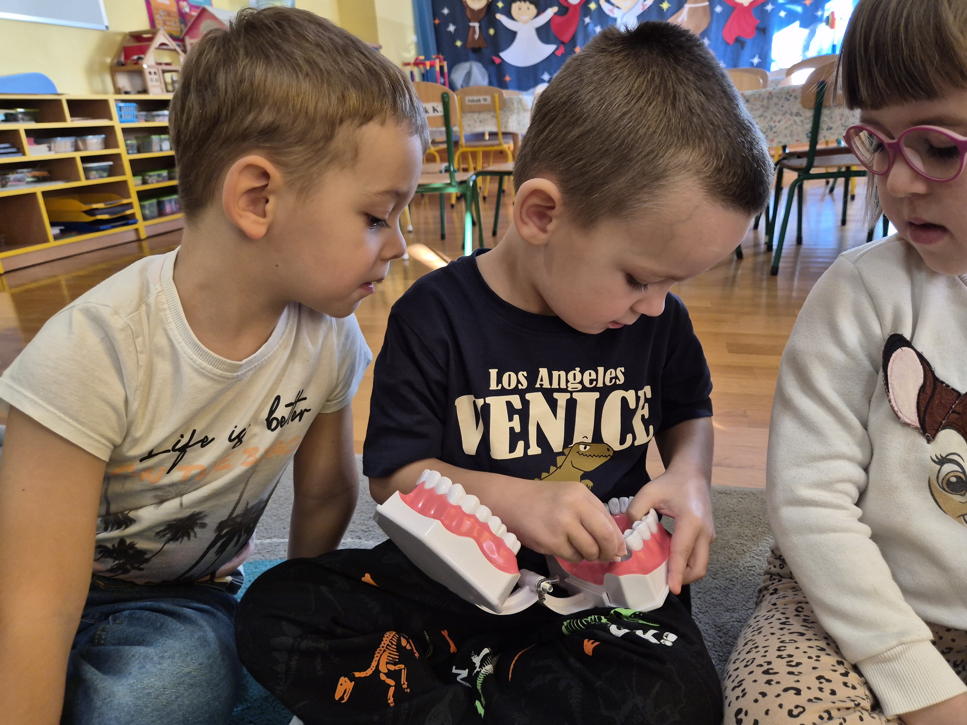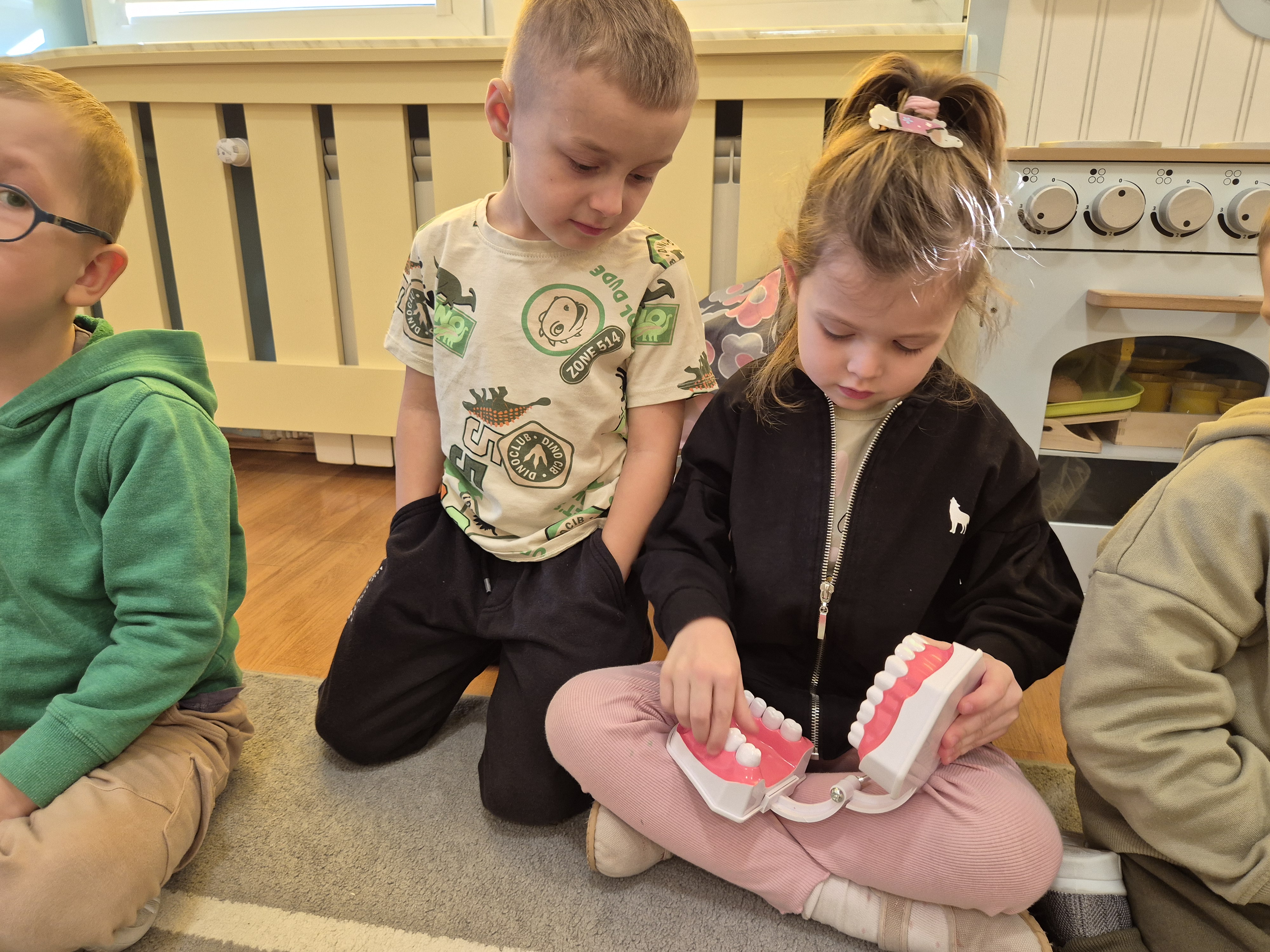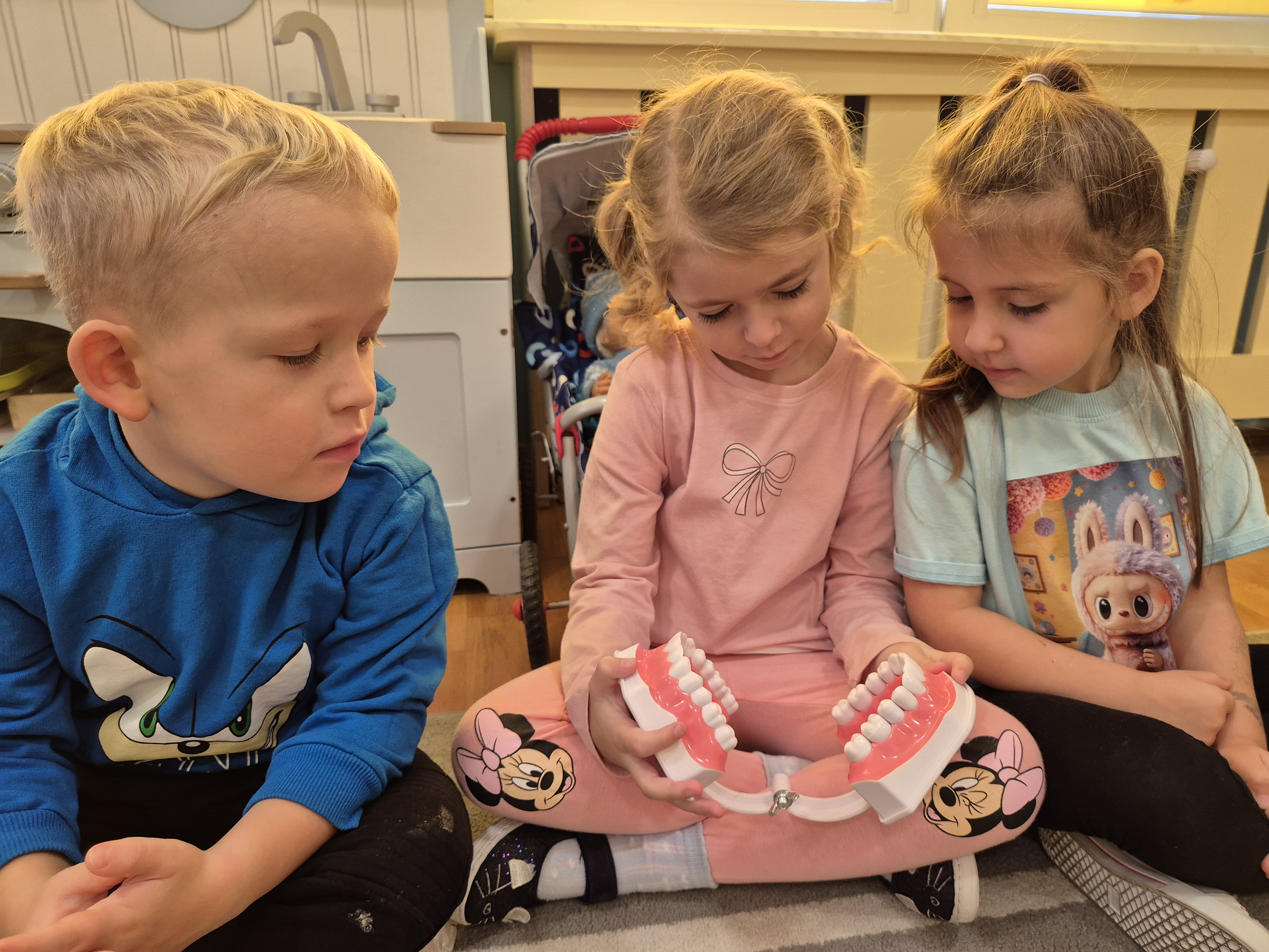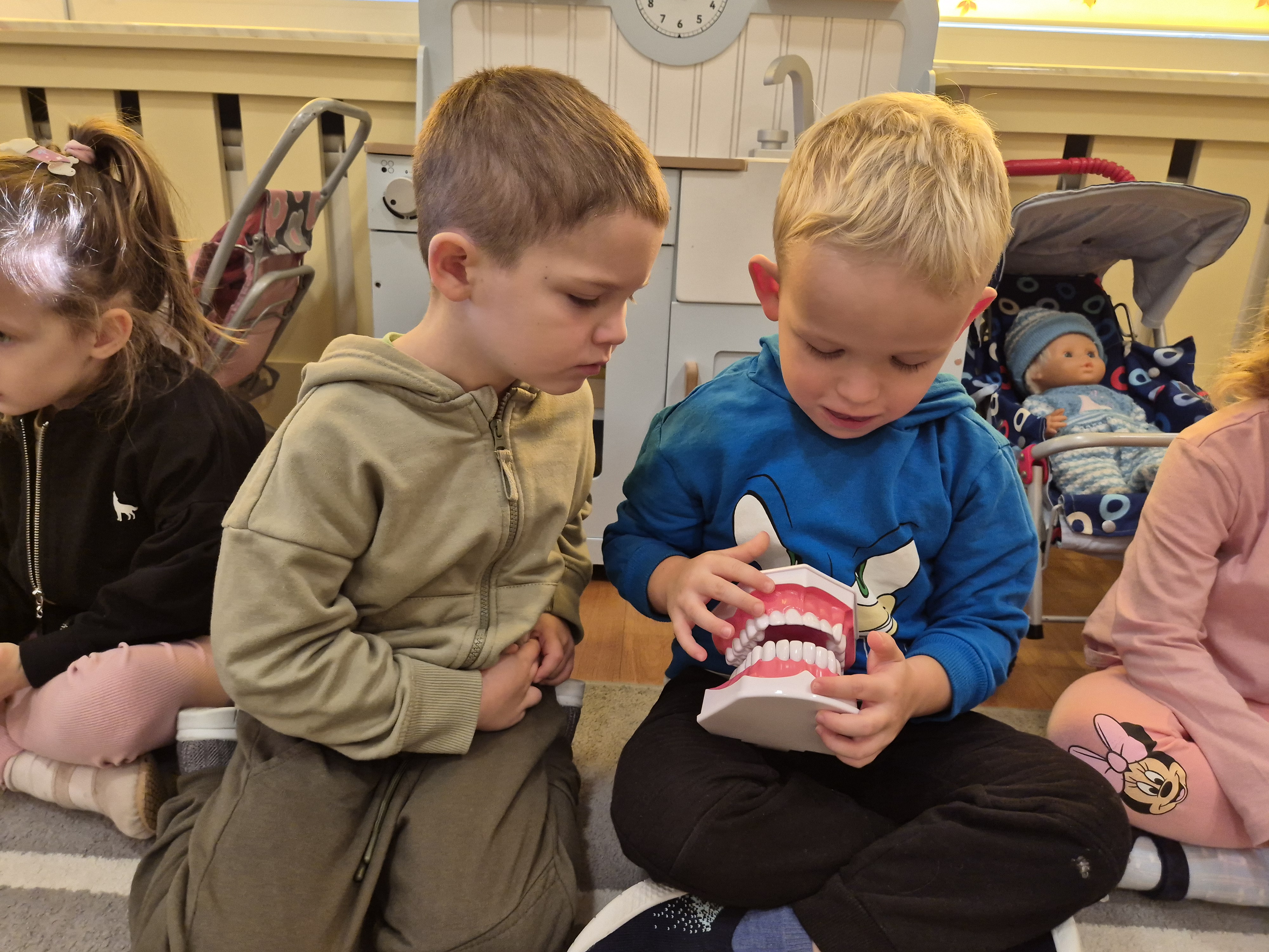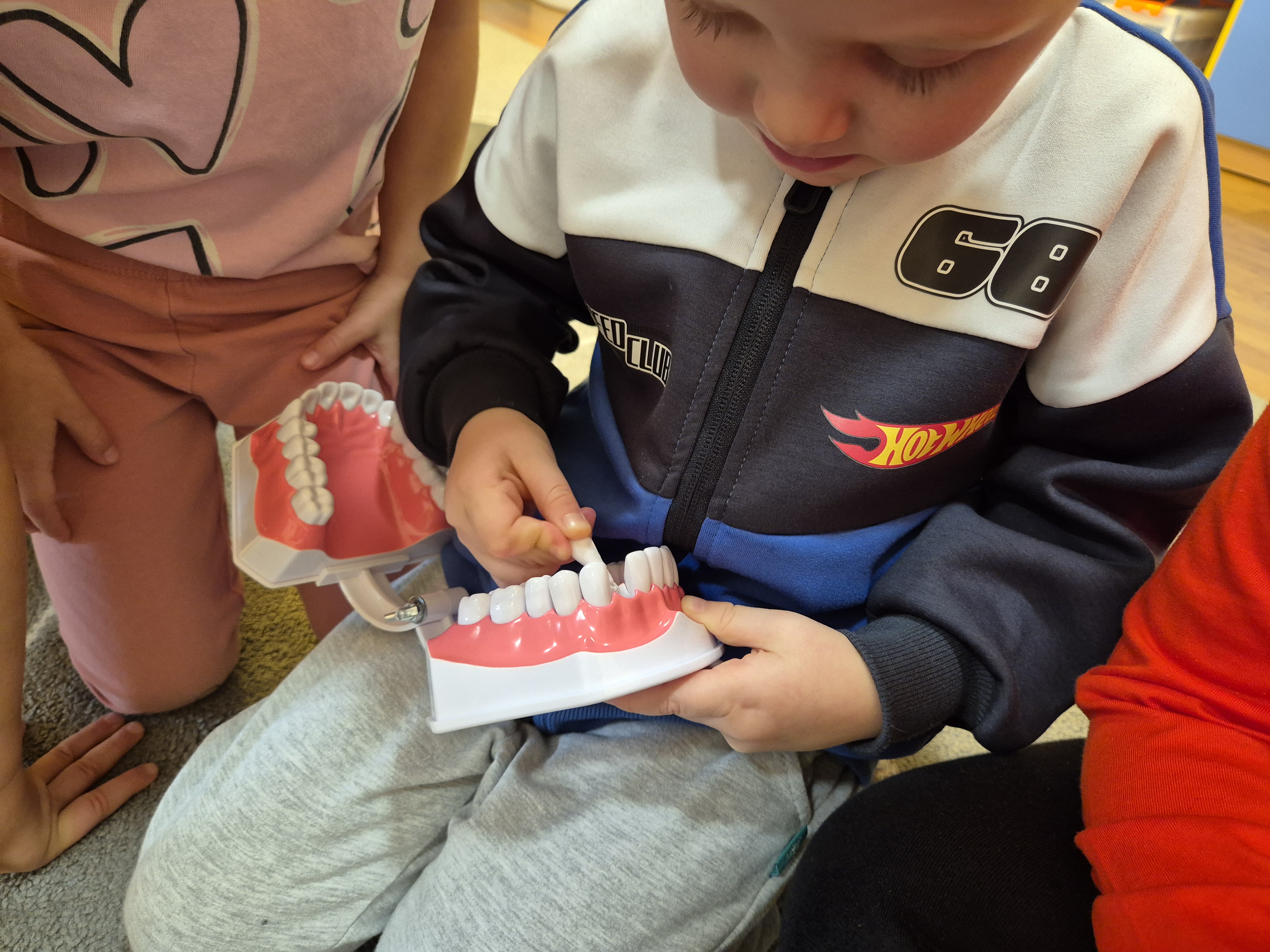 Grupę Pszczółek odwiedziła mama Mikołaja, która opowiedziała dzieciom o swojej pracy jako technik dentystyczny. Pani Kamila, wyjaśniła, na czym polega wykonywanie protez i aparatów ortodontycznych oraz jak ważna jest dbałość o zdrowe zęby. Dzieci mogły z bliska zobaczyć różne narzędzia i modele zębów. To była bardzo ciekawa i pouczająca wizyta, za którą jeszcze raz serdecznie dziękujemy.