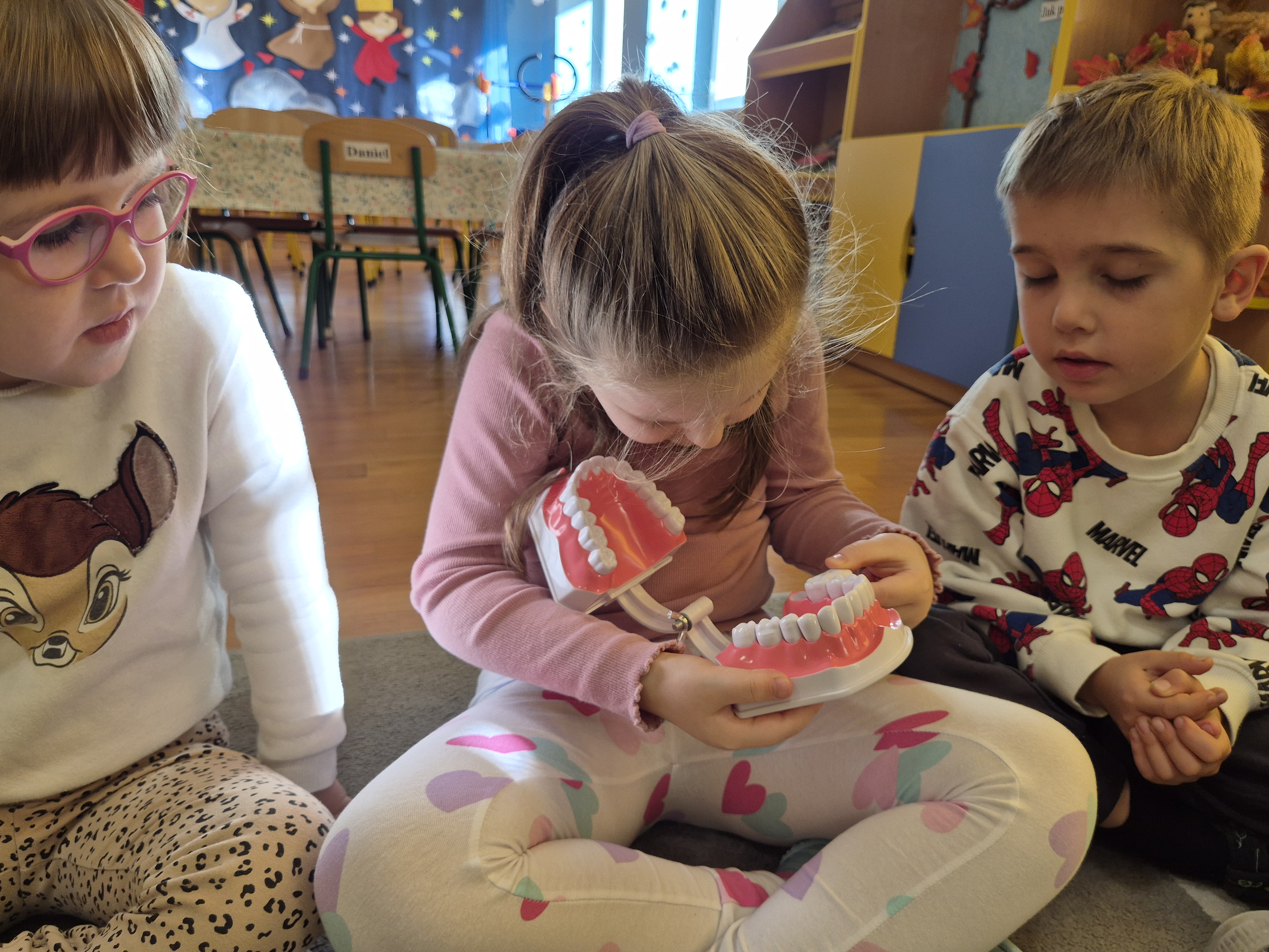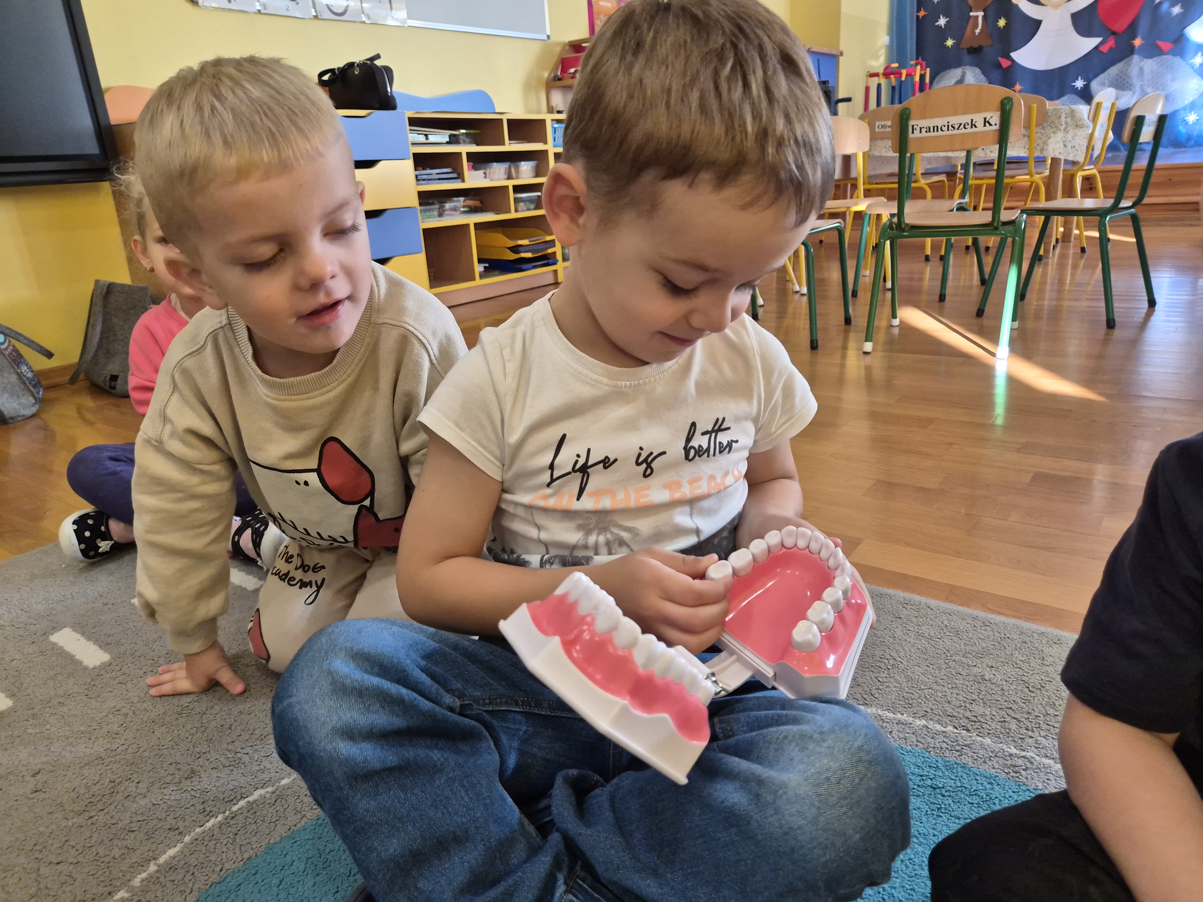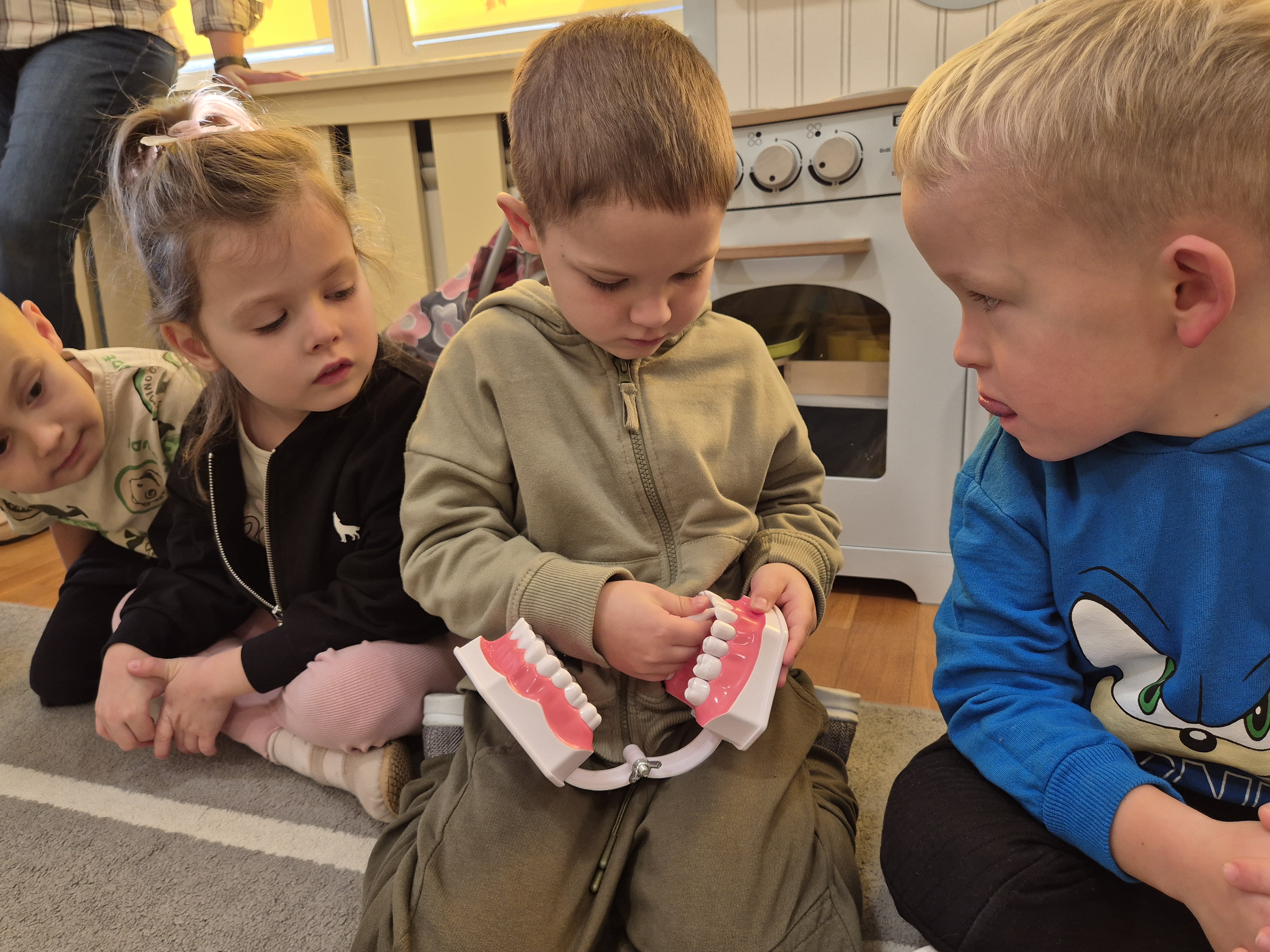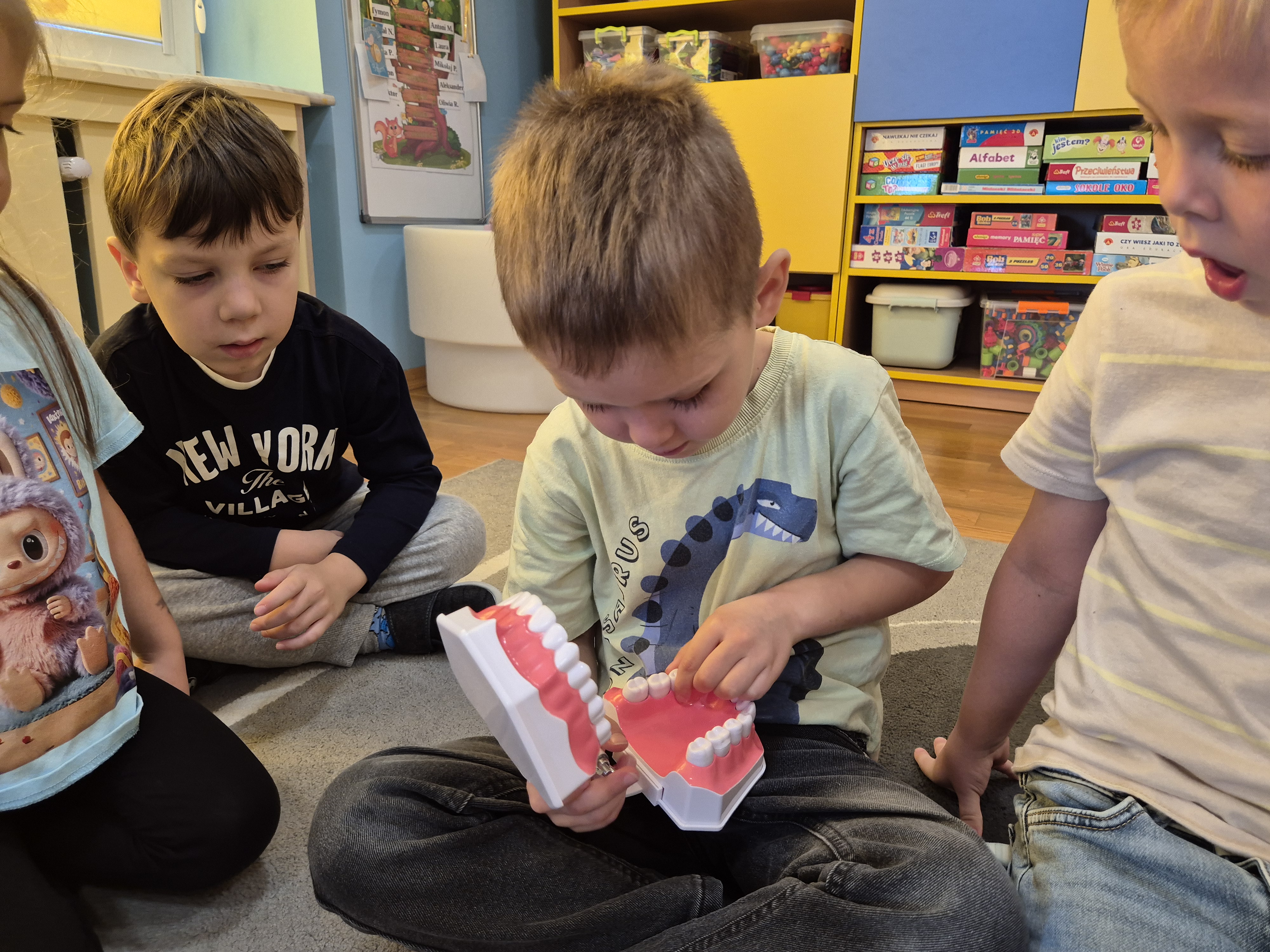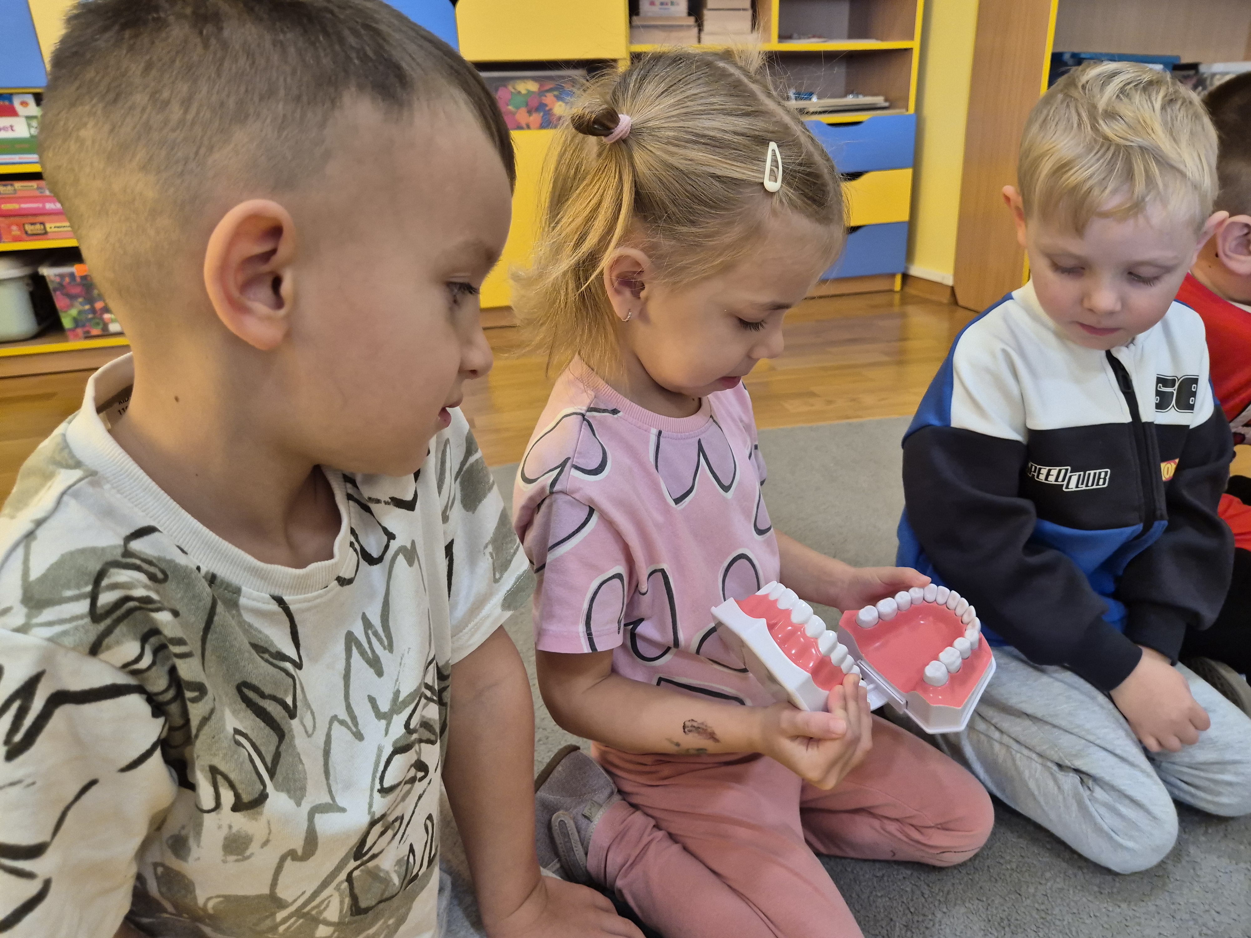 Grupę Pszczółek odwiedziła mama Mikołaja, która opowiedziała dzieciom o swojej pracy jako technik dentystyczny. Pani Kamila, wyjaśniła, na czym polega wykonywanie protez i aparatów ortodontycznych oraz jak ważna jest dbałość o zdrowe zęby. Dzieci mogły z bliska zobaczyć różne narzędzia i modele zębów. To była bardzo ciekawa i pouczająca wizyta, za którą jeszcze raz serdecznie dziękujemy.