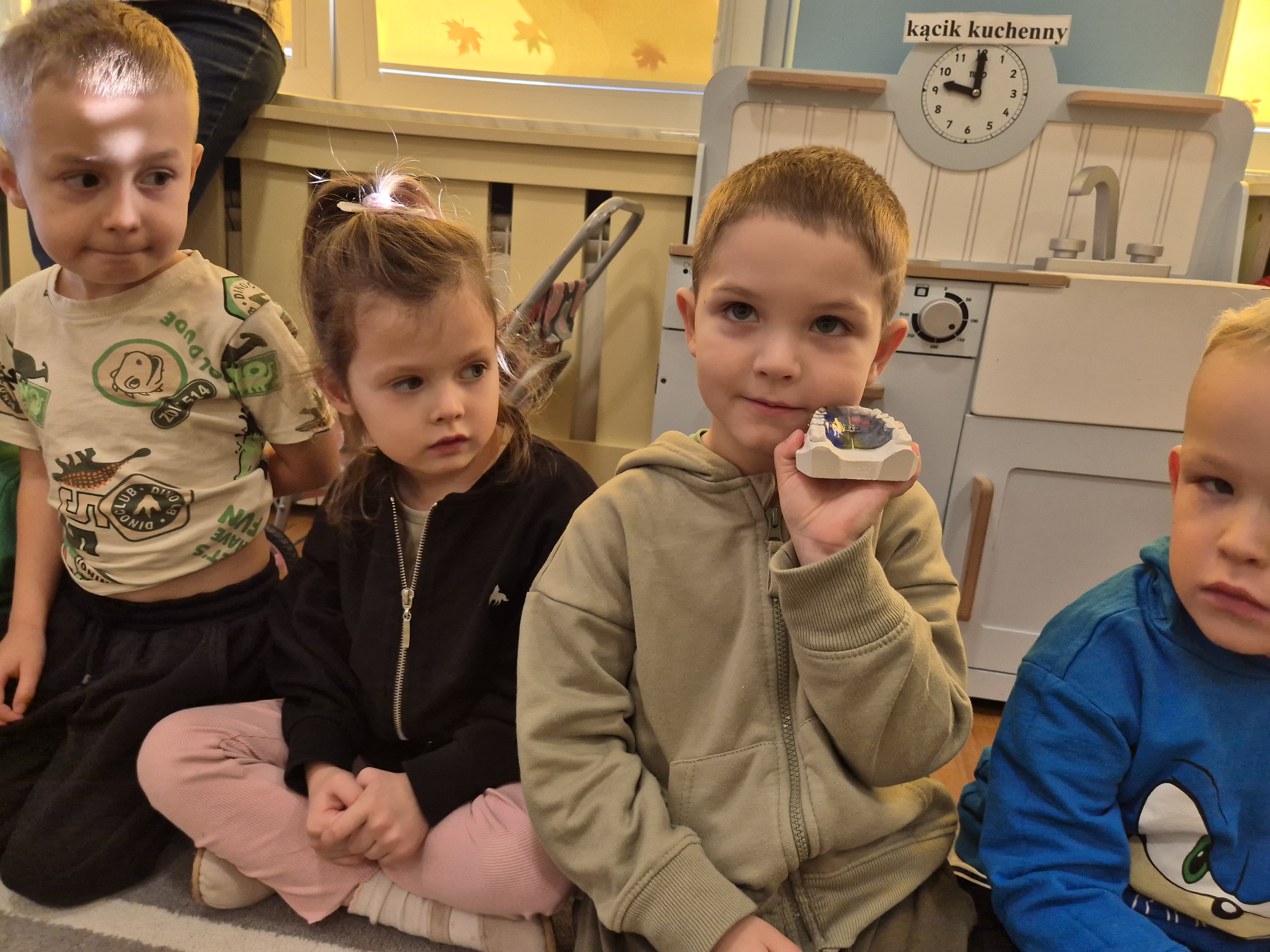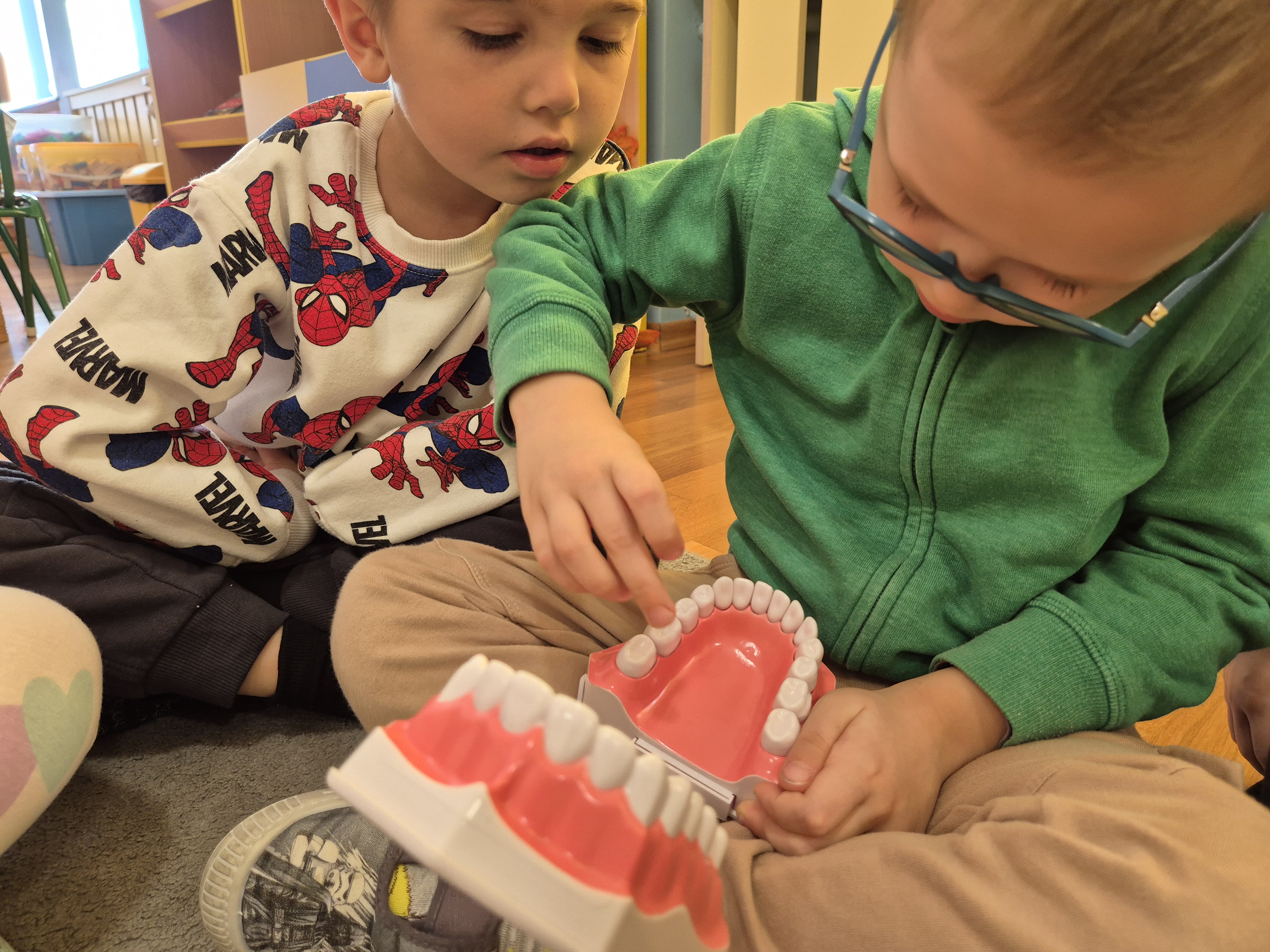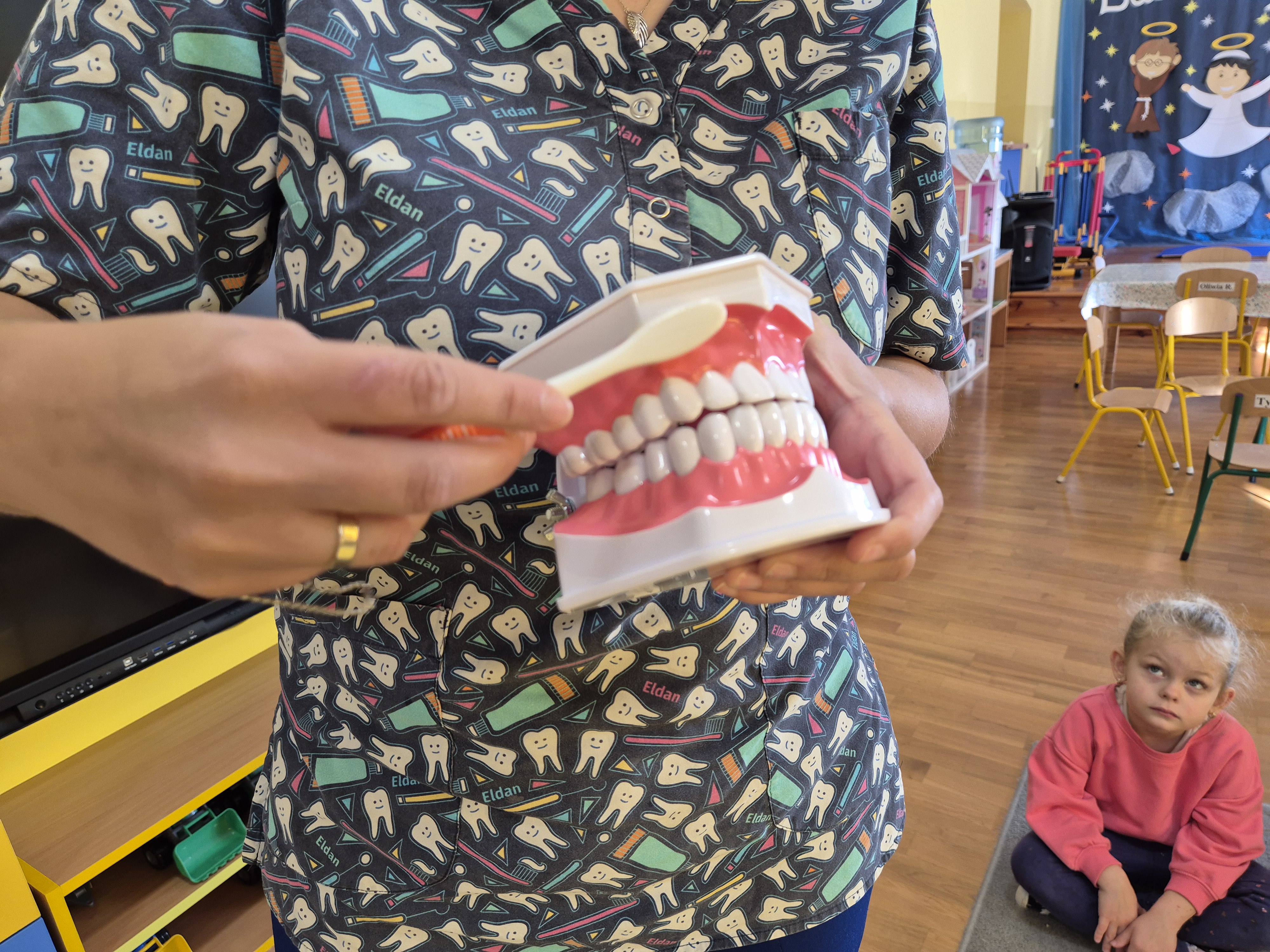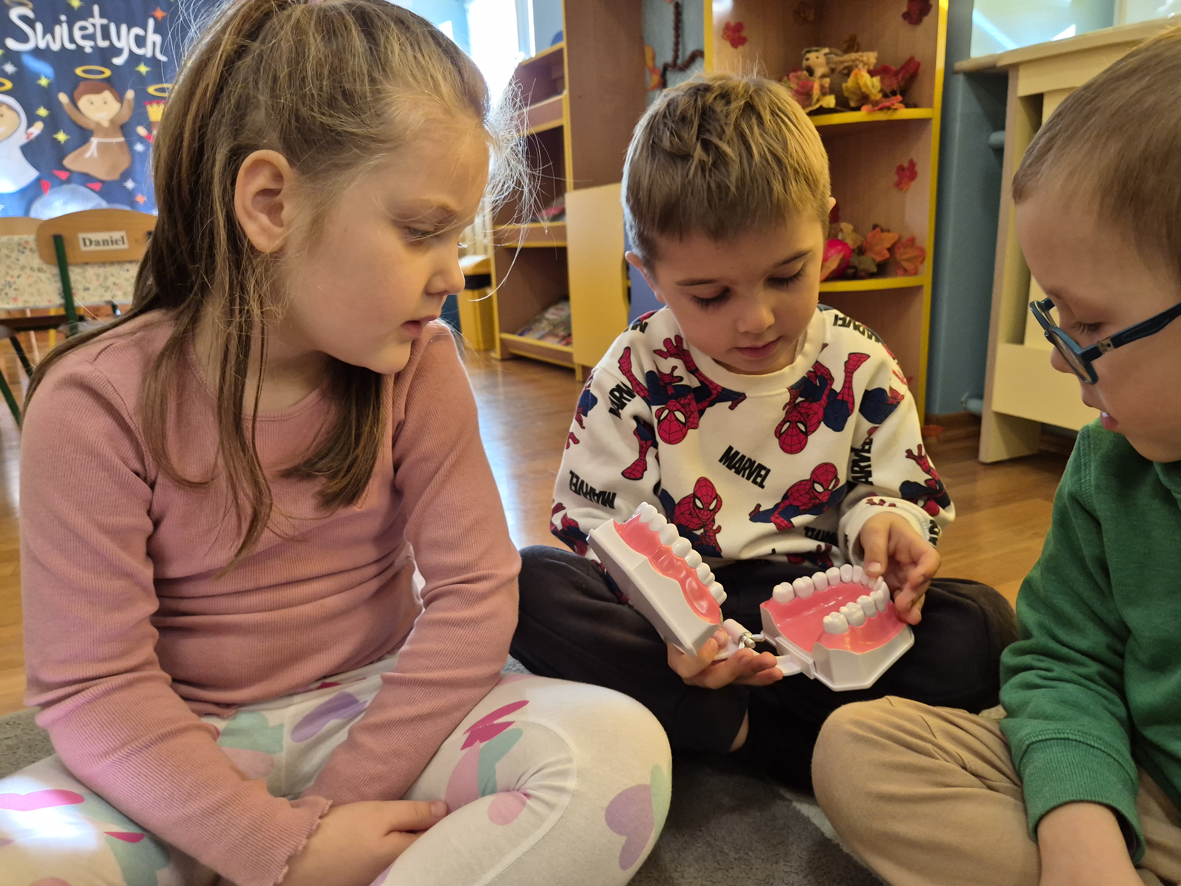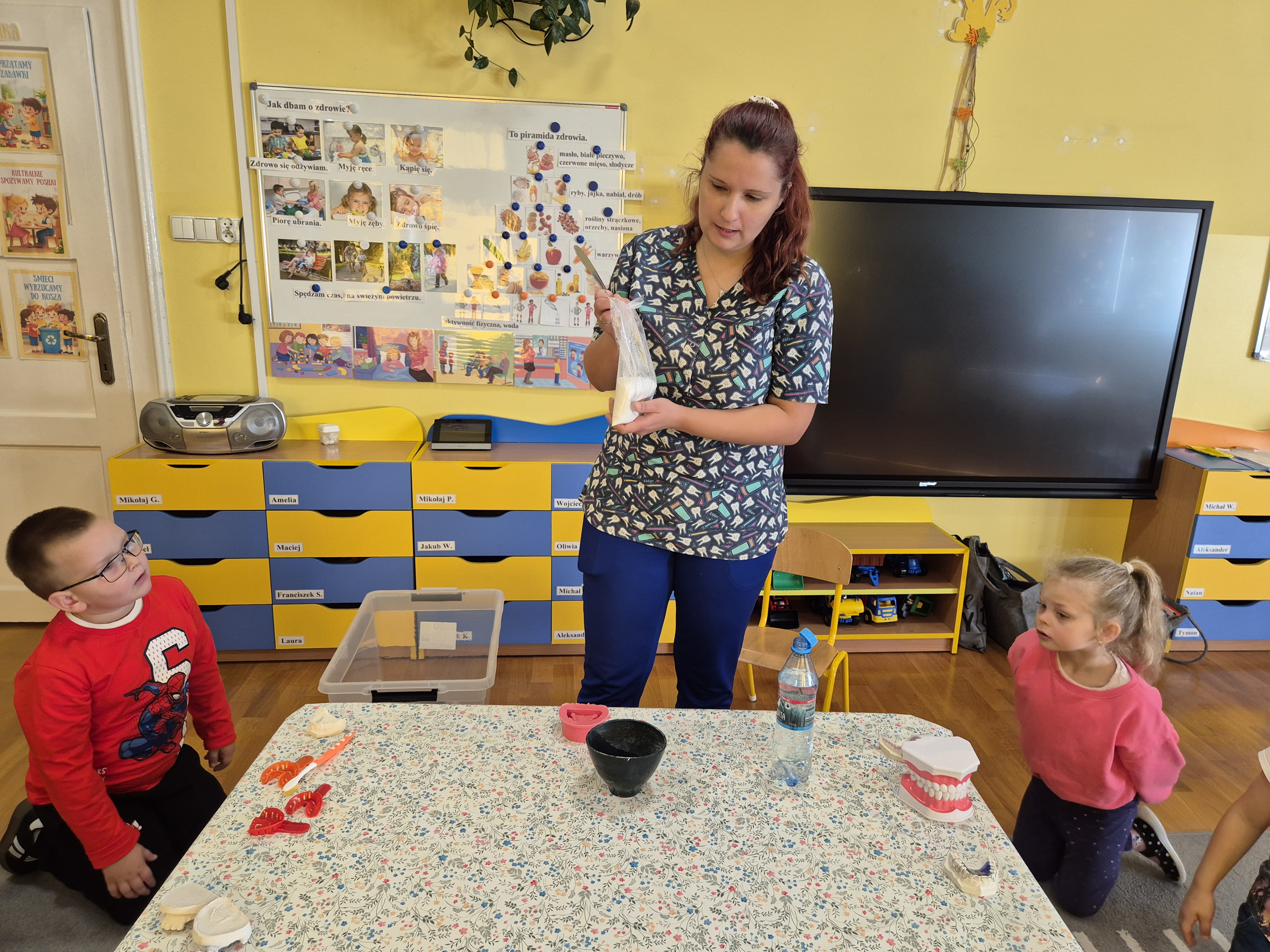Grupę Pszczółek odwiedziła mama Mikołaja, która opowiedziała dzieciom o swojej pracy jako technik dentystyczny. Pani Kamila, wyjaśniła, na czym polega wykonywanie protez i aparatów ortodontycznych oraz jak ważna jest dbałość o zdrowe zęby. Dzieci mogły z bliska zobaczyć różne narzędzia i modele zębów. To była bardzo ciekawa i pouczająca wizyta, za którą jeszcze raz serdecznie dziękujemy.