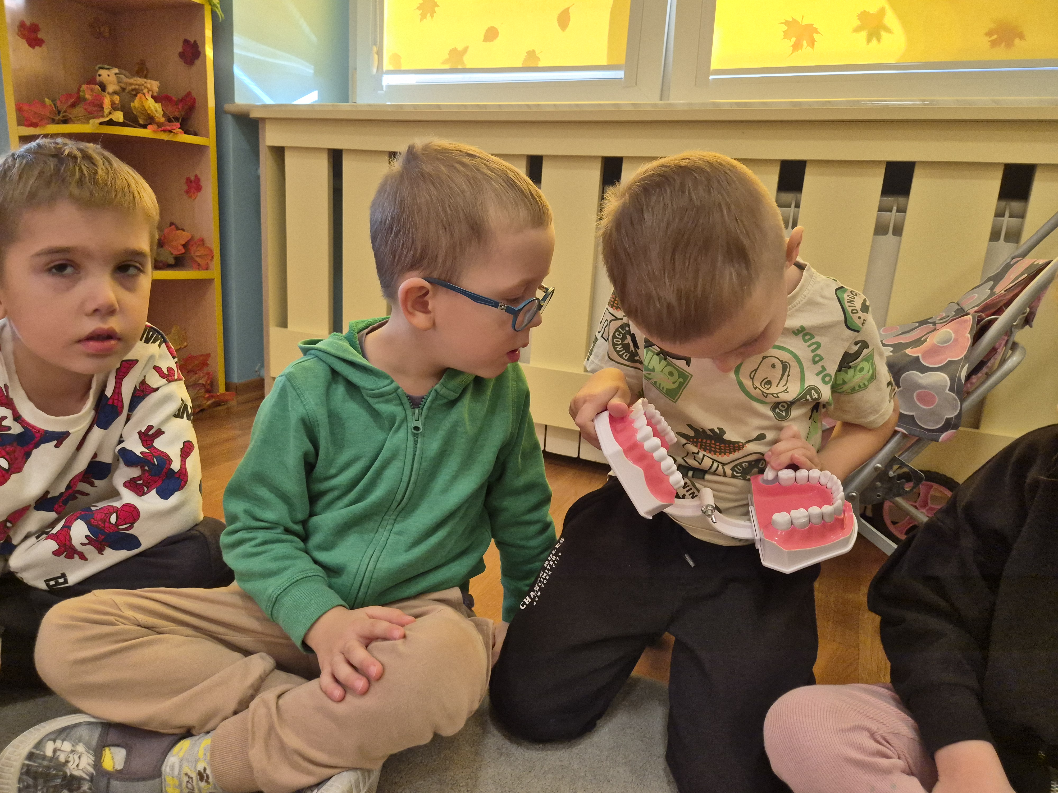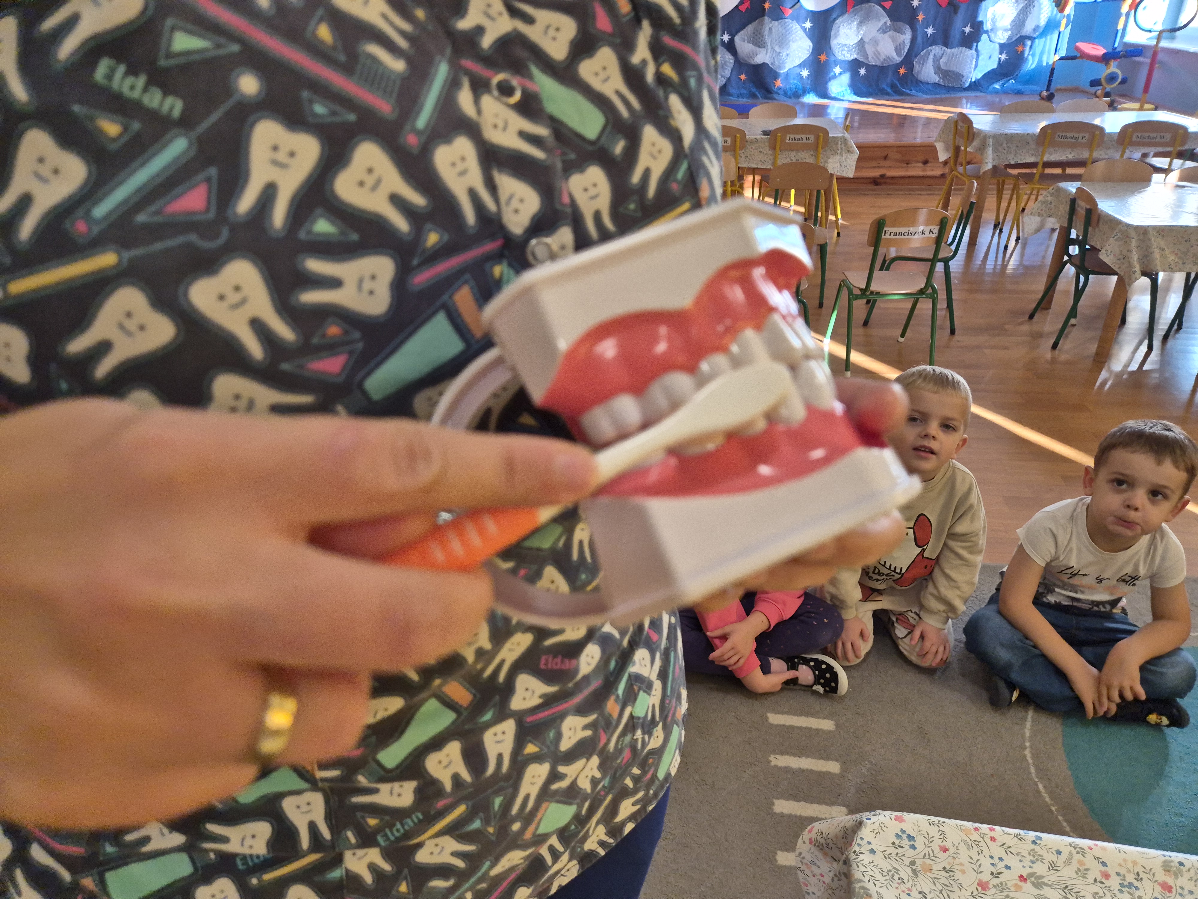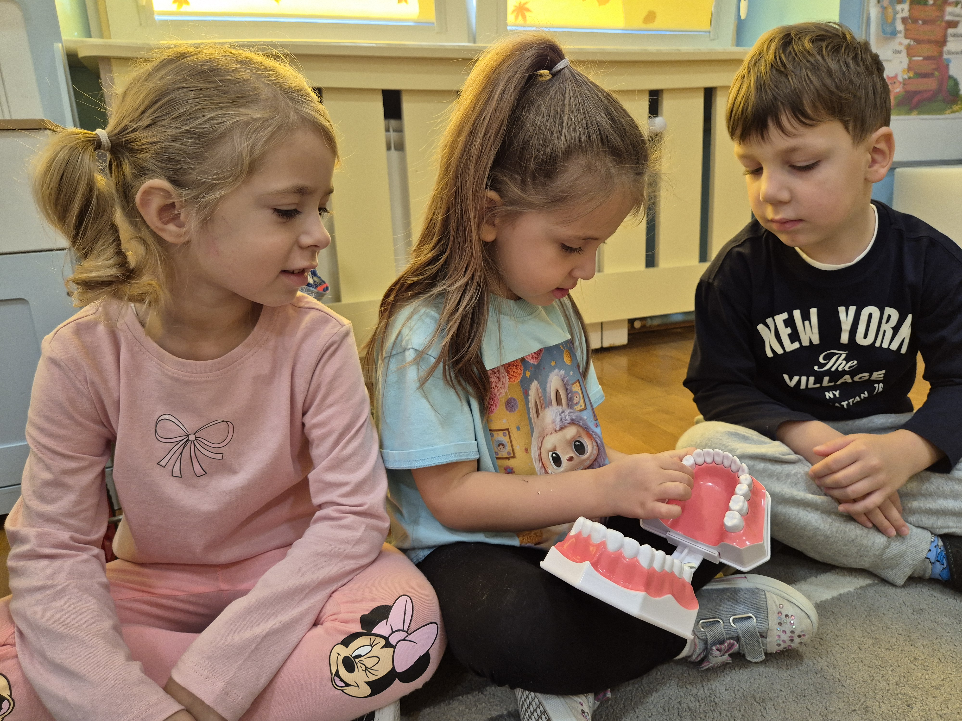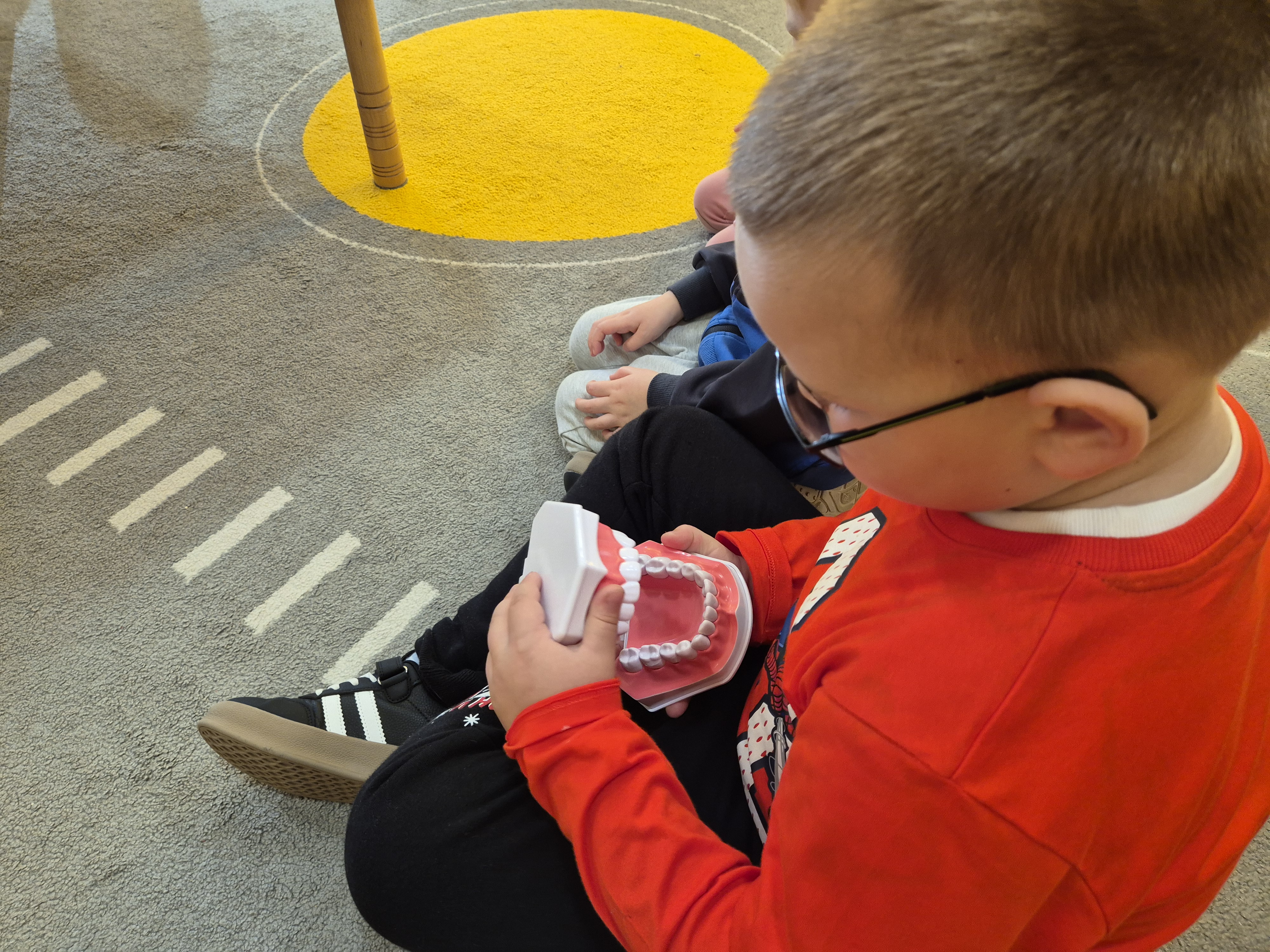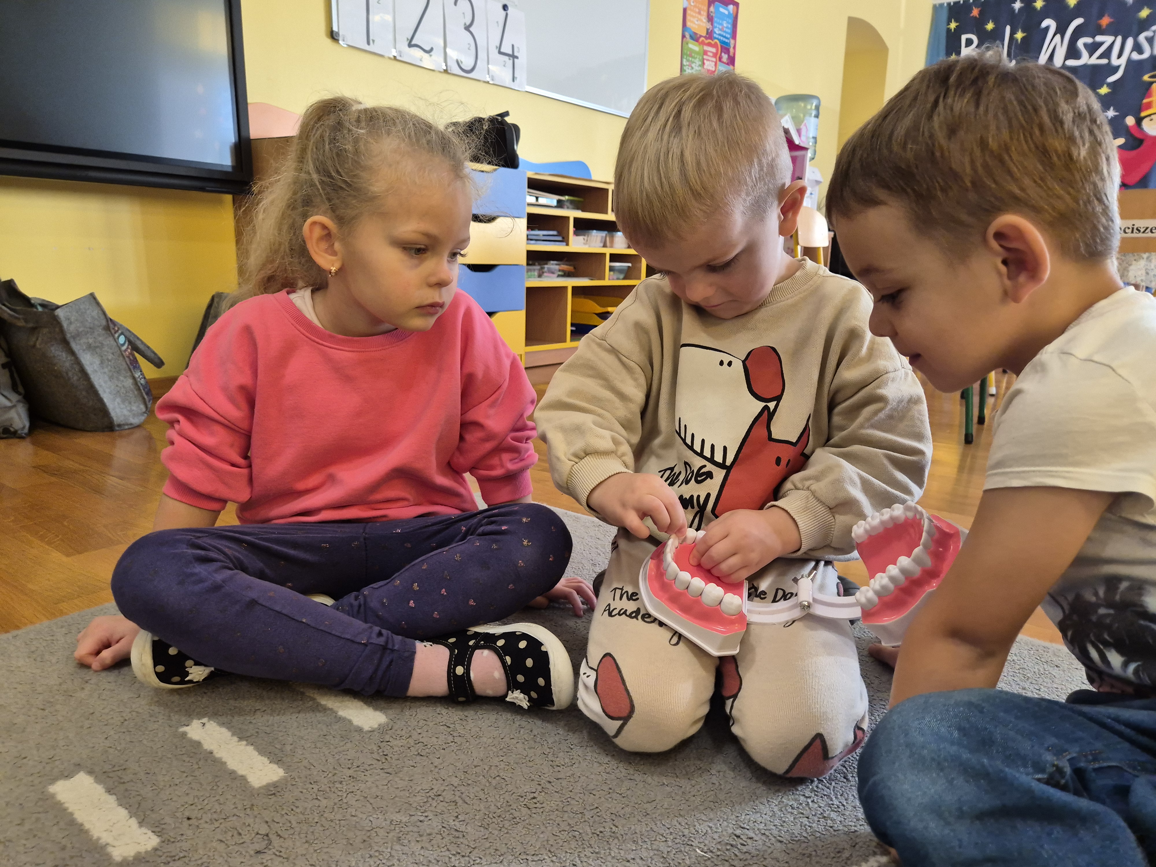 Grupę Pszczółek odwiedziła mama Mikołaja, która opowiedziała dzieciom o swojej pracy jako technik dentystyczny. Pani Kamila, wyjaśniła, na czym polega wykonywanie protez i aparatów ortodontycznych oraz jak ważna jest dbałość o zdrowe zęby. Dzieci mogły z bliska zobaczyć różne narzędzia i modele zębów. To była bardzo ciekawa i pouczająca wizyta, za którą jeszcze raz serdecznie dziękujemy.