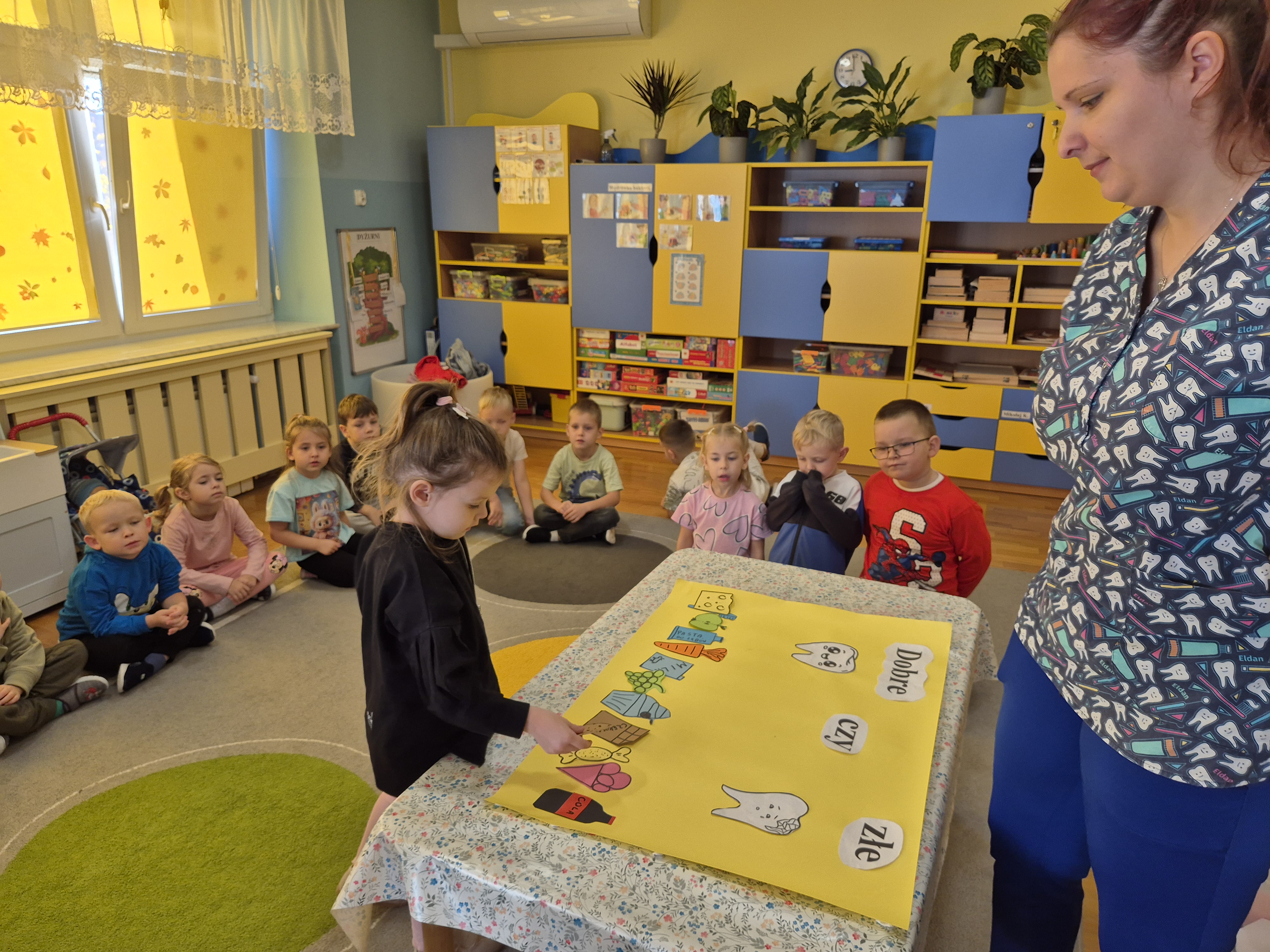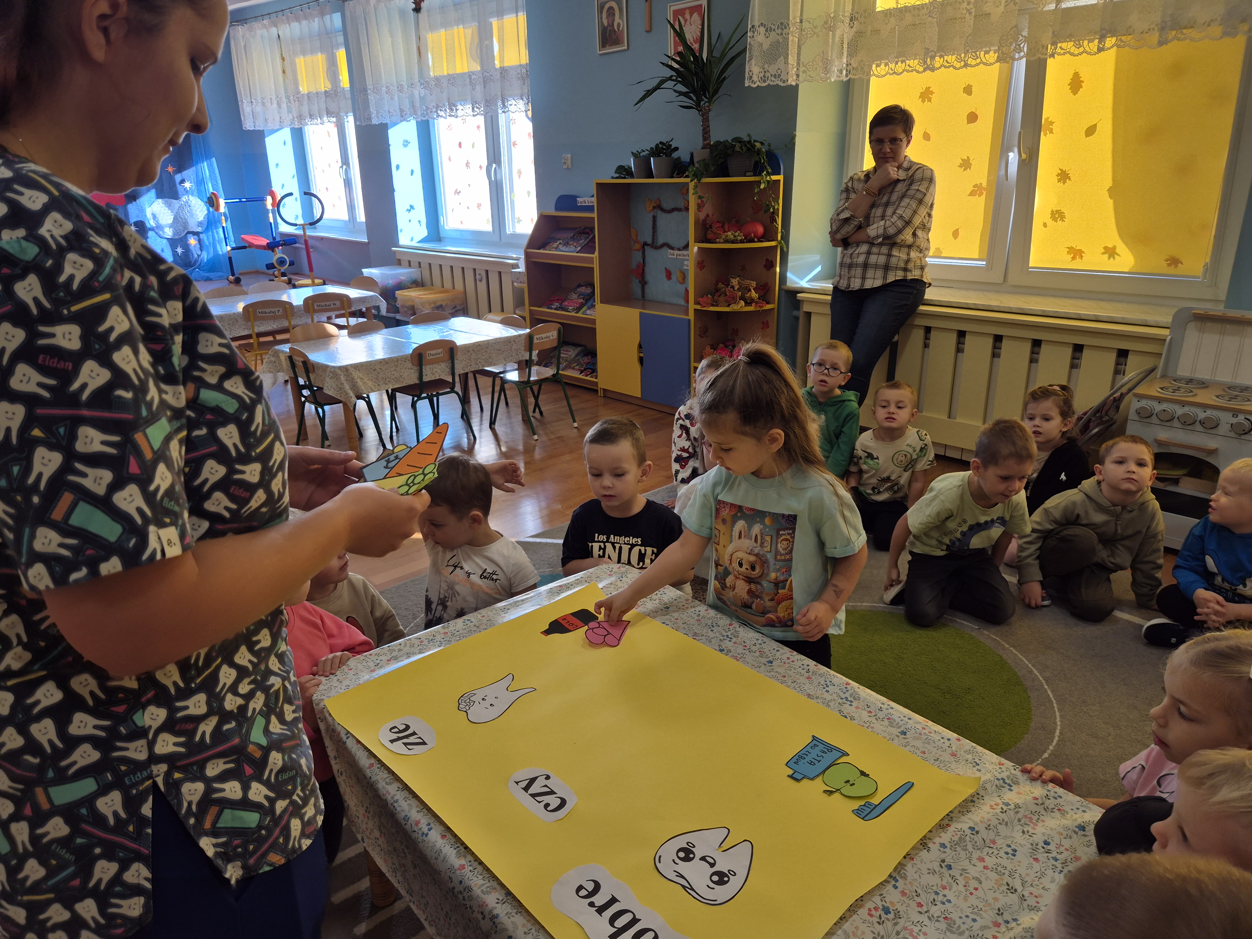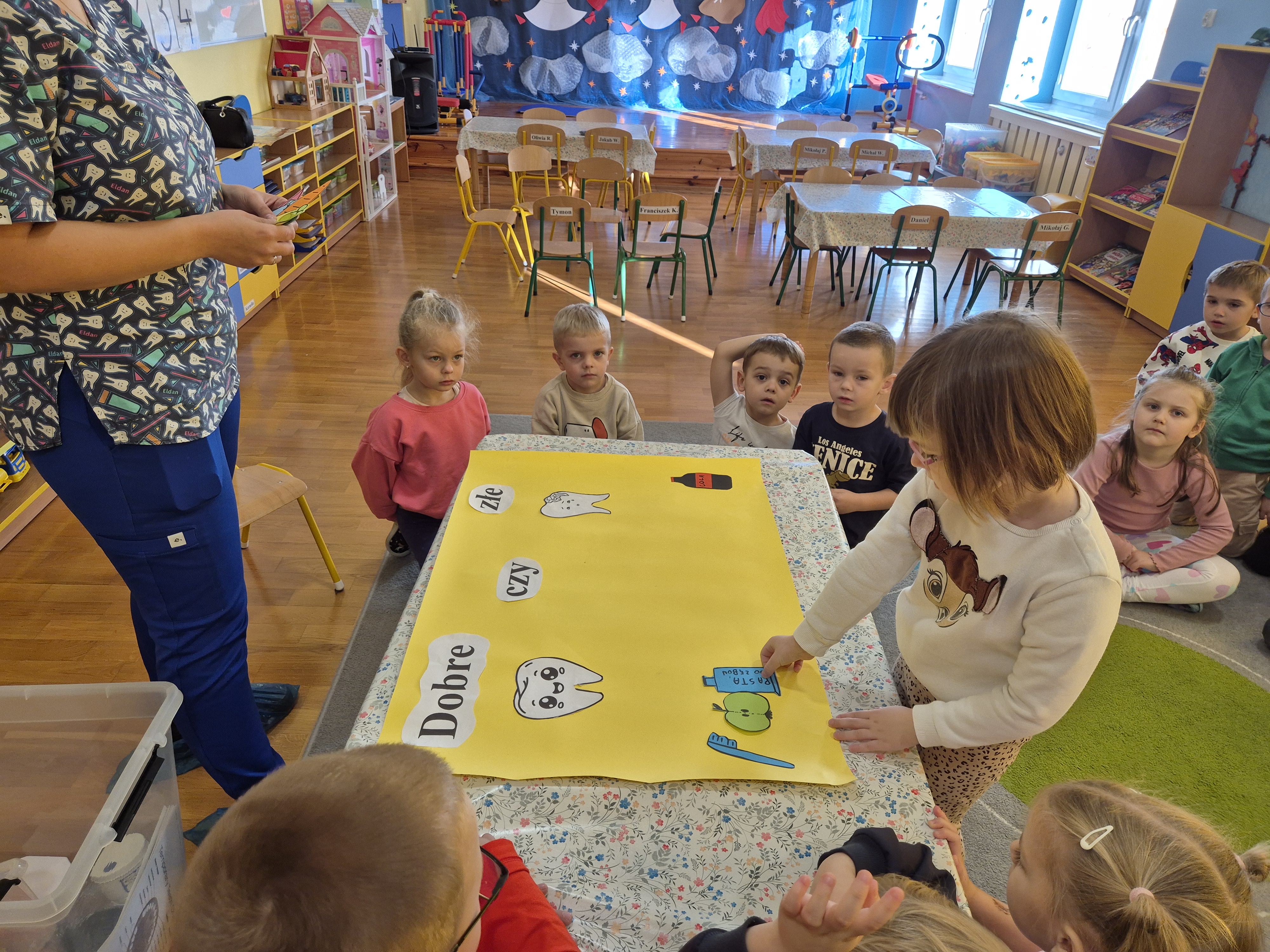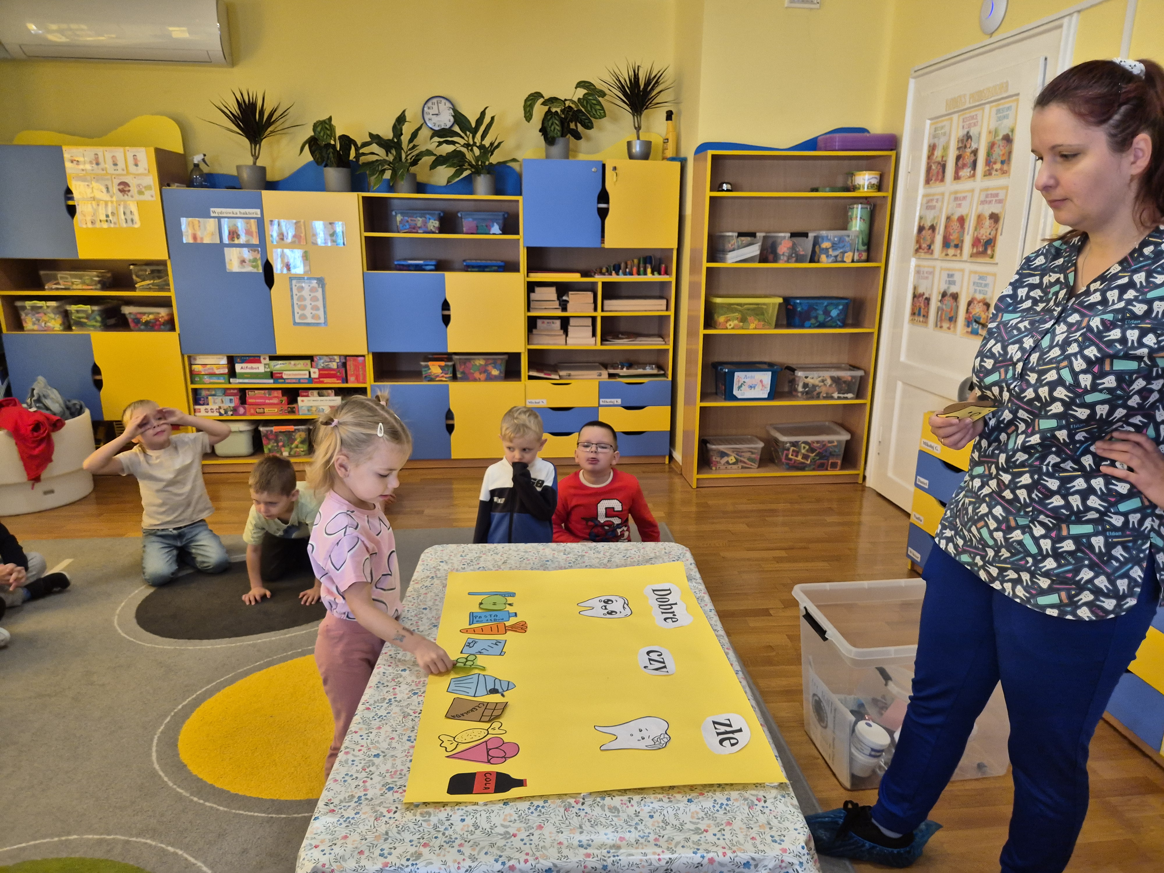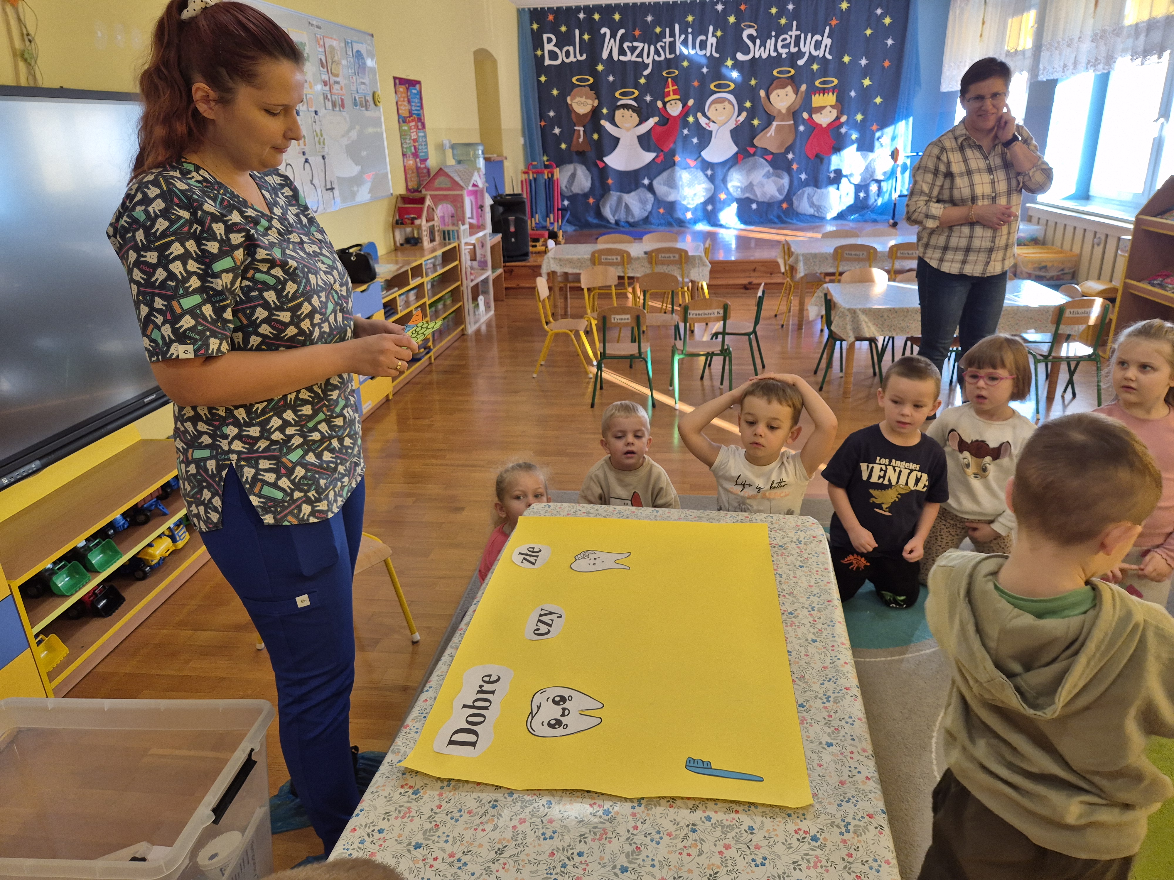 Grupę Pszczółek odwiedziła mama Mikołaja, która opowiedziała dzieciom o swojej pracy jako technik dentystyczny. Pani Kamila, wyjaśniła, na czym polega wykonywanie protez i aparatów ortodontycznych oraz jak ważna jest dbałość o zdrowe zęby. Dzieci mogły z bliska zobaczyć różne narzędzia i modele zębów. To była bardzo ciekawa i pouczająca wizyta, za którą jeszcze raz serdecznie dziękujemy.