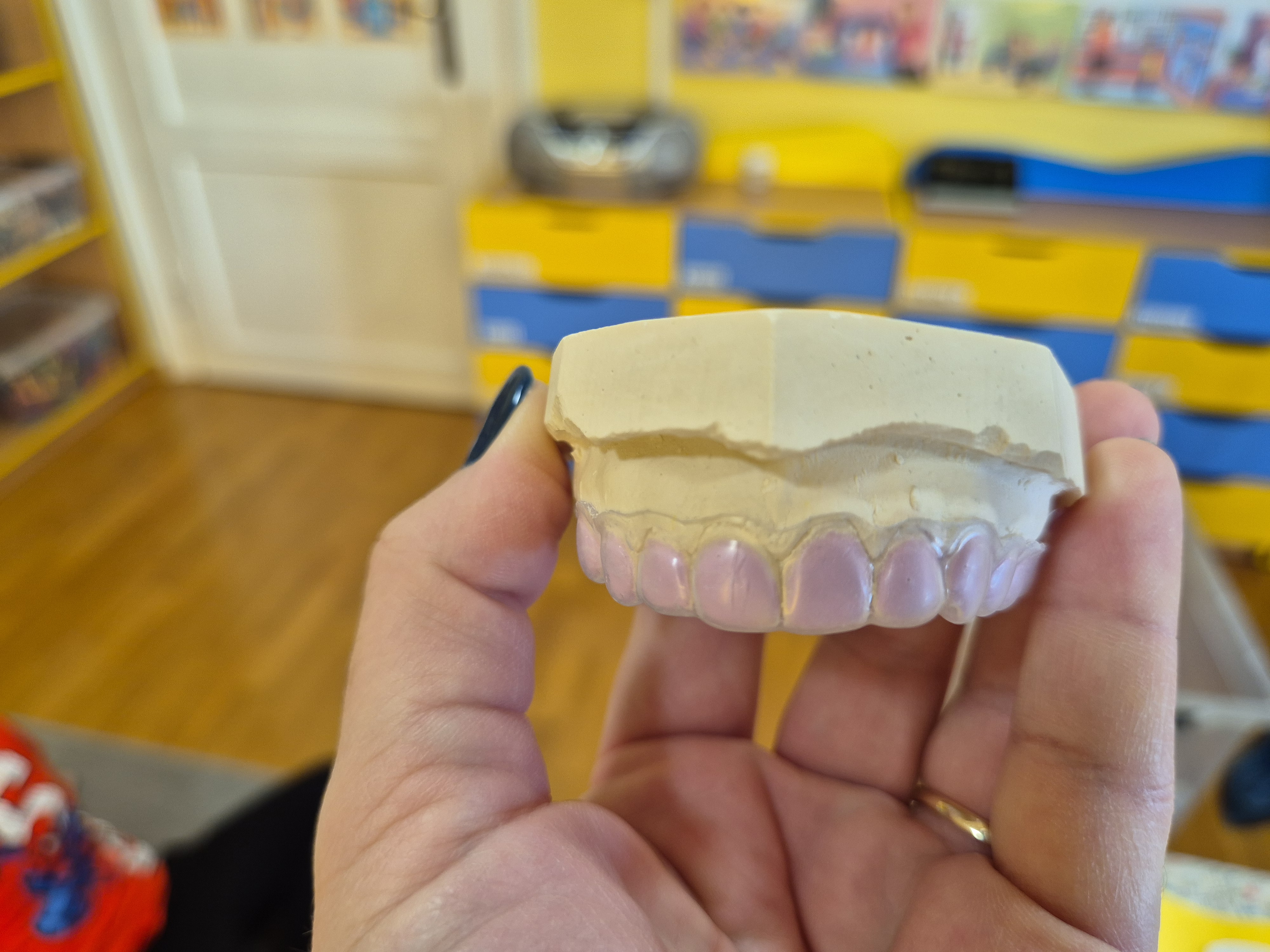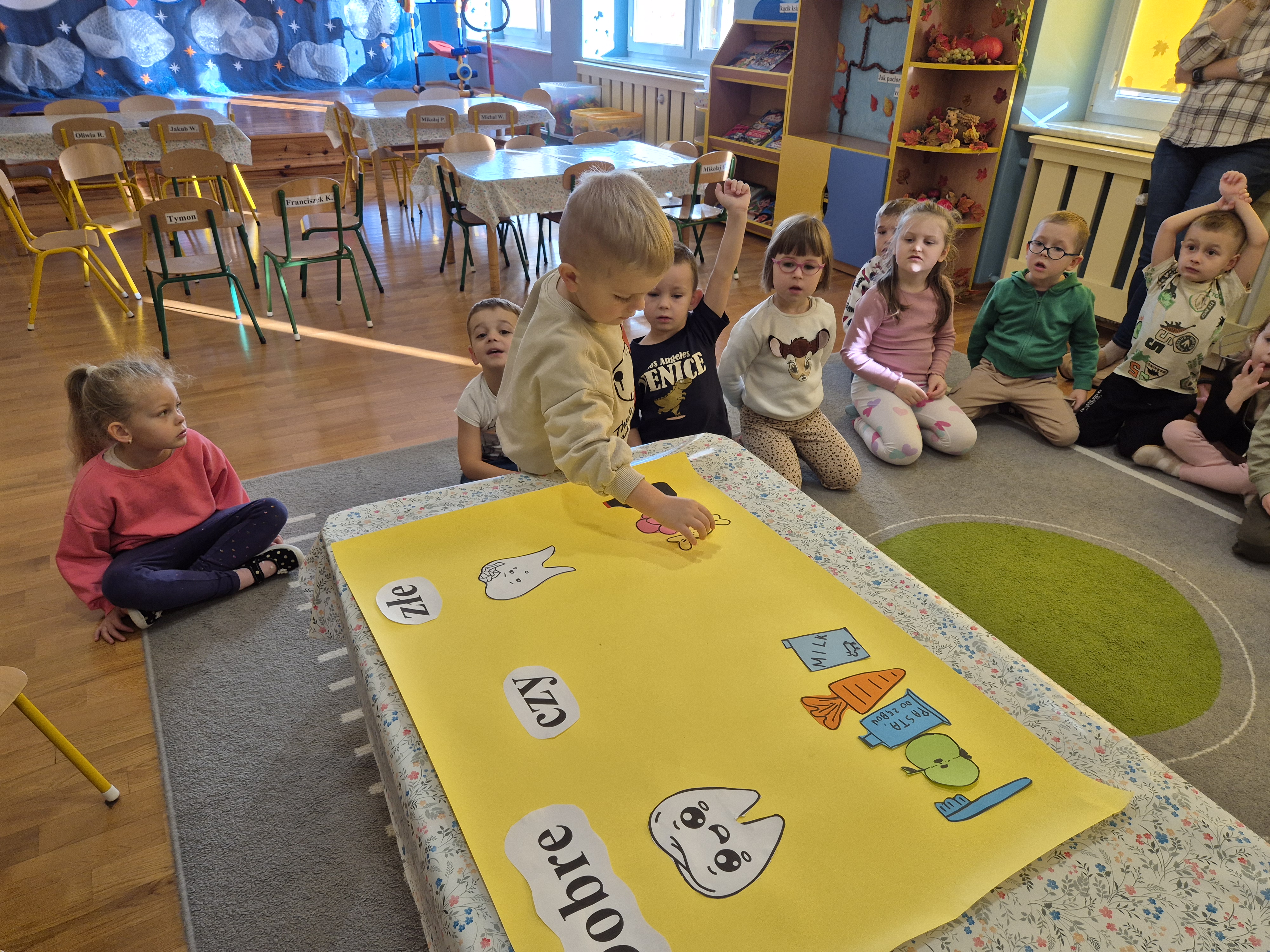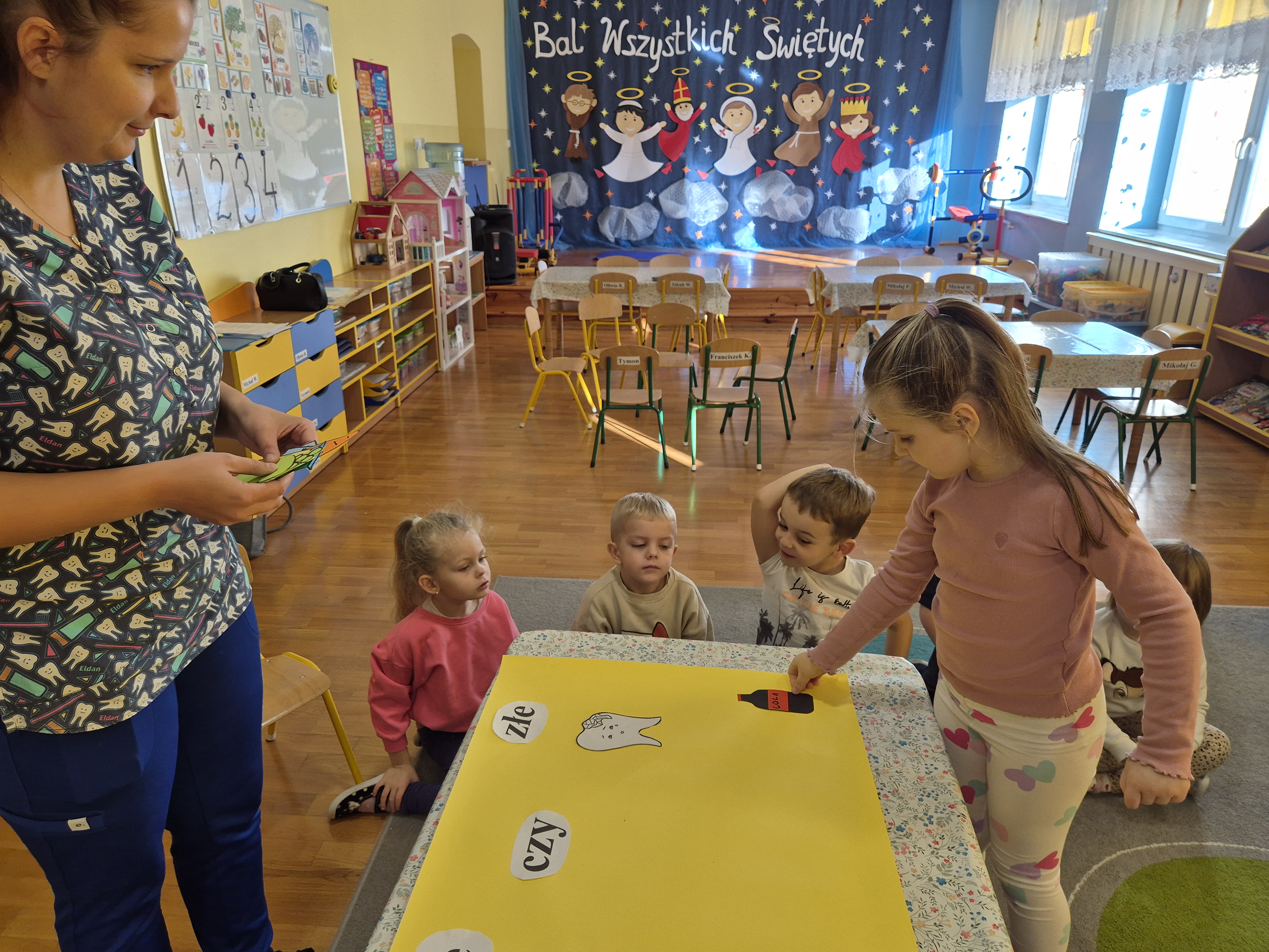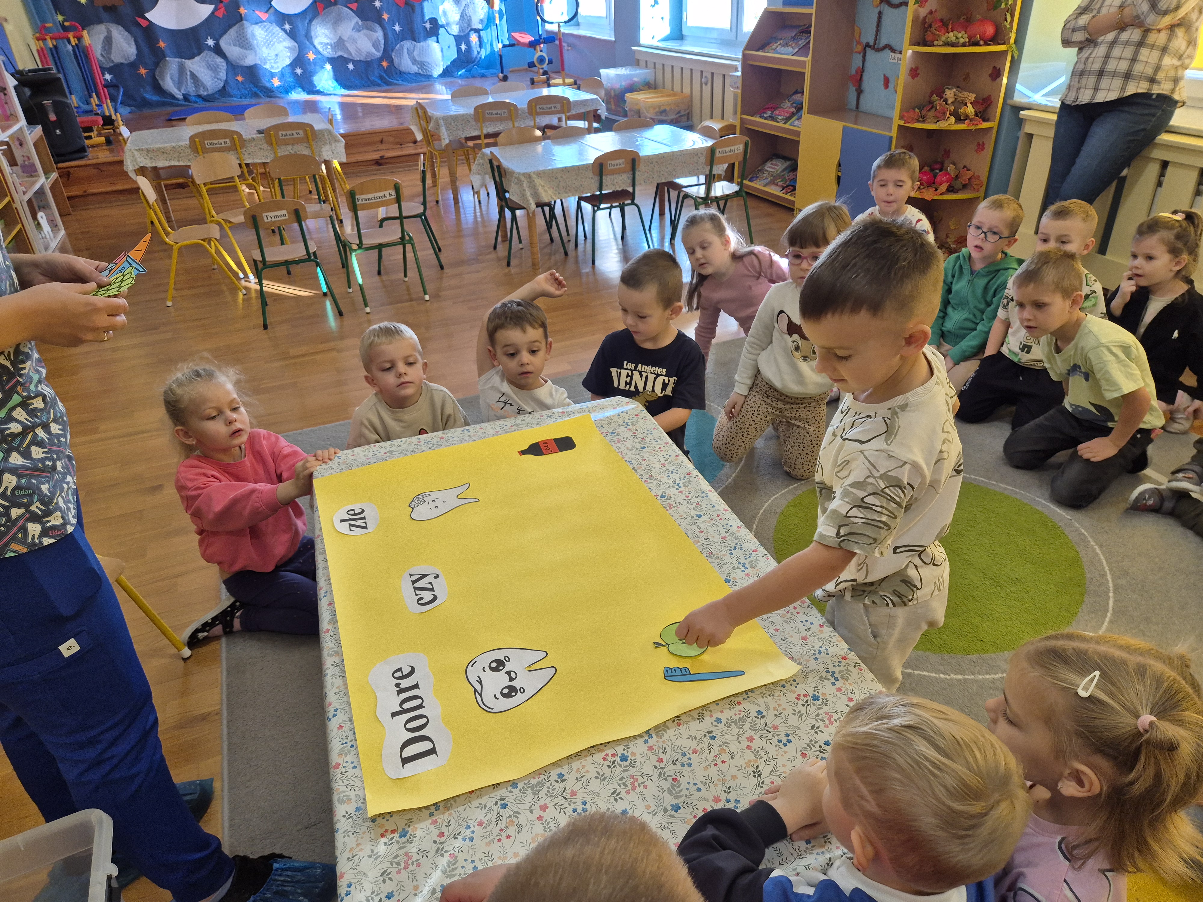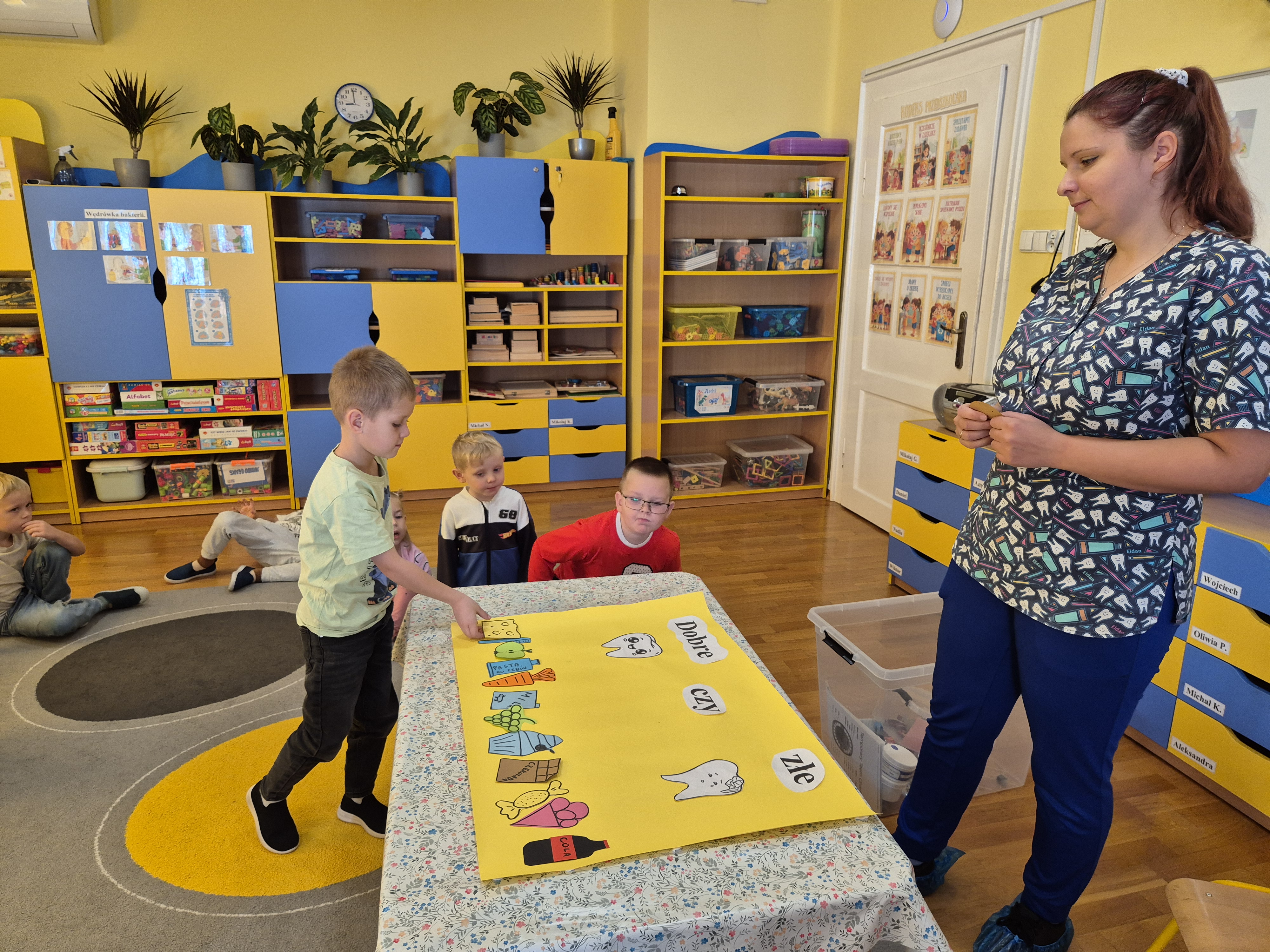 Grupę Pszczółek odwiedziła mama Mikołaja, która opowiedziała dzieciom o swojej pracy jako technik dentystyczny. Pani Kamila, wyjaśniła, na czym polega wykonywanie protez i aparatów ortodontycznych oraz jak ważna jest dbałość o zdrowe zęby. Dzieci mogły z bliska zobaczyć różne narzędzia i modele zębów. To była bardzo ciekawa i pouczająca wizyta, za którą jeszcze raz serdecznie dziękujemy.