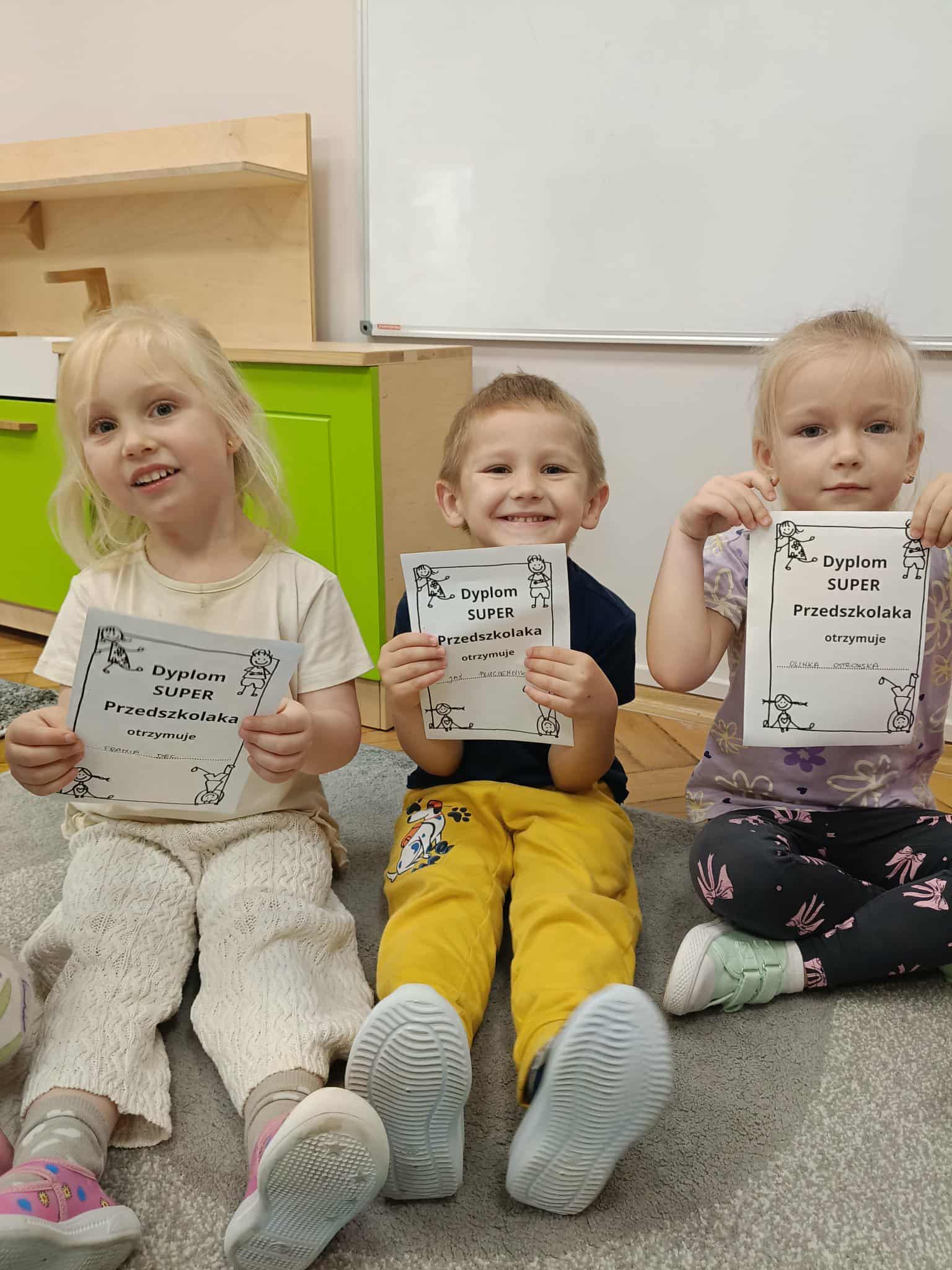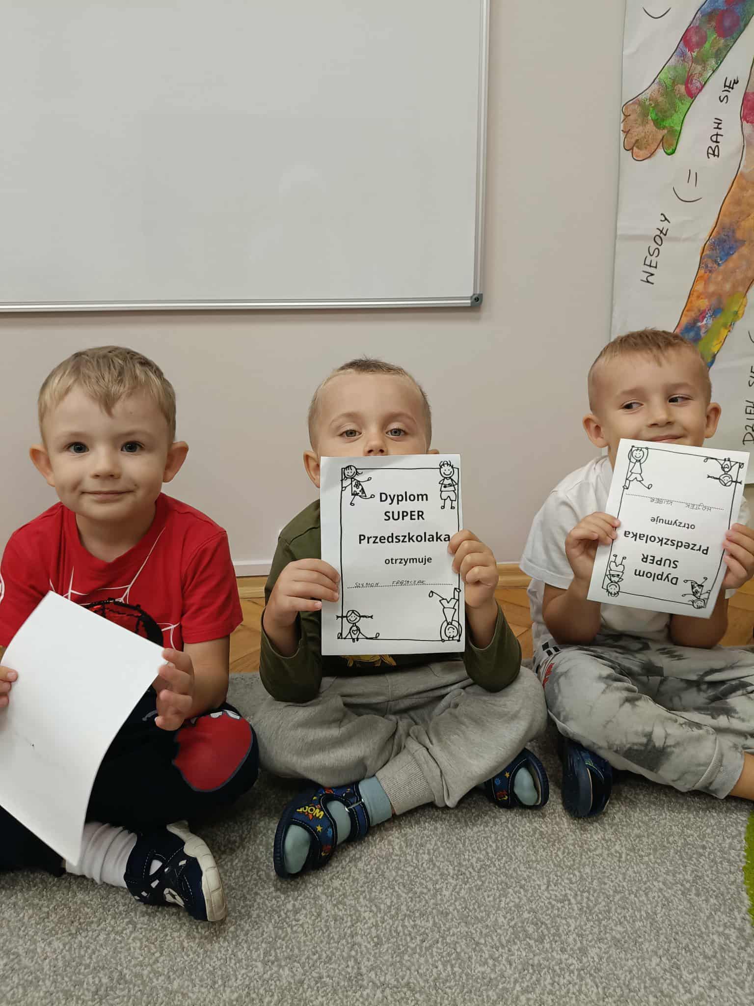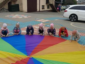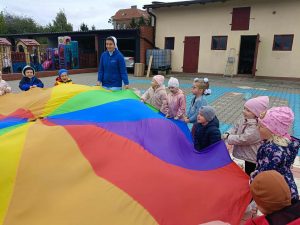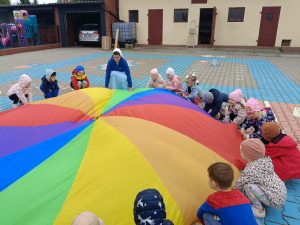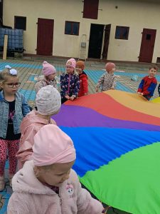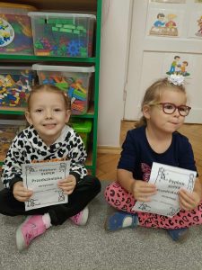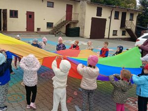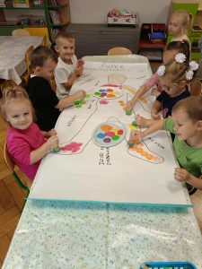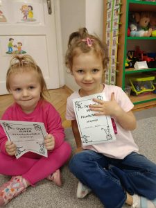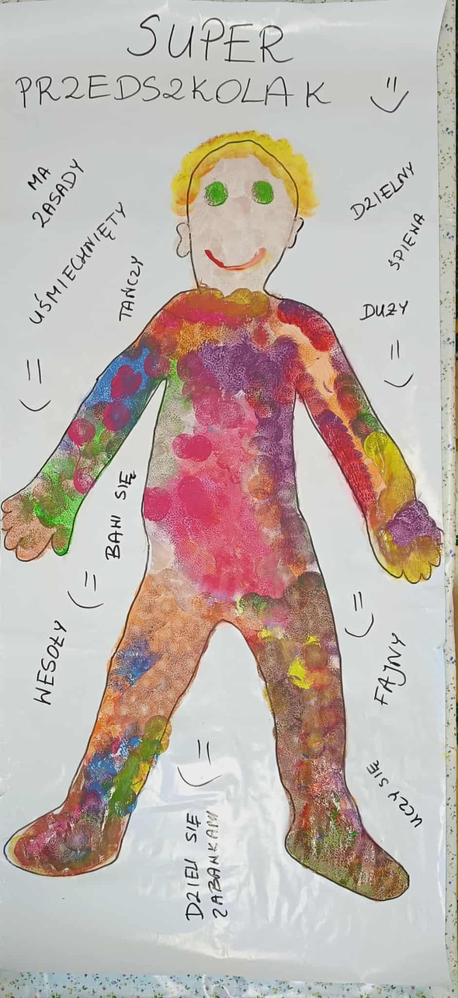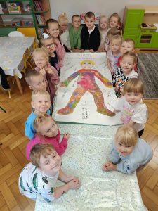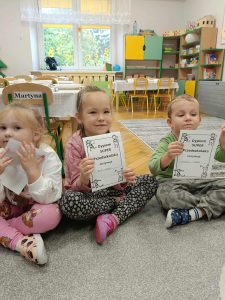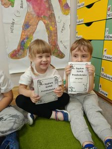 W naszej grupie świętowaliśmy wyjątkowy dzień – Dzień Przedszkolaka. Rozmawialiśmy o tym, kim jest przedszkolak i co to znaczy być „super przedszkolakiem”. Wspólnie stworzyliśmy obraz, w którym każdy zostawił swój twórczy wkład. Nie zabrakło także wesołych zabaw z chustą animacyjną – zarówno na świeżym powietrzu, jak i w naszej sali. Na zakończenie każde dziecko otrzymało pamiątkowy dyplom „Super Przedszkolaka”, który wywołał mnóstwo radości i dumy.