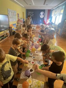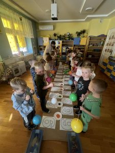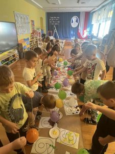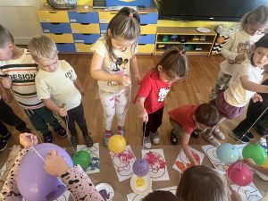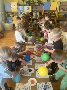 W naszym przedszkolu odbyły się wyjątkowe zajęcia plastyczne. Dzieci tworzyły swoje prace, malując… balonami! Każdy balon był trzymany za pomocą sznurka, zanurzany w farbie, a następnie odbijany na papierze tak, aby powstała kolorowa cyfra 6.