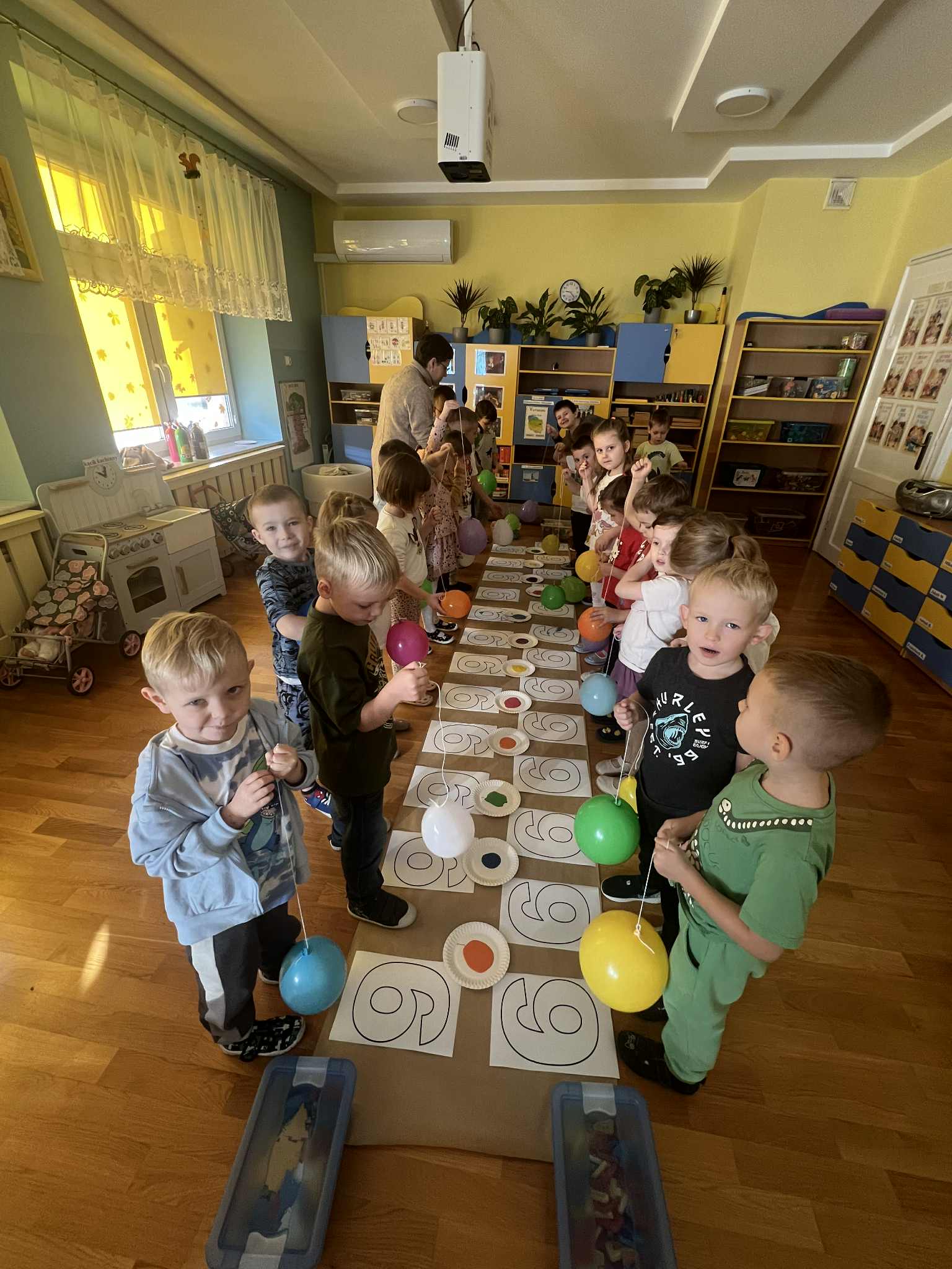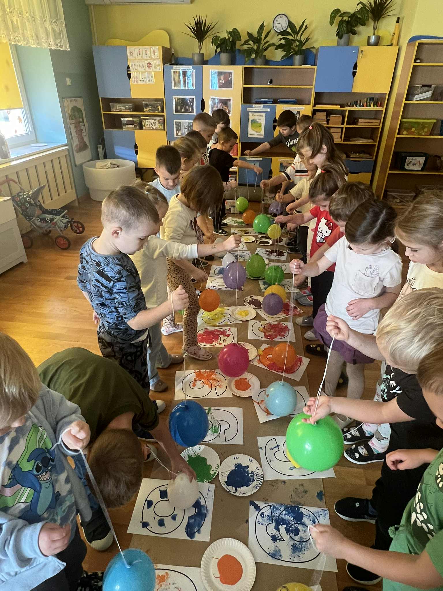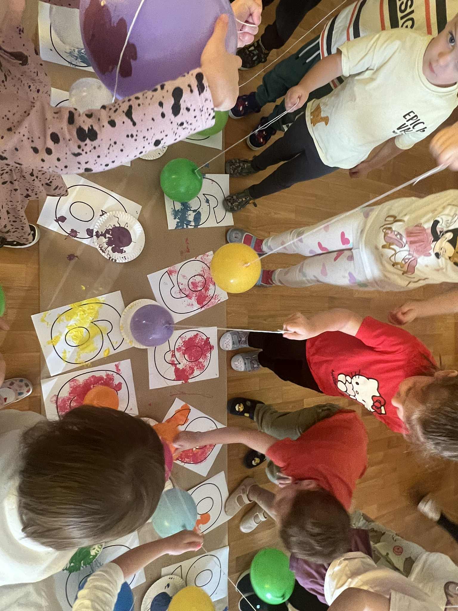 W naszym przedszkolu odbyły się wyjątkowe zajęcia plastyczne. Dzieci tworzyły swoje prace, malując… balonami! Każdy balon był trzymany za pomocą sznurka, zanurzany w farbie, a następnie odbijany na papierze tak, aby powstała kolorowa cyfra 6.