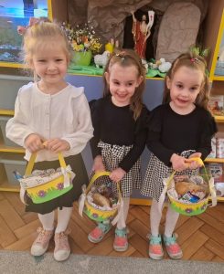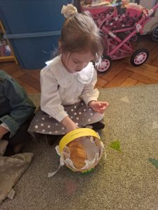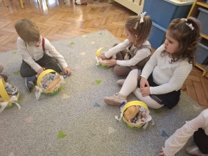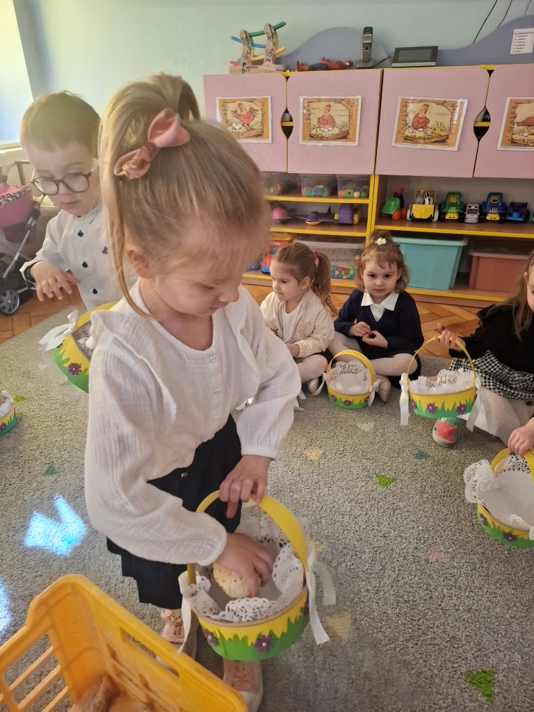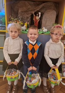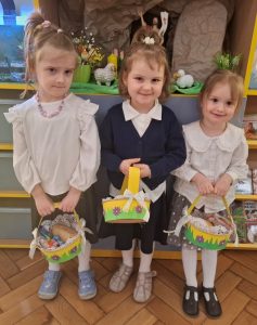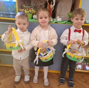 W minionym tygodniu dzieci z wielkim zaangażowaniem przygotowywały się do nadchodzących Świąt Wielkanocnych, poznając polskie tradycje i zwyczaje. Z niecierpliwością oczekiwały na Święconkę. Do własnoręcznie przygotowanych koszyczków dzieci włożyły: baranka – znak zwycięstwa życia nad śmiercią, chleb – symbol dostatku, babkę wielkanocną – oznakę radości, kiełbaskę – nawiązująca do zdrowia i siły, a także kolorowe jajeczka, które są symbolem nowego życia. Dzieci z ogromną starannością i dumą komponowały swoje koszyczki, poznając przy tym znaczenia poszczególnych elementów.