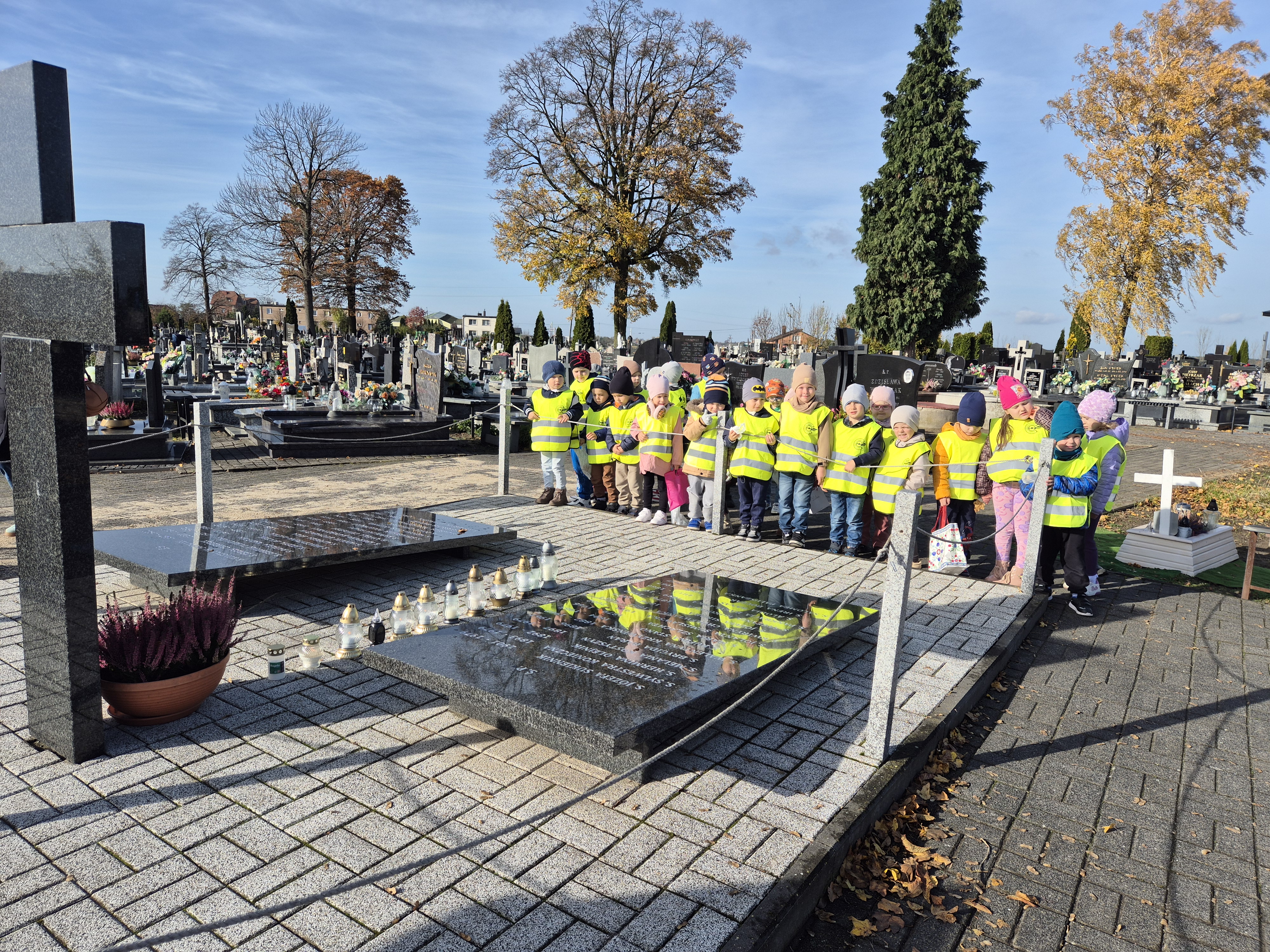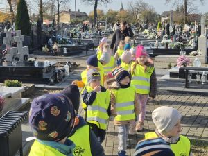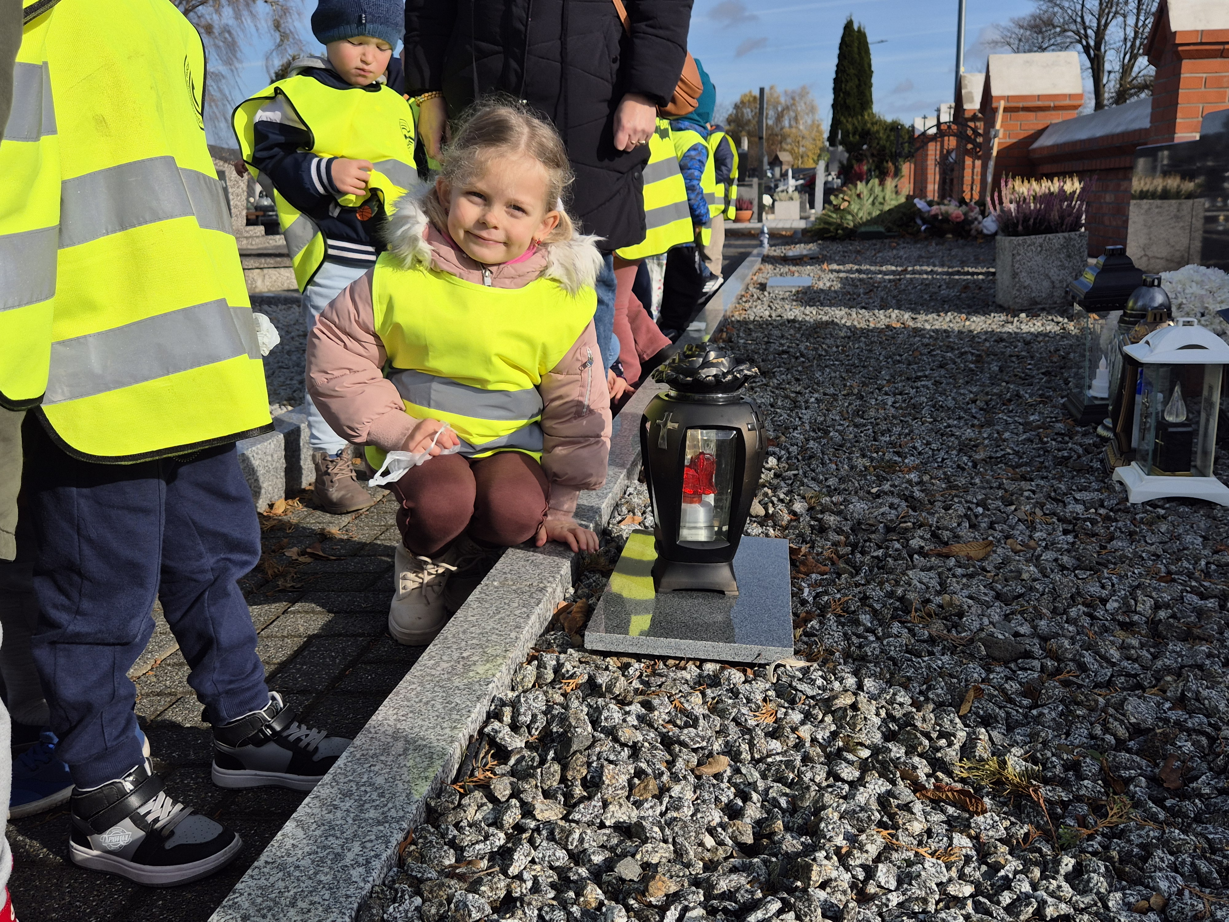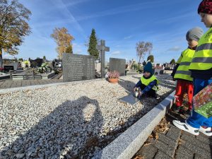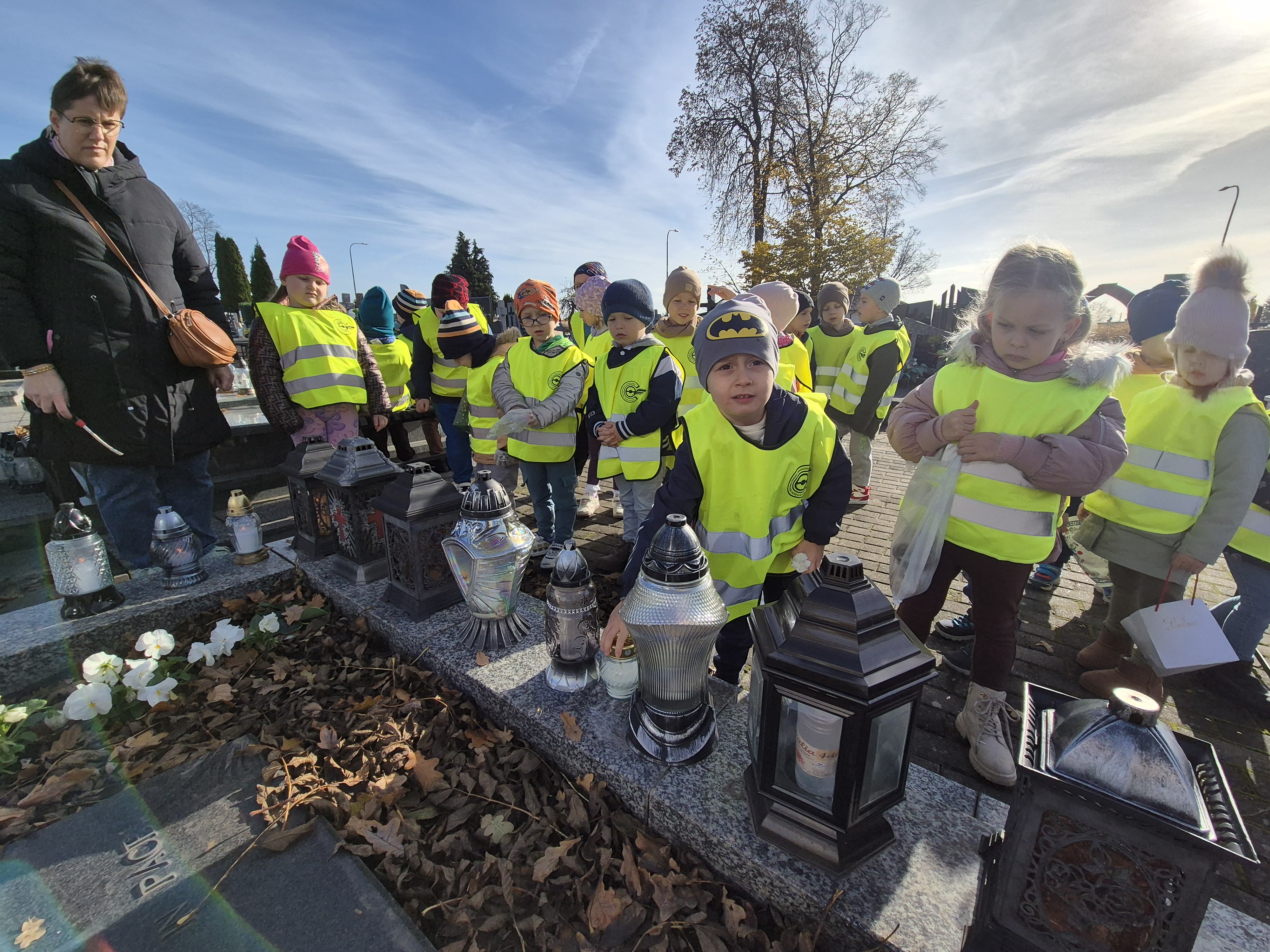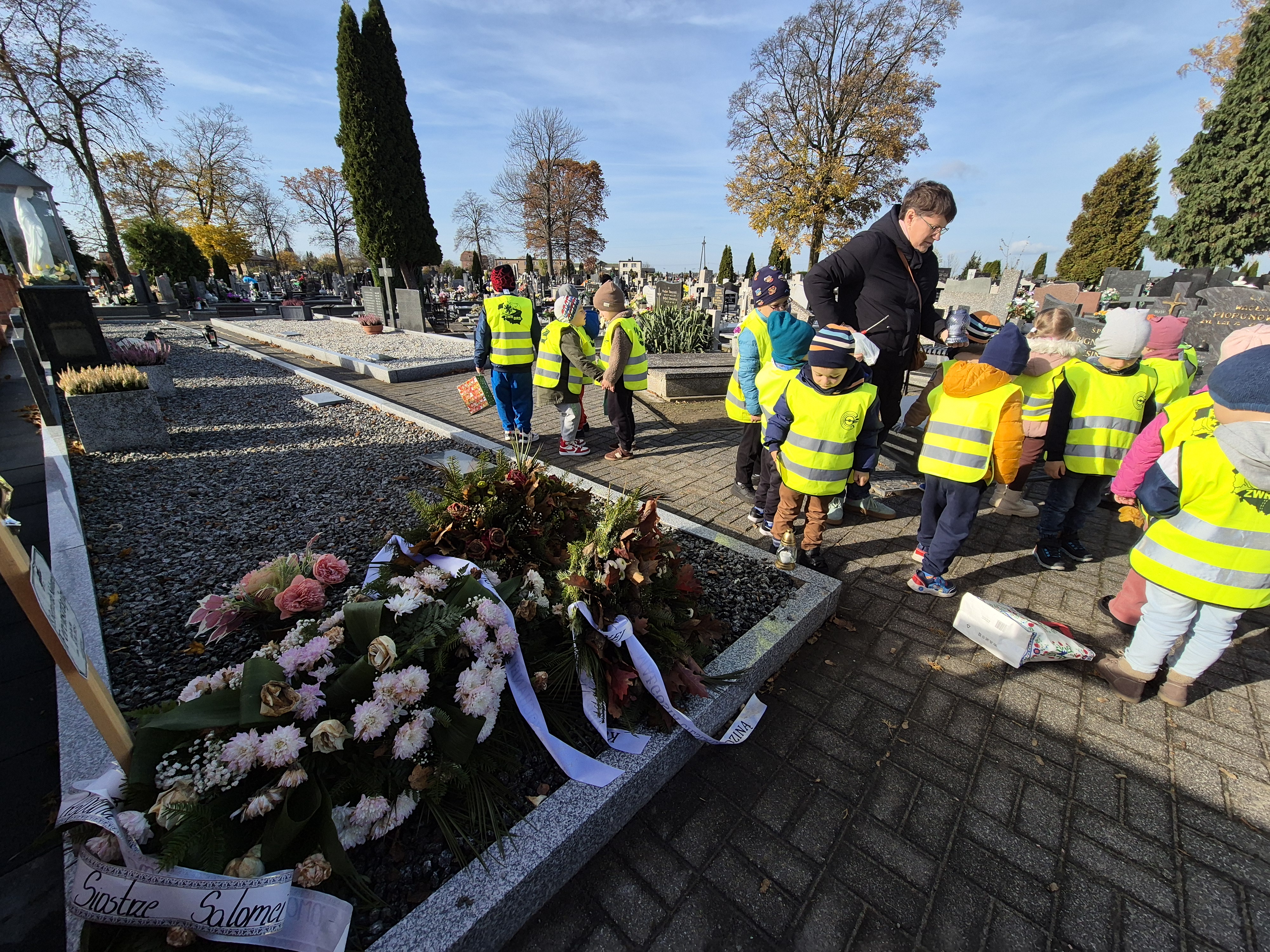 Dzieci z grupy „Pszczółek” wybrały się na cmentarz, aby odwiedzić groby zmarłych. Przedszkolaki zatrzymały się przy grobie księdza Wacława Blizińskiego oraz zmarłych Sióstr Służebniczek. Wspólnie pomodliły się i zapaliły znicze. Był to czas pełen ciszy i zadumy, a także okazja do rozmowy o tych, których nie ma już wśród nas.
