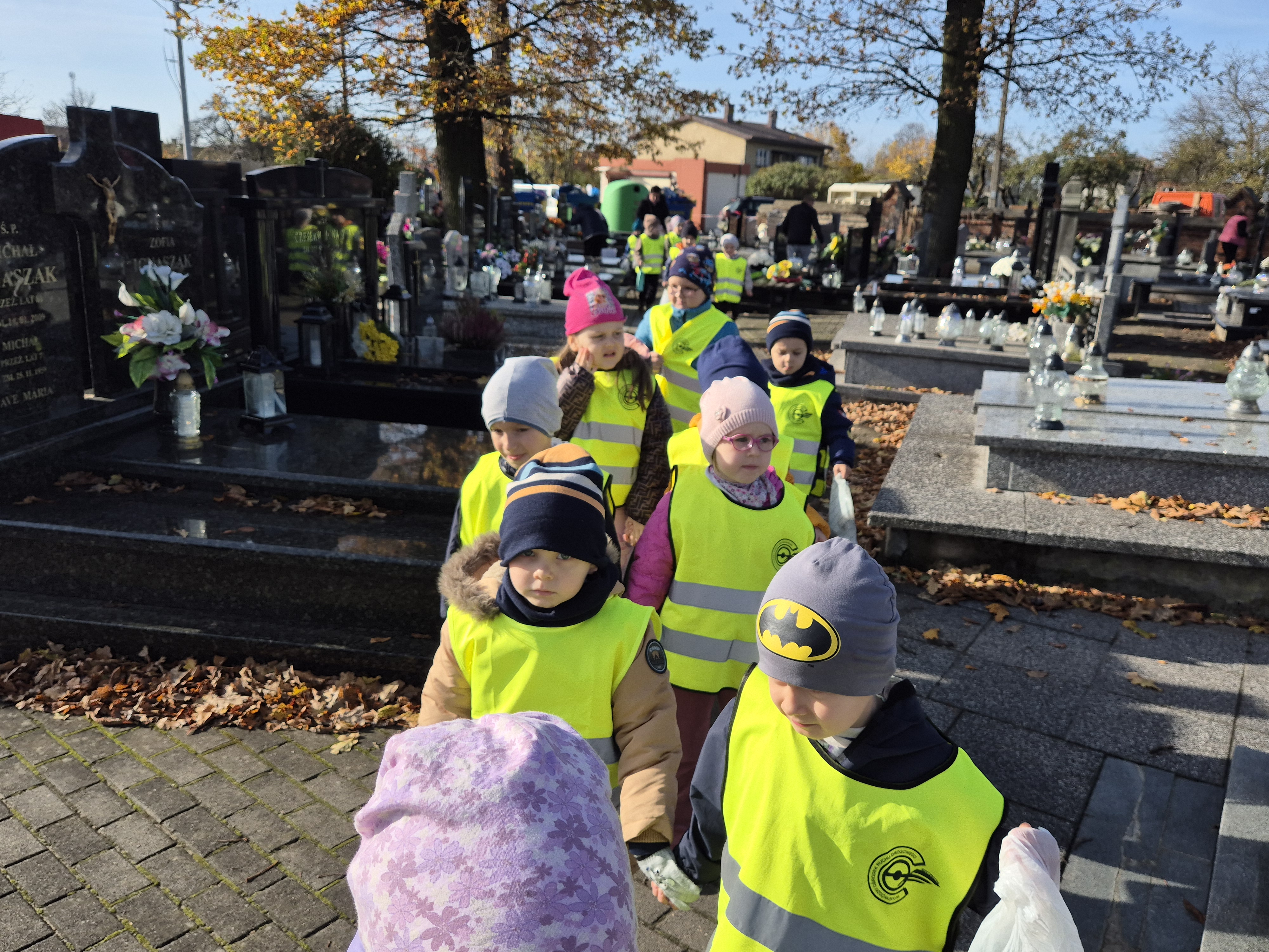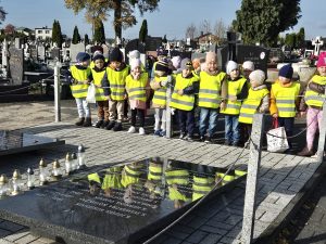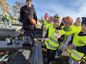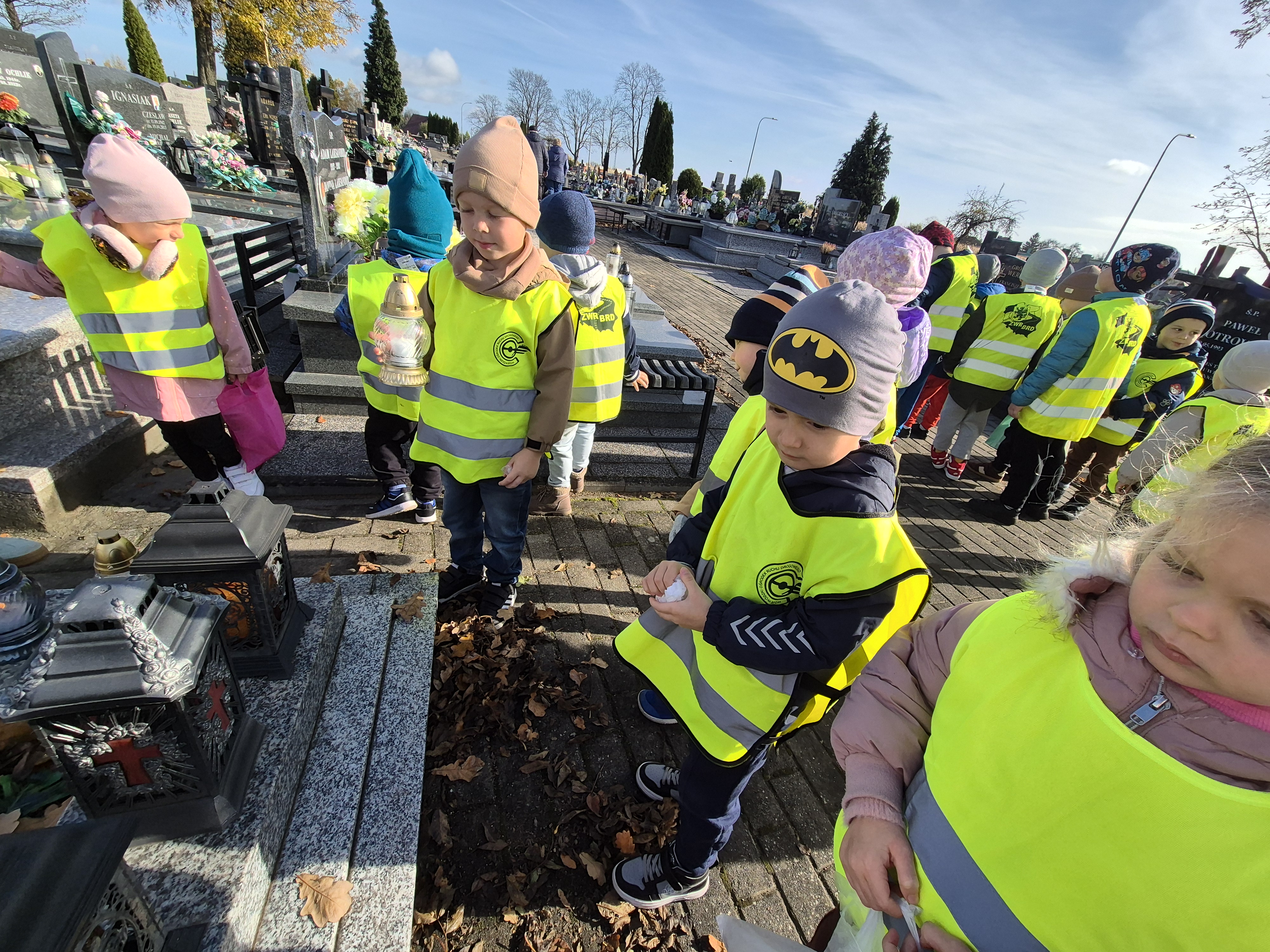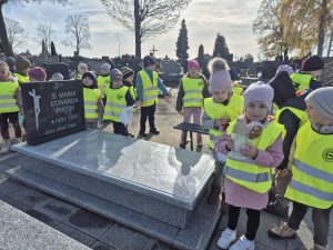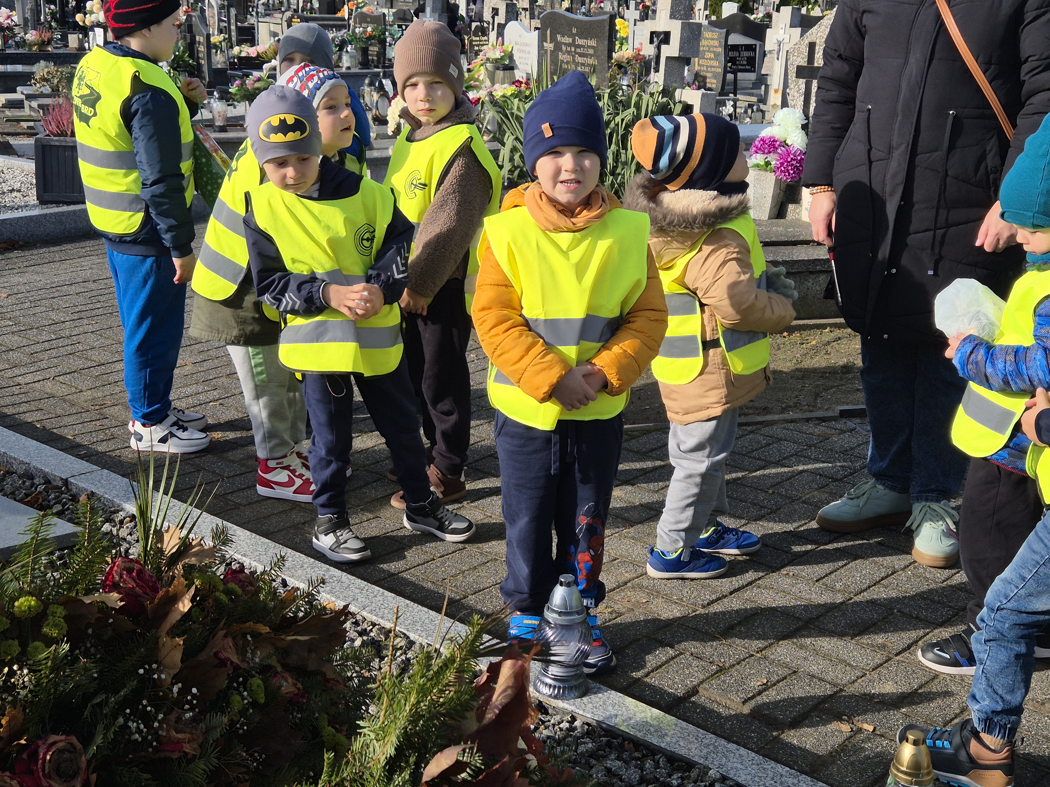 Dzieci z grupy „Pszczółek” wybrały się na cmentarz, aby odwiedzić groby zmarłych. Przedszkolaki zatrzymały się przy grobie księdza Wacława Blizińskiego oraz zmarłych Sióstr Służebniczek. Wspólnie pomodliły się i zapaliły znicze. Był to czas pełen ciszy i zadumy, a także okazja do rozmowy o tych, których nie ma już wśród nas.