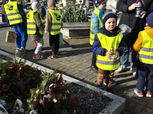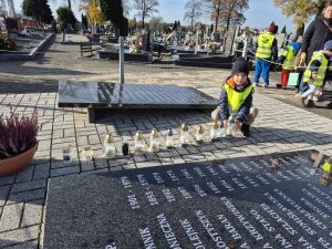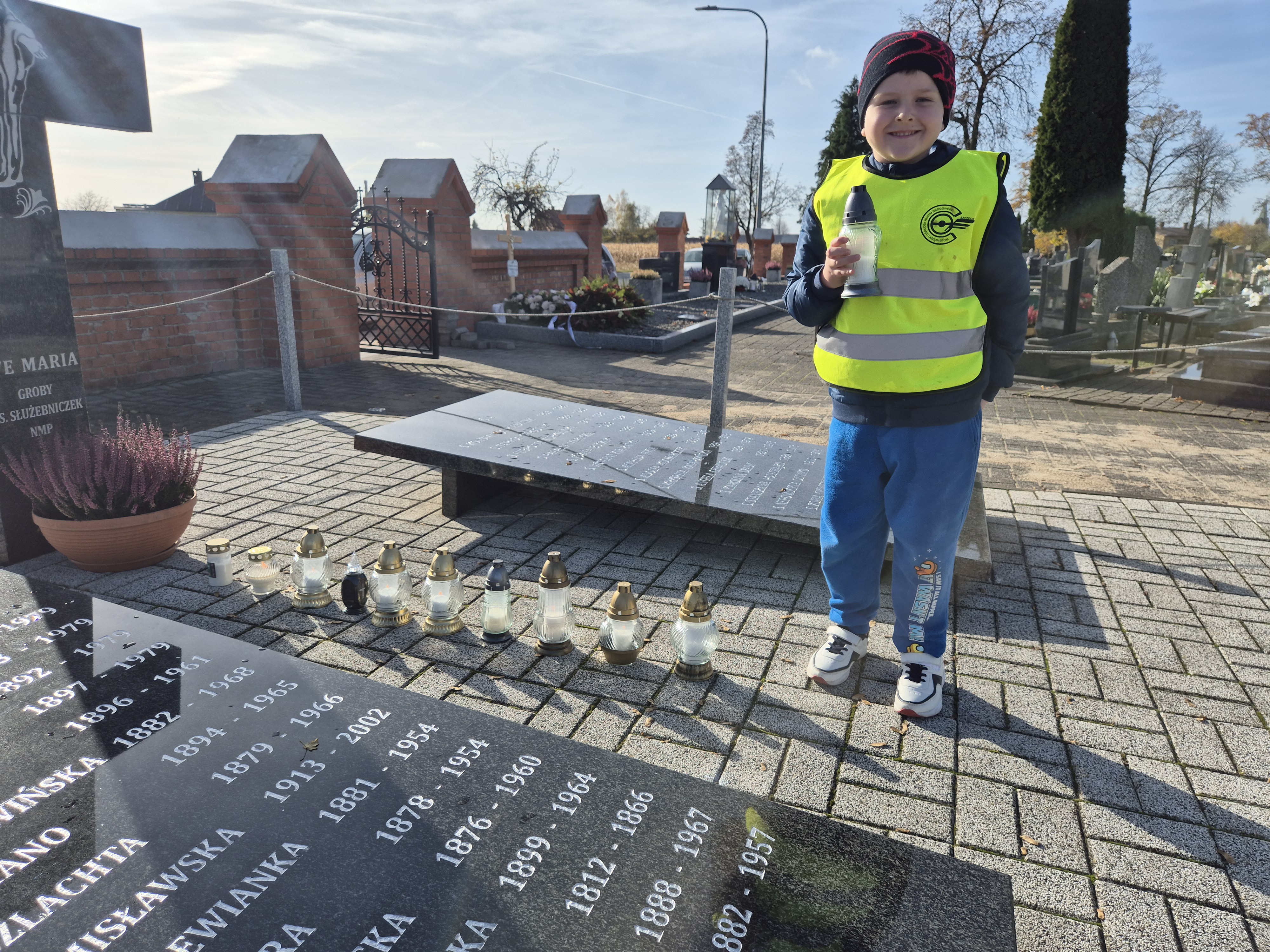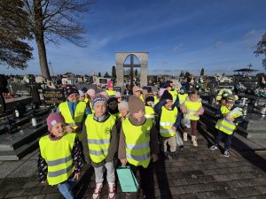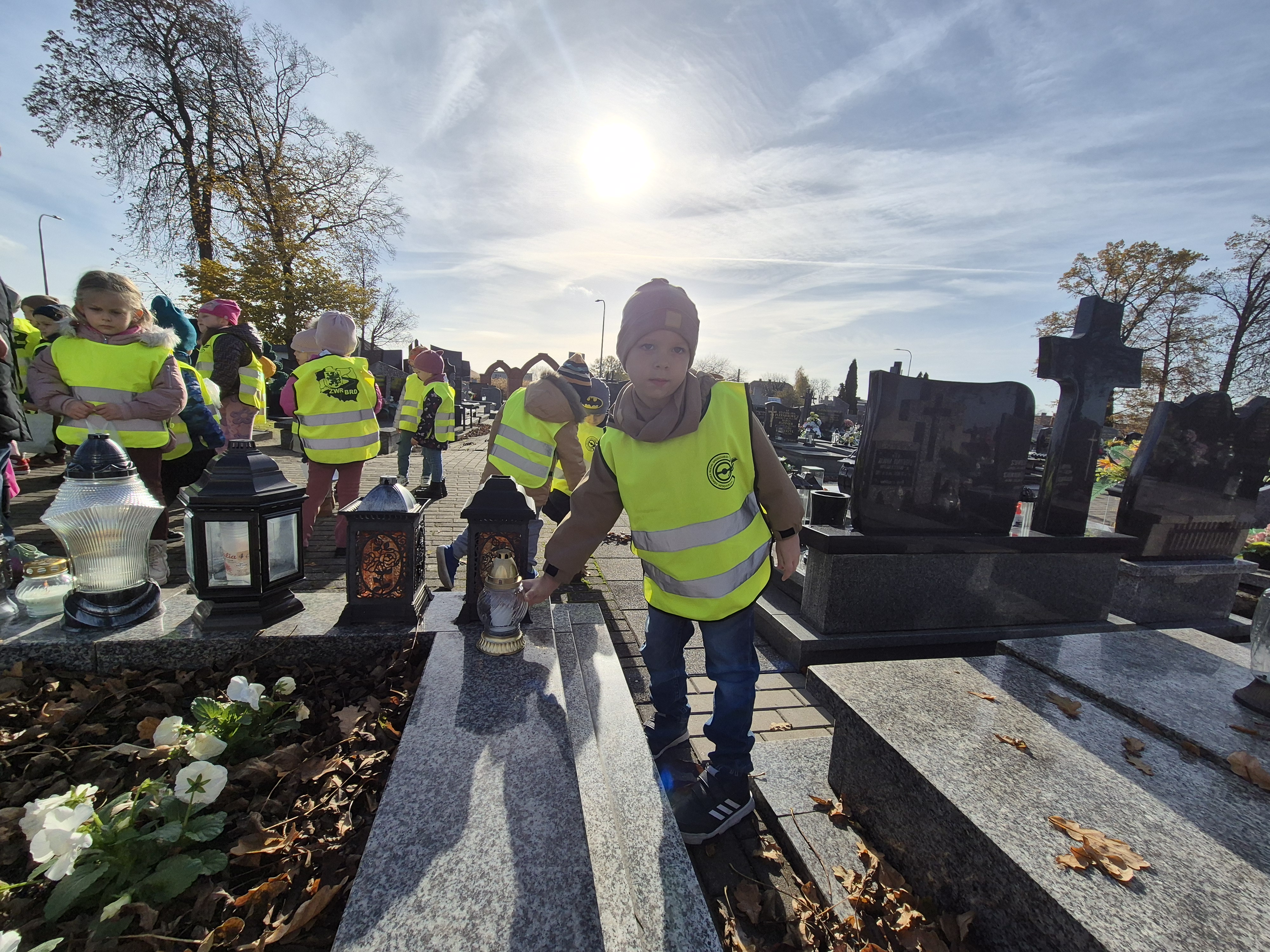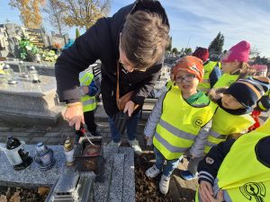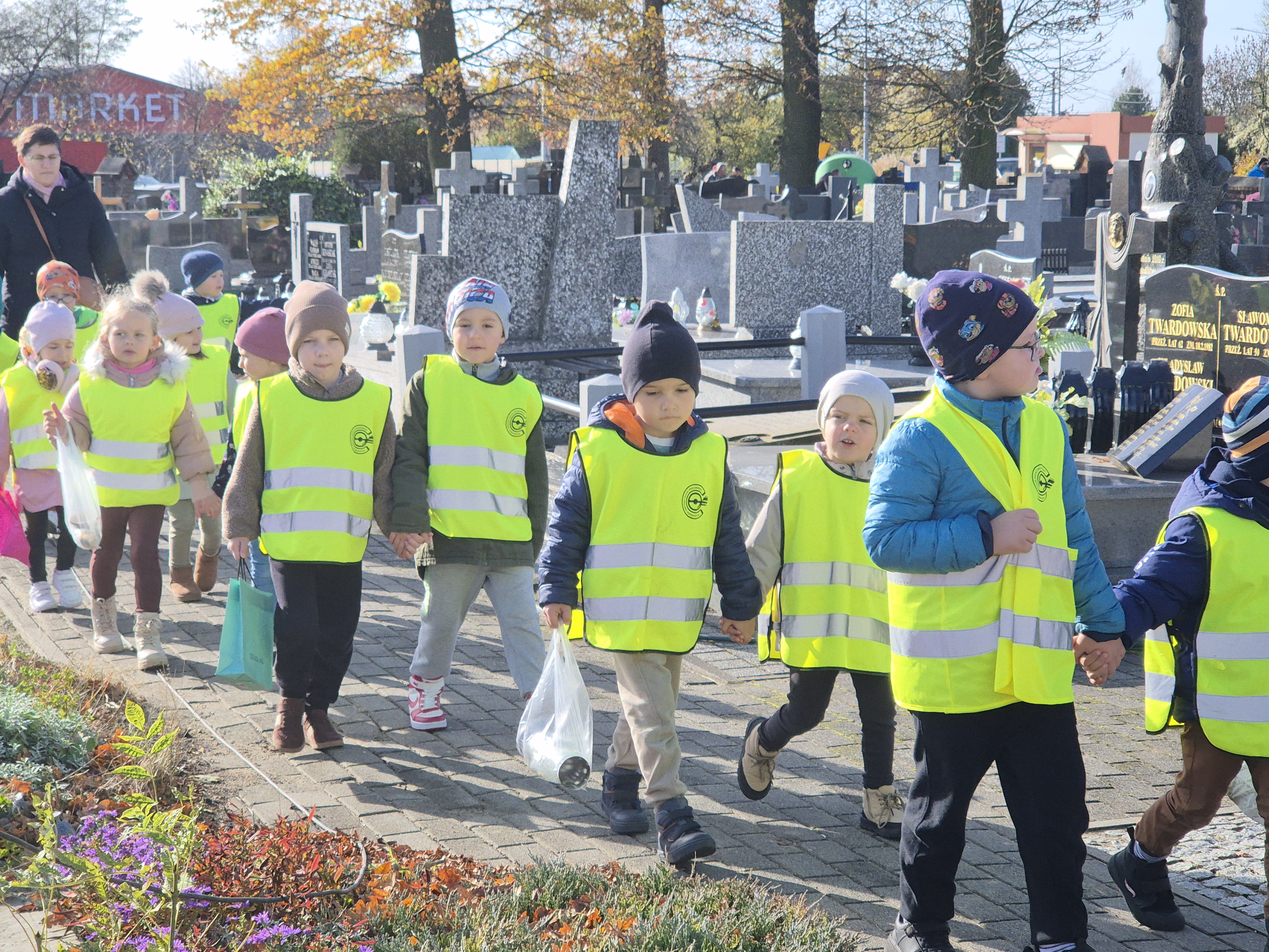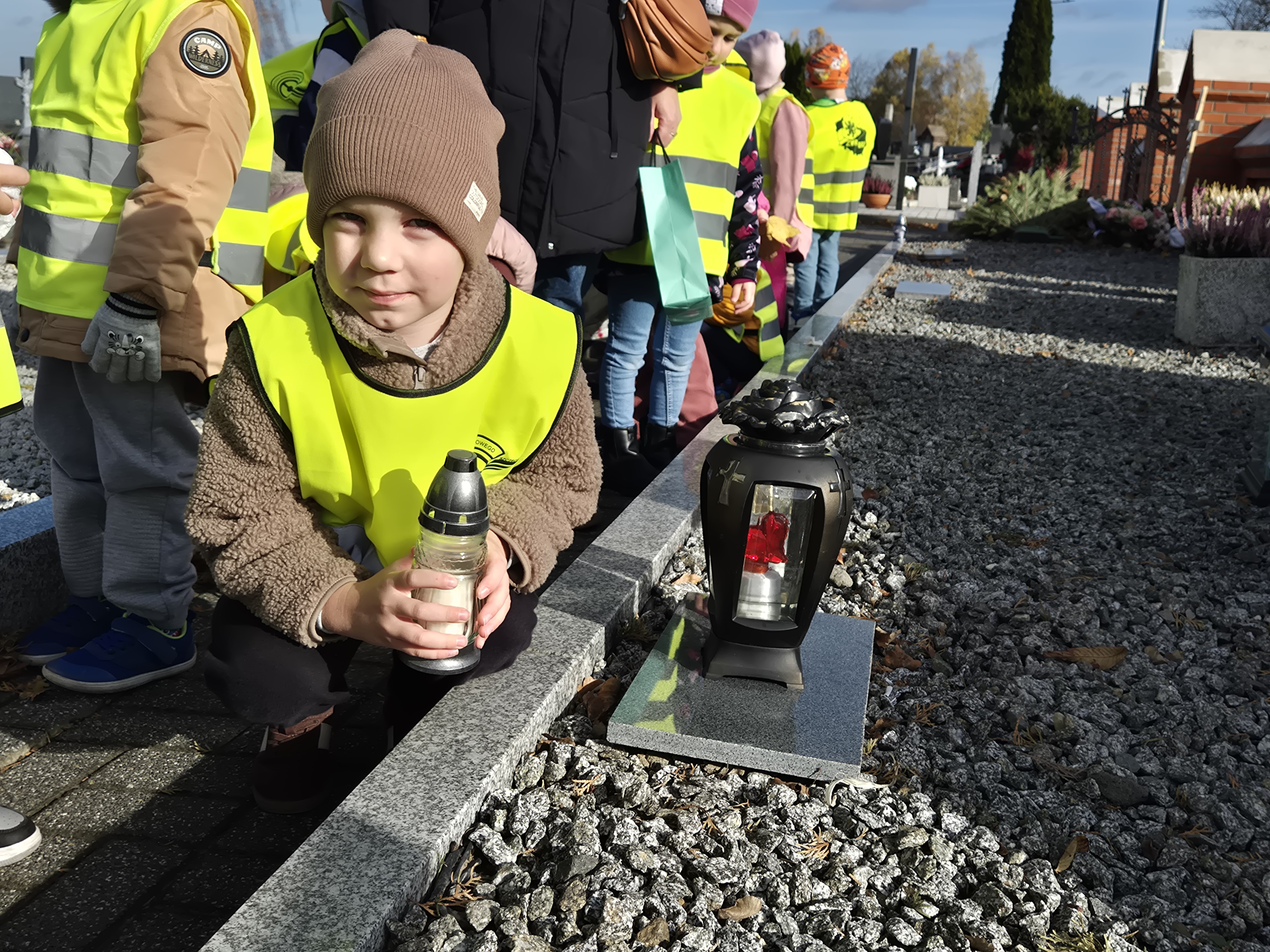 Dzieci z grupy „Pszczółek” wybrały się na cmentarz, aby odwiedzić groby zmarłych. Przedszkolaki zatrzymały się przy grobie księdza Wacława Blizińskiego oraz zmarłych Sióstr Służebniczek. Wspólnie pomodliły się i zapaliły znicze. Był to czas pełen ciszy i zadumy, a także okazja do rozmowy o tych, których nie ma już wśród nas.