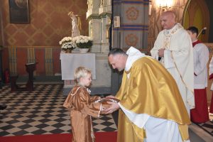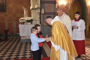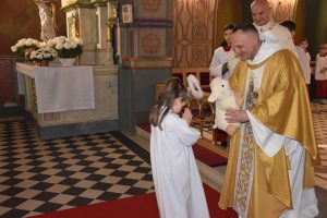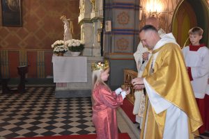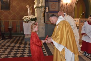 Na zakończenie Mszy Świętej wyruszyła uroczysta procesja eucharystyczna, będąca zwieńczeniem odpustowych obchodów. Nasze przedszkolaki z wielkim zaangażowaniem sypały kwiatki i dzwoniły dzwonkami, tworząc atmosferę modlitwy, radości i wspólnoty.